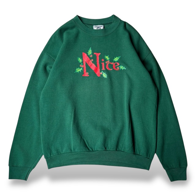 ●詳細 ・90年代Leeボディを使用した、ホリデーシーズンにぴったりのグラフィックスウェット。 フロントには「Nice」の文字が大胆にプリントされ “N”の部分にはヒイラギの葉が添えられた遊び心あるデザイン。 ボディはLee製ならではのしっかりとしたコットン×ポリエステルのブレンド。 リブ付きの袖と裾がシルエットを引き締め、ラフすぎず、街着としても成立する絶妙なバランス。 サイズ感はゆったりめで、ユニセックス対応。 デニムと合わせてカジュアルに、スラックスと合わせてモードに スタイリング次第で祝祭感を日常に落とし込める万能な一着です。 ●サイズ ・L (着丈:約68cm / 身幅:約63cm / 肩幅:約64cm / 袖丈:約63cm) ※多少の誤差は予めご了承ください。 ●カラー ・グリーン ※モニターの発色により実物と異なる場合がございます。予めご了承ください。 ●素材 ・50% COTTON / 50% POLYESTER ●状態 ・着用感、プリントに多少のダメージはございますが、雰囲気の良い状態です。 画像にてご確認ください。 ※こちらの商品はUSEDアイテムです。 ※サイズ、状態を理由に返品・交換は受け付けていませんので、 気になる点はご購入前に必ずお問い合わせください。 ※USEDアイテムにご理解ある方のみご購入お願いいたします。