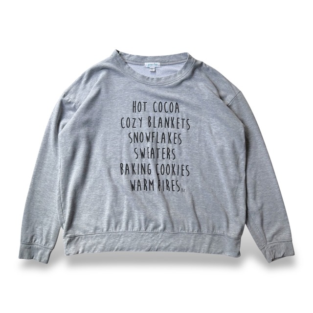 ●詳細 ・ライトグレーのボディに、縦に並ぶ6つの言葉 HOT COCOA / COZY BLANKETS / SNOWFLAKES SWEATERS / BAKING COOKIES / WARM FIRES このスウェットは、冬の記憶を言葉で編んだ、詩的なプリントが主役の一着。 アメリカ製ならではのしっかりとした縫製と、レーヨンブレンドの柔らかな肌触りが “着るだけで空気がやわらぐ”ような温度感を生み出します。 プリントはブラックで、主張しすぎず、言葉の余白がスタイルに深みを添える設計。 ラウンドネックとリブ仕様の袖口が、クラシックな構造美と快適さを両立しています。 ●サイズ ・XL (着丈:約66cm / 身幅:約71cm / 肩幅:約70cm / 袖丈:約60cm) ※多少の誤差は予めご了承ください。 ●カラー ・グレー ※モニターの発色により実物と異なる場合がございます。予めご了承ください。 ●素材 ・65% RAYON / 30% POLYESTER / 5% SPANDEX ●状態 ・着用感、襟に僅かなヨレはございますが、比較的綺麗な状態です。 画像にてご確認ください。 ※こちらの商品はUSEDアイテムです。 ※サイズ、状態を理由に返品・交換は受け付けていませんので、 気になる点はご購入前に必ずお問い合わせください。 ※USEDアイテムにご理解ある方のみご購入お願いいたします。