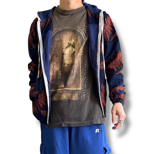 ●詳細 ・葉柄が全体に施された、デザインジップアップパーカー。 ネイビーボディにブラウンの葉柄に 白の紐とパイピングでメリハリがついた1枚。 ハンドメイドによる1点ものの希少性と 温もりある丁寧な作りが魅力的なアイテムです。 ●着用モデル ・168cm ●サイズ ・OS (着丈:約69cm / 身幅:約53cm / 肩幅:約49cm / 袖丈:約62cm) ※多少の誤差は予めご了承ください。 ●カラー ・ネイビー / ブラウン ※モニターの発色により実物と異なる場合がございます。予めご了承ください。 ●素材 ・不明(おそらくポリエステル、コットン。) ●状態 ・着用感、僅かながらなダメージはございますが、比較的綺麗な状態です。 画像にてご確認ください。 ※こちらの商品はUSEDアイテムです。 ※サイズ、状態を理由に返品・交換は受け付けていませんので、 気になる点はご購入前に必ずお問い合わせください。 ※USEDアイテムにご理解ある方のみご購入お願いいたします。