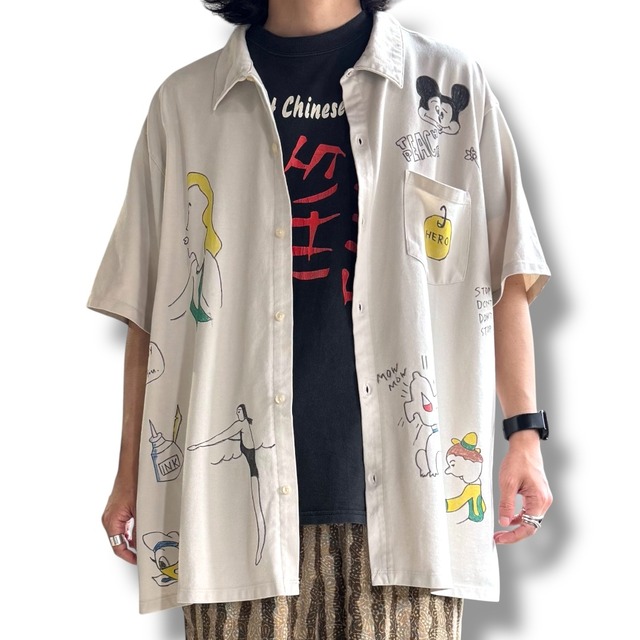 POP ART DESIGN HAND PAINT NO COLLAR S/S SHIRT / アート ハンド ペイント 落書き 半袖 シャツ