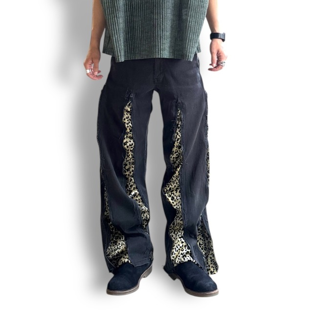 REBUILD FLARE SILHOUETTE LEOPARD LINE DENIM PANTS / ワイド フレア レオパード 柄 ライン デニム パンツ ハンド メイド リメイク