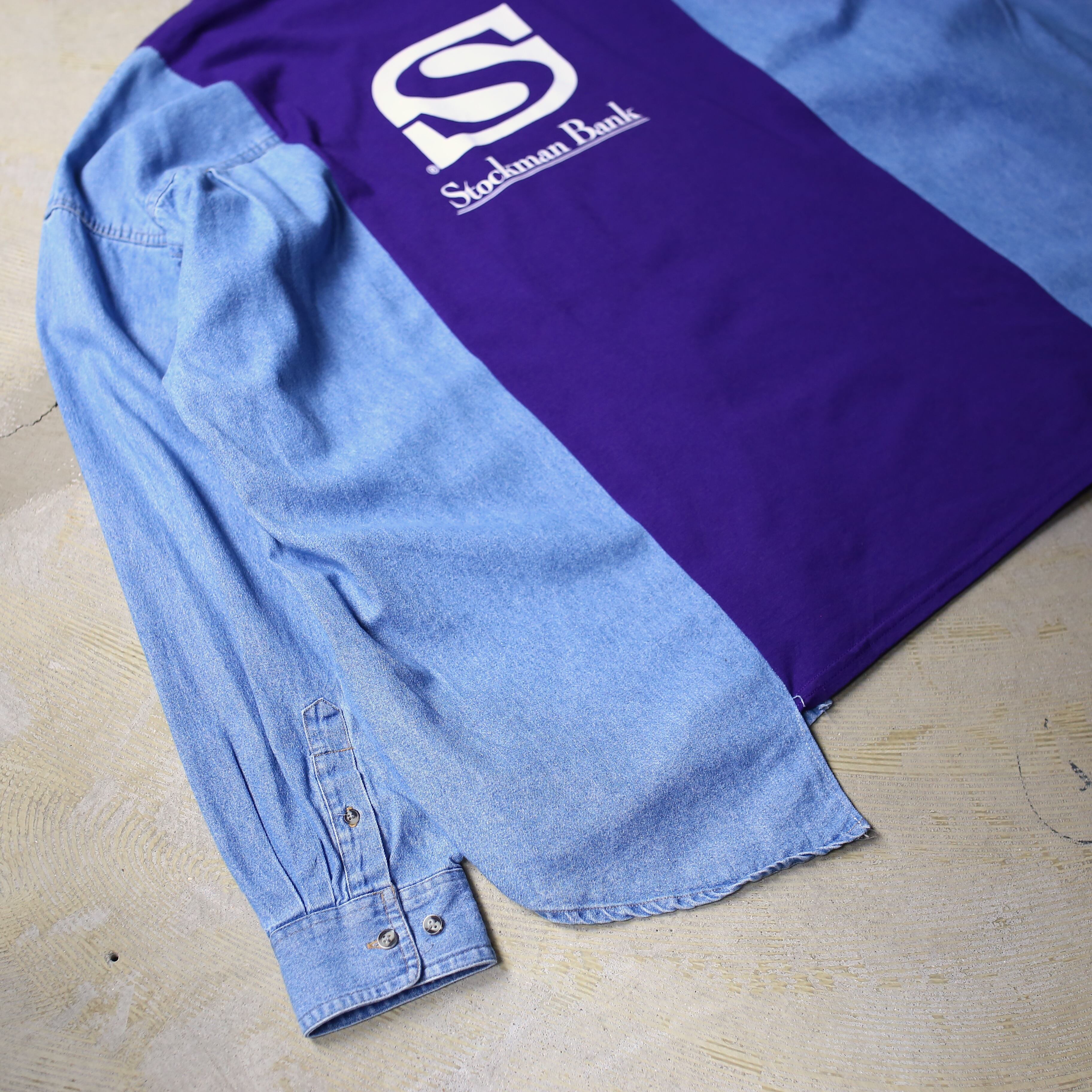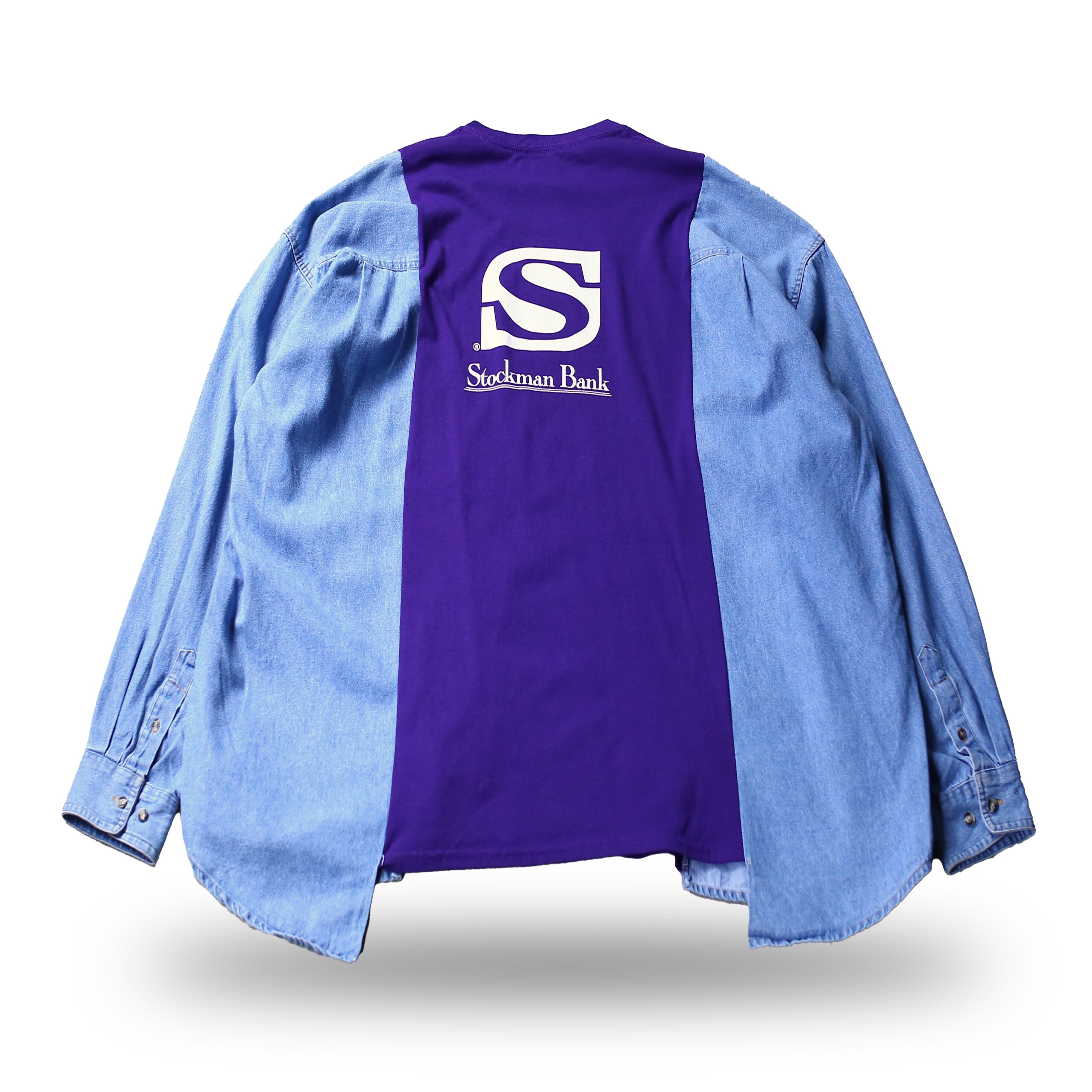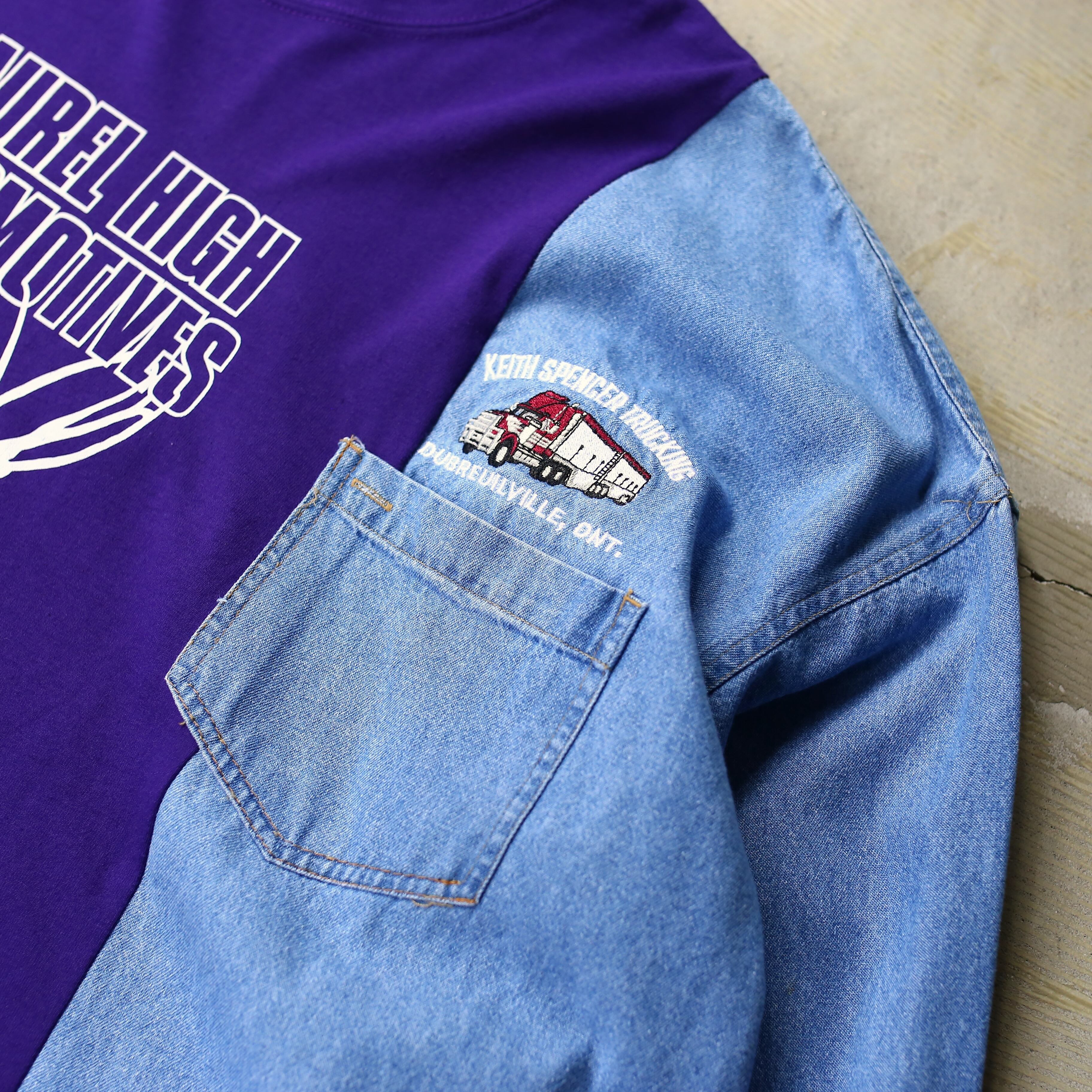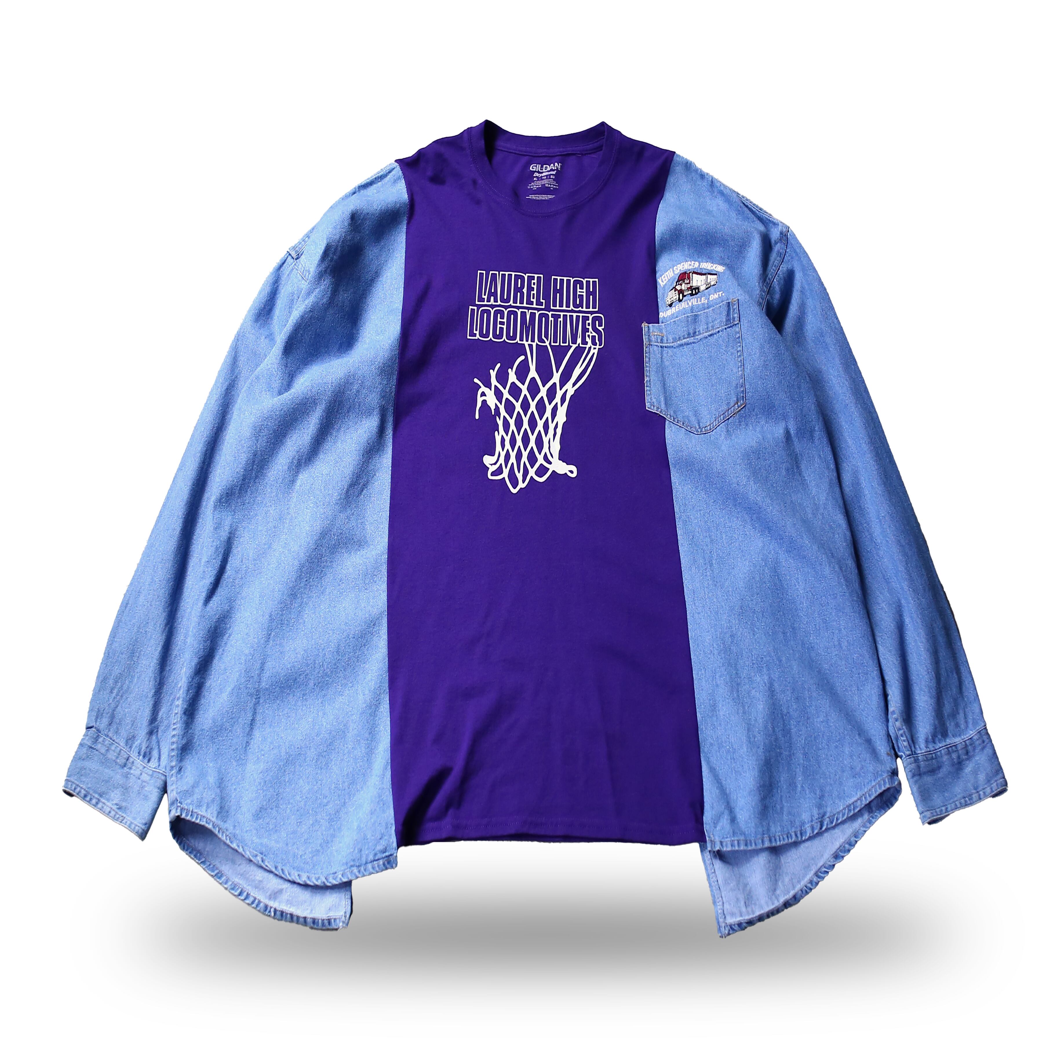 ・ロゴプリントTシャツとデニムシャツをドッキングしたリメイク長袖トップス。