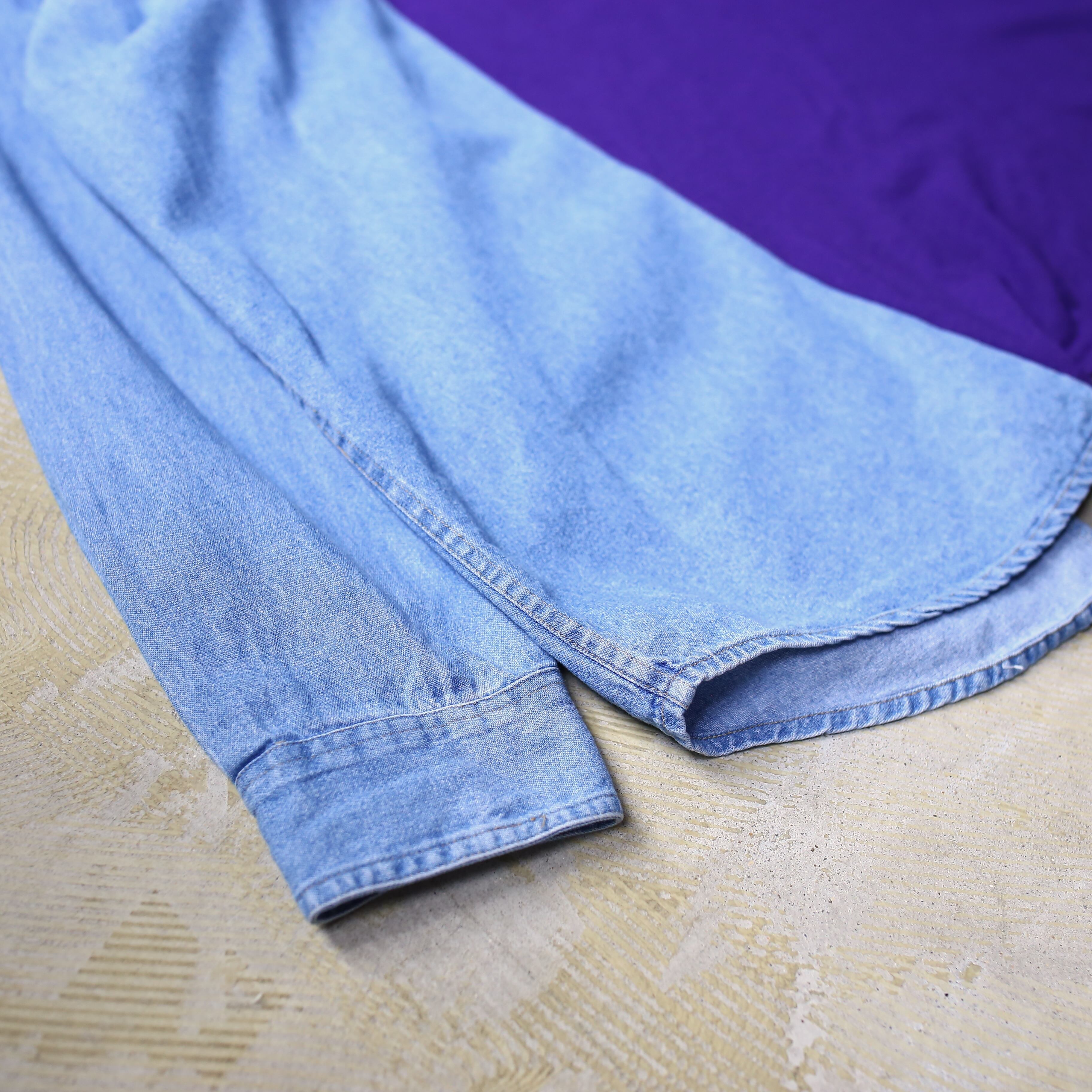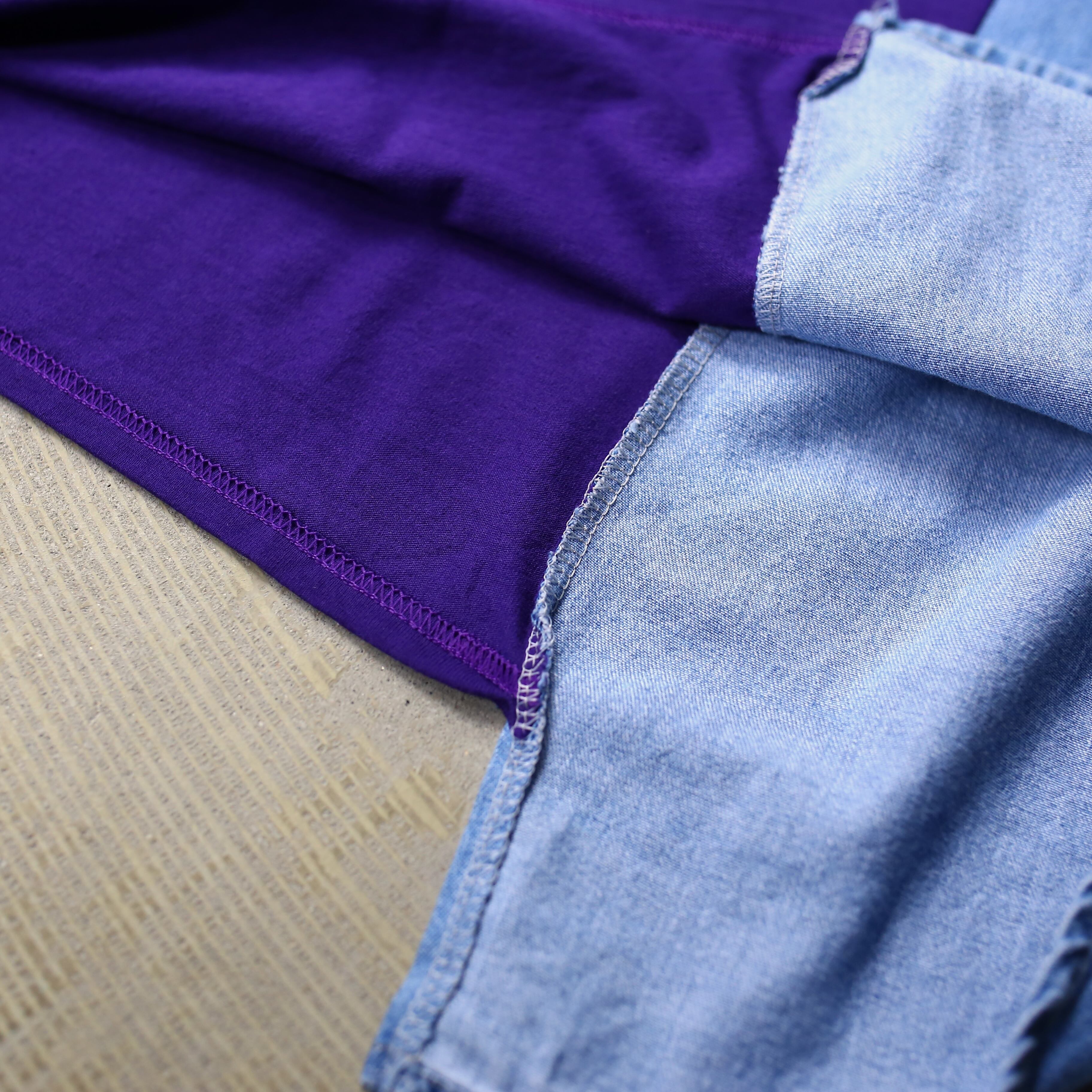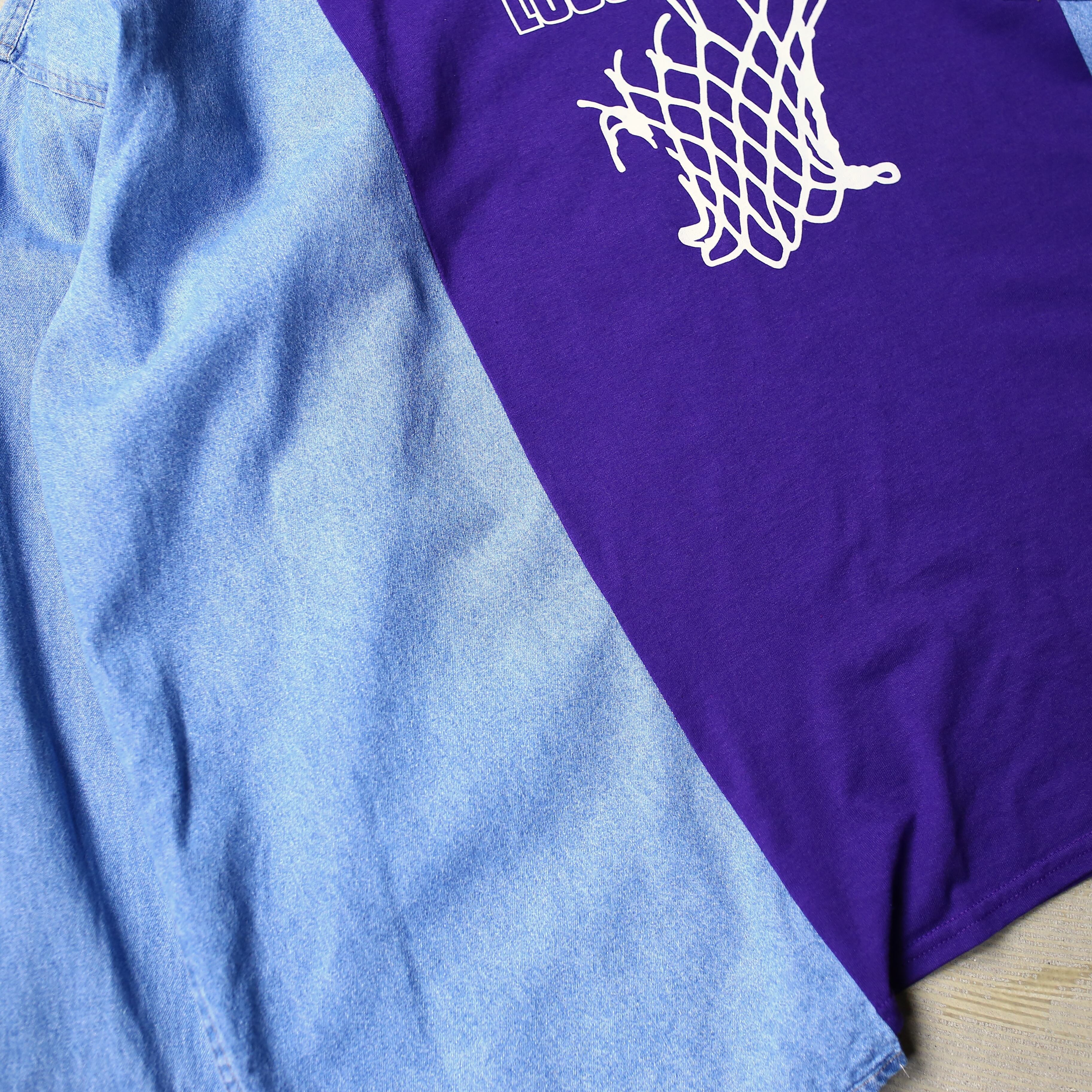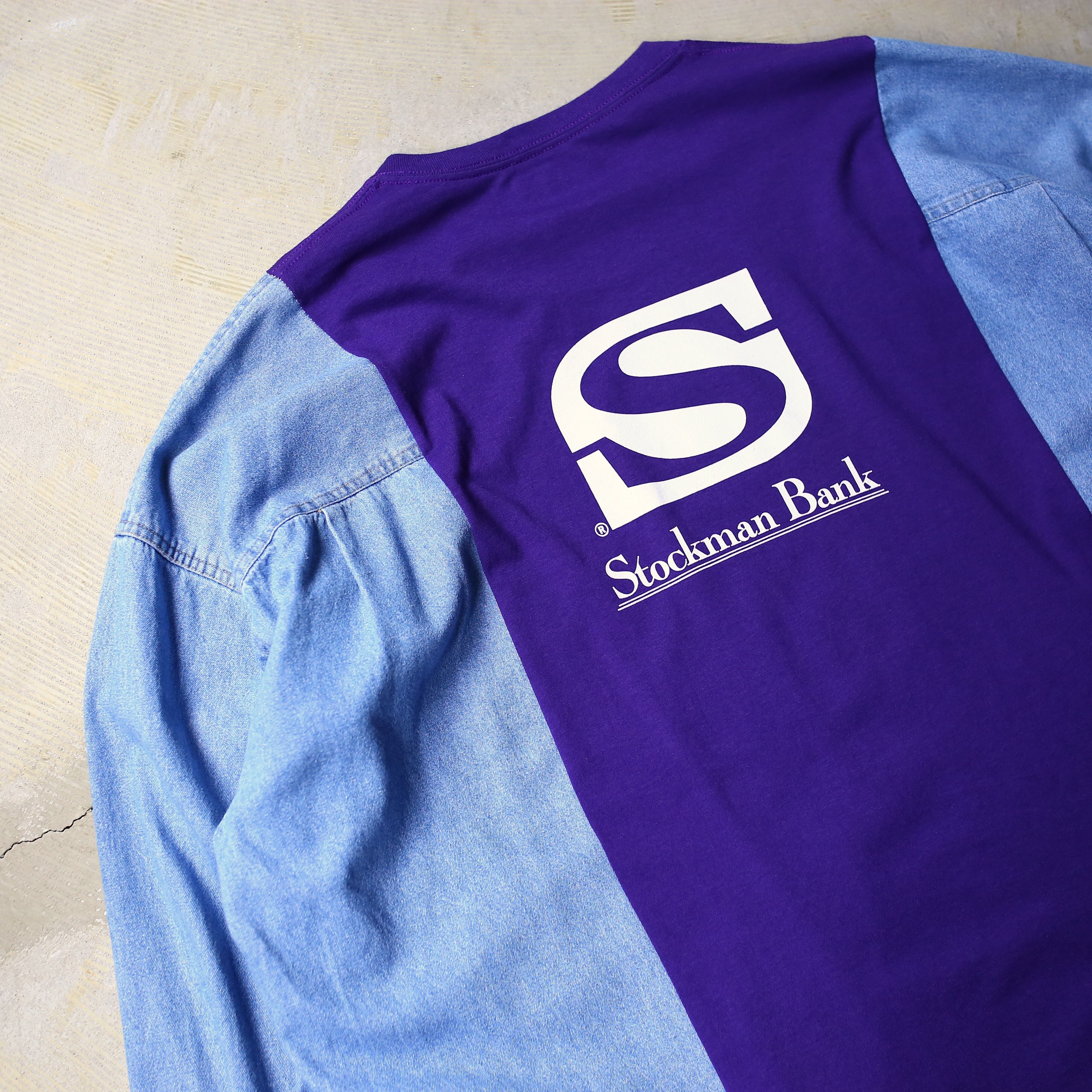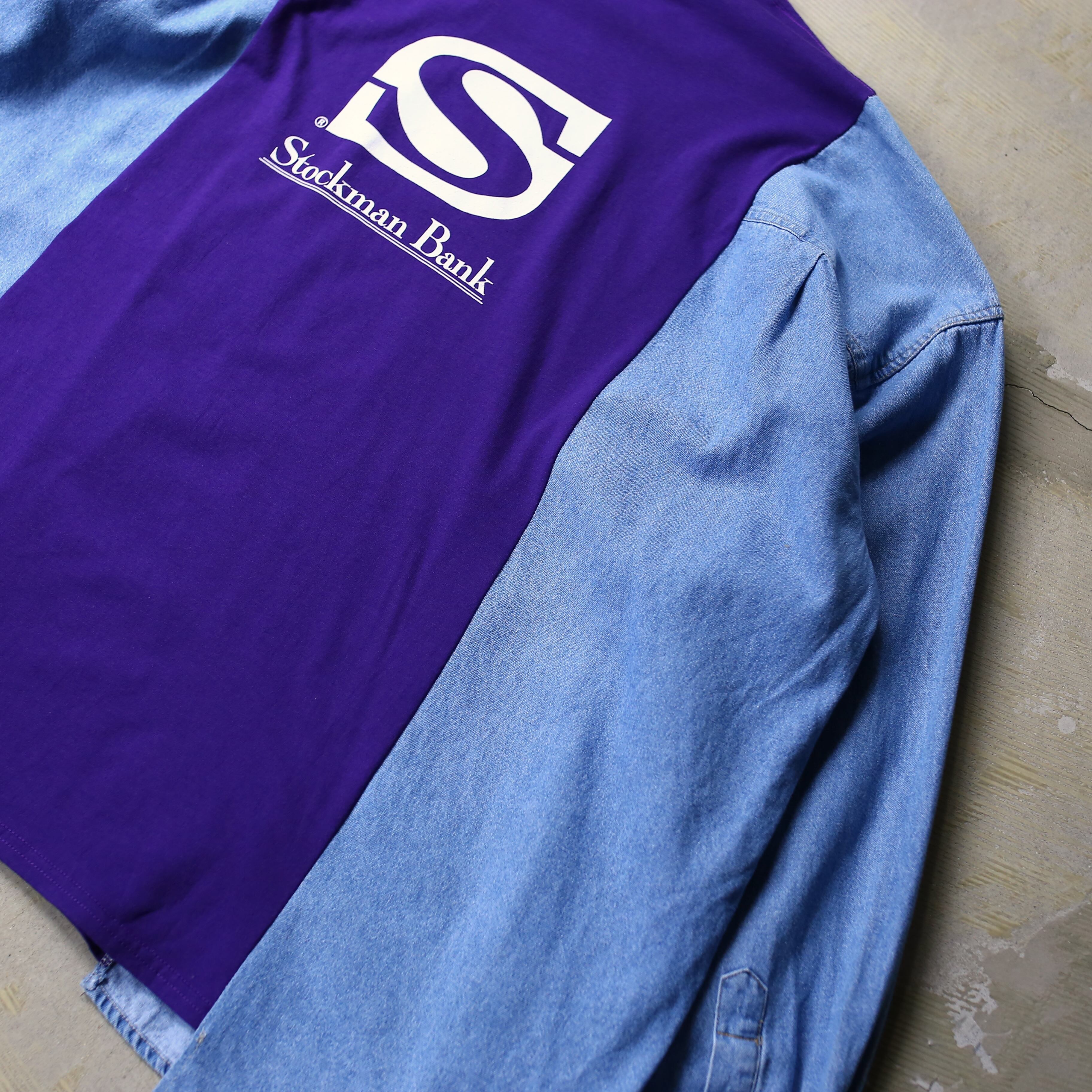 ・ロゴプリントTシャツとデニムシャツをドッキングしたリメイク長袖トップス。