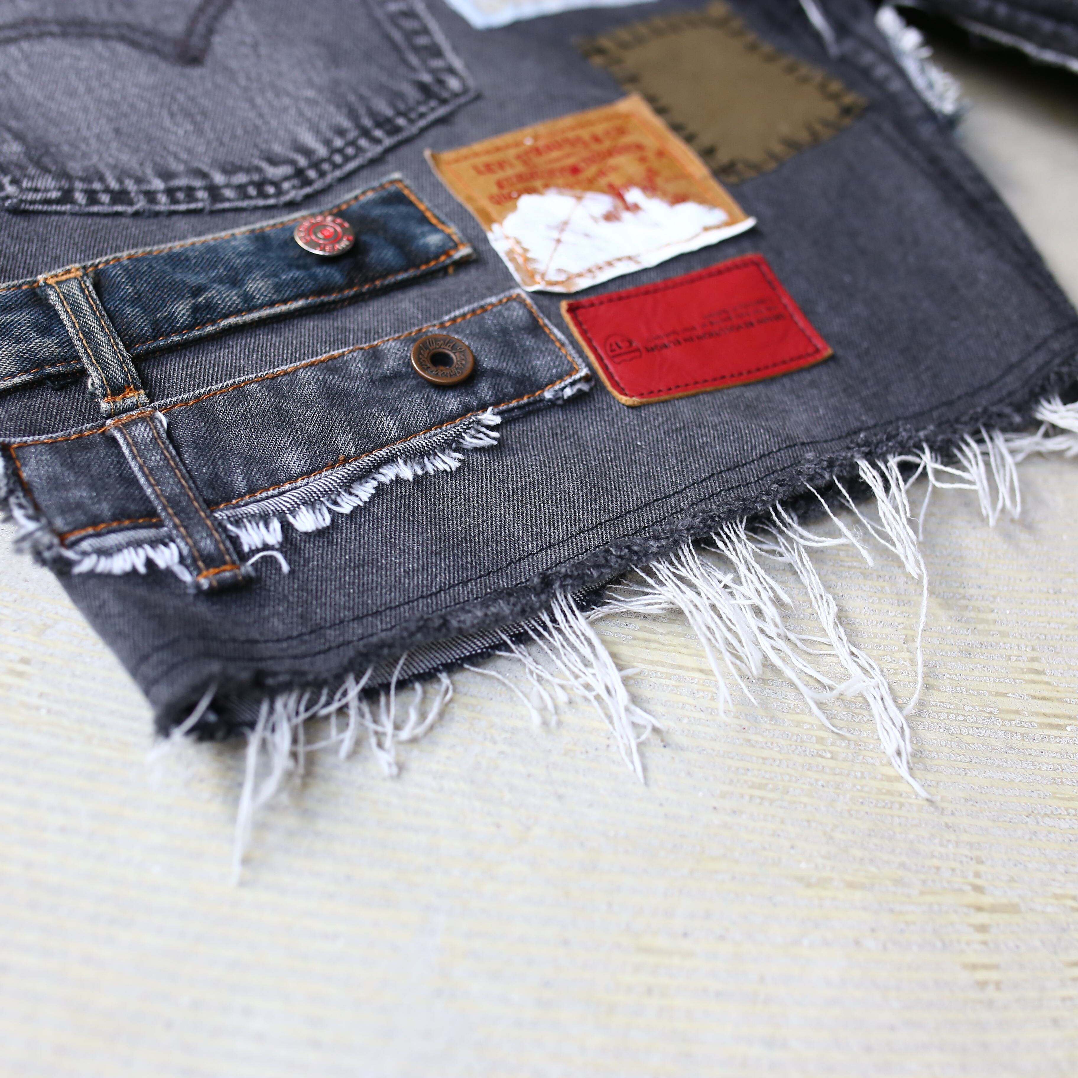 デニムショーツへと変貌させたリメイクアイテムとなります。