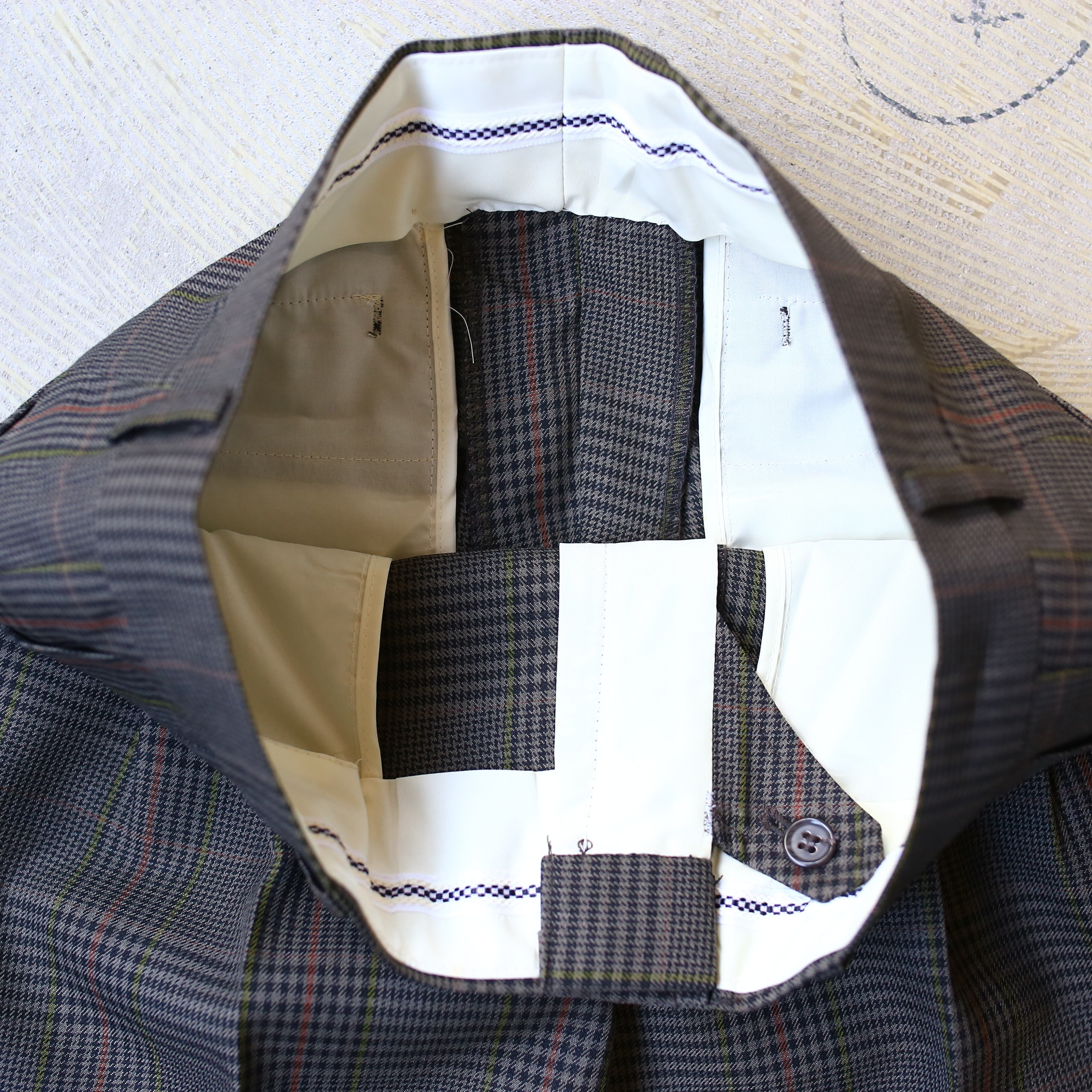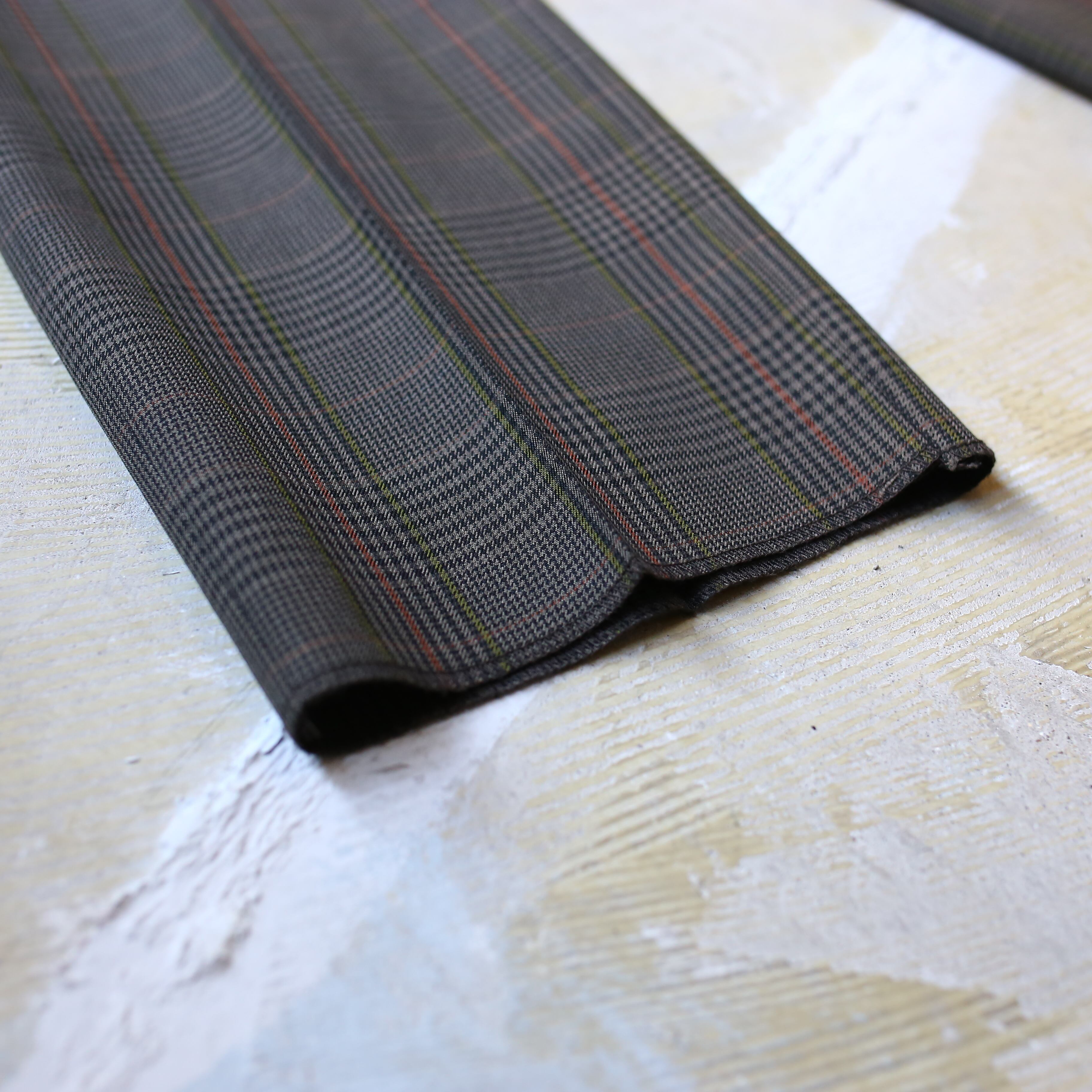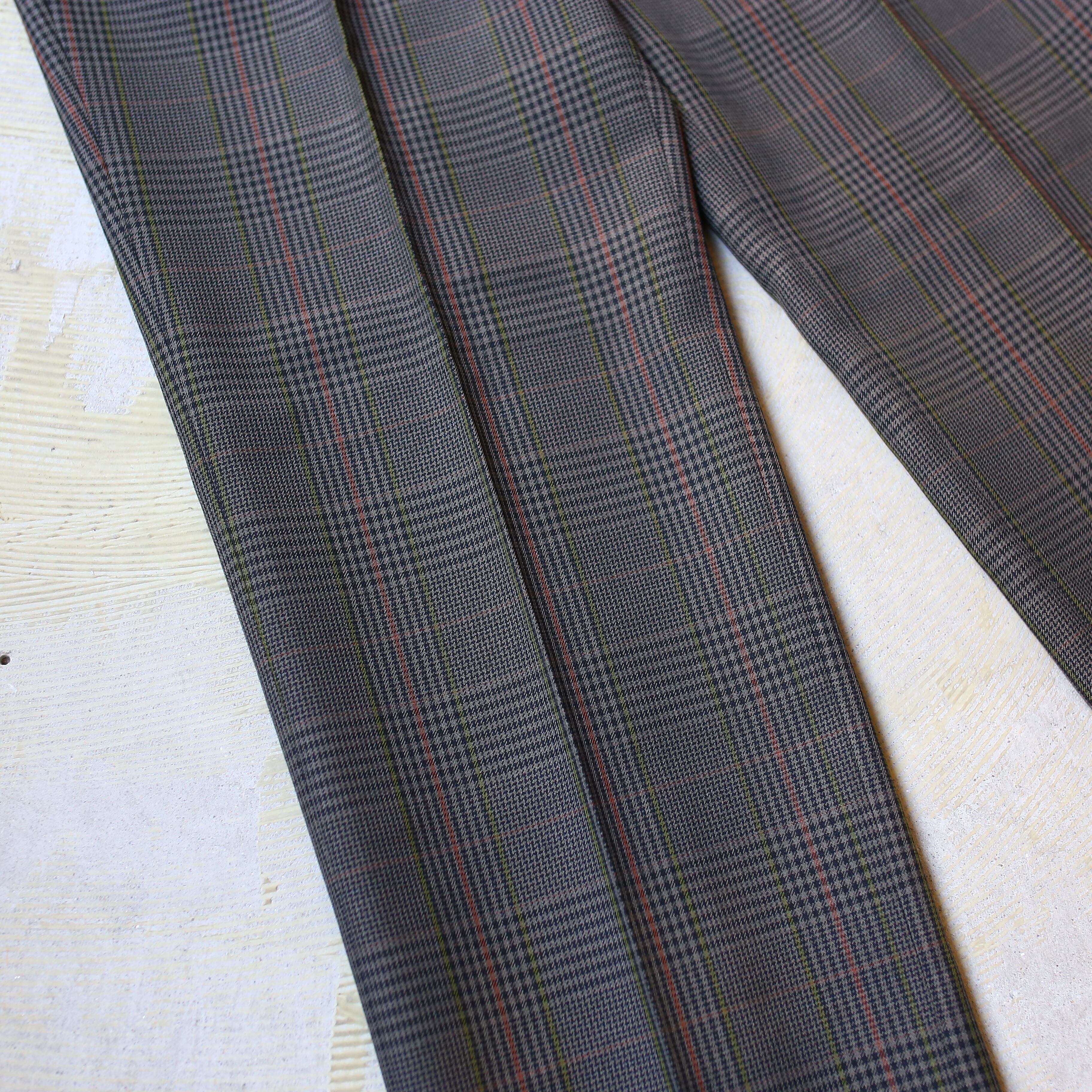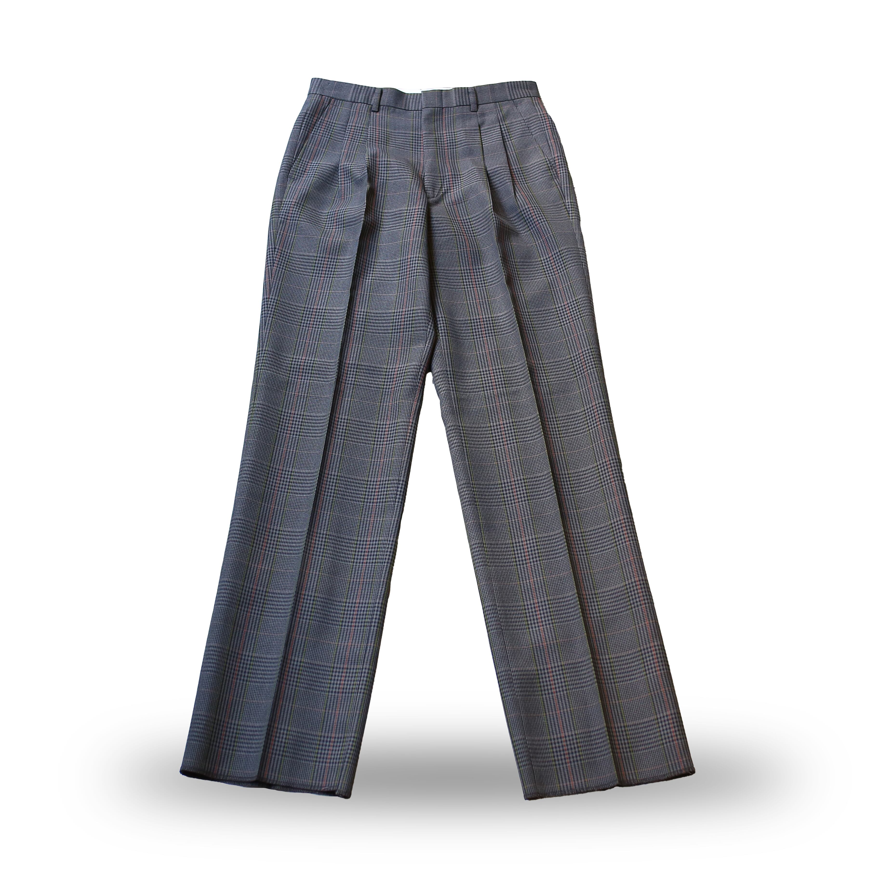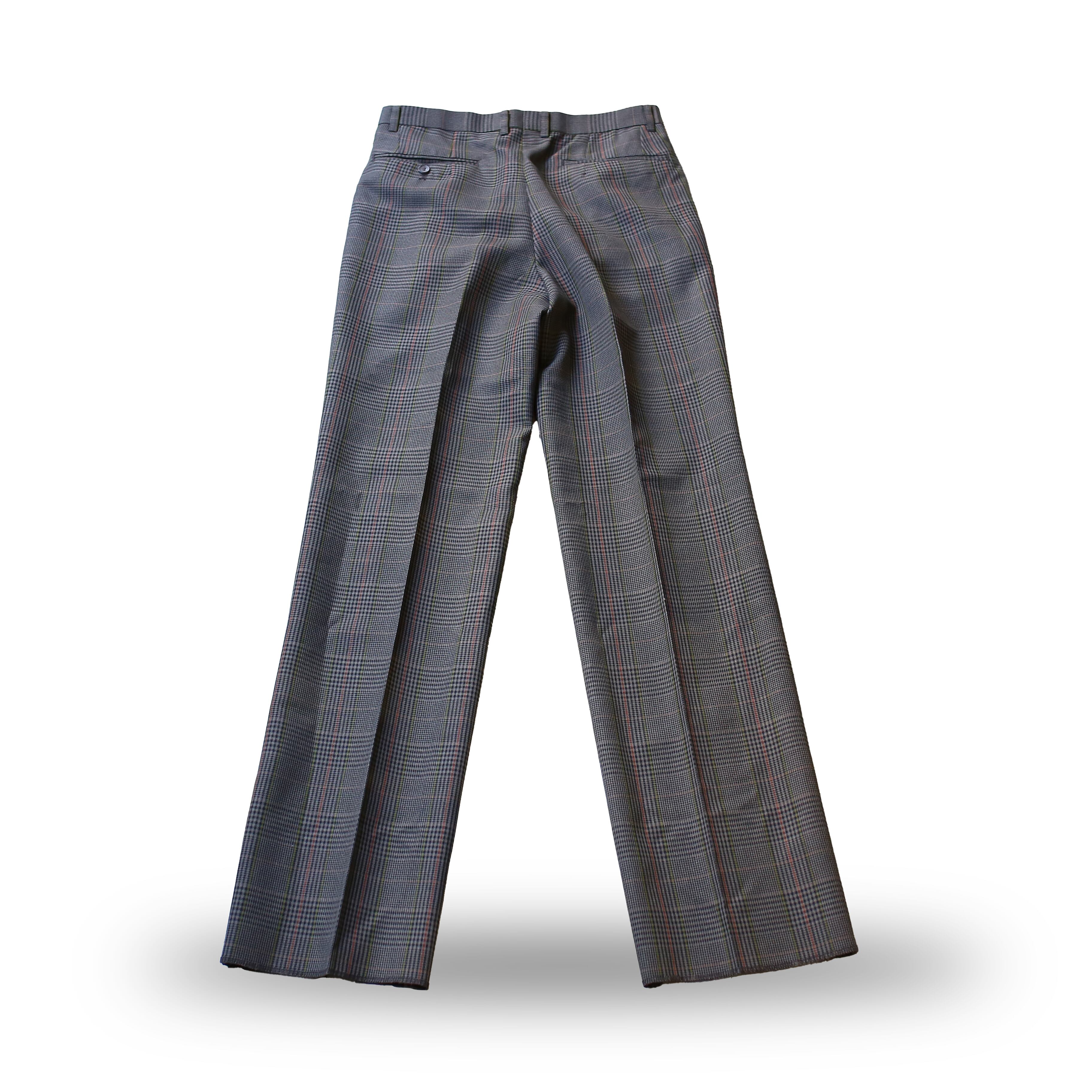 ・グレーカラーを基調としたチェック柄のデザインスラックス。