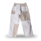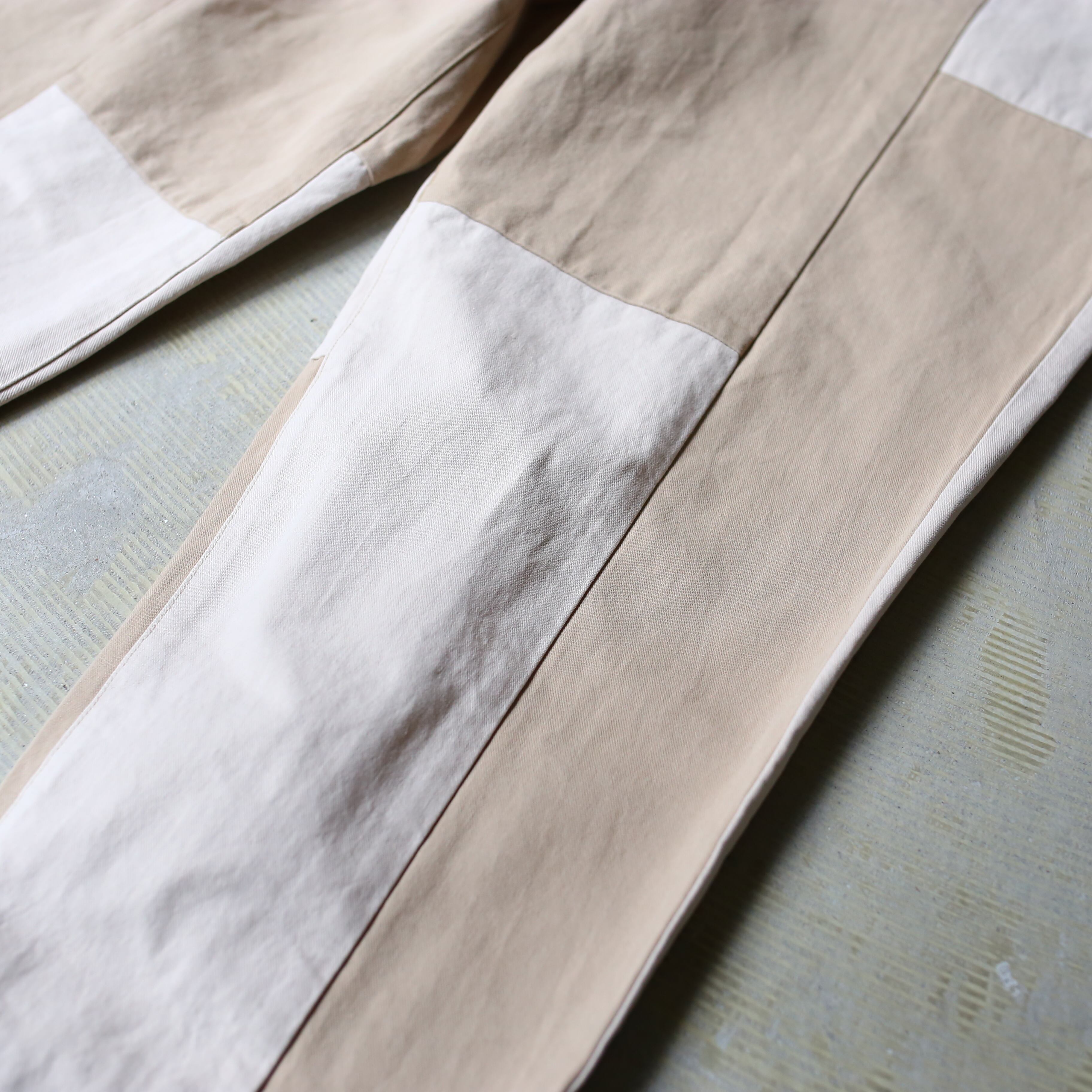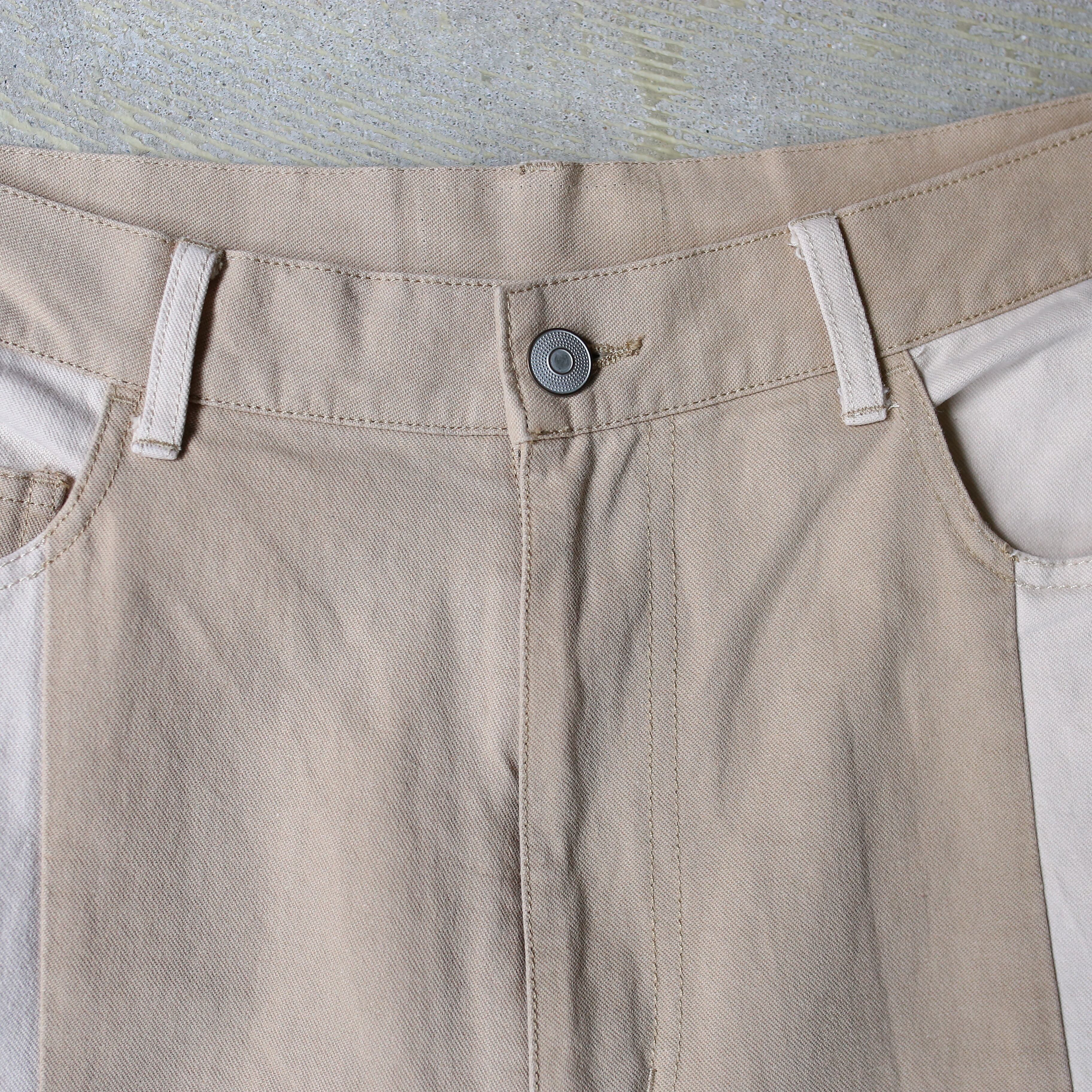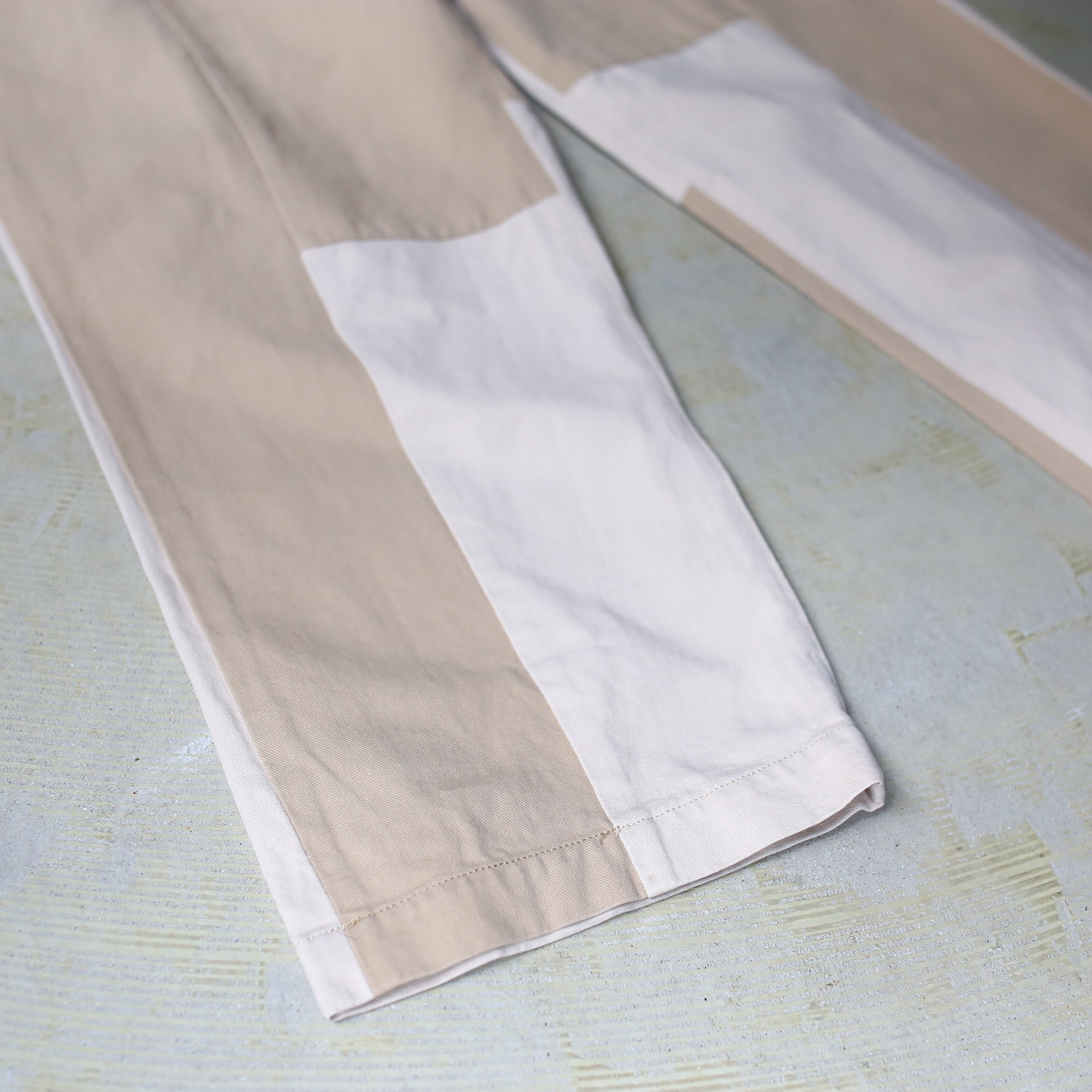 ・ベージュとアイボリーのバイカラーデザインパンツ。