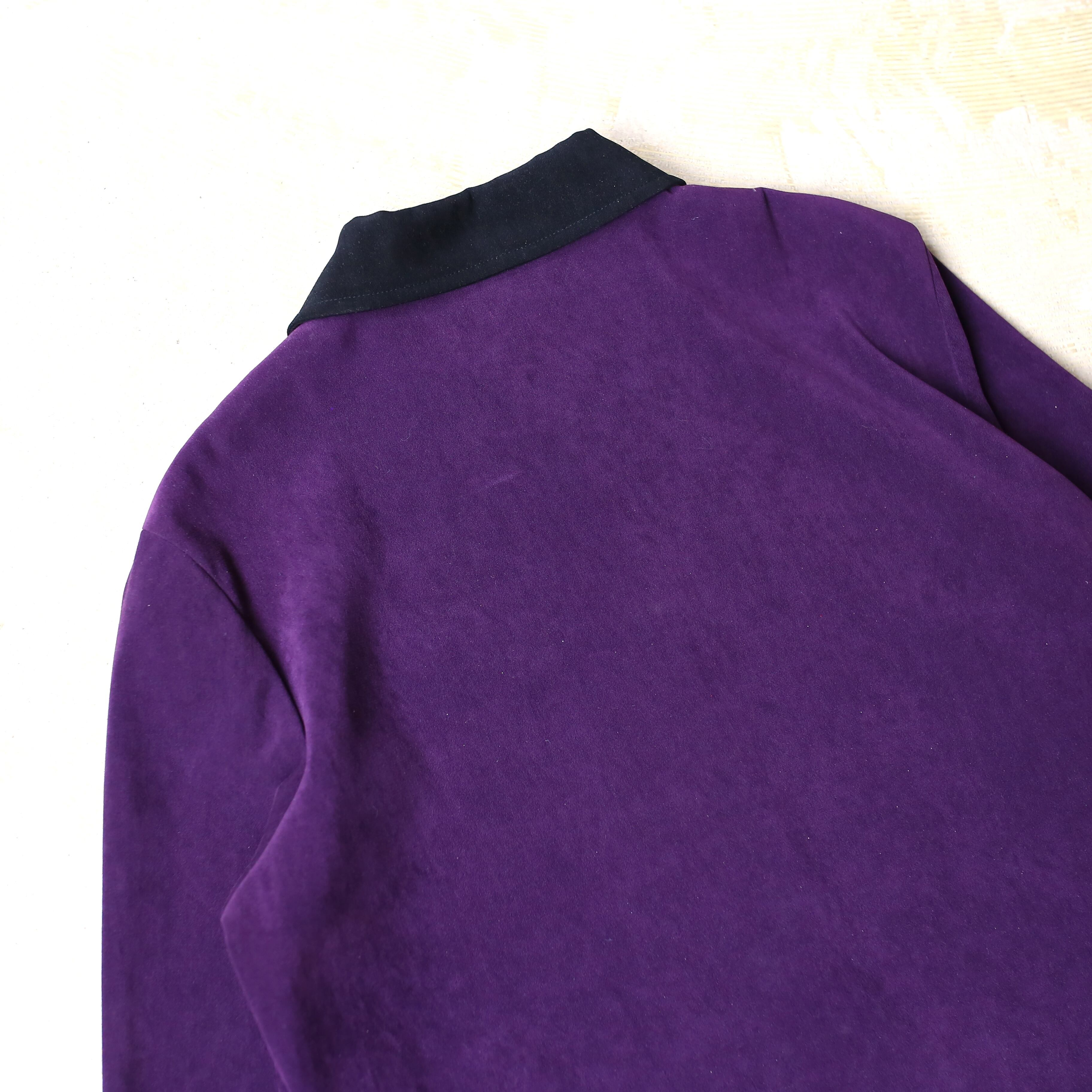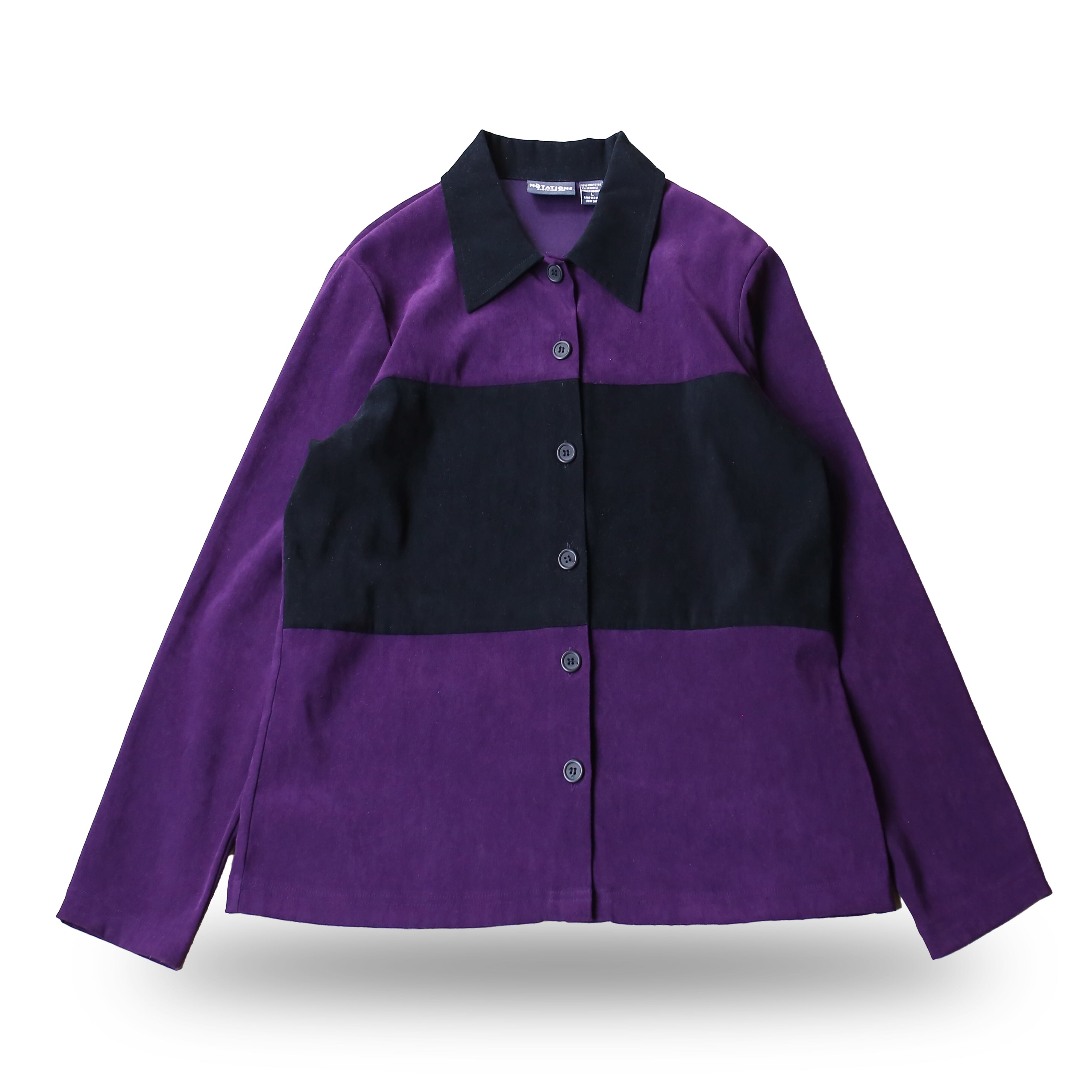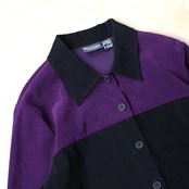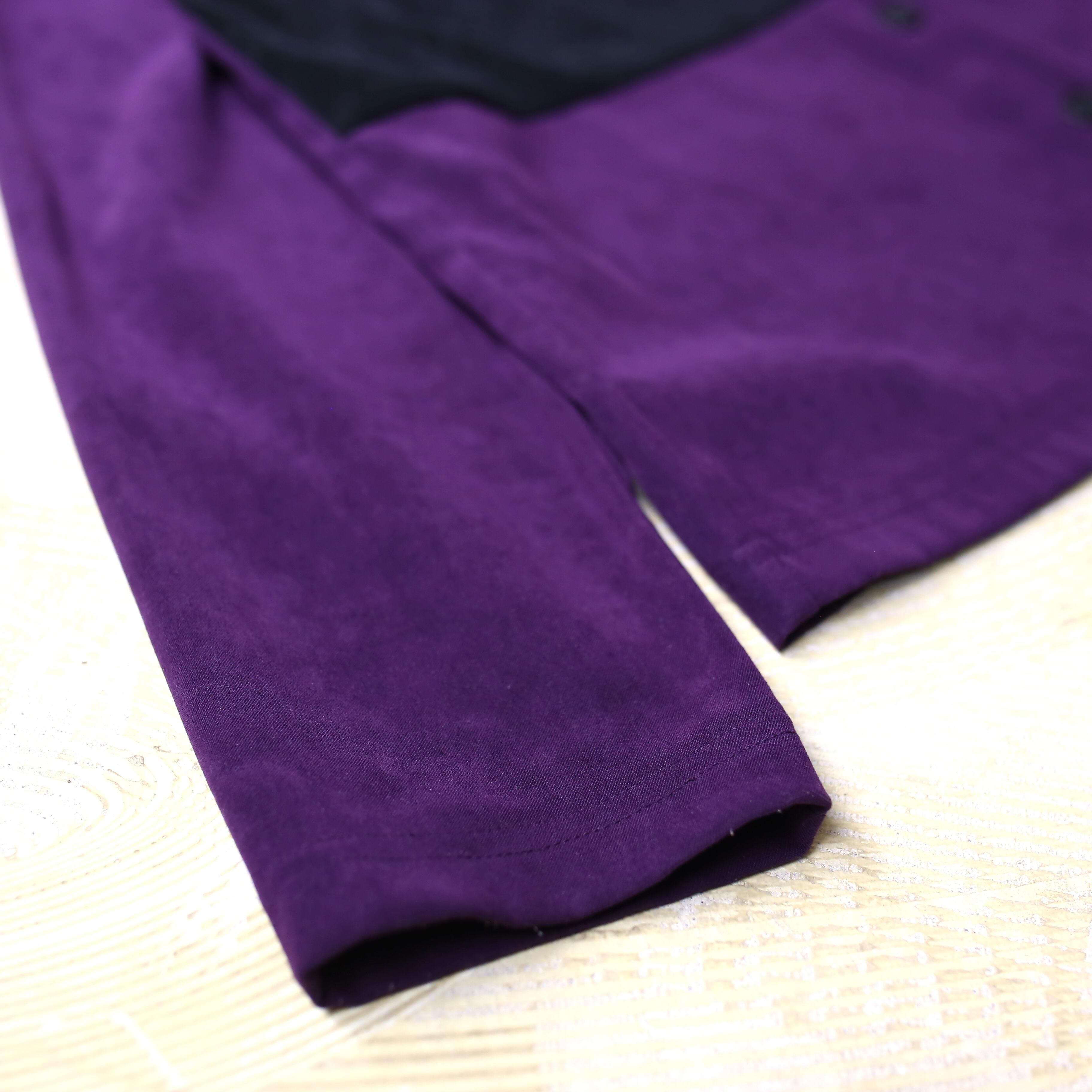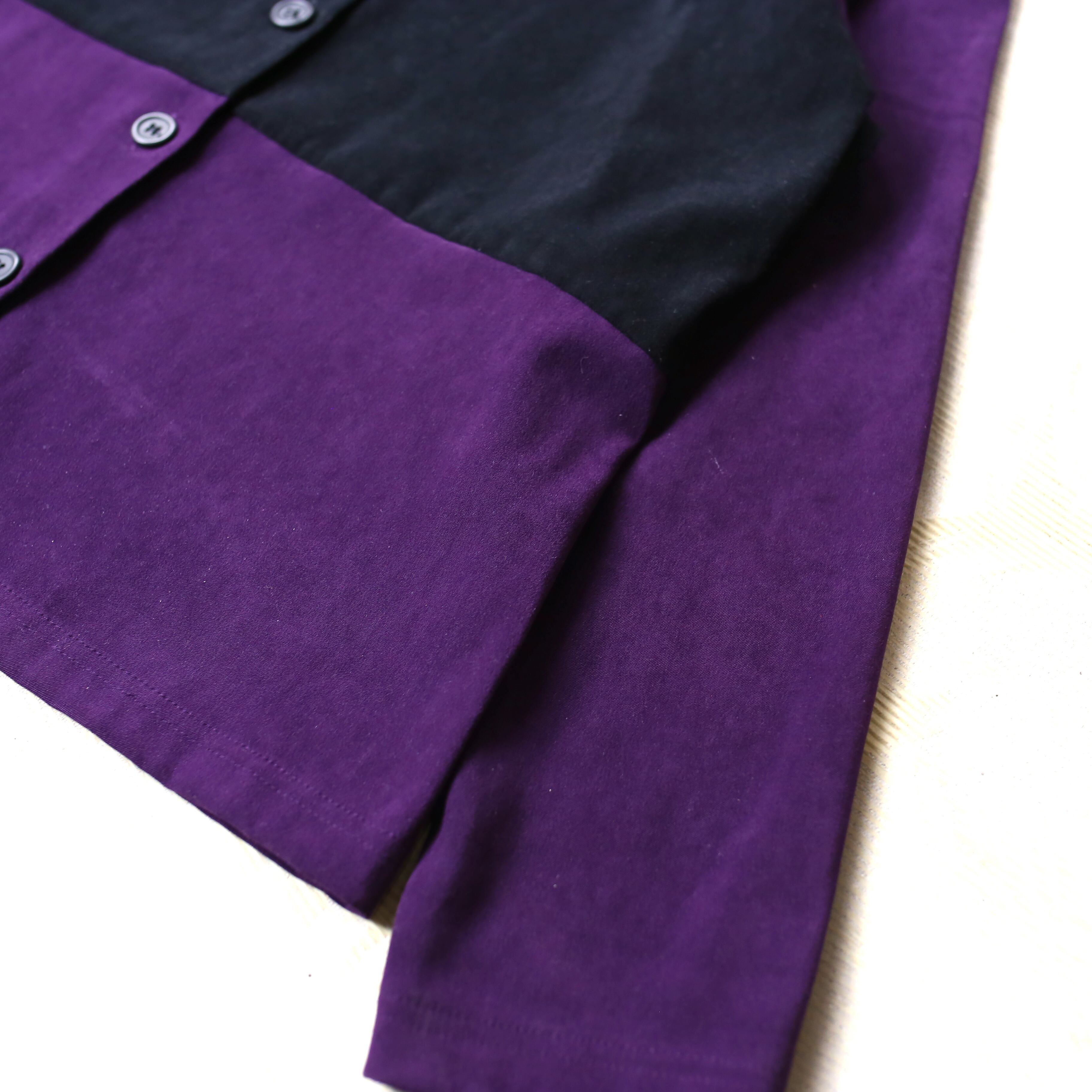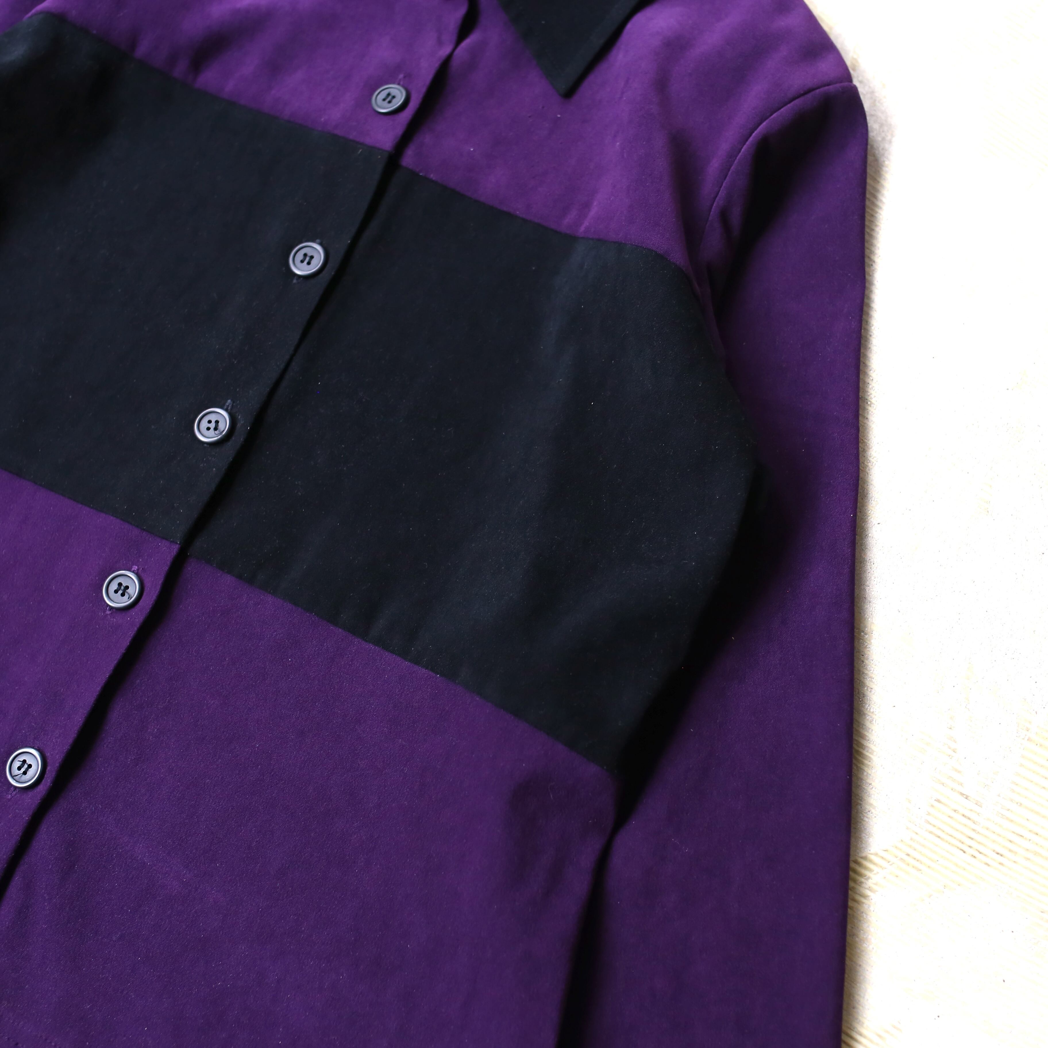 ・黒と紫のバイカラー切替デザイン長袖シャツ。