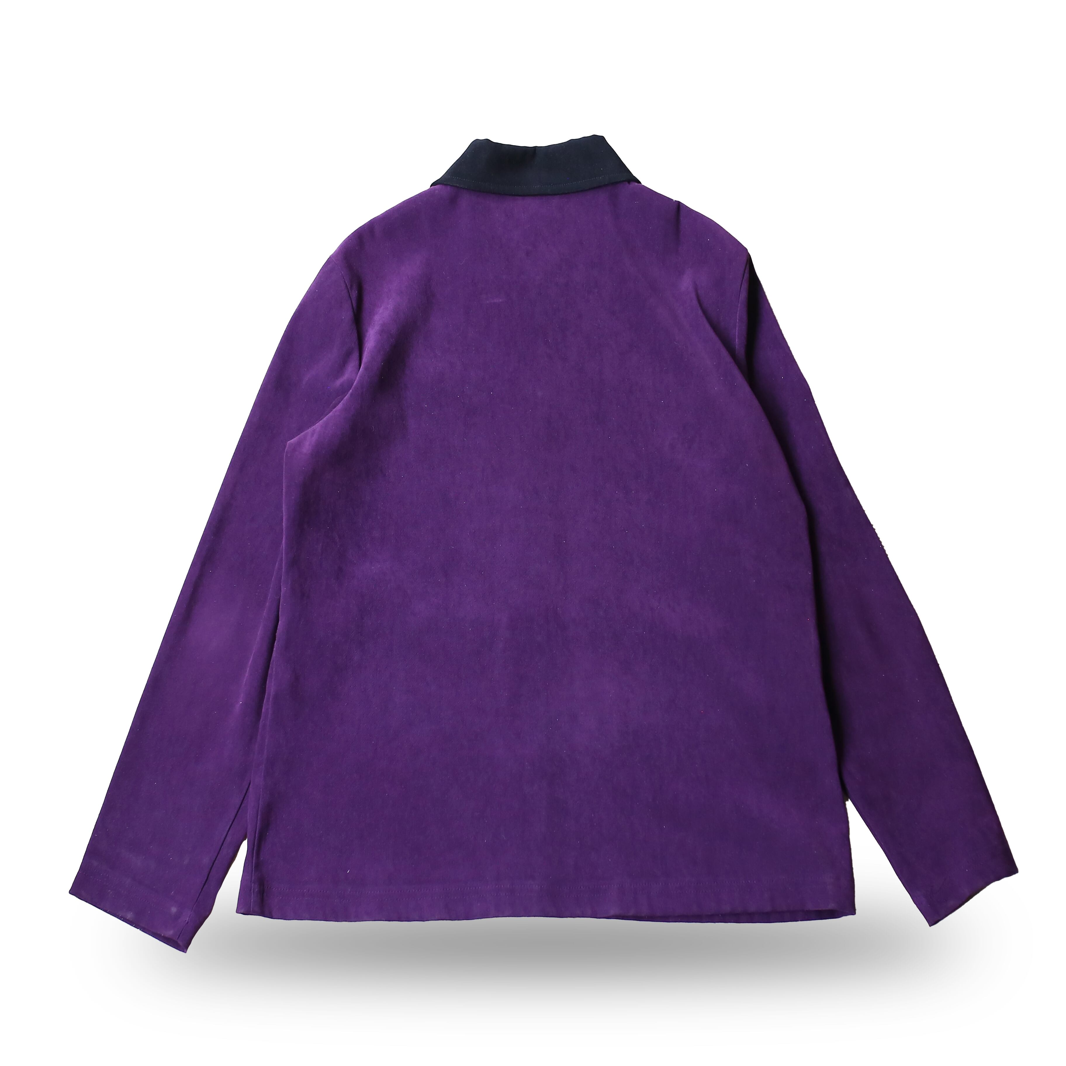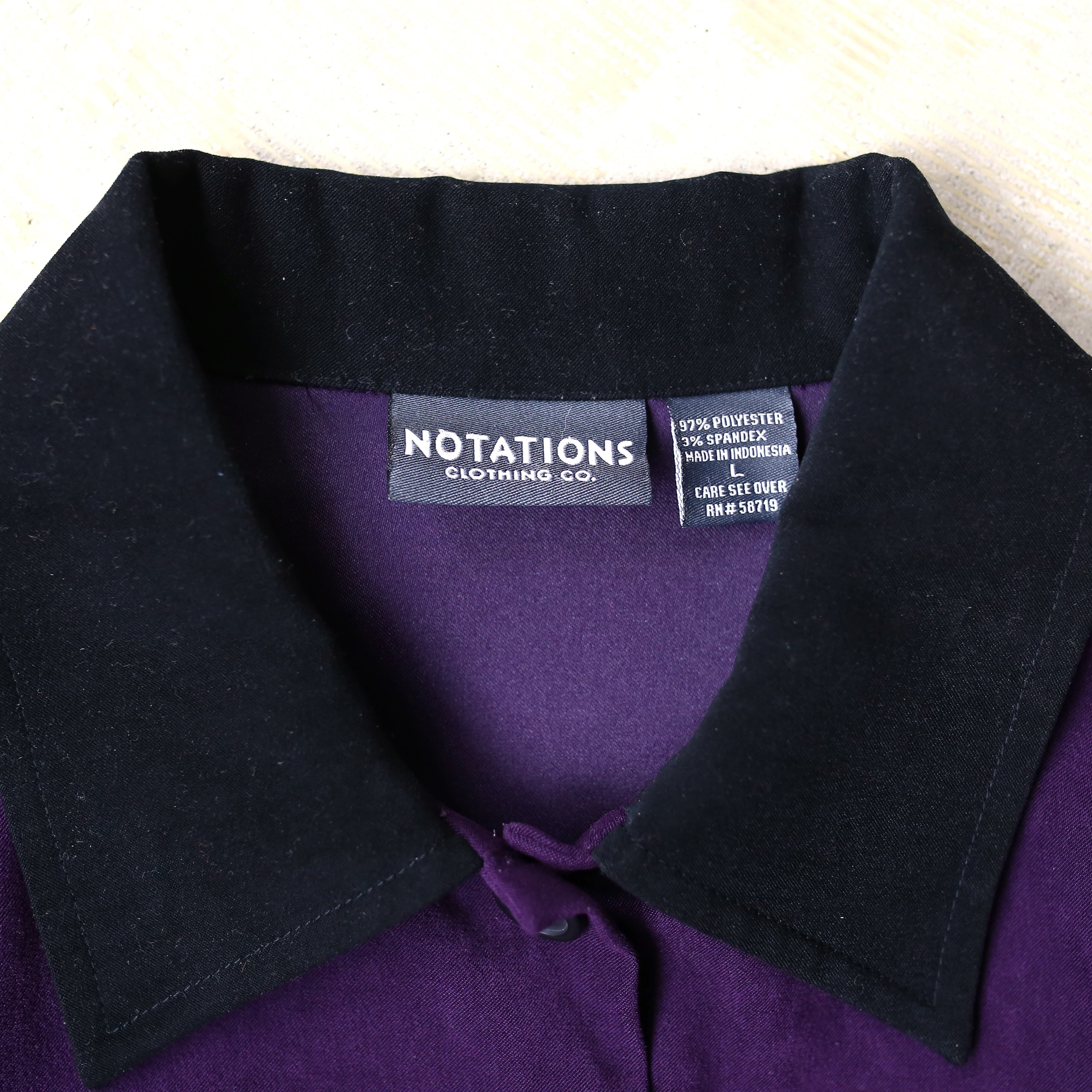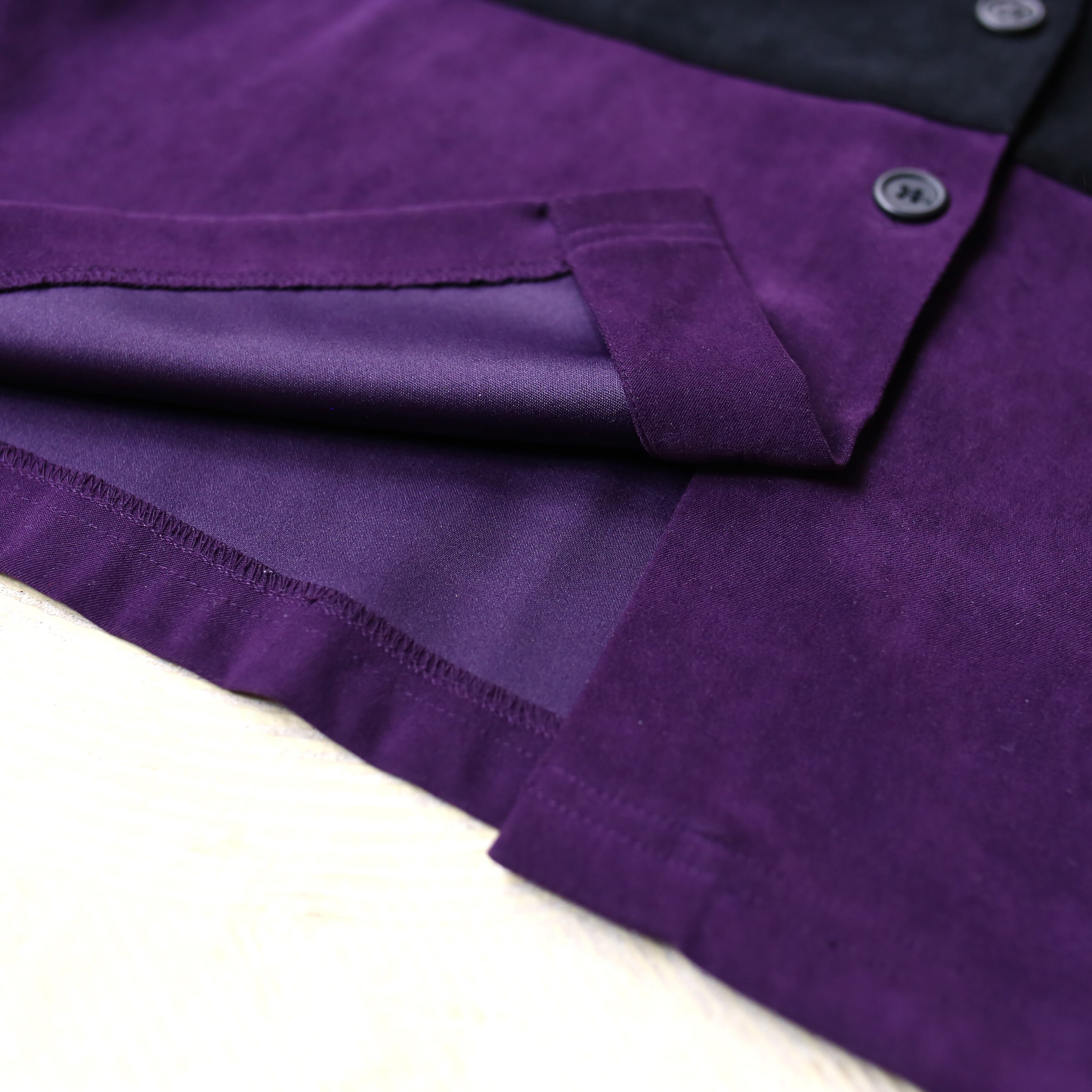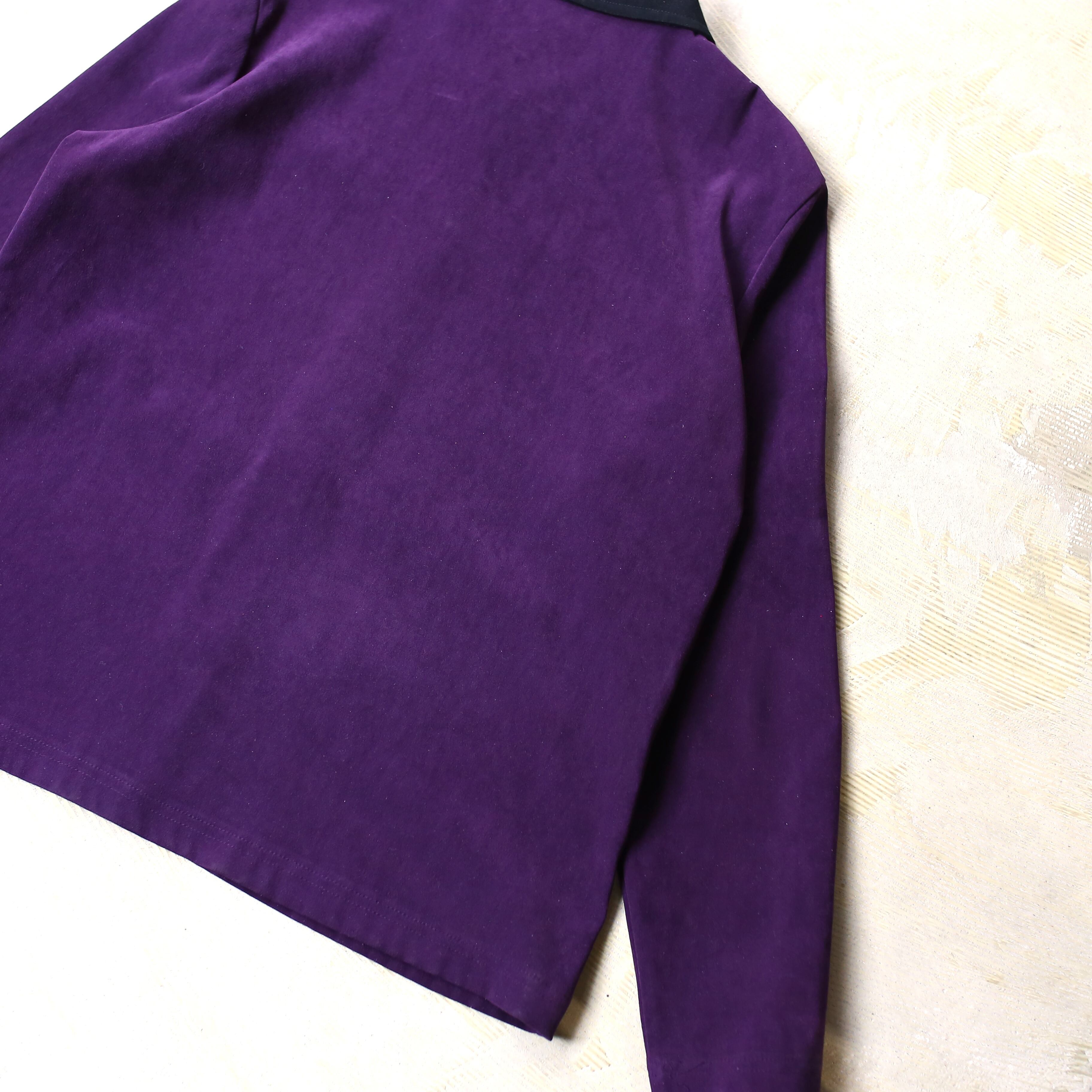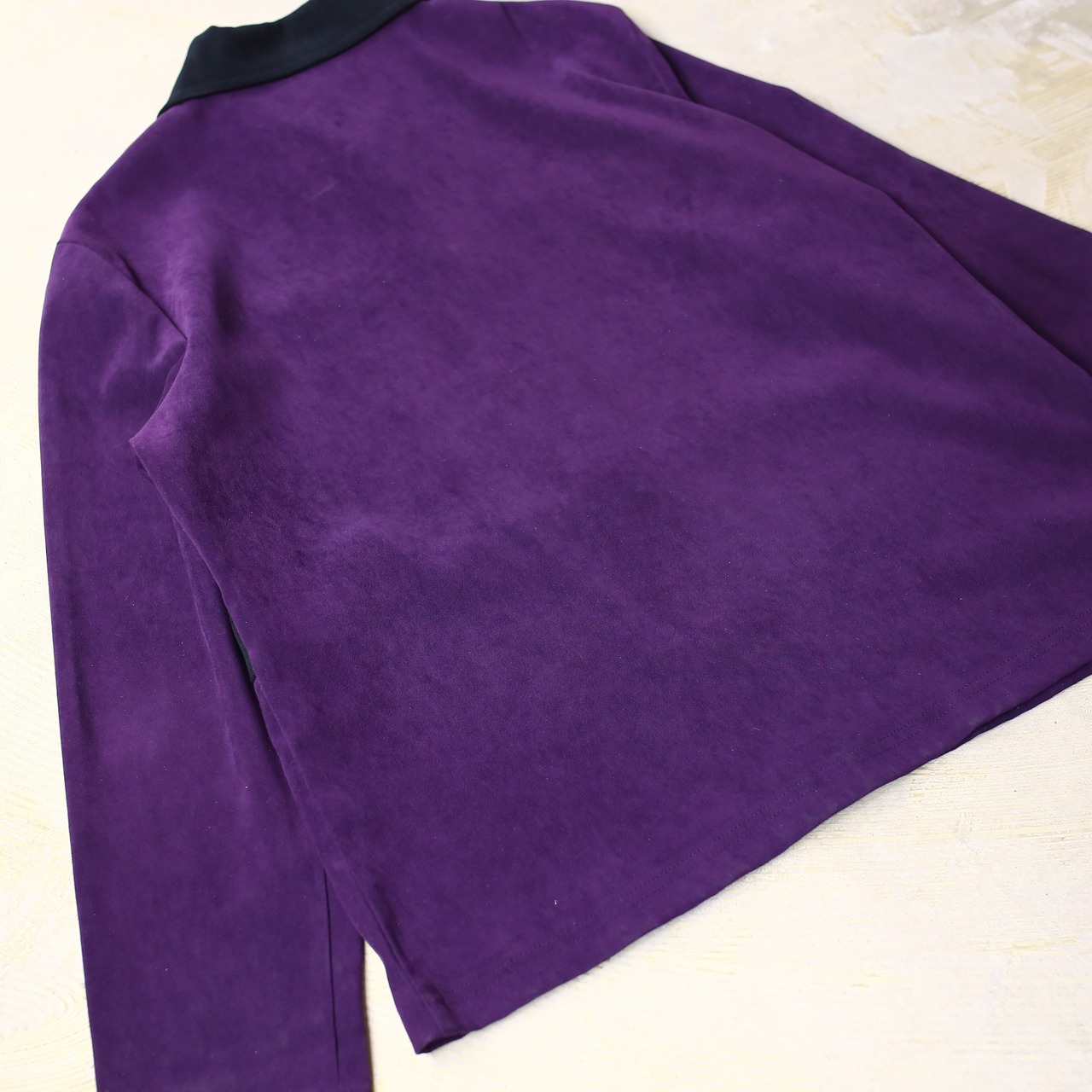・黒と紫のバイカラー切替デザイン長袖シャツ。