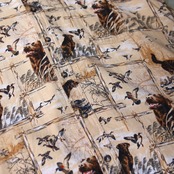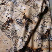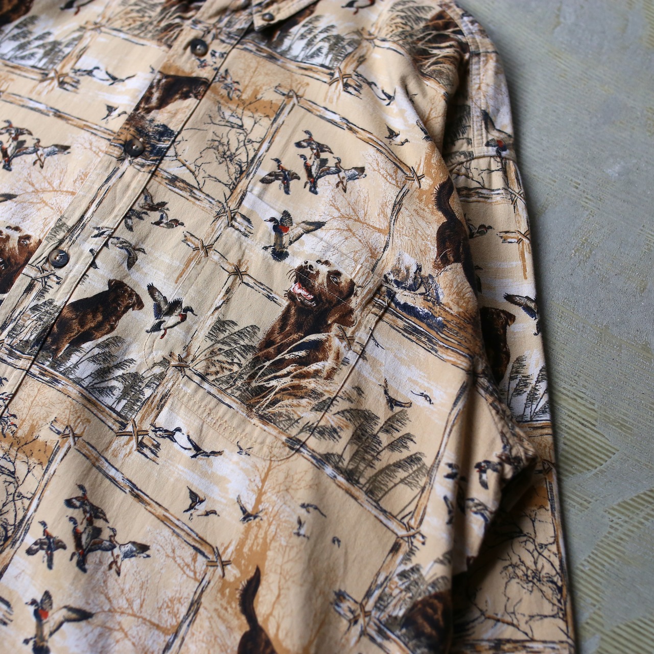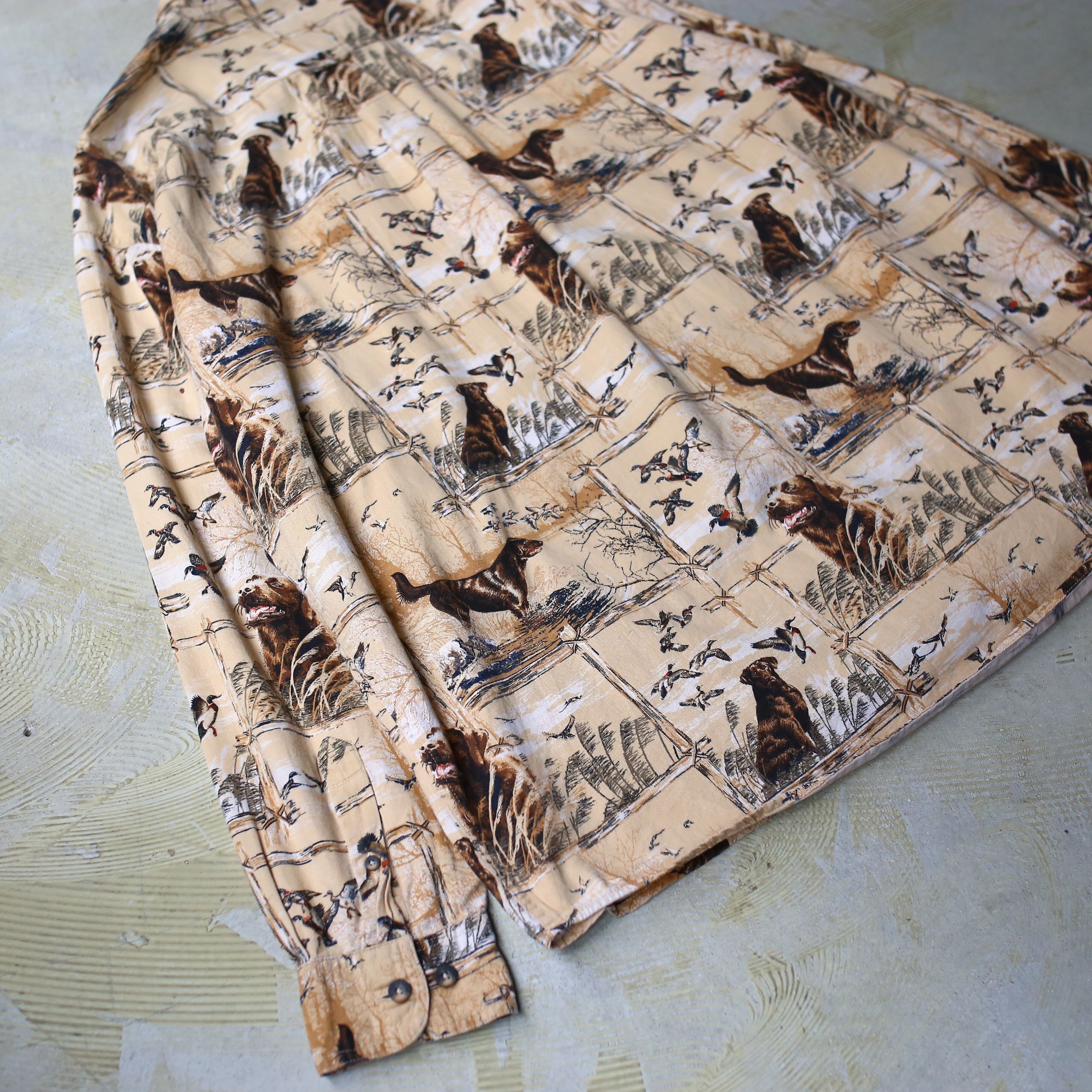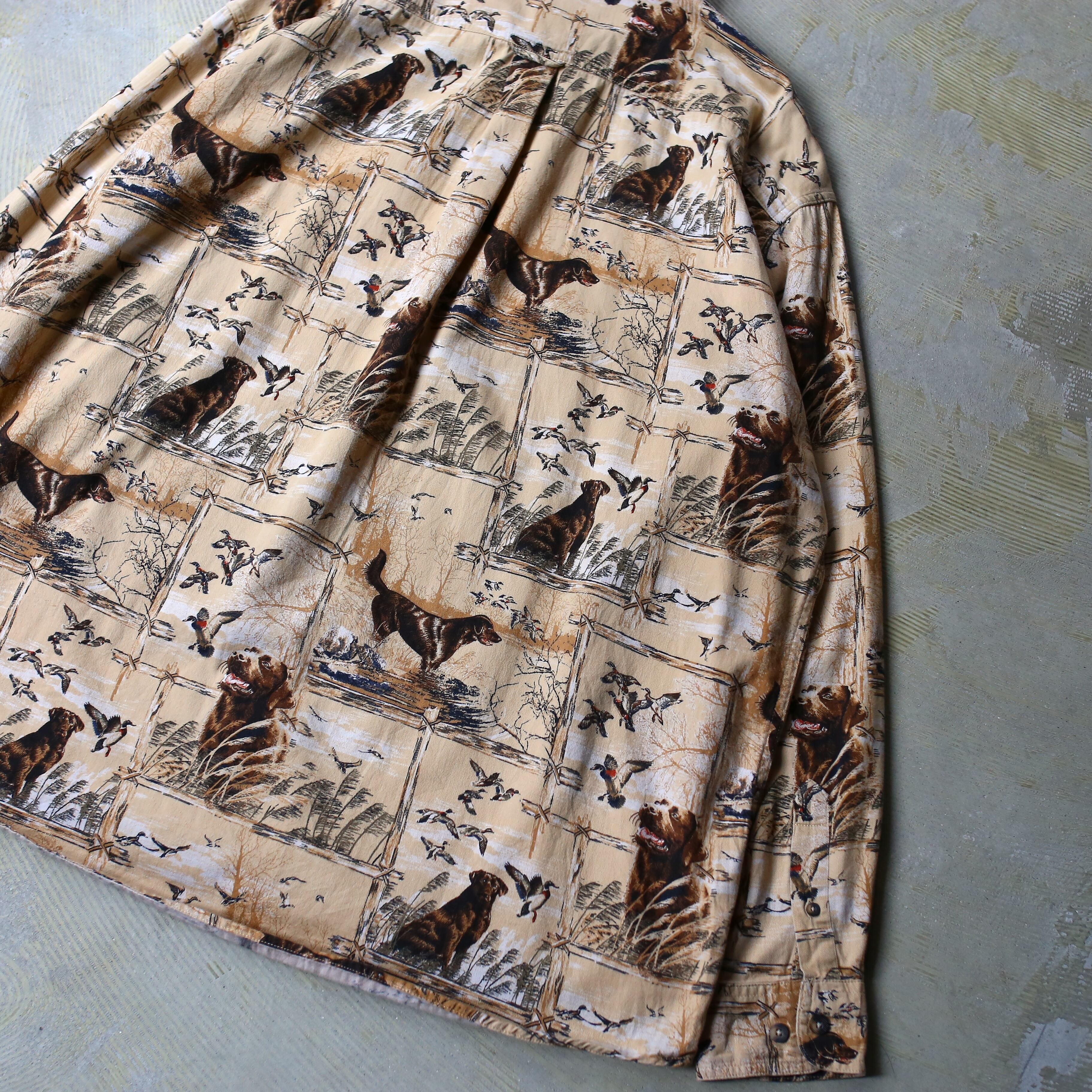 ・犬とカモと風景が広がる総柄のデザイン長袖シャツ。