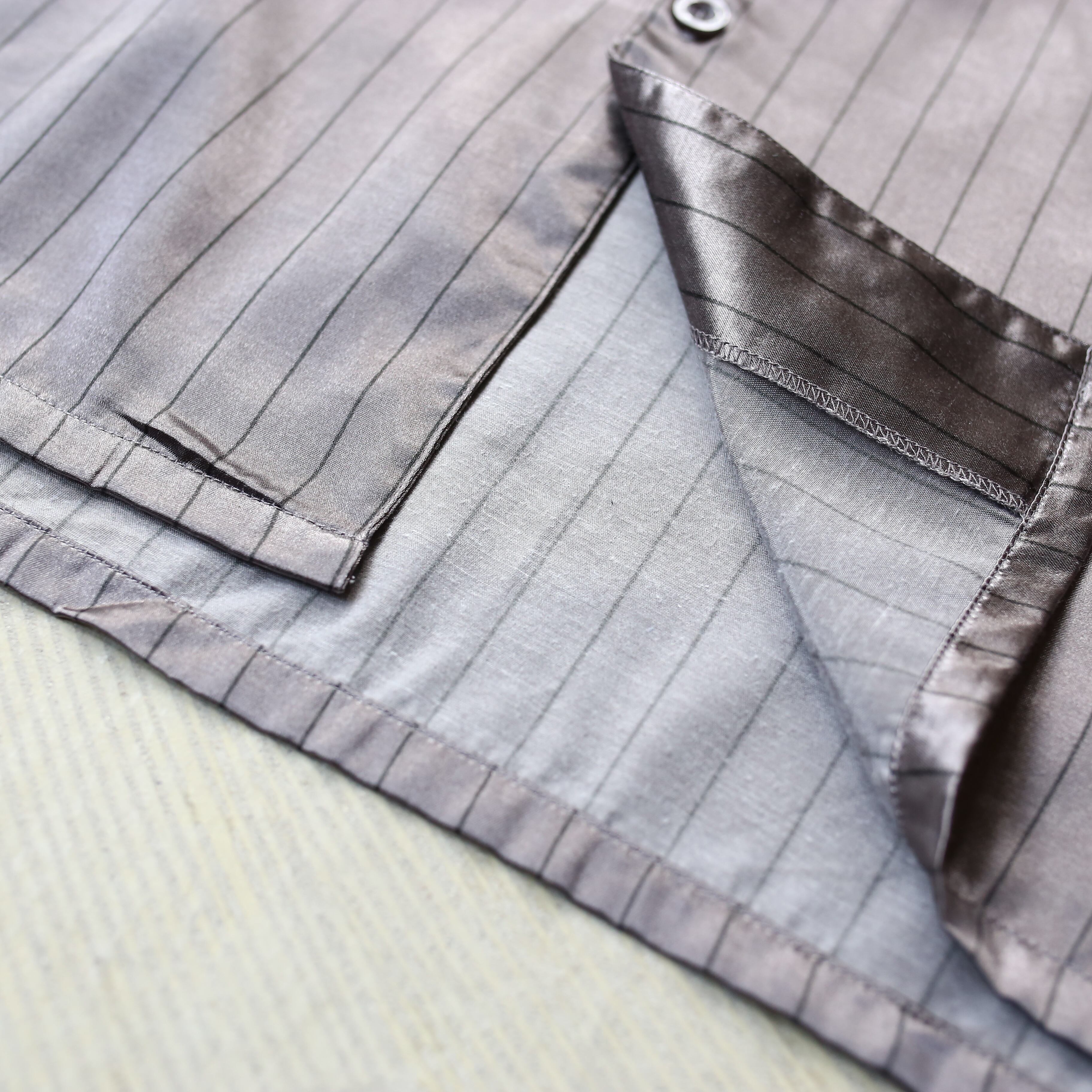 ピンストライプ柄に同系色のパイピングを施し