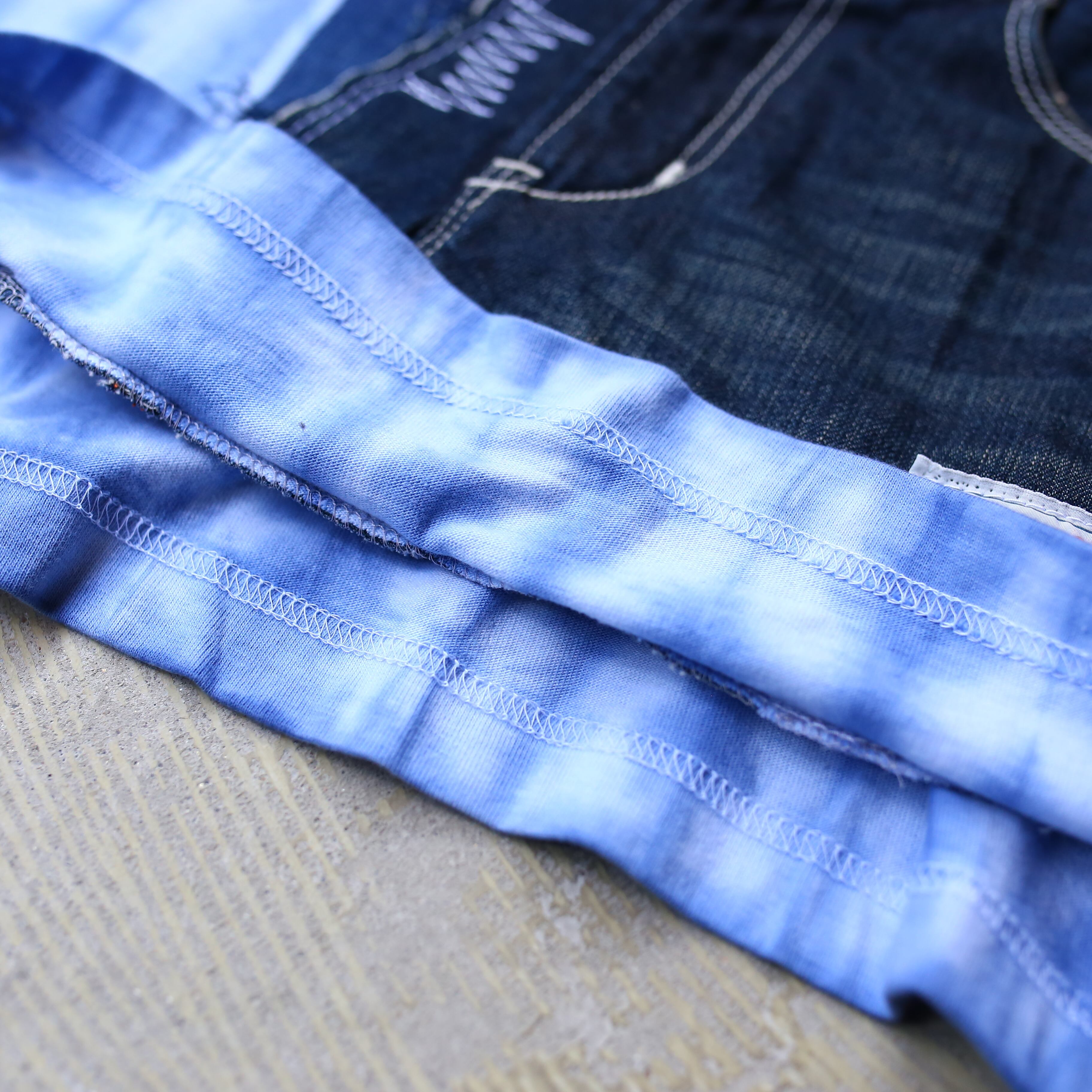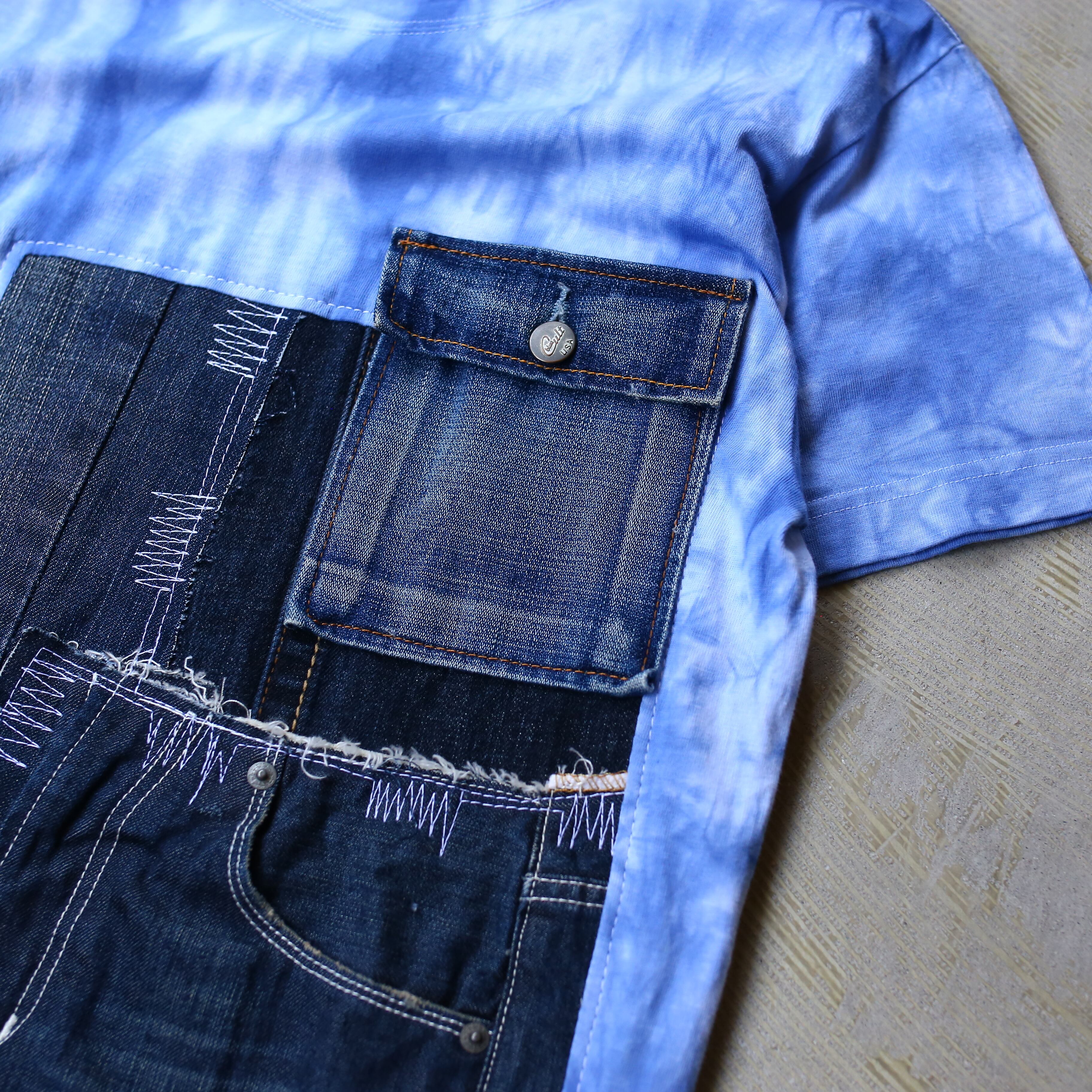 こちらは後染めを施した半袖Tシャツにデニム生地を繋ぎ合わせ