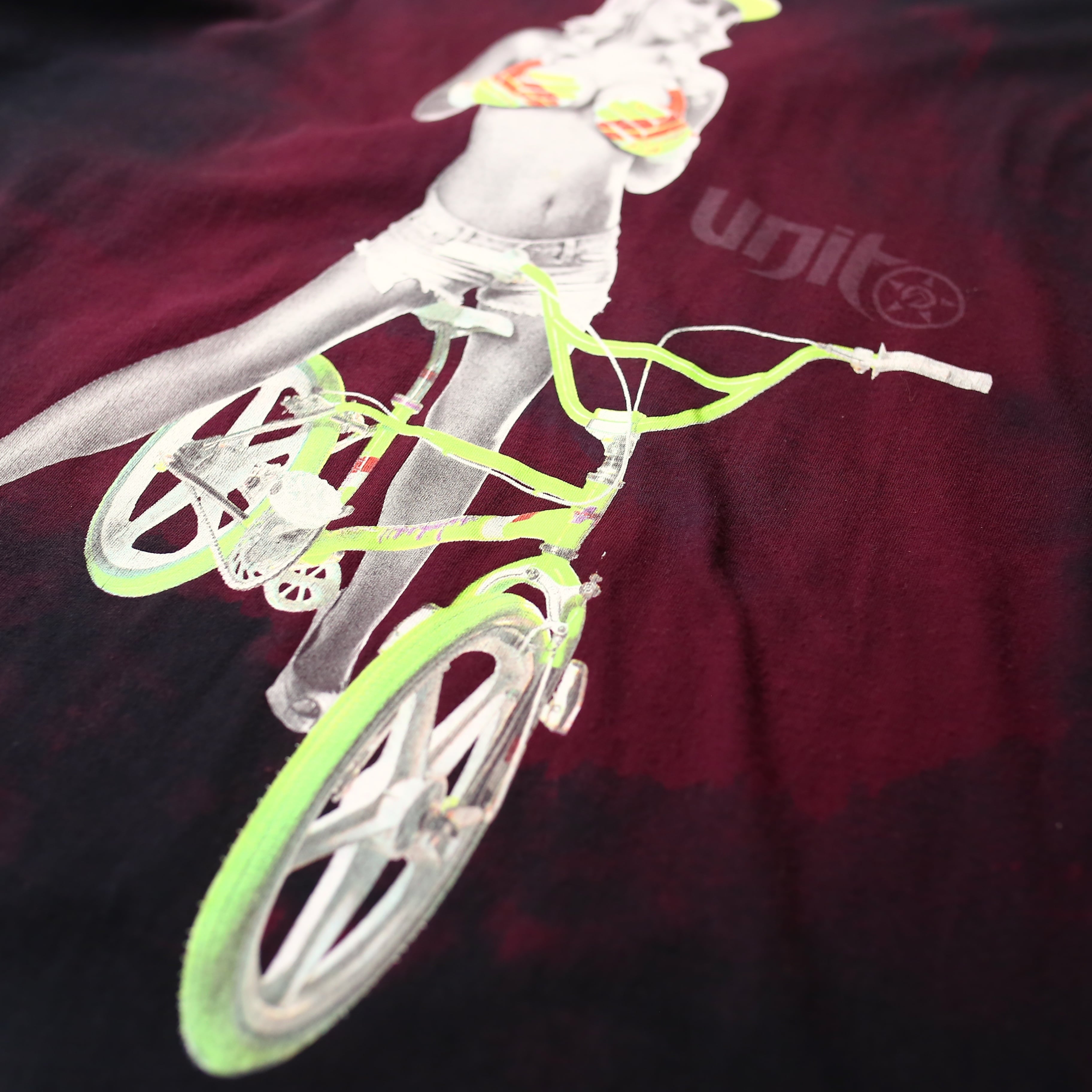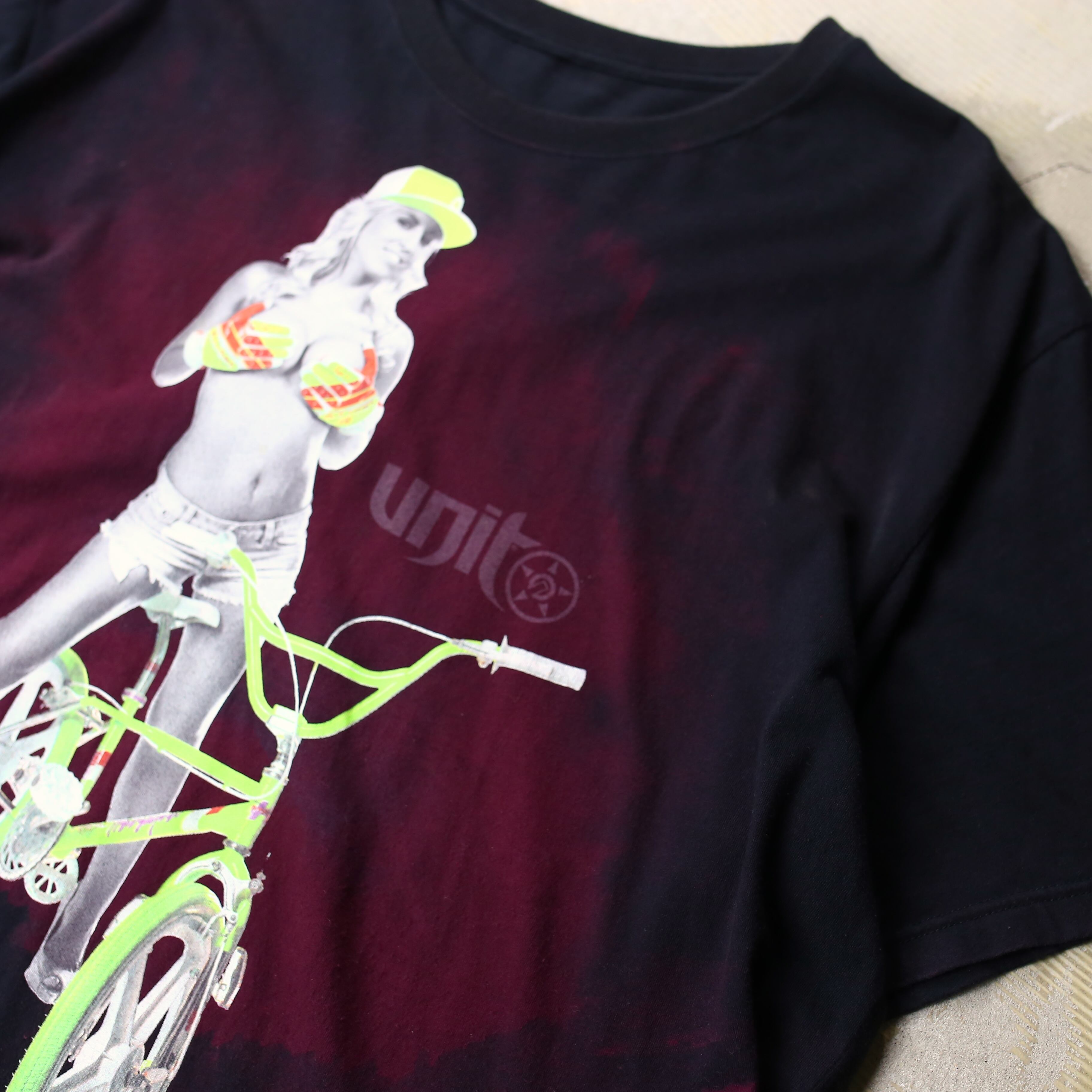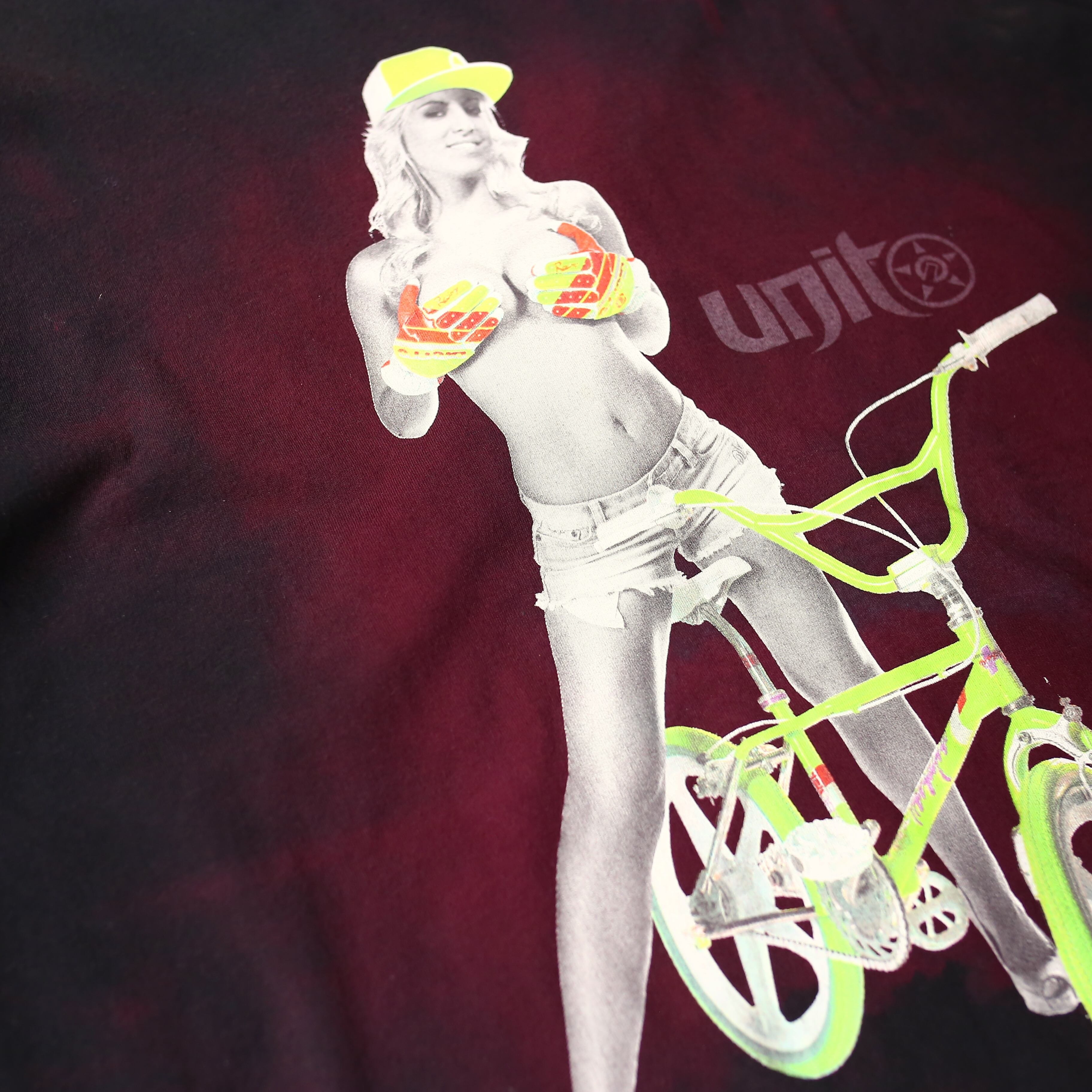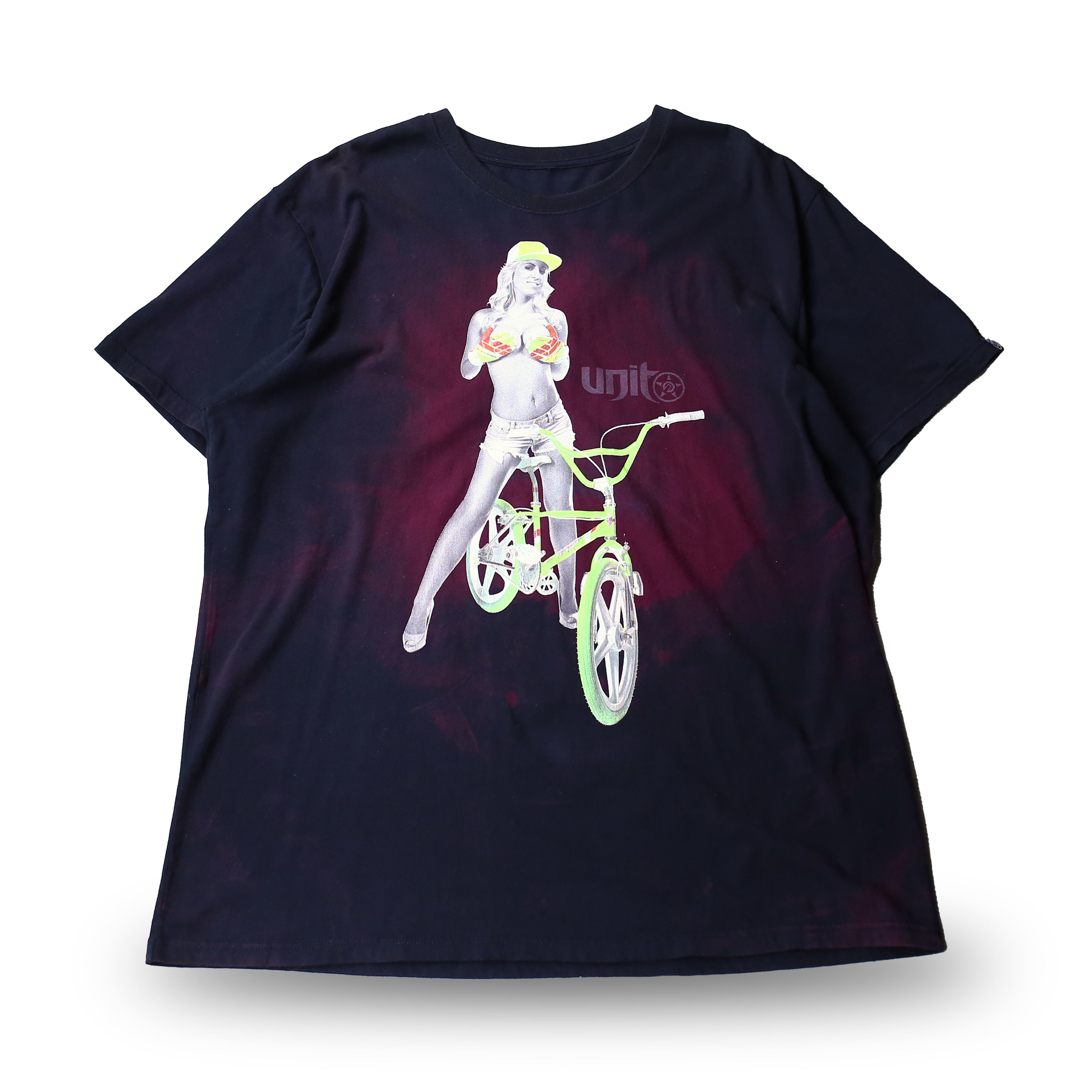 ・BMXと女性がプリントされた、デザイン半袖Tシャツ。