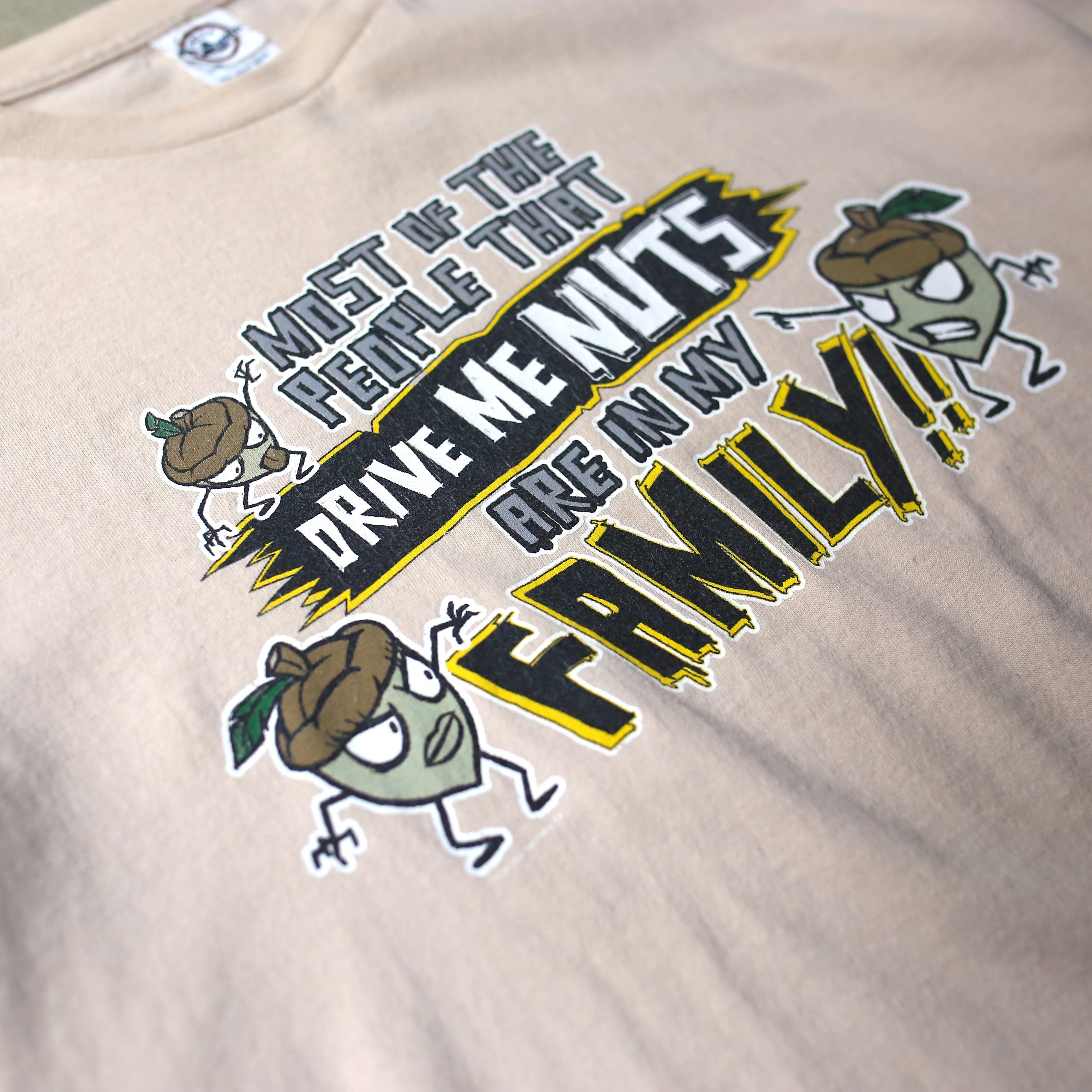 木の実のキャラクターとともにプリントしたデザイン半袖Tシャツ。