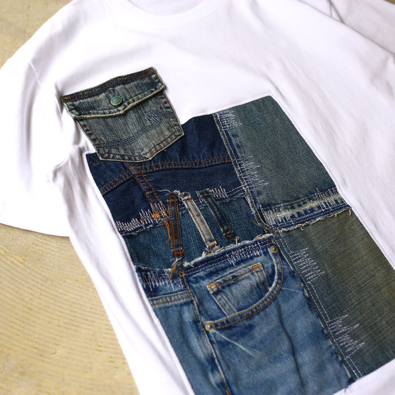 こちらは半袖Tシャツにデニム生地を繋ぎ合わせ