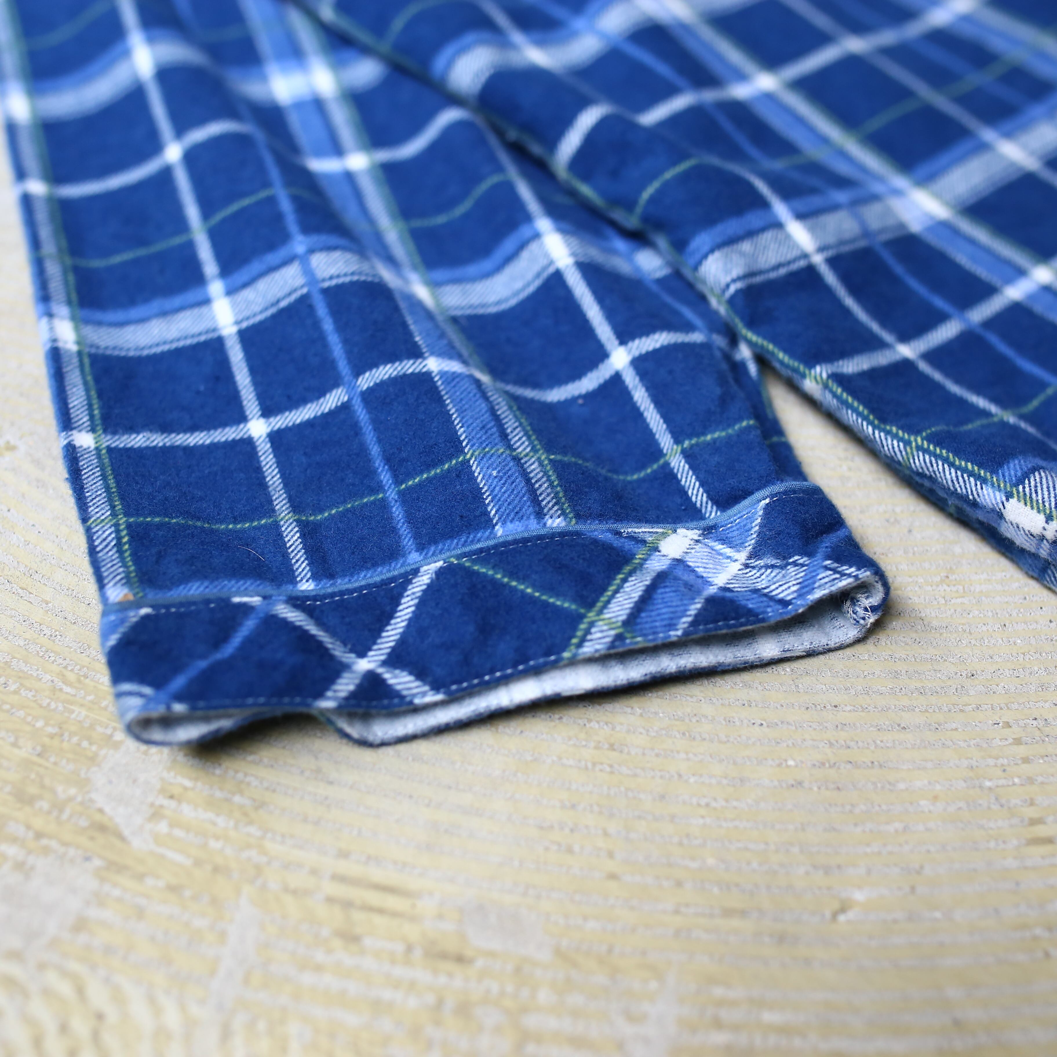・青を基調としたチェック柄のデザイン長袖シャツ。