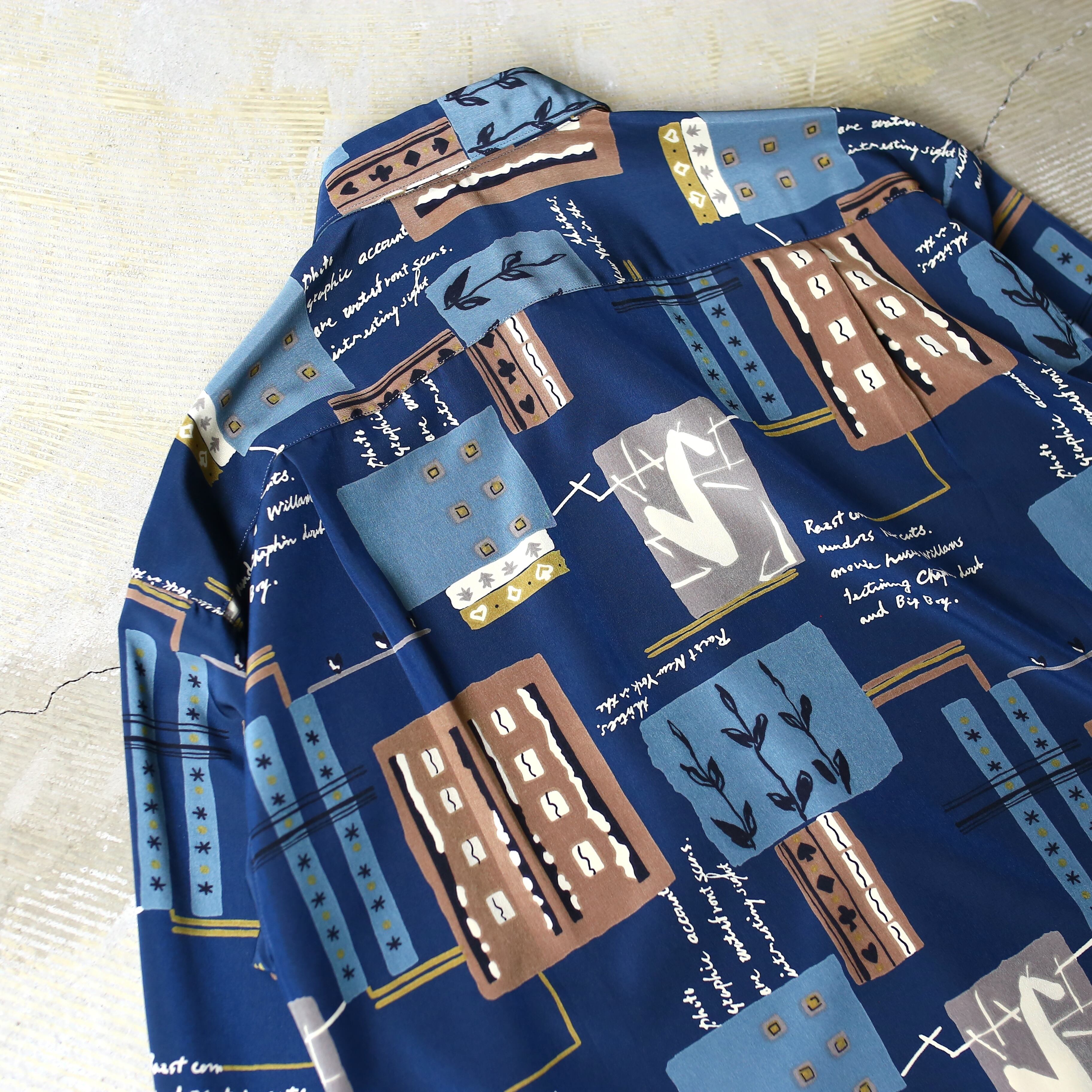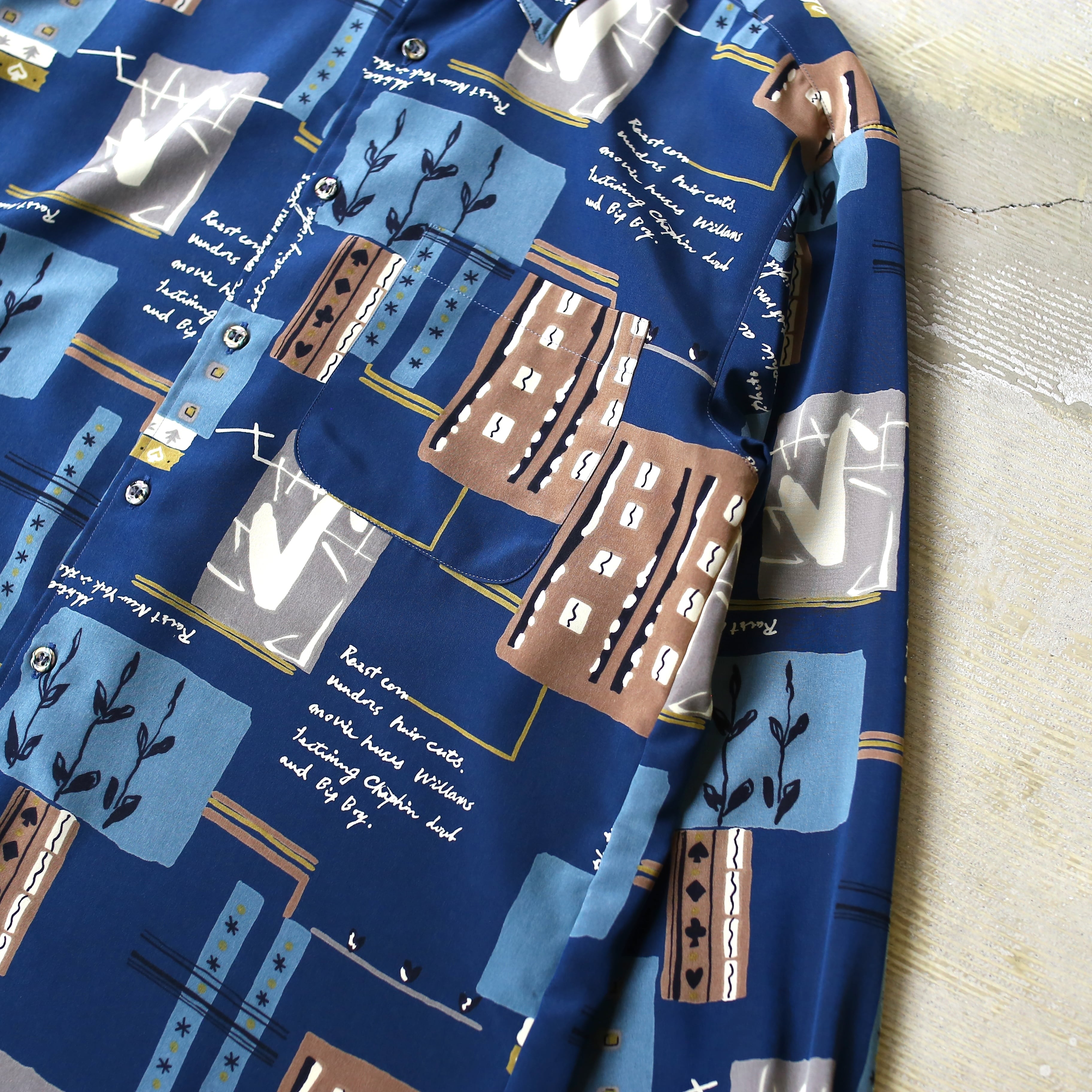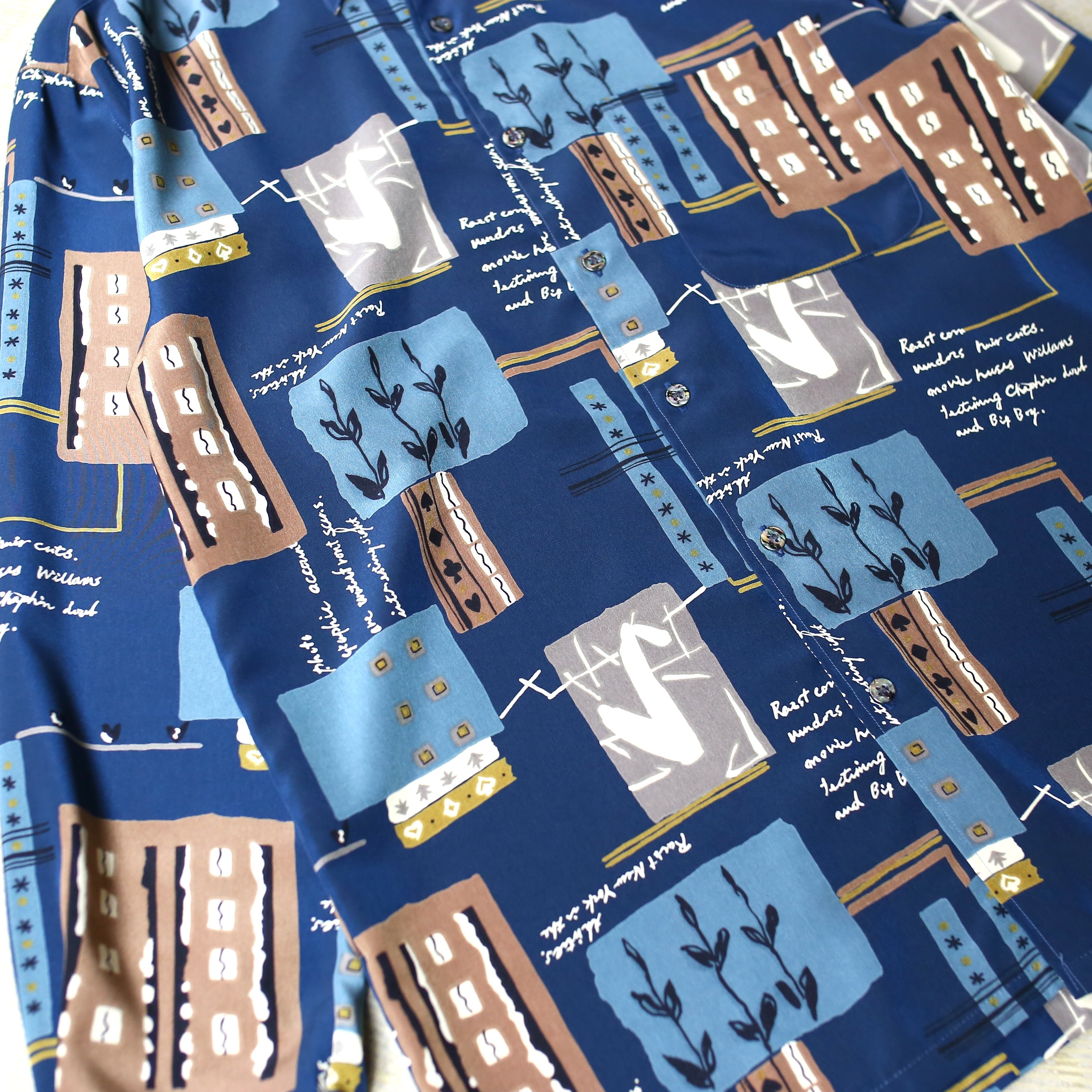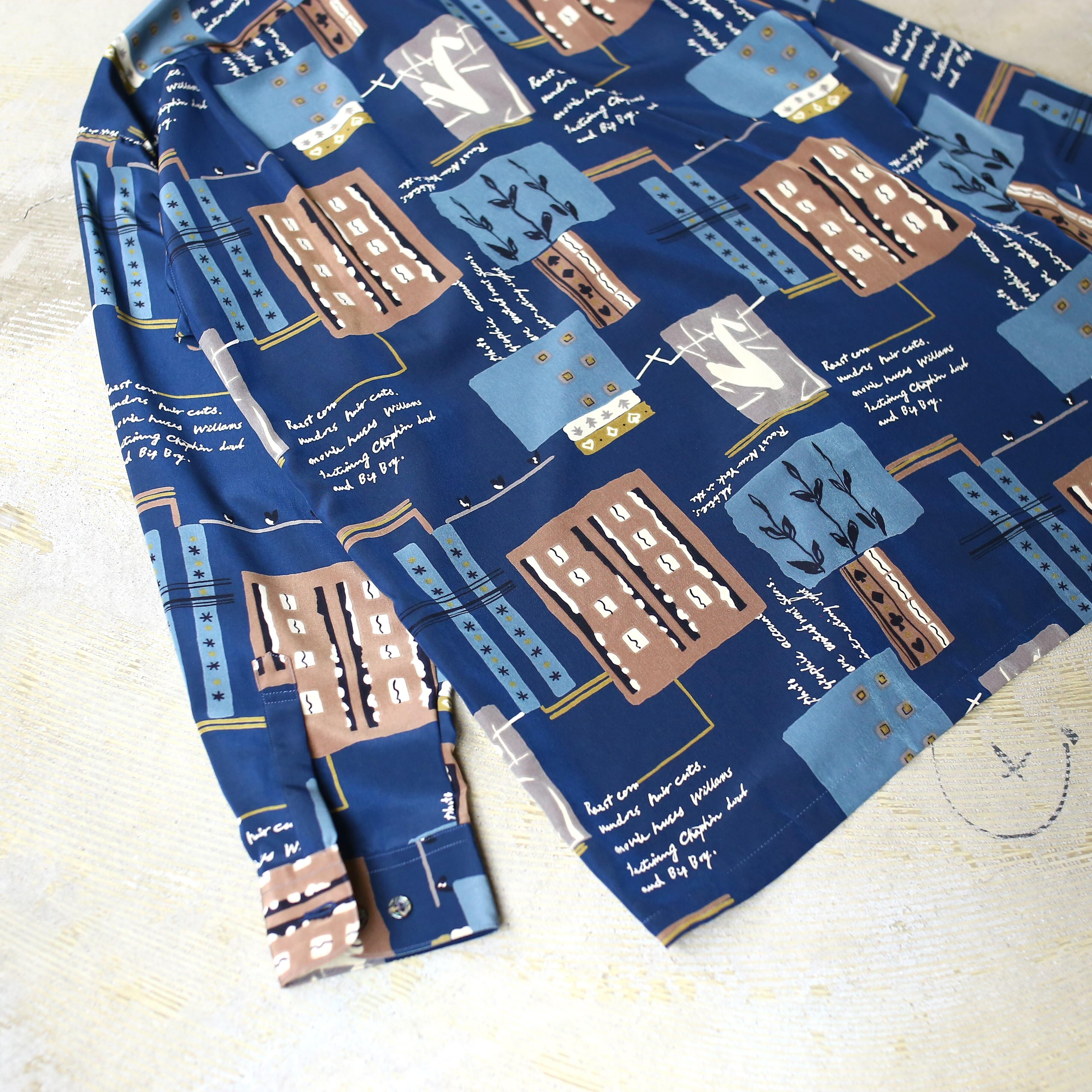 ・ネイビーベースにアートな総柄を施した、デザイン長袖シャツ。