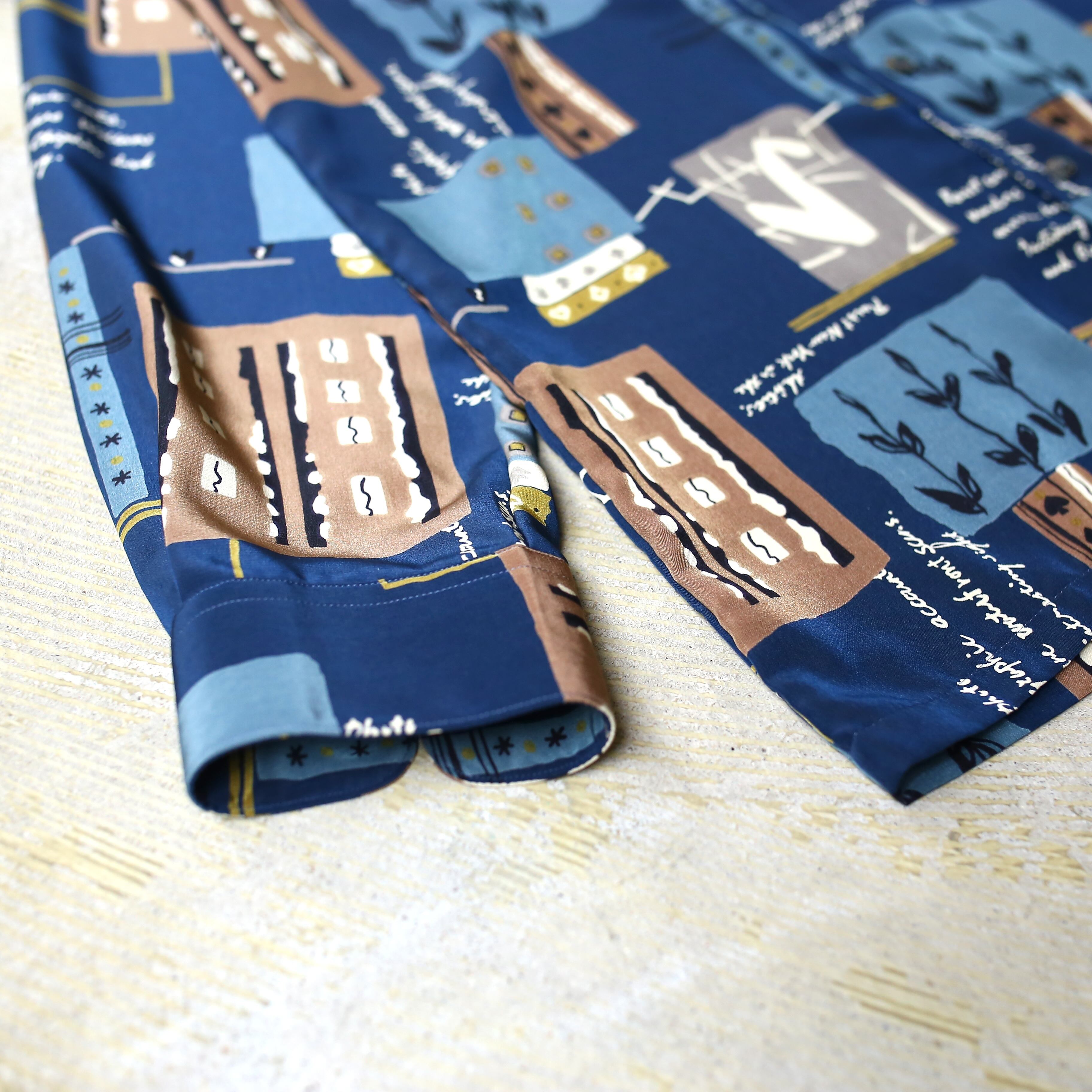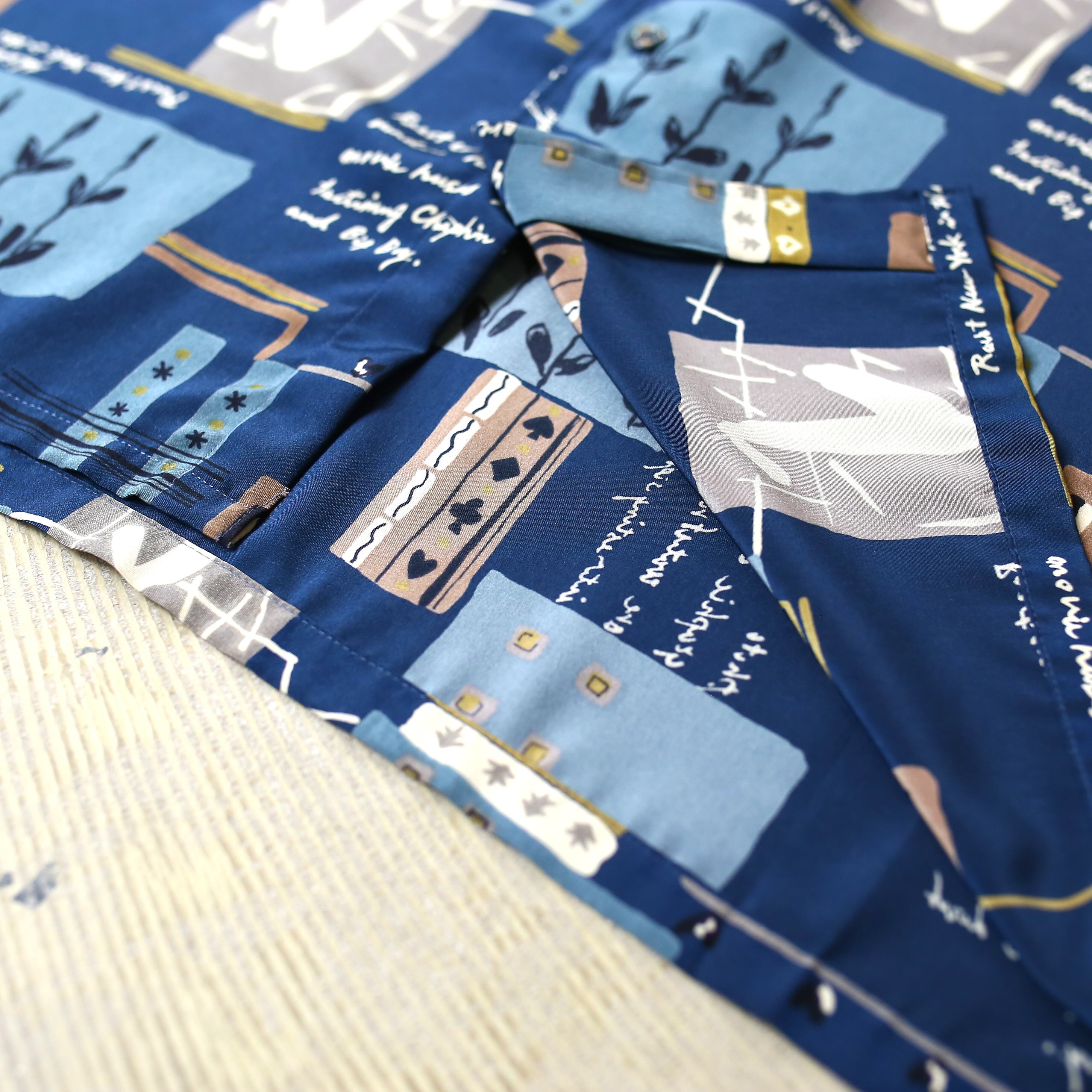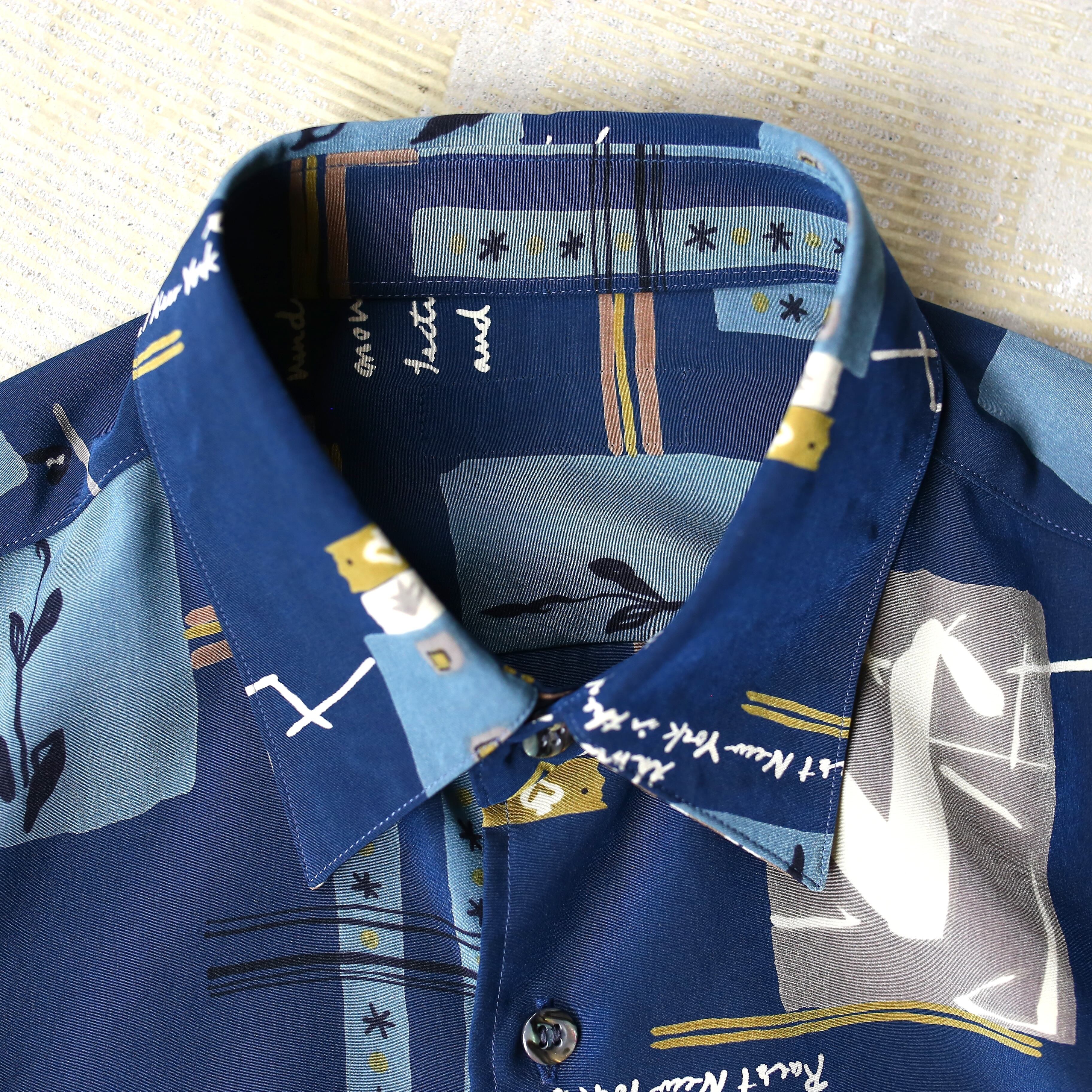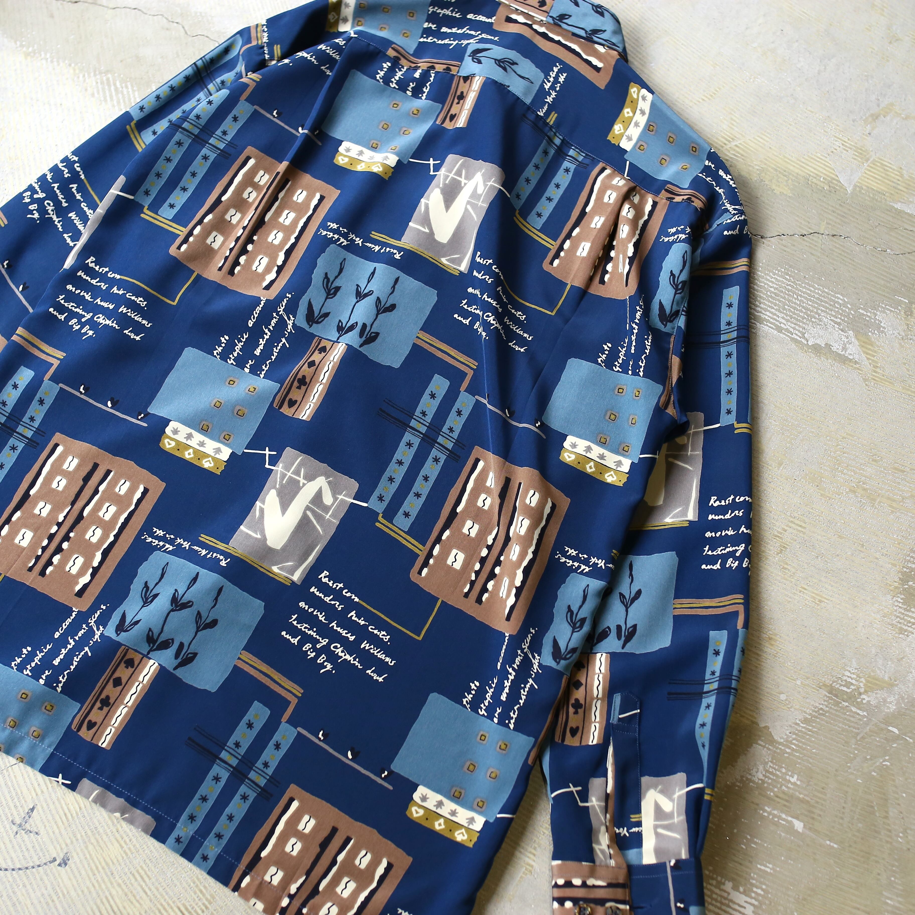 ・ネイビーベースにアートな総柄を施した、デザイン長袖シャツ。