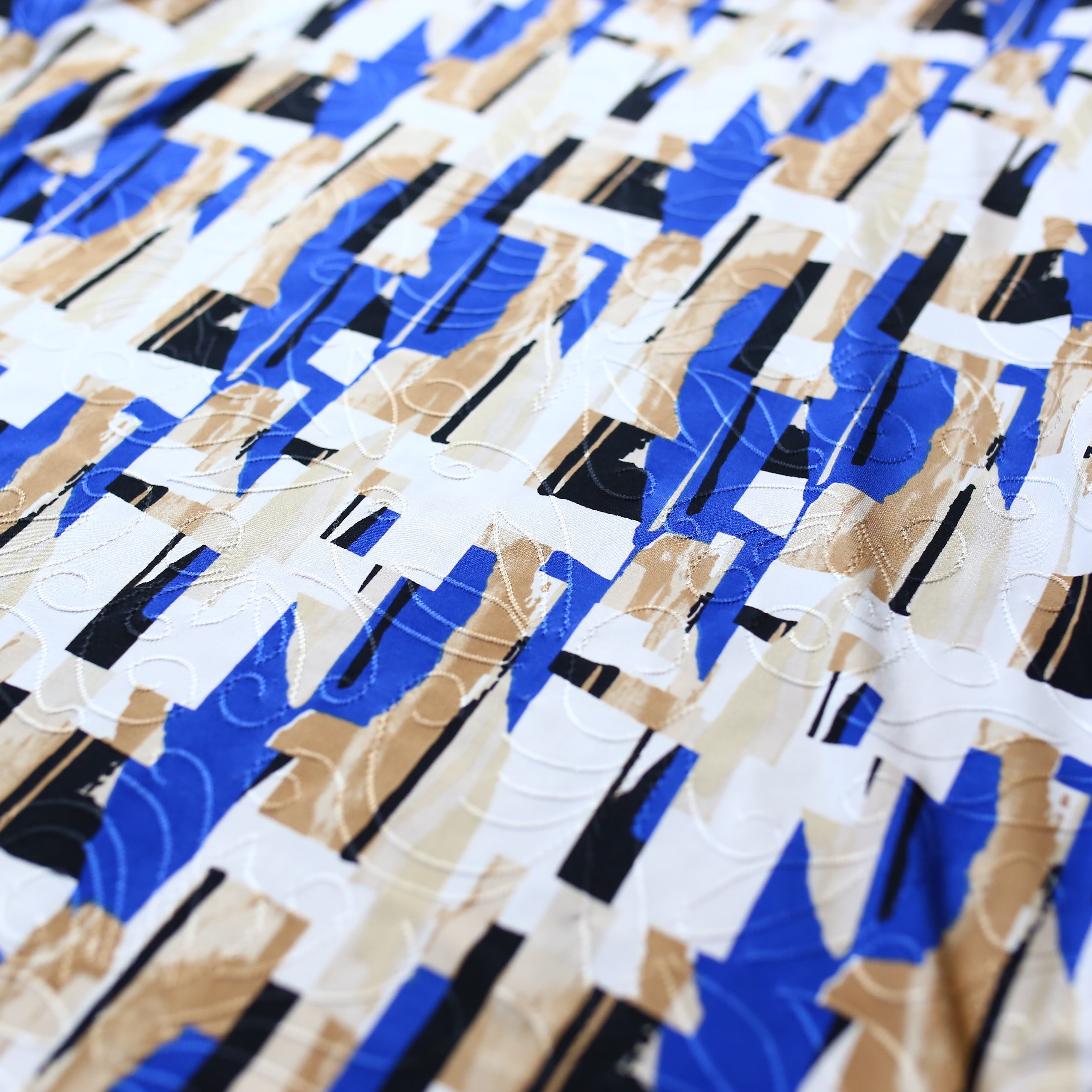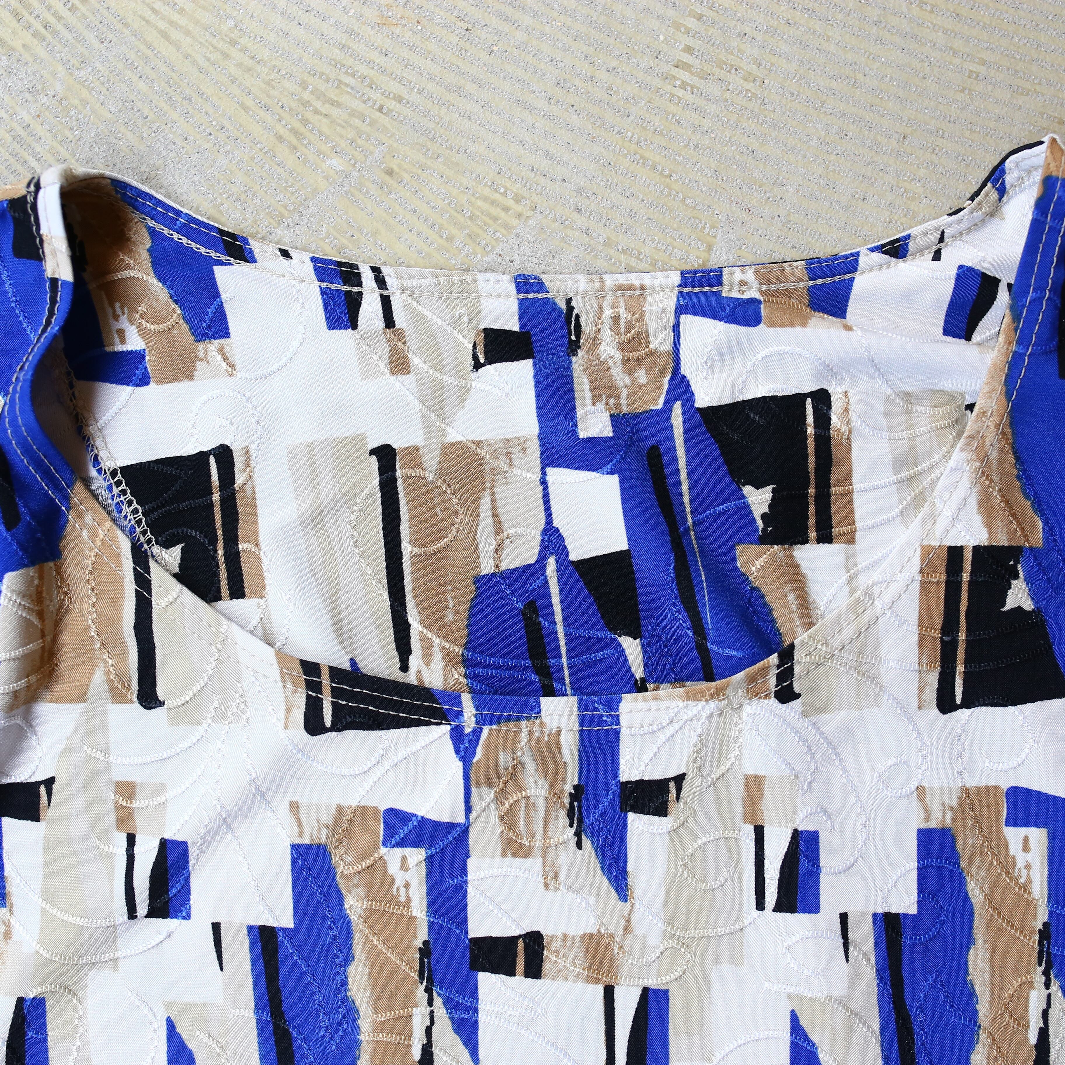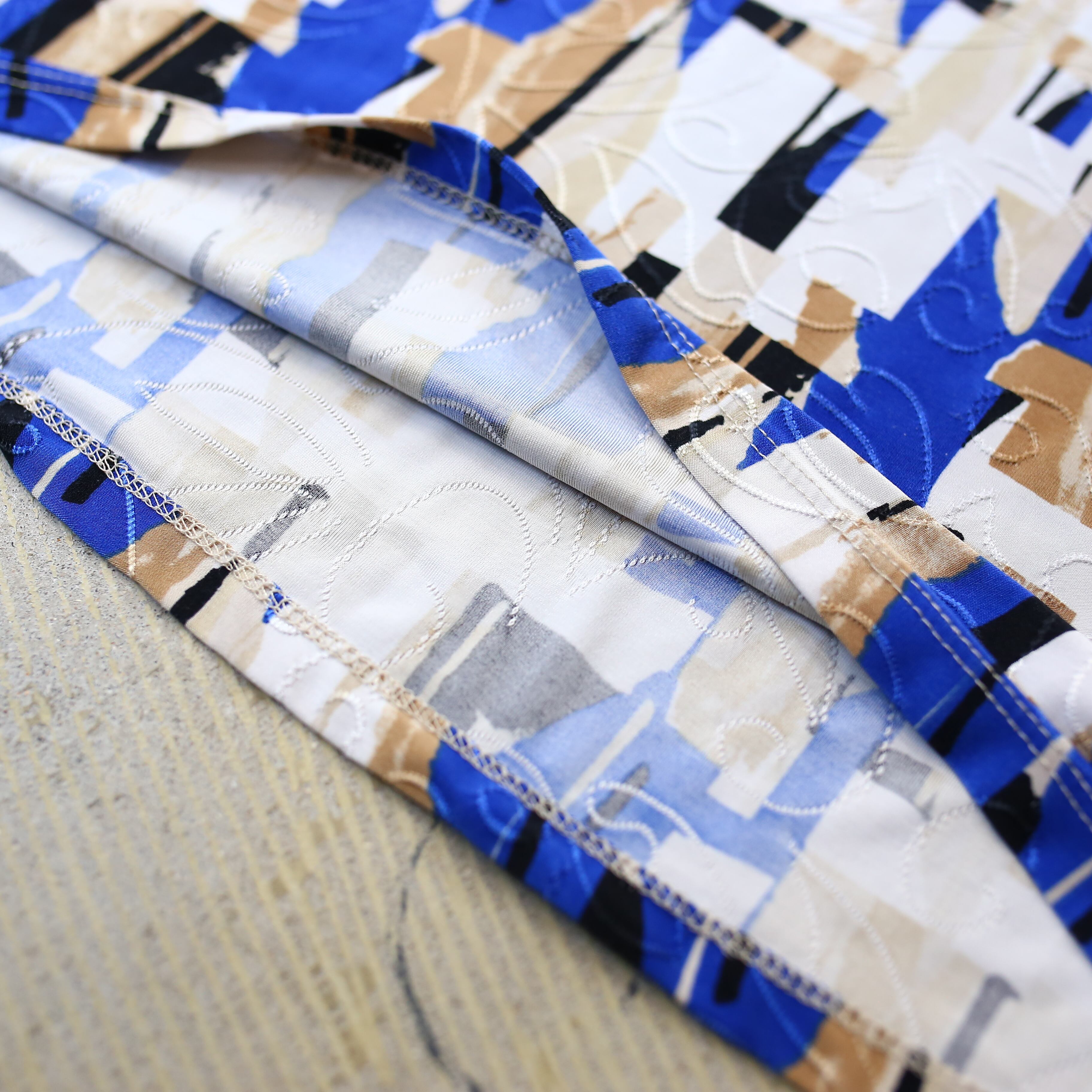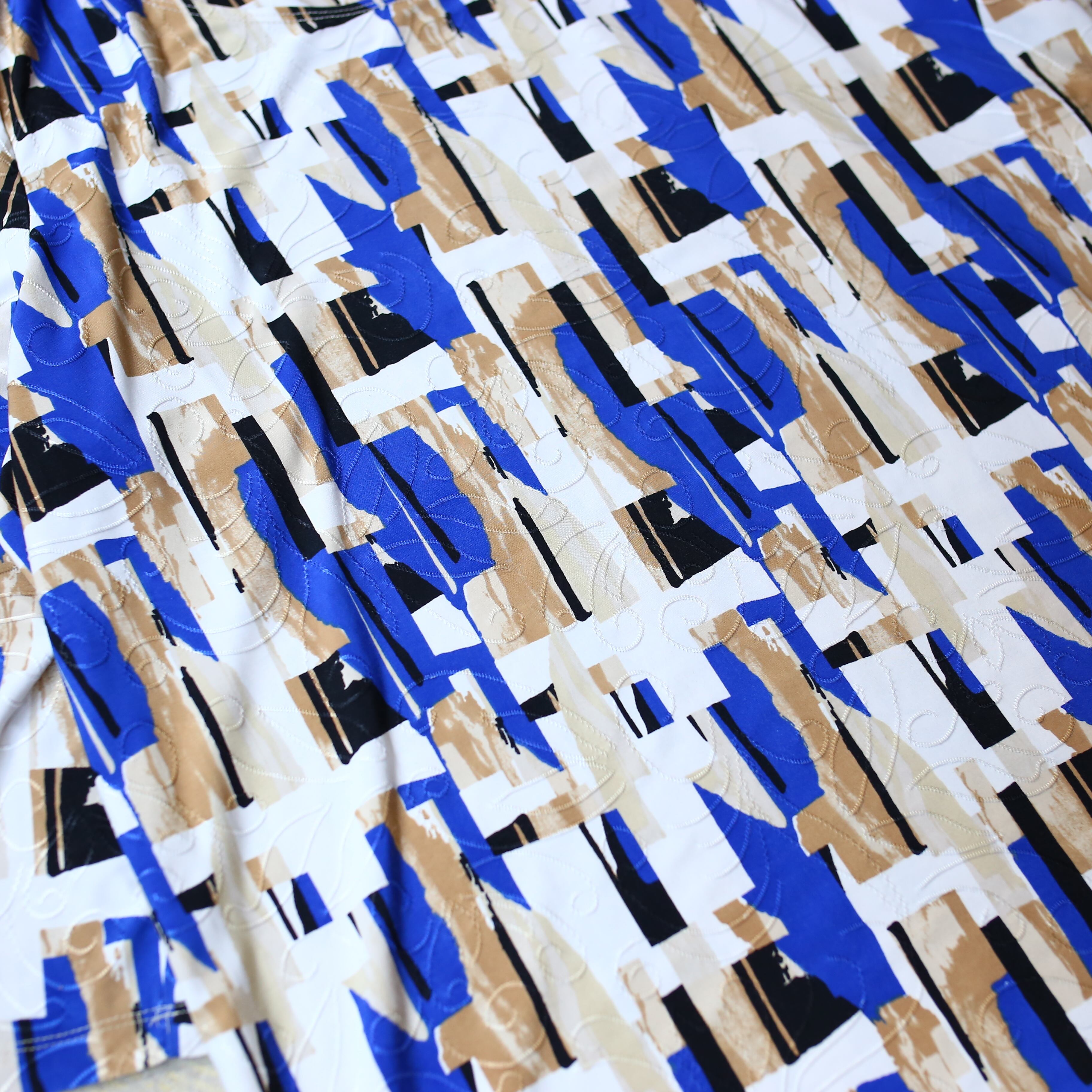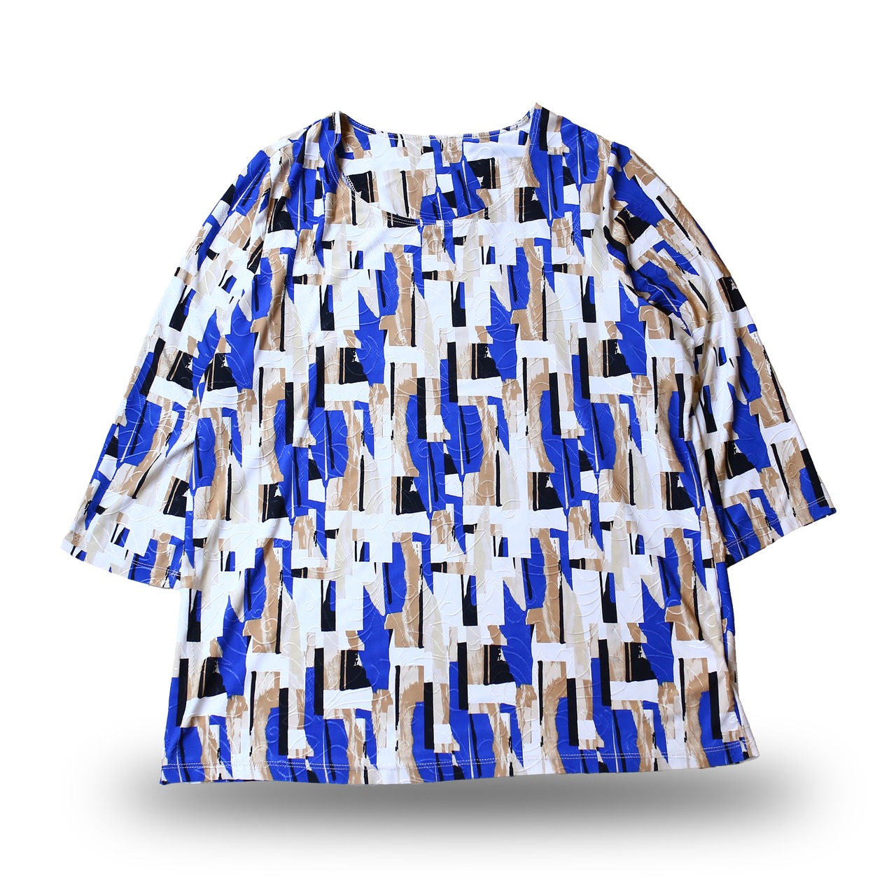 抽象的な幾何学パターンが、コーディネートに確かな個性を与えてくれる1枚です。