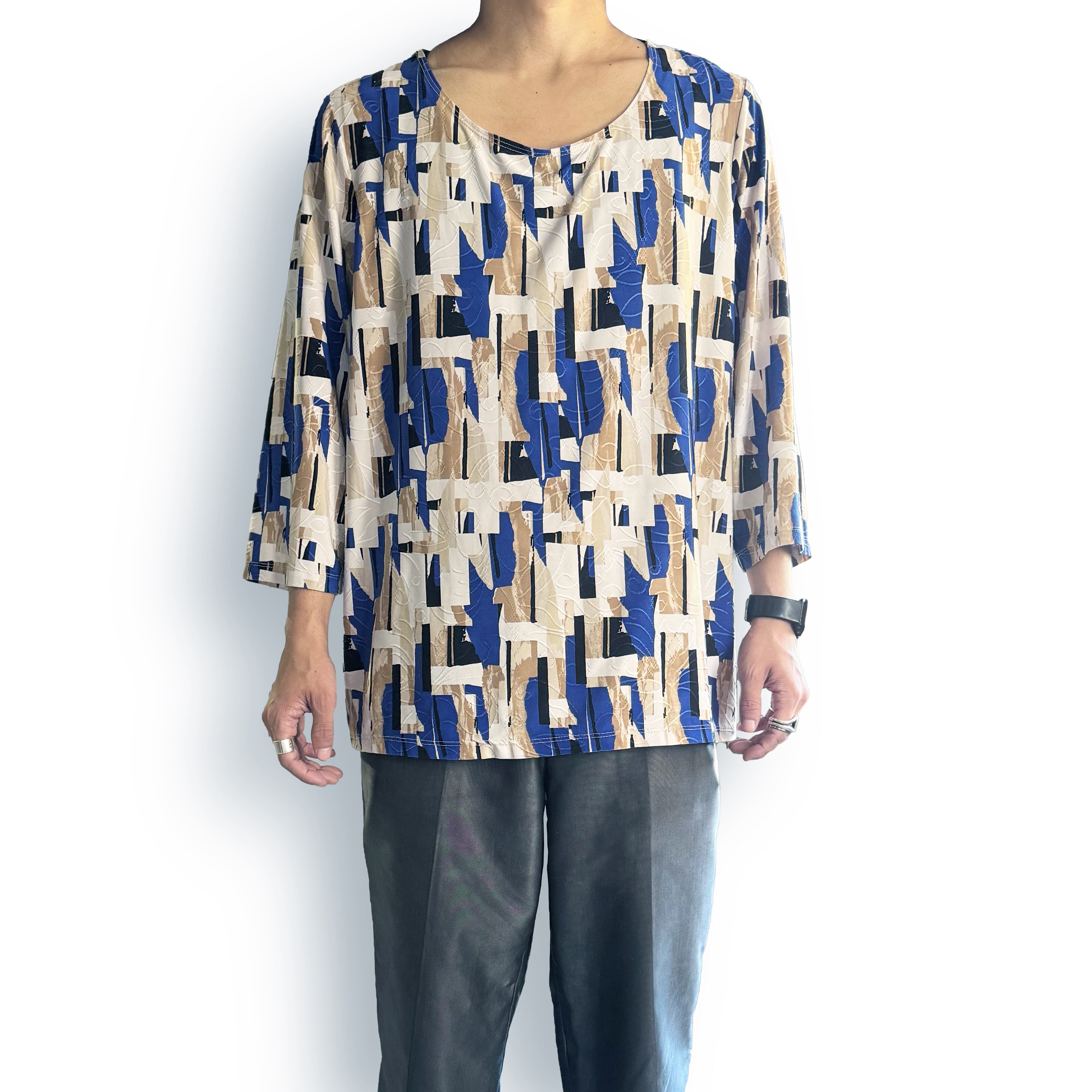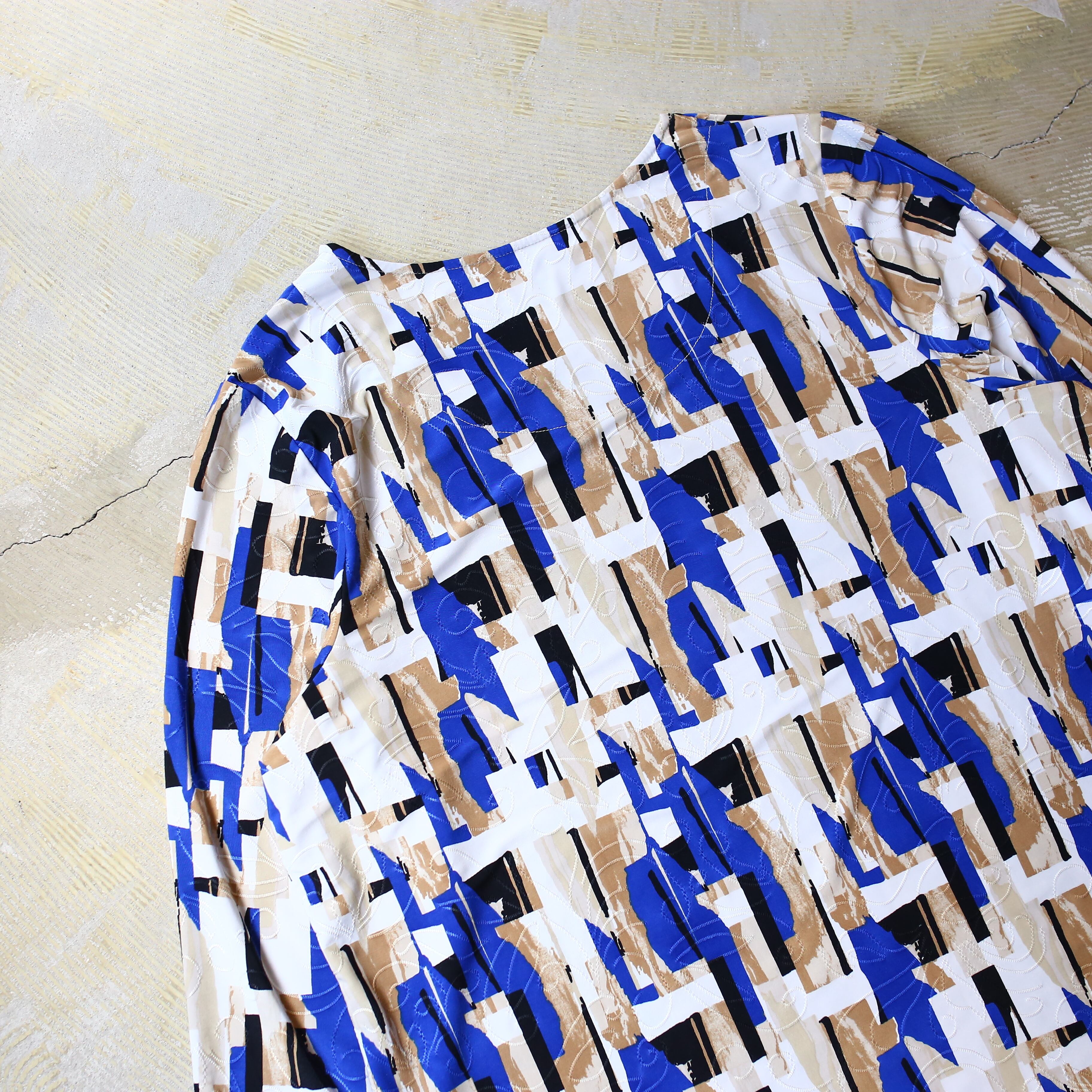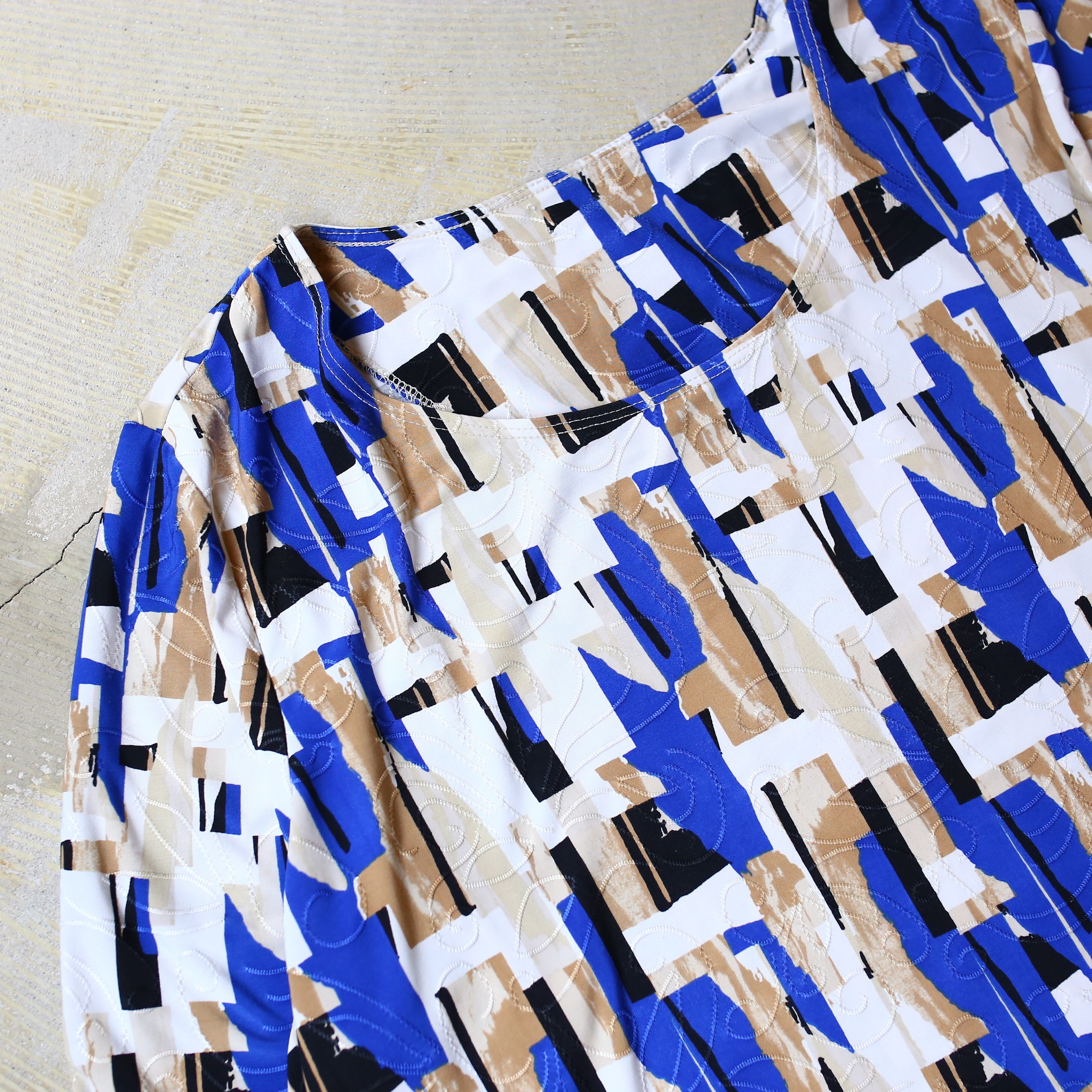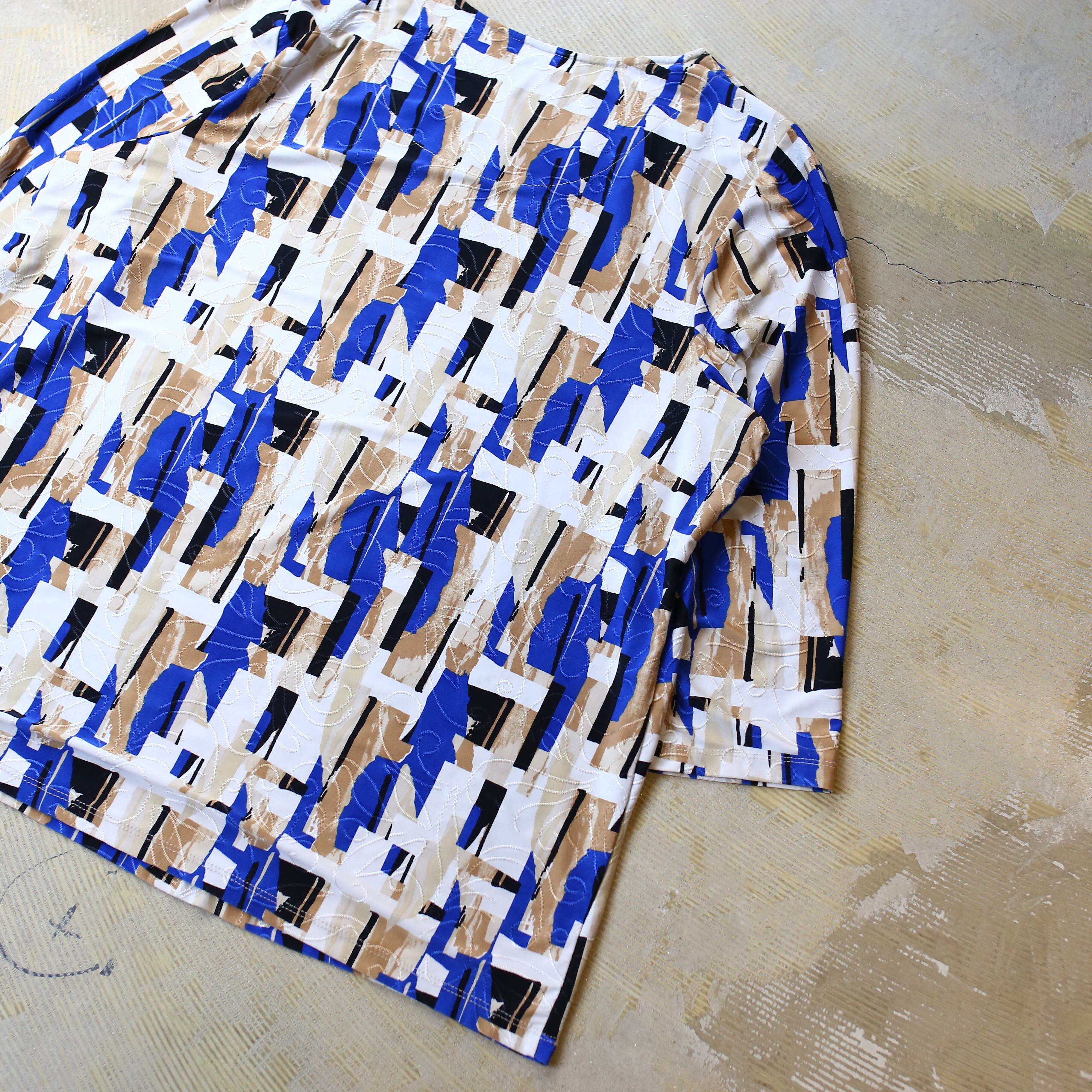 ・大胆な幾何学パターンと目を引く配色が特徴的な総柄トップス。
