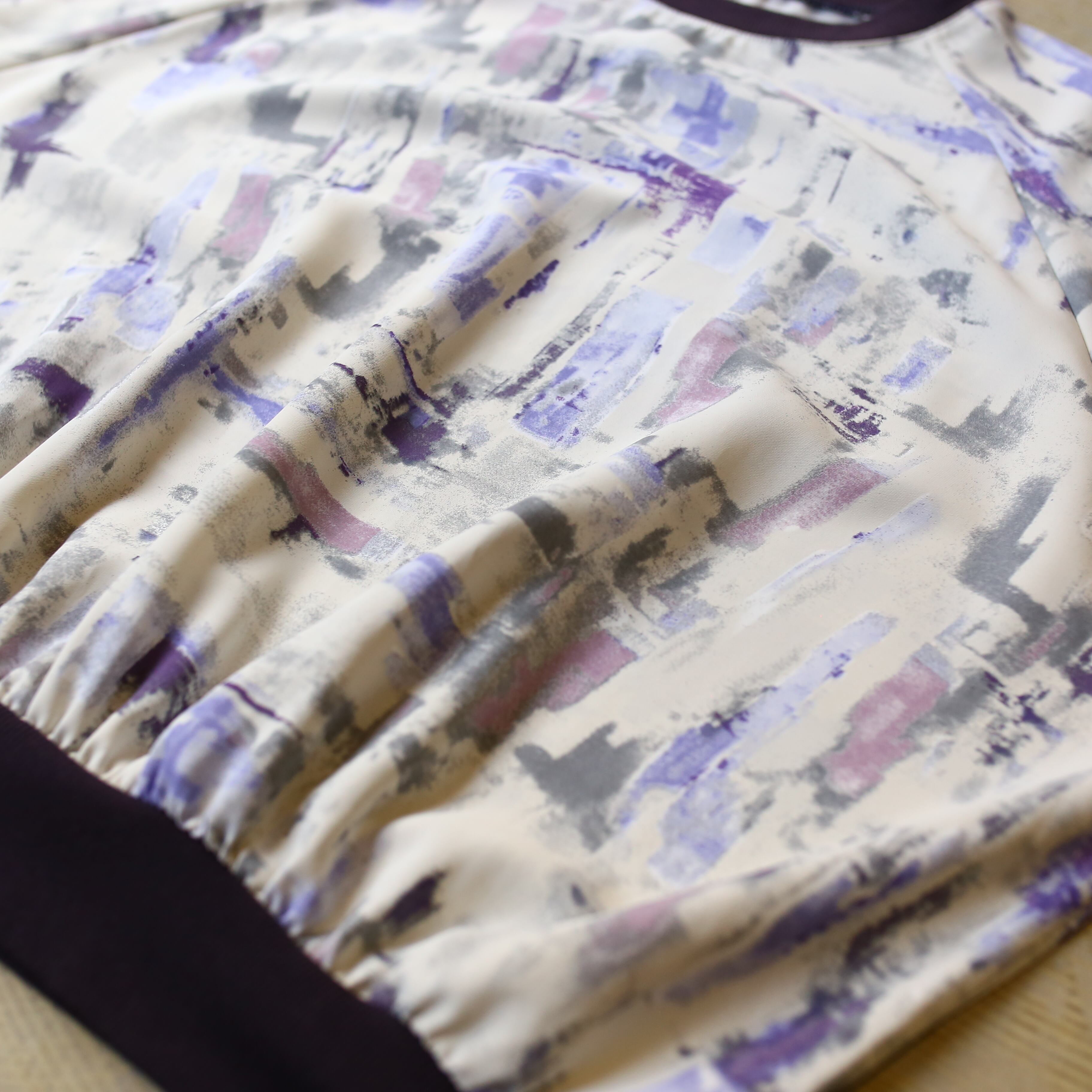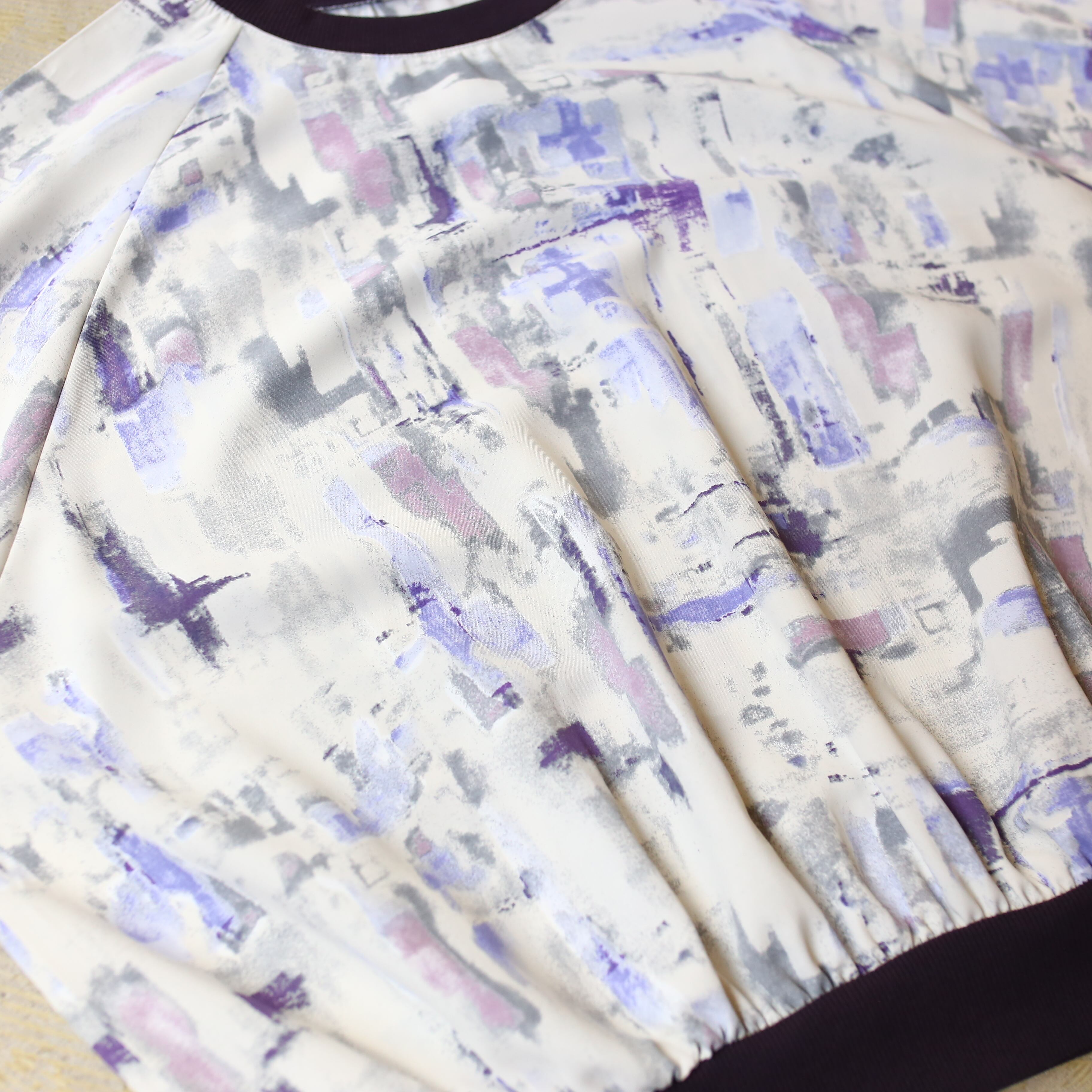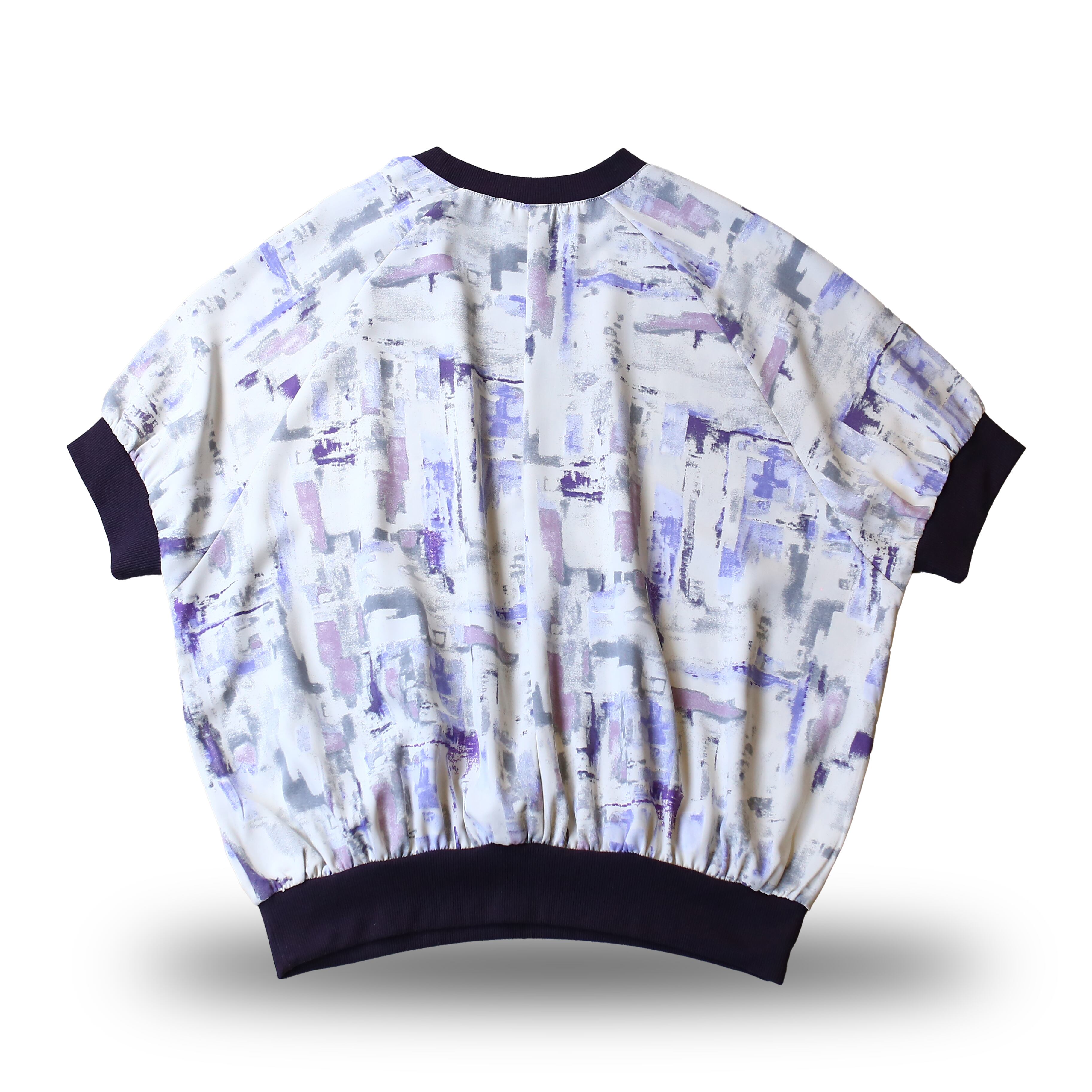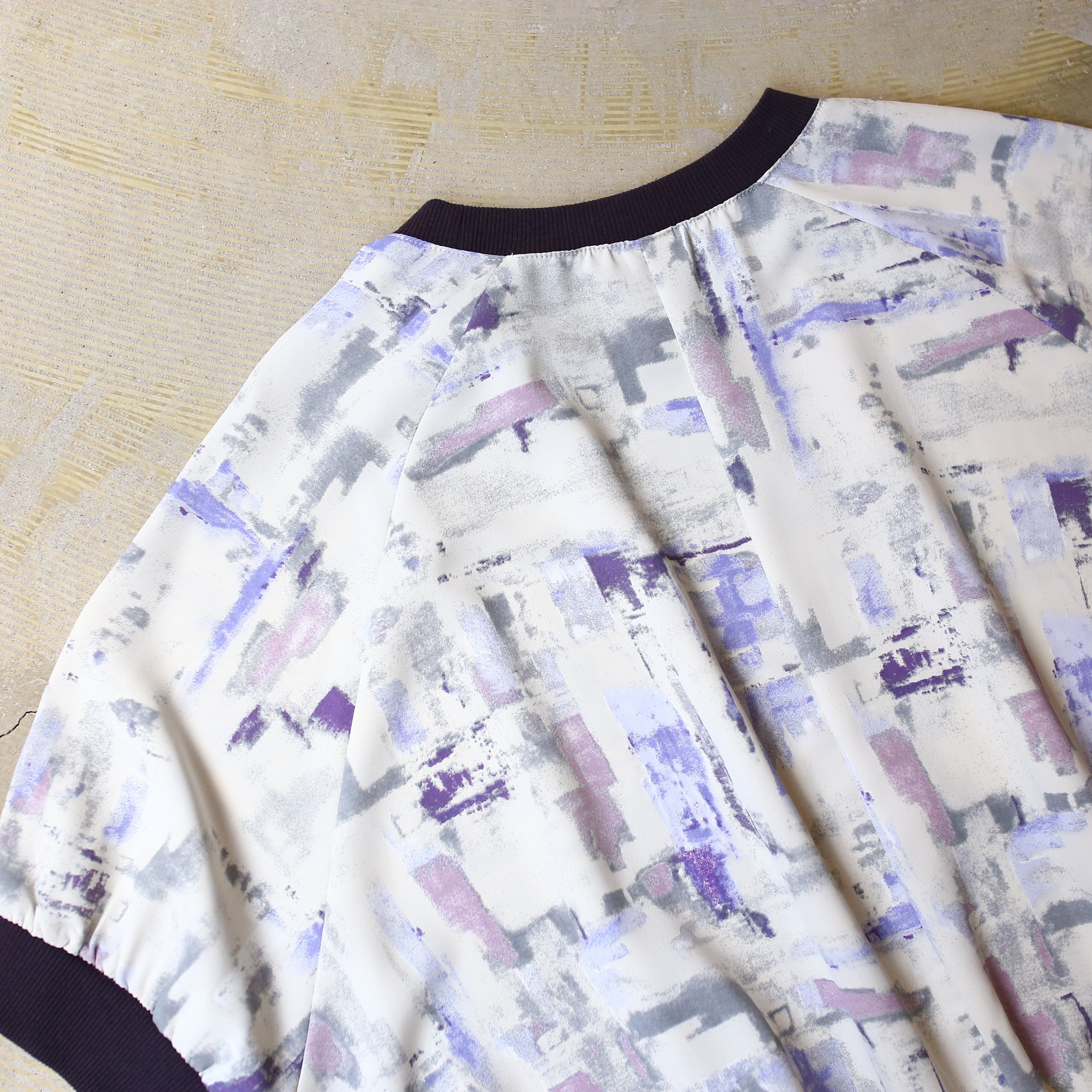 モダンな抽象柄が映えるデザインは、白を基調に紫やグレーの洗練されたプリントを施し
