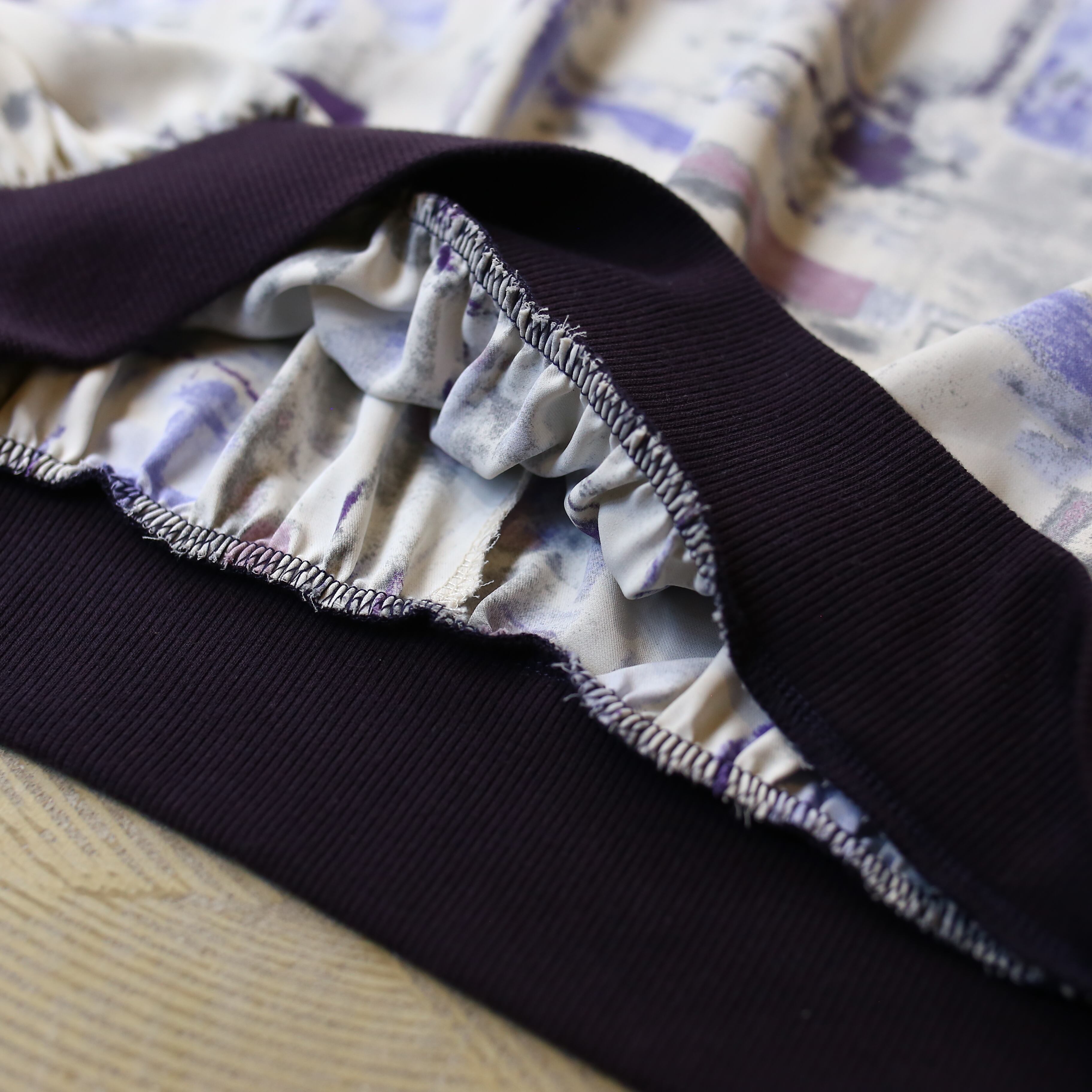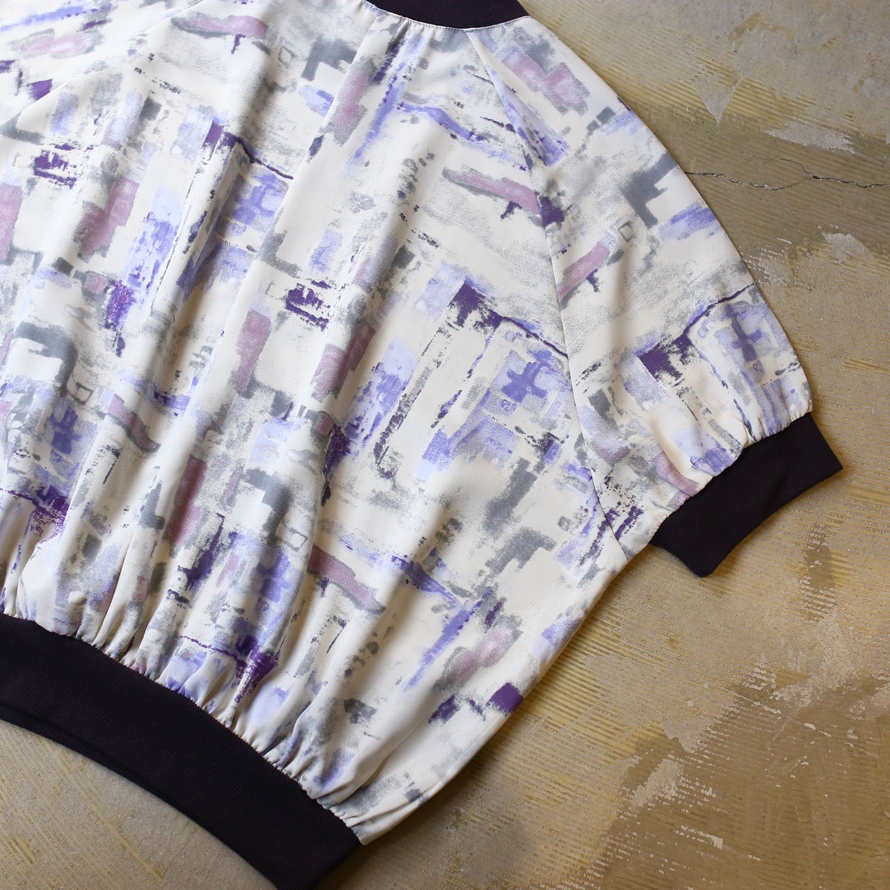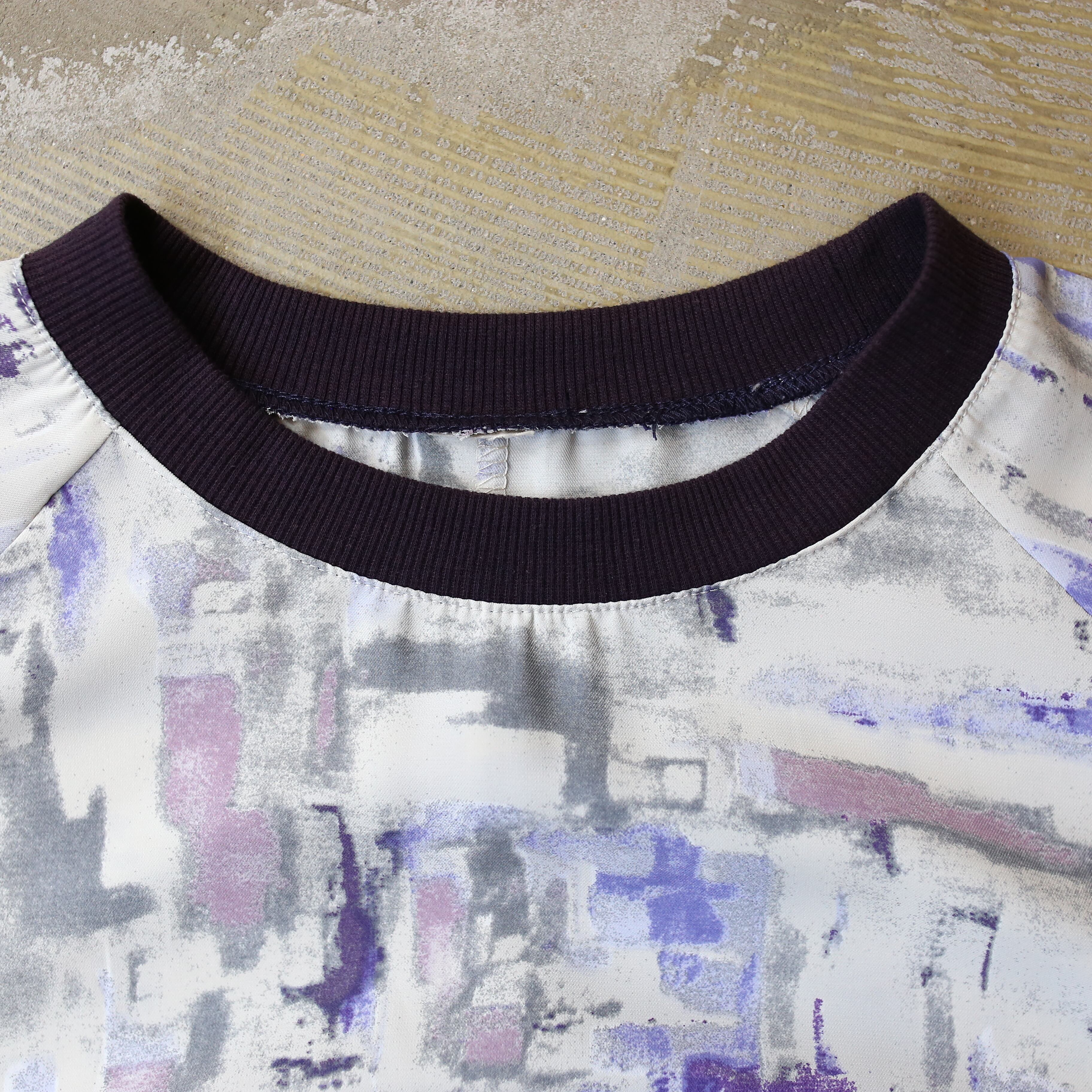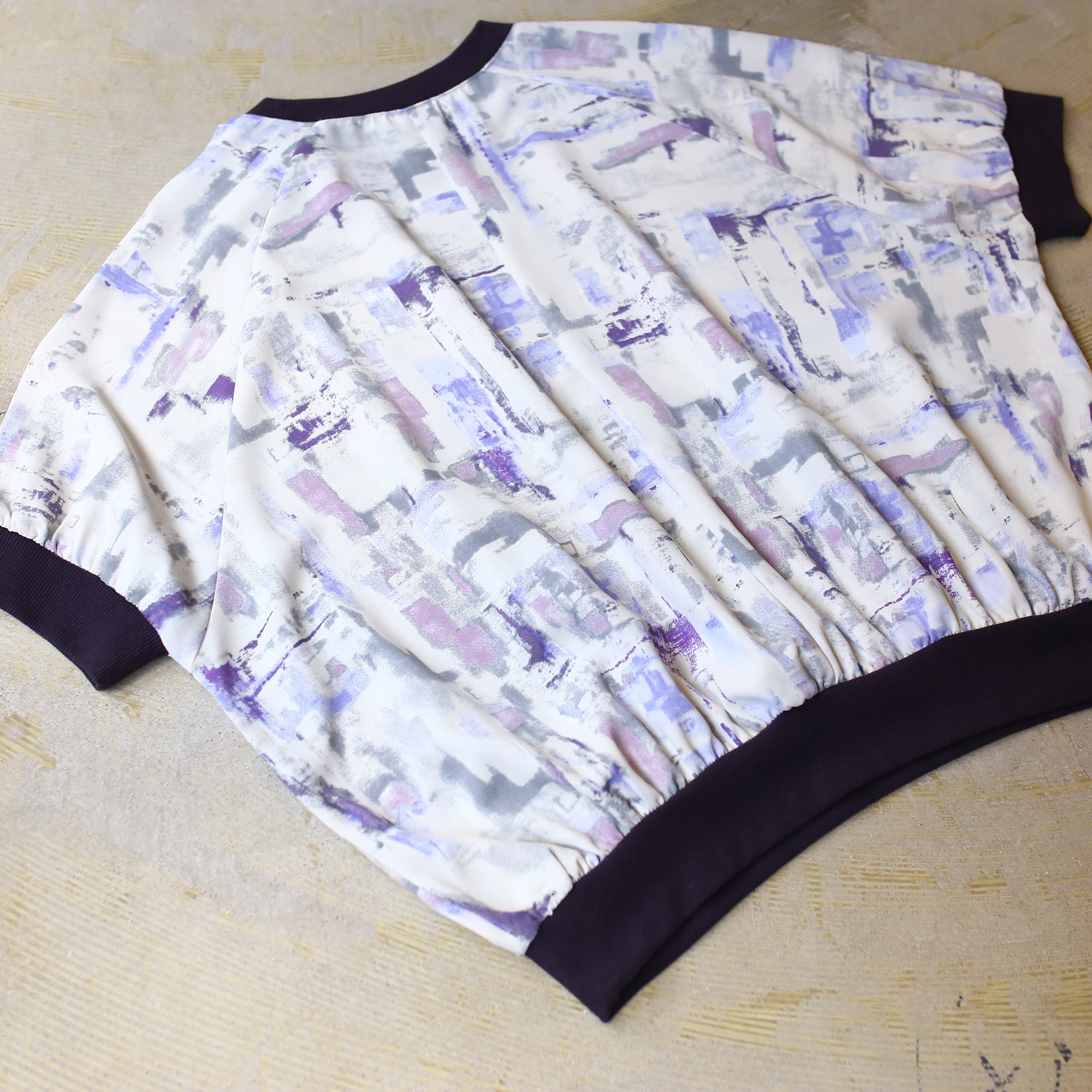 モダンな抽象柄が映えるデザインは、白を基調に紫やグレーの洗練されたプリントを施し