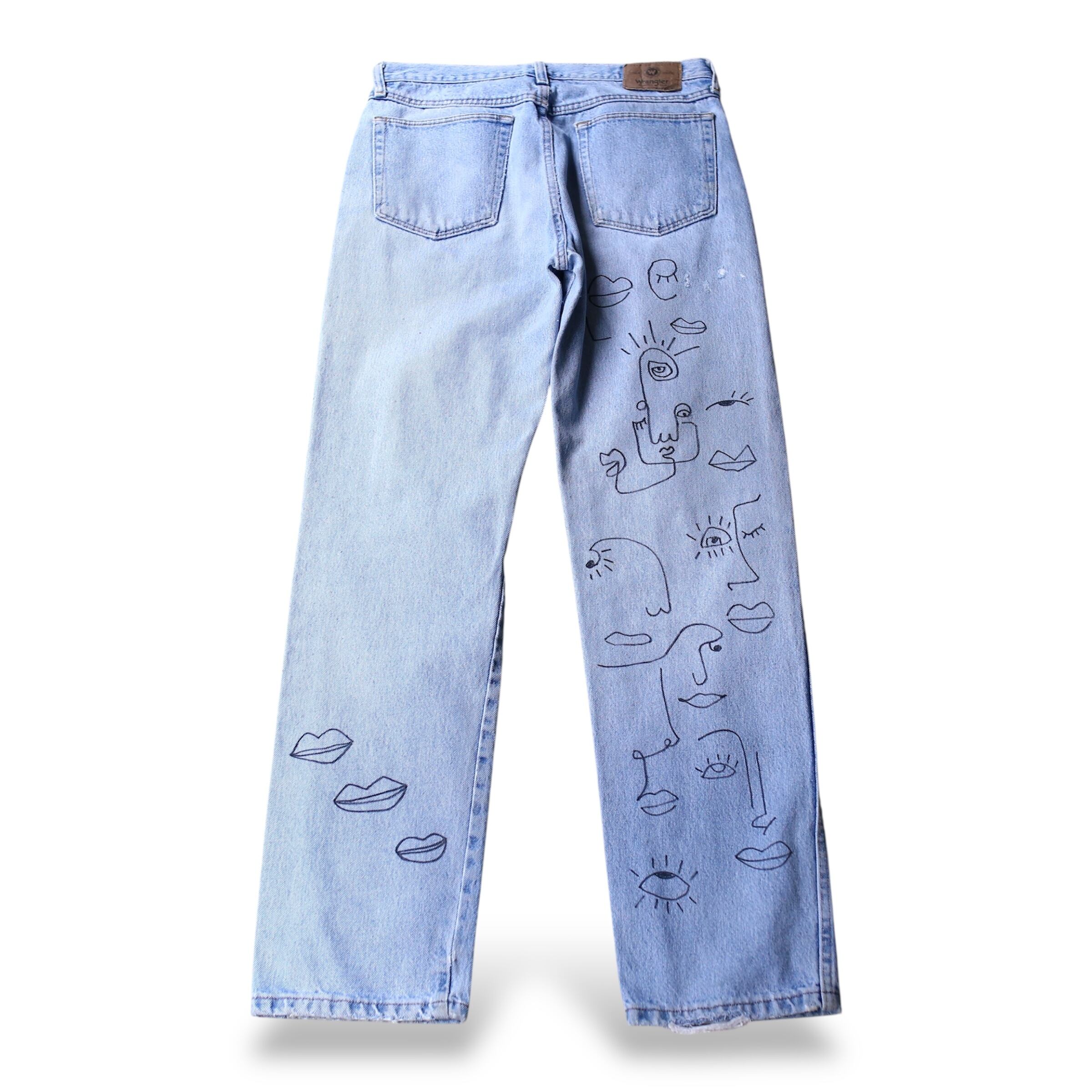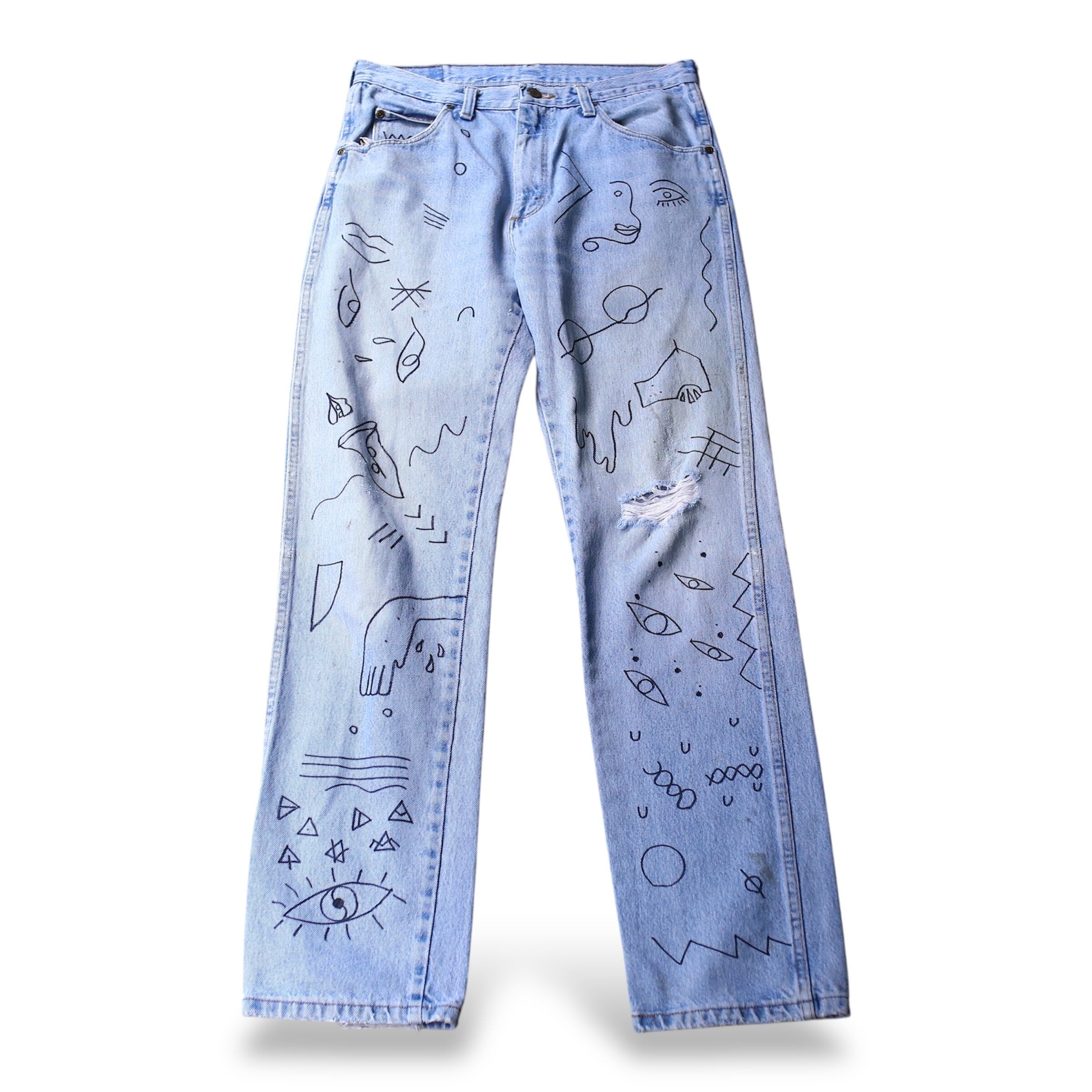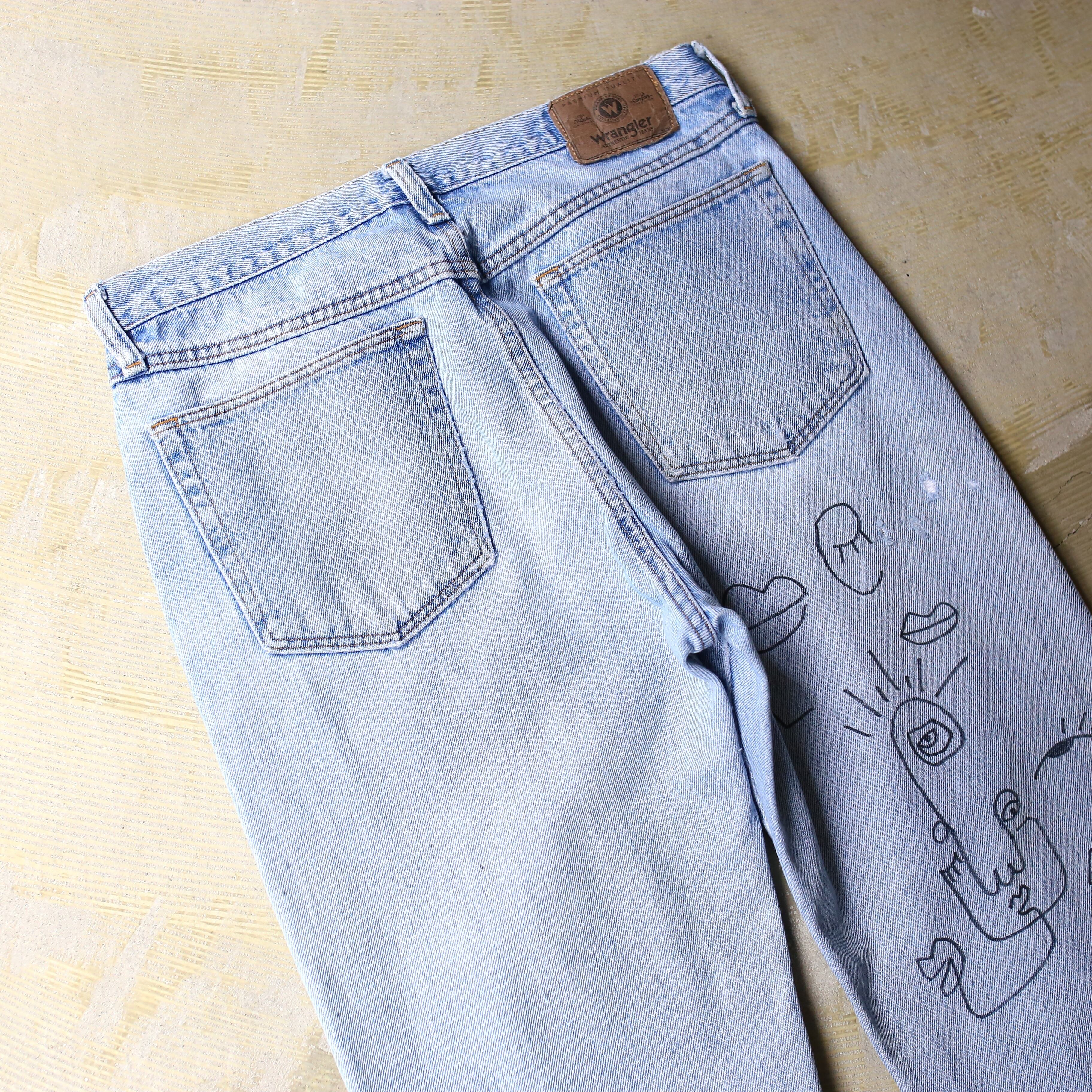 ・両面の全体にハンドペイントによるアートが描かれたラングラーのデニムパンツ。