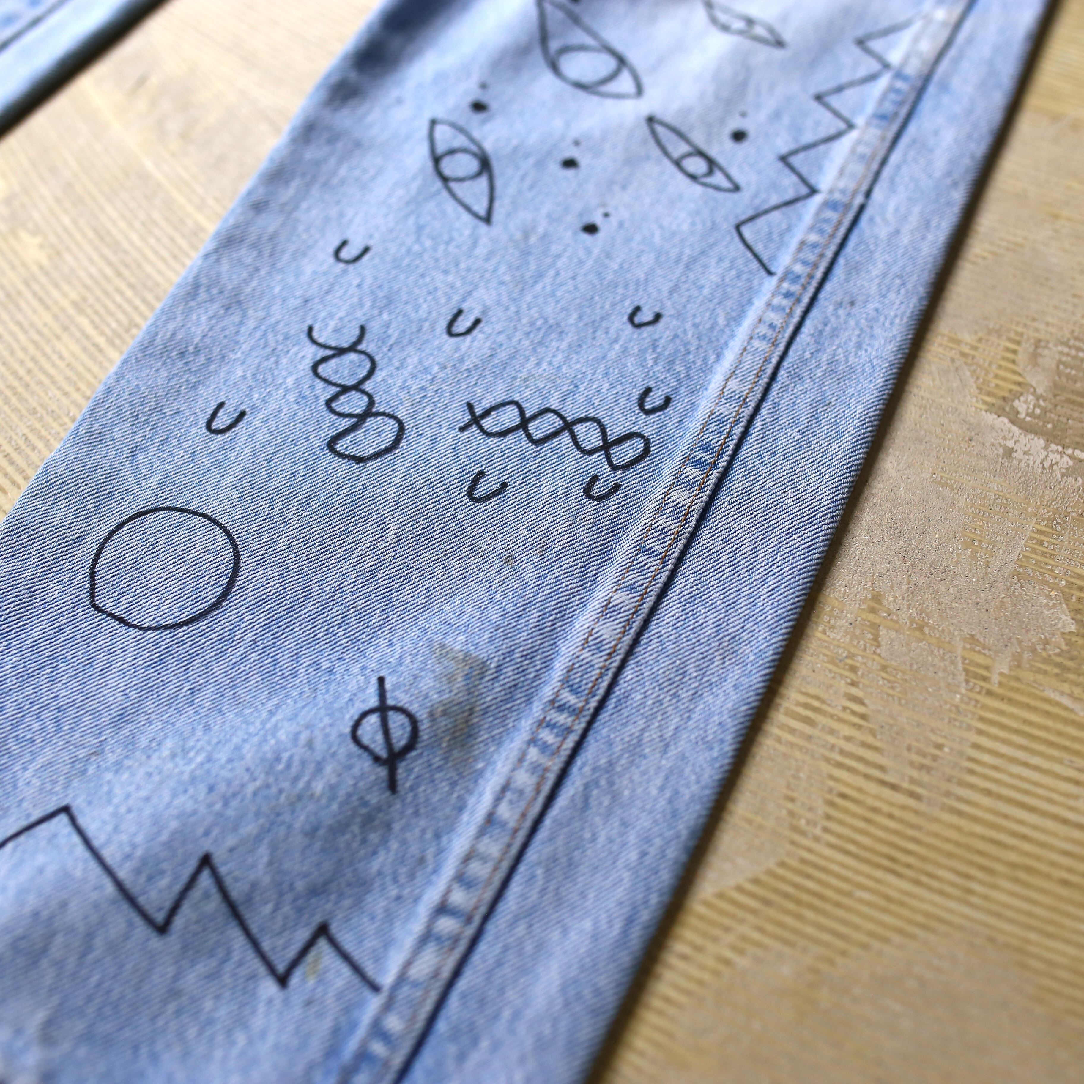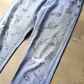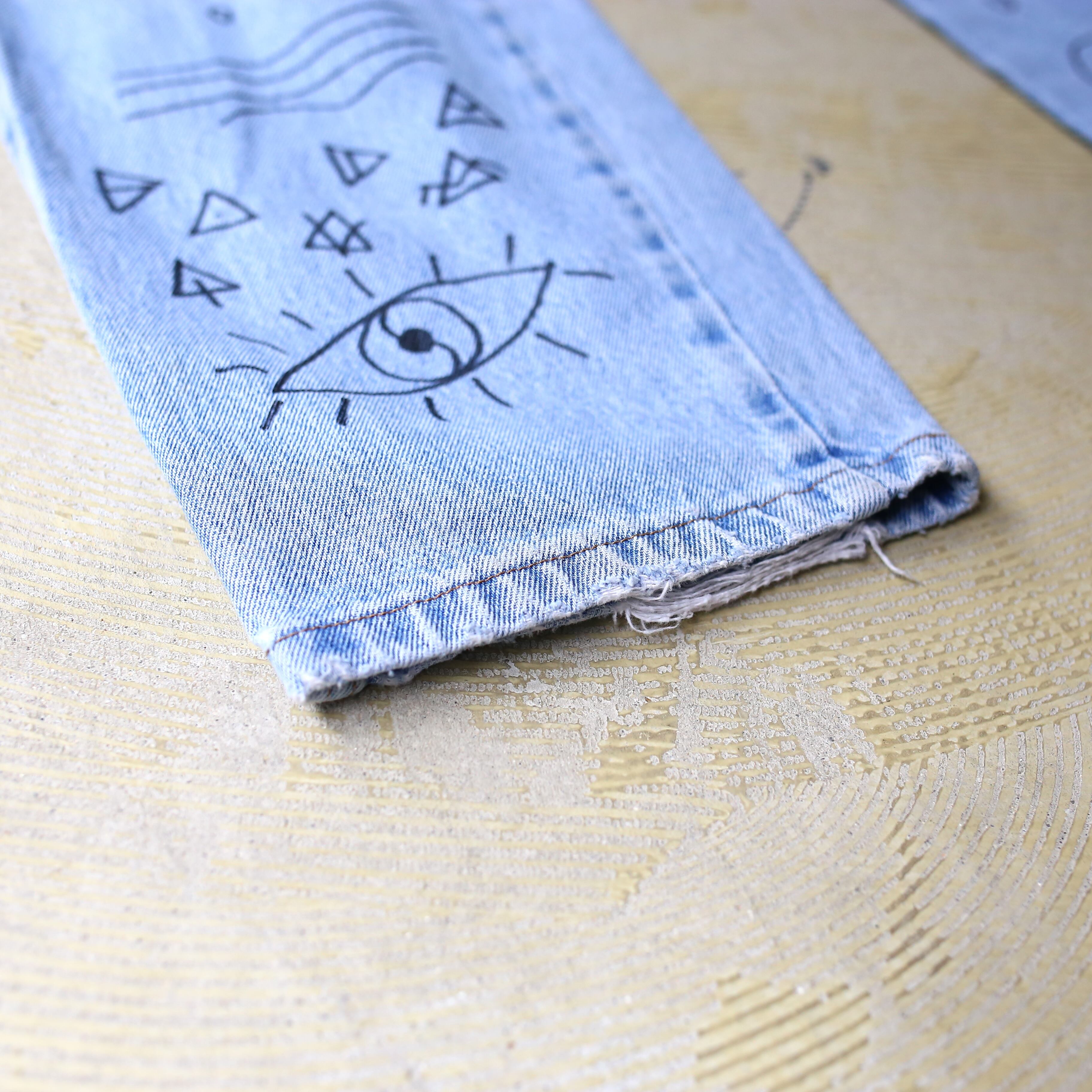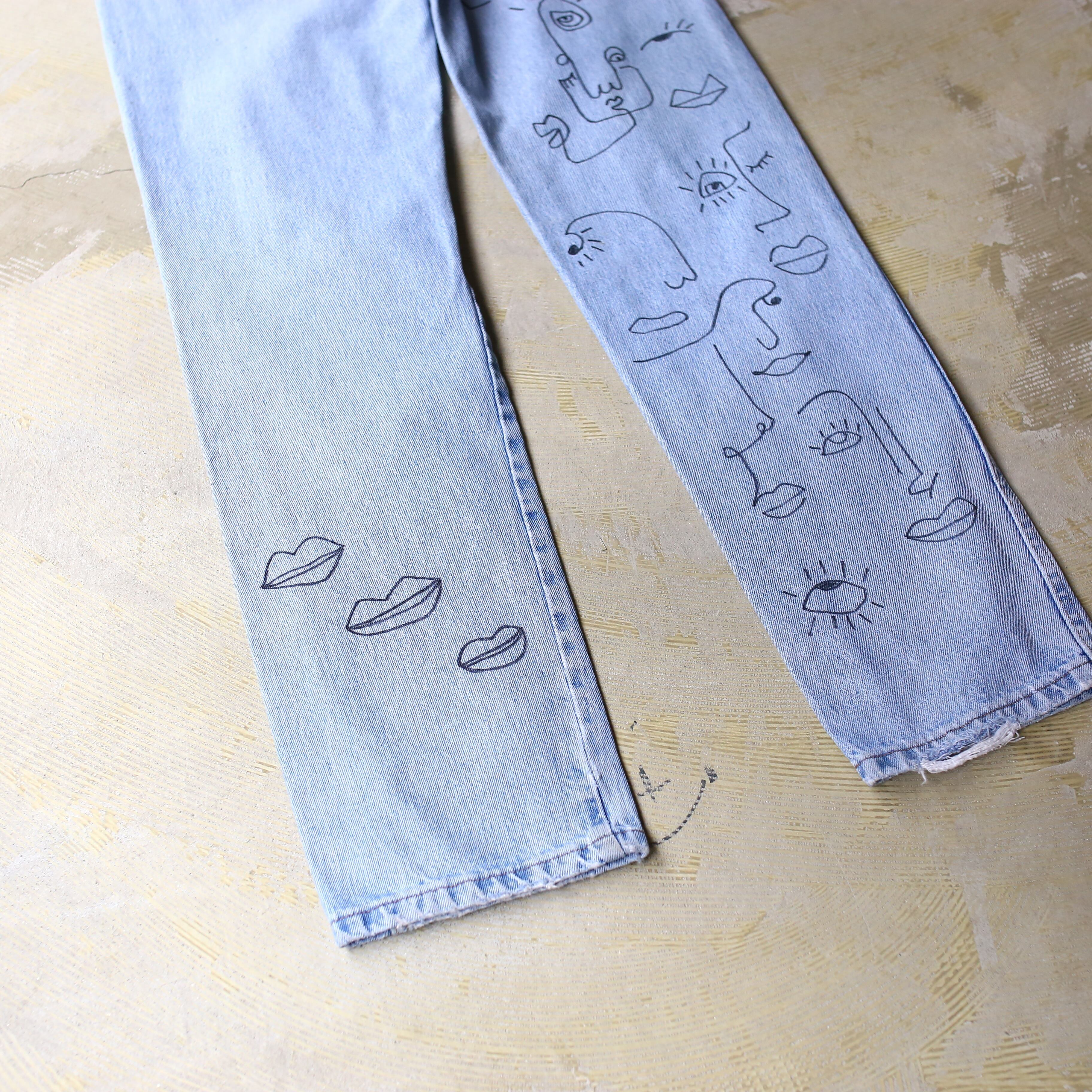 ・両面の全体にハンドペイントによるアートが描かれたラングラーのデニムパンツ。