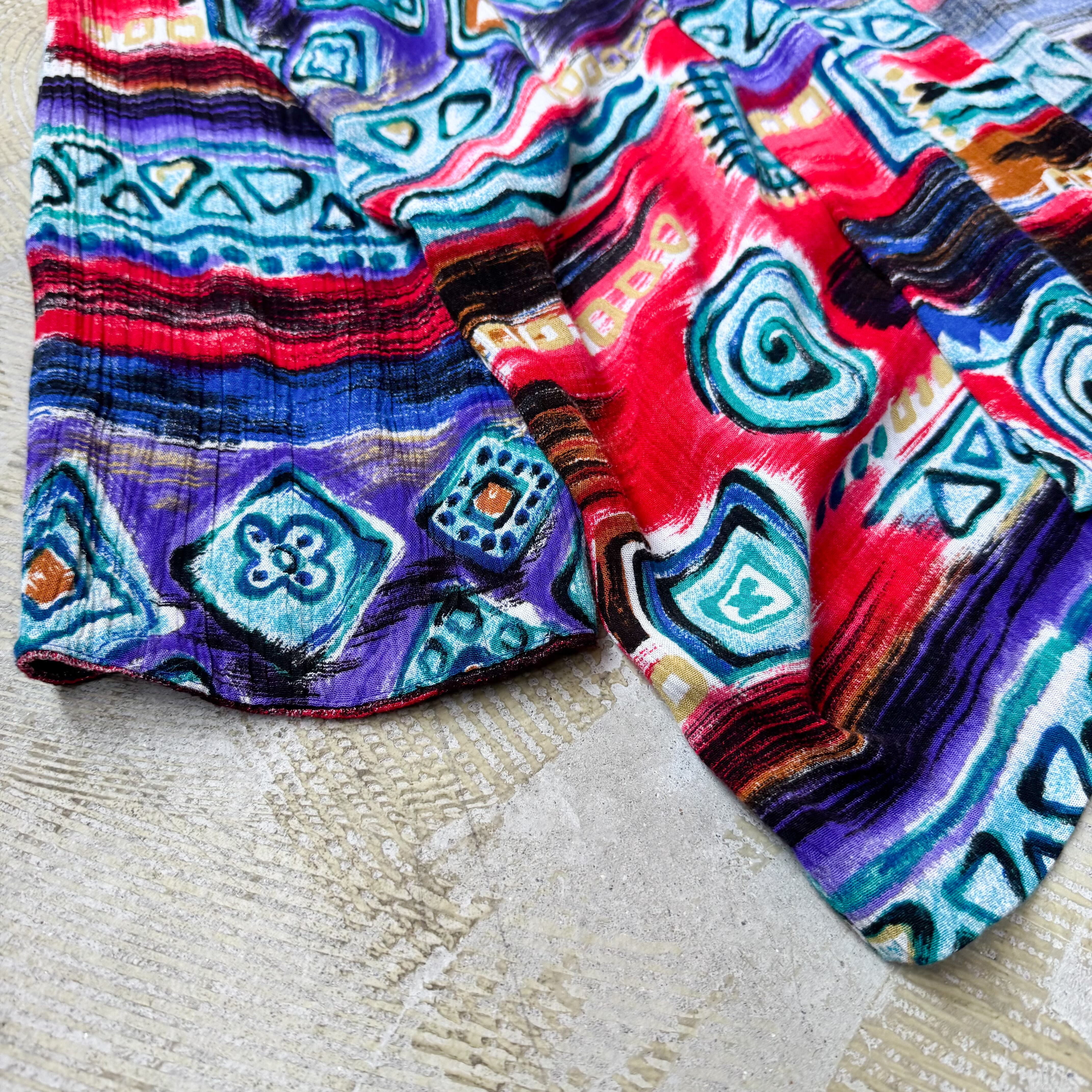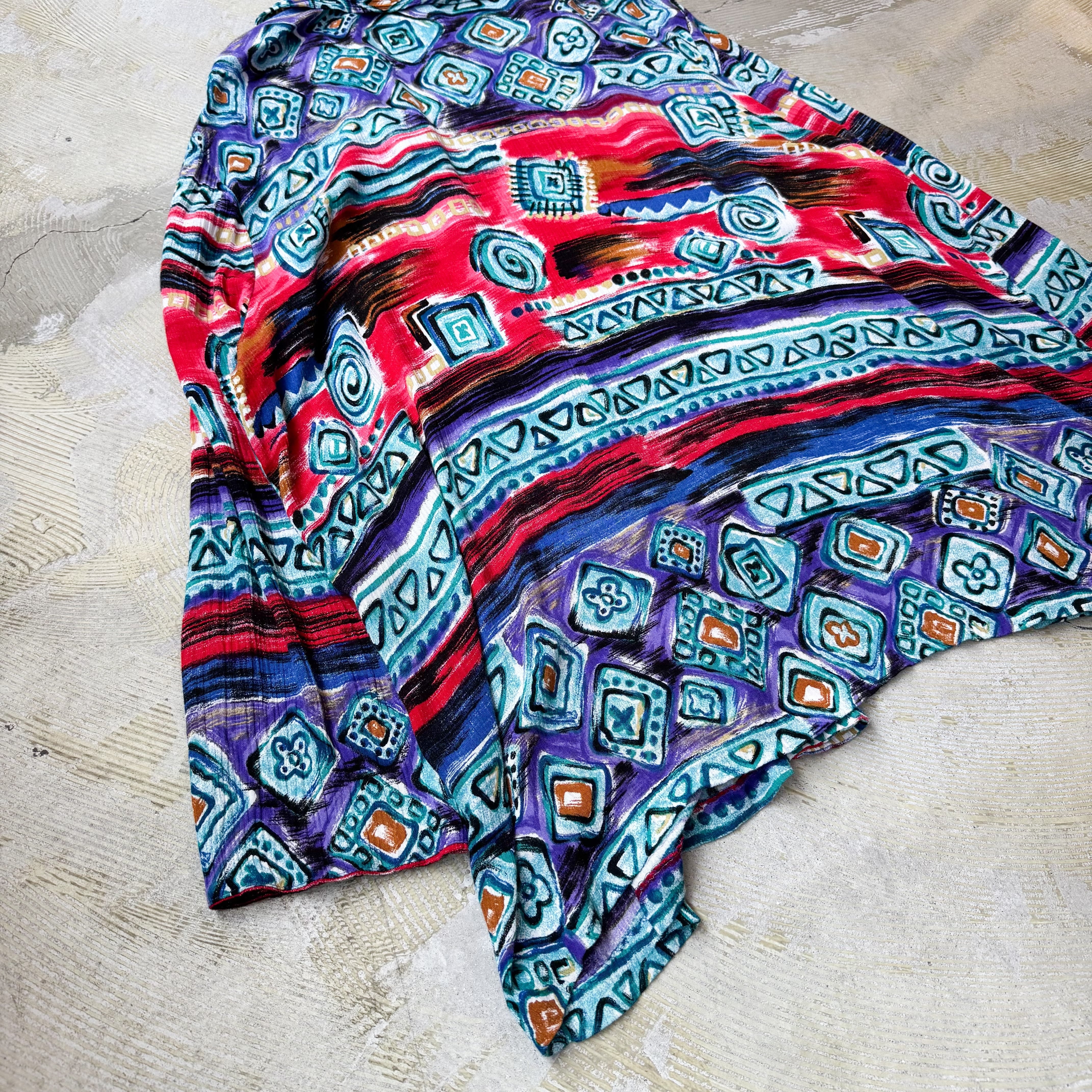 ・民族調の幾何学模様・鮮烈なカラーリング・クラフト感ある切り替えという