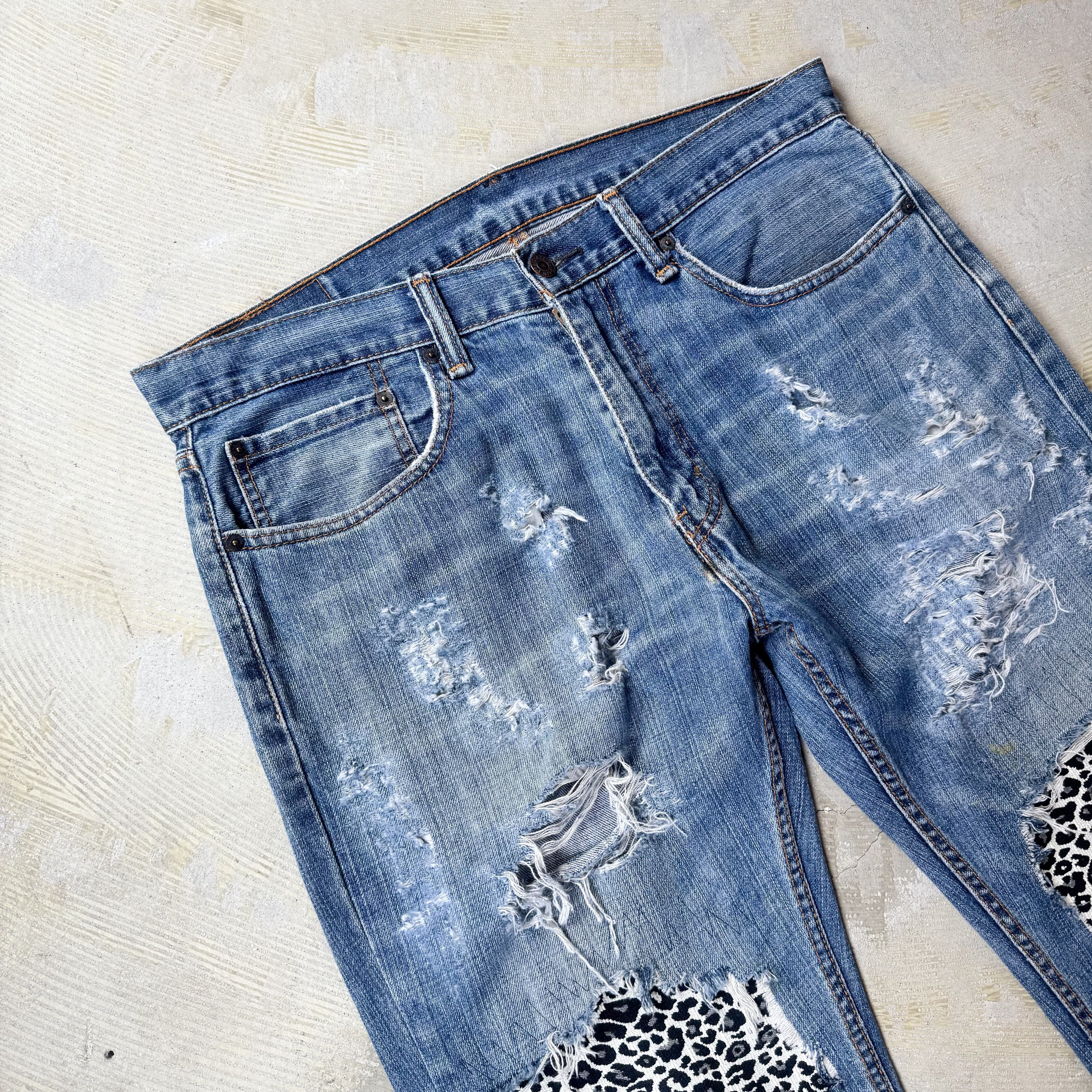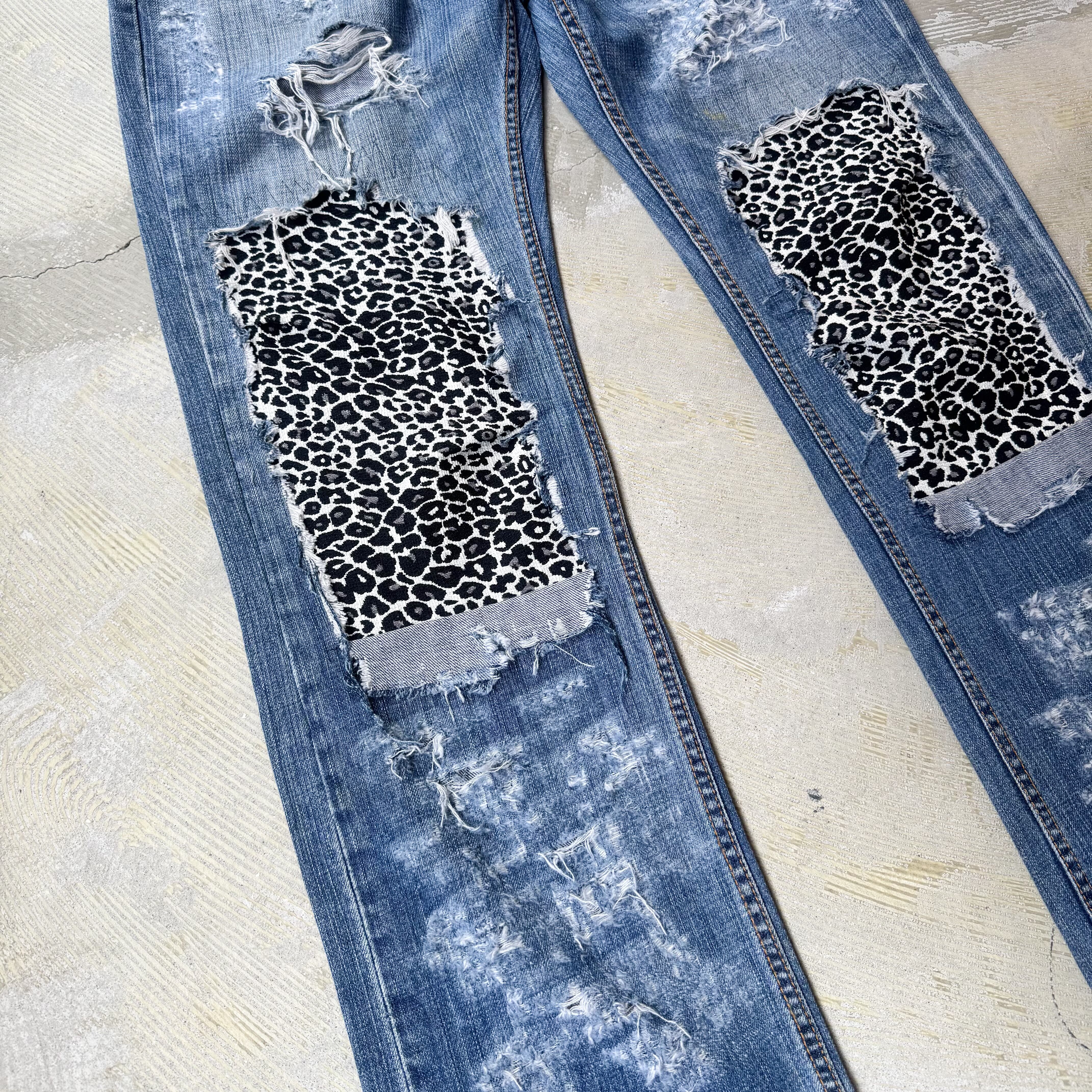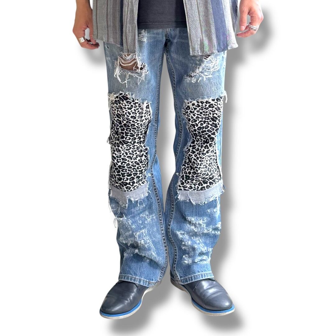 LEOPARD PATCH DAMAGE DESIGN REMAKE DENIM PANTS / リメイク レオパード パッチ ダメージ グランジ デニム パンツ