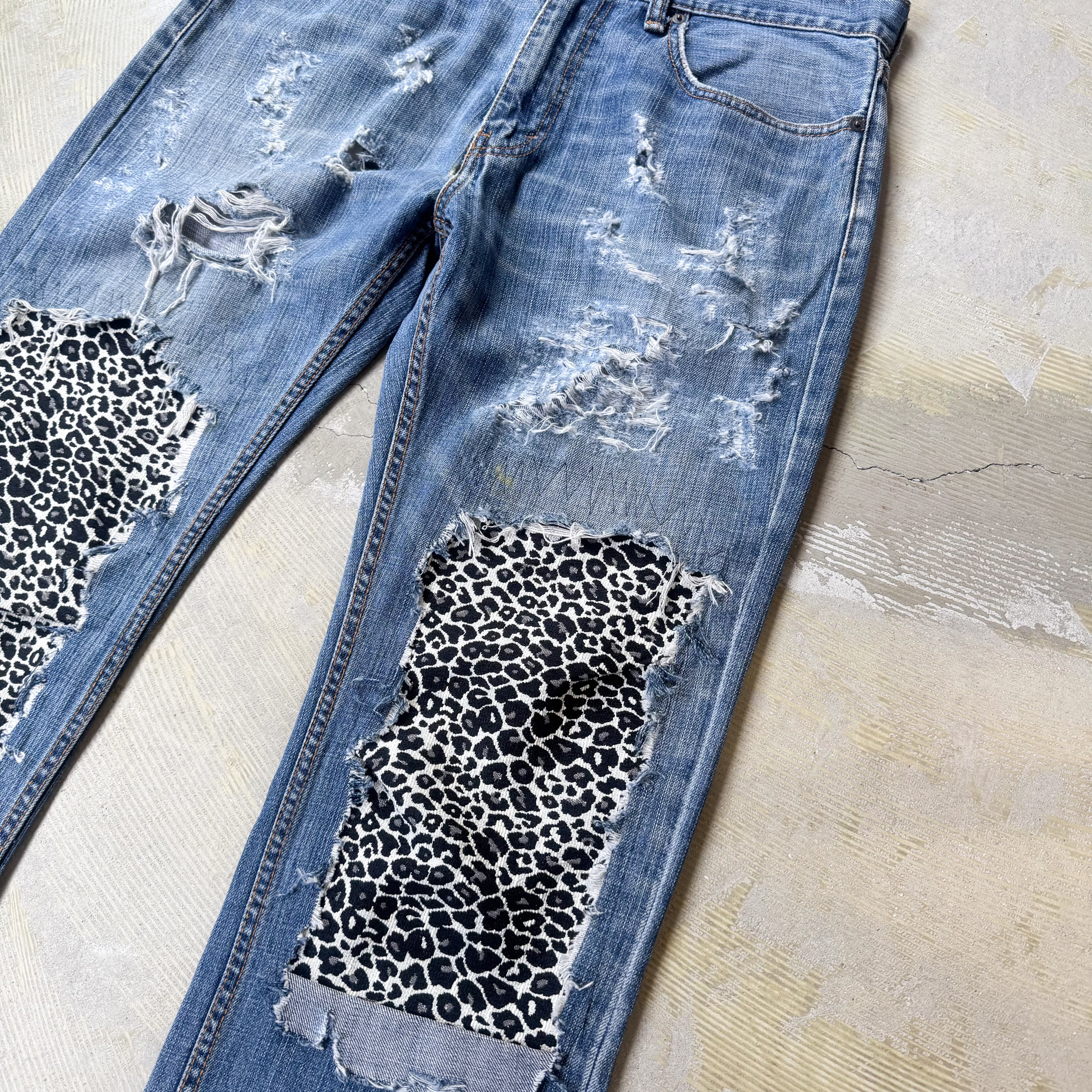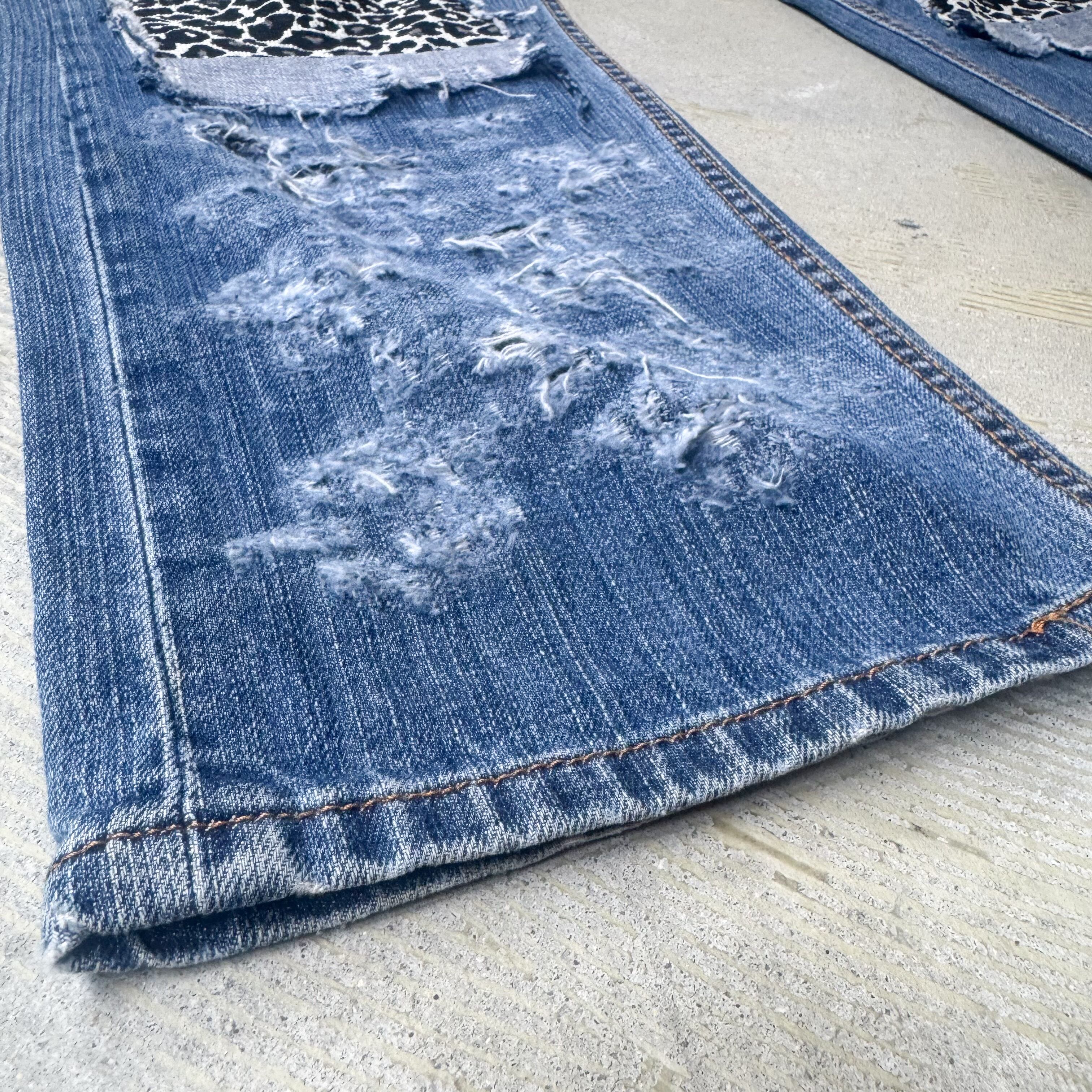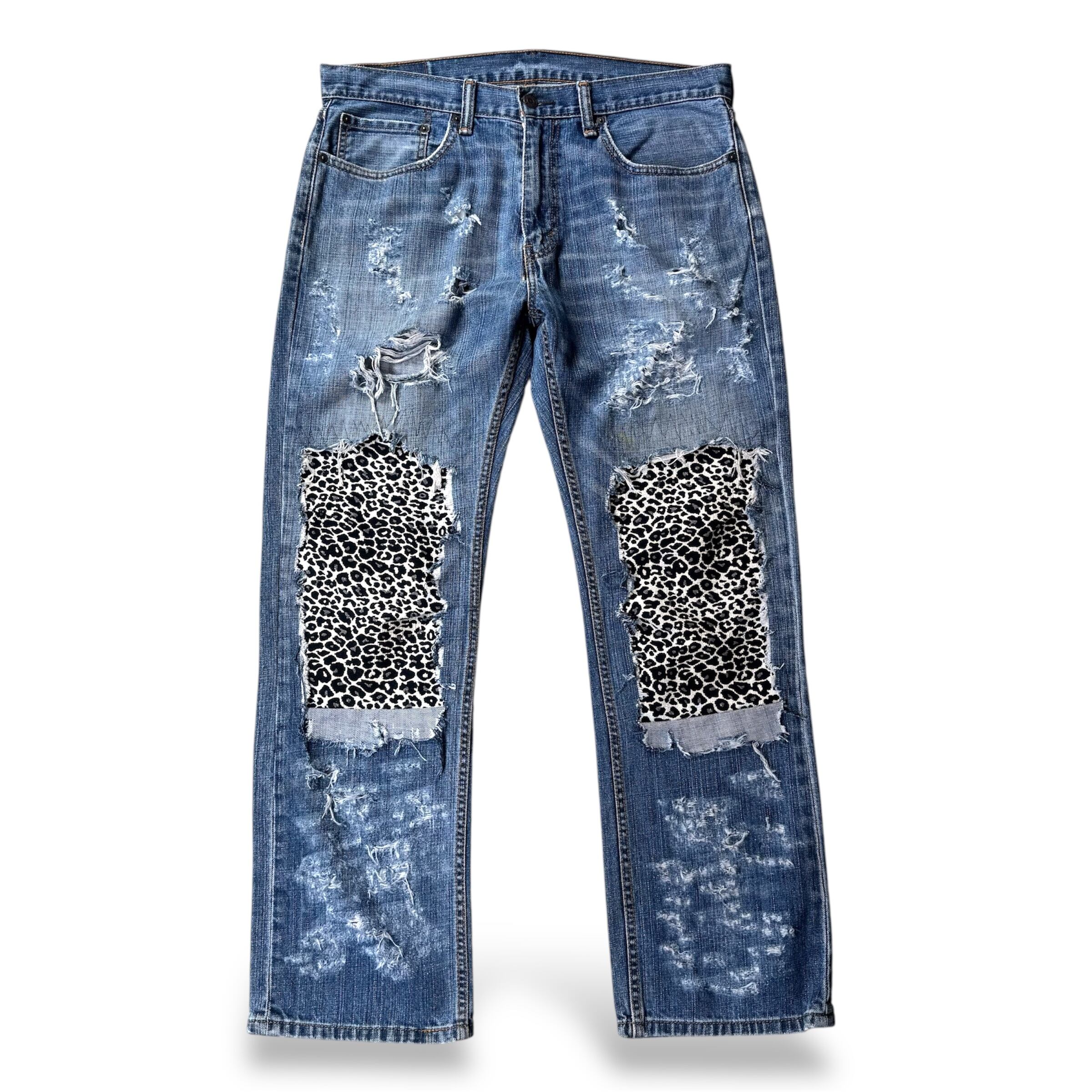 LEOPARD PATCH DAMAGE DESIGN REMAKE DENIM PANTS / リメイク レオパード パッチ ダメージ グランジ デニム パンツ