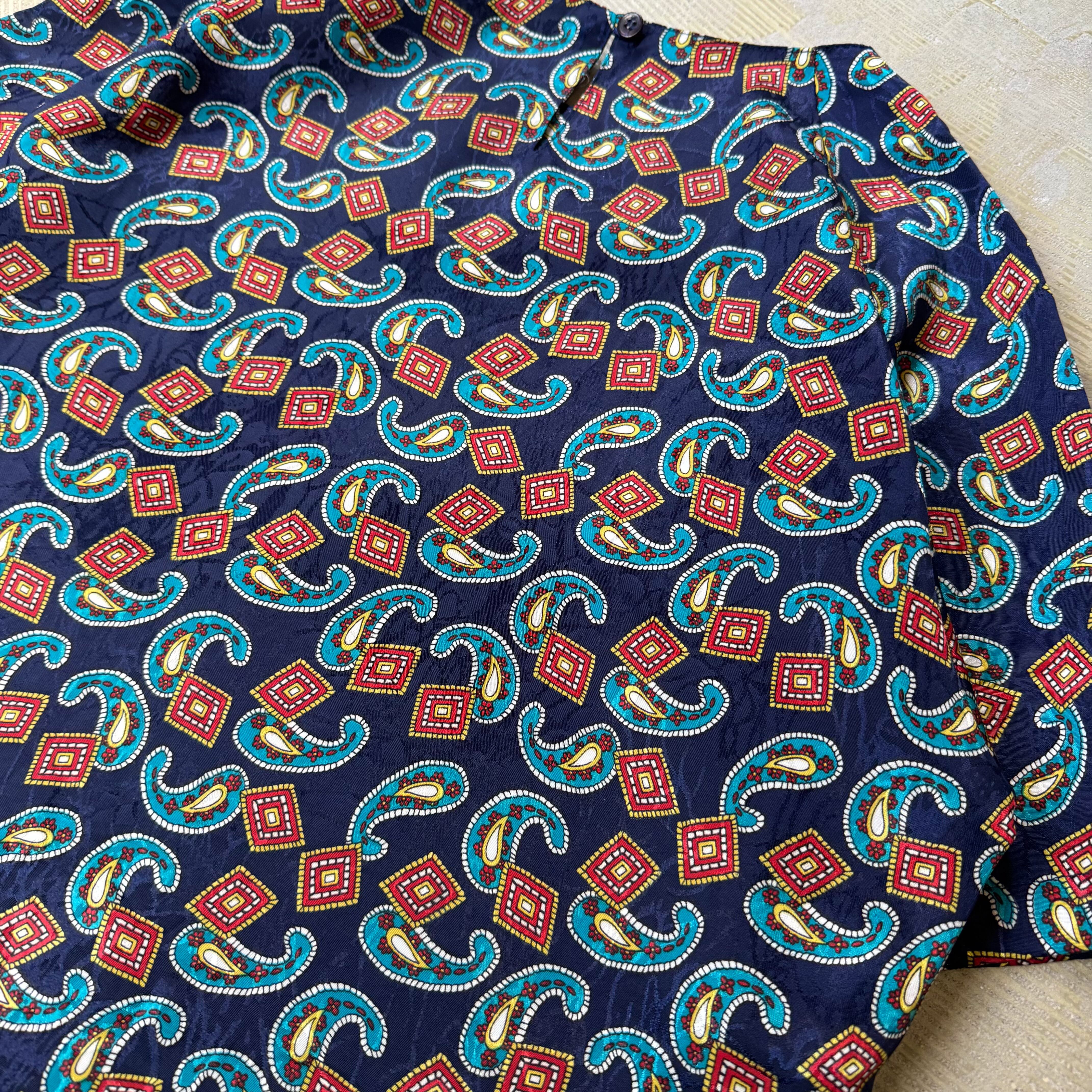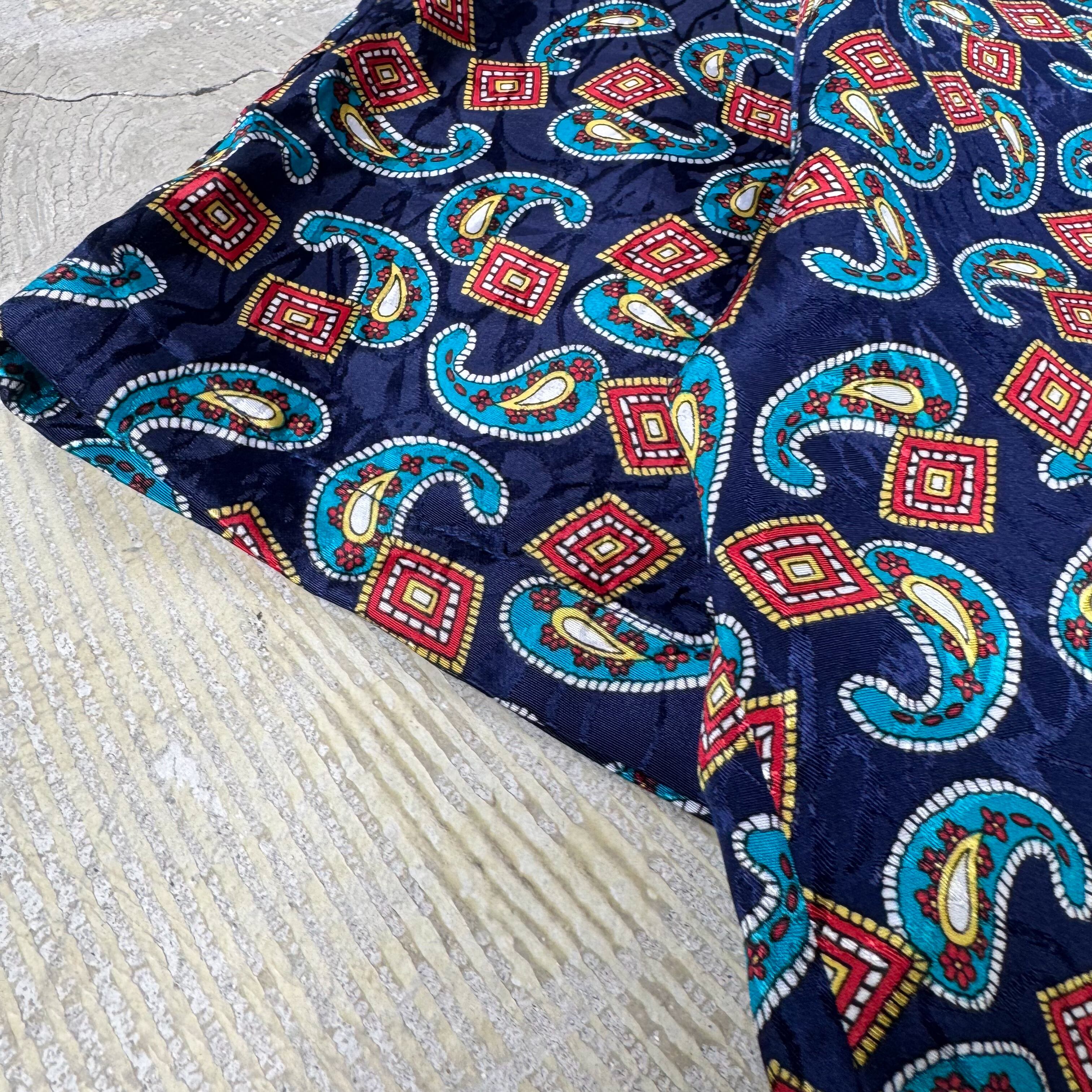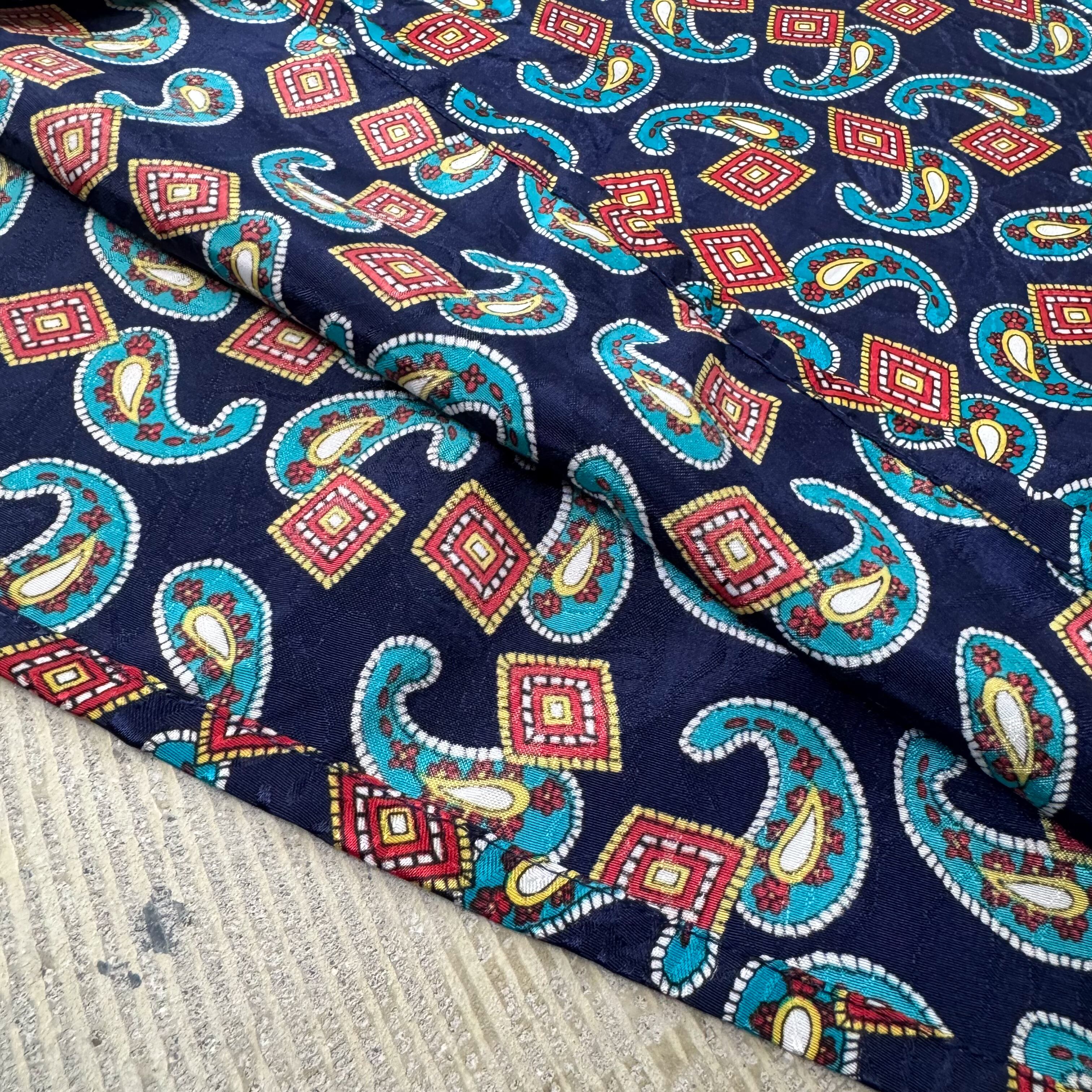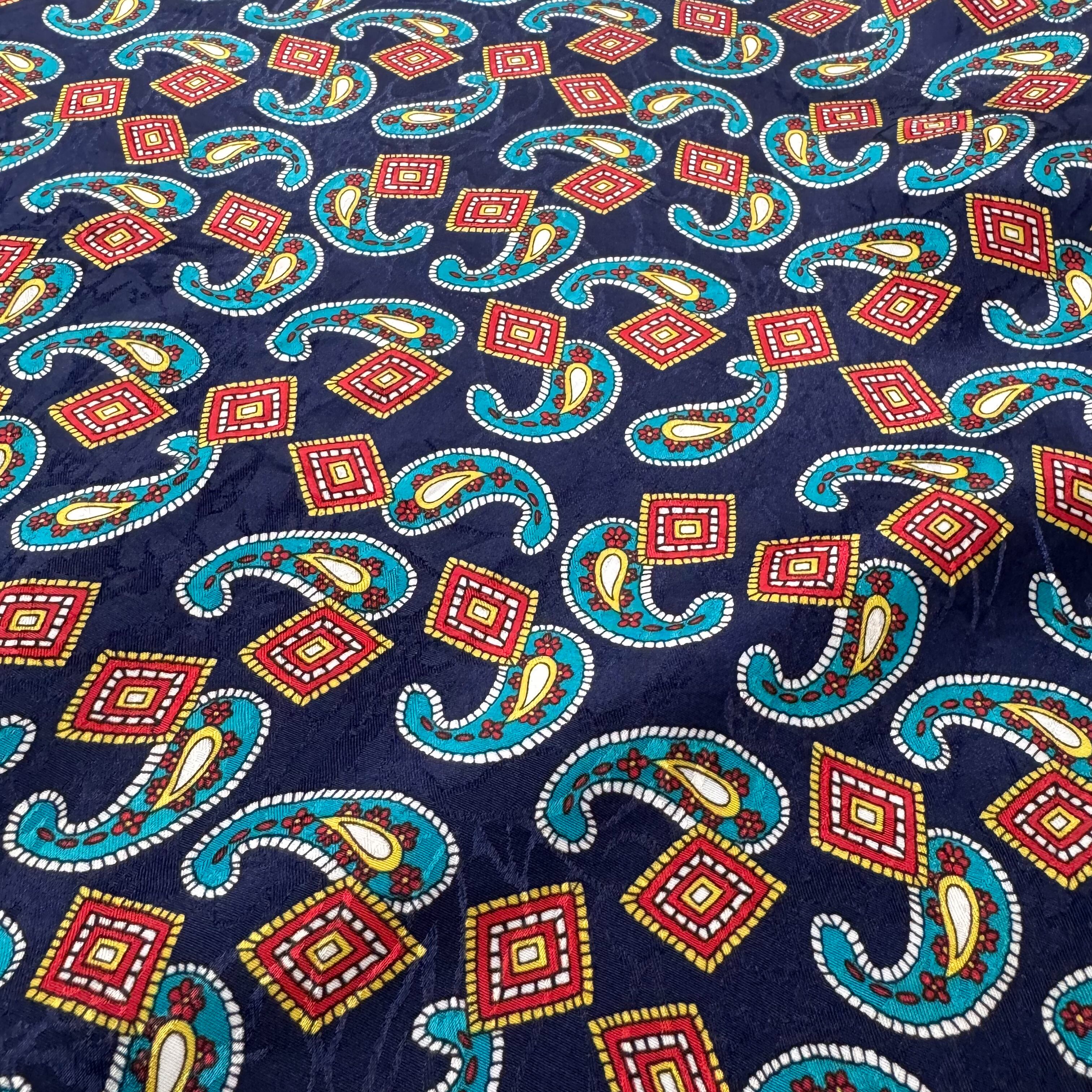 ・1980~90年代頃のネイビー地に赤×青×白のペイズリー&ジオメトリックパターンが踊る