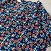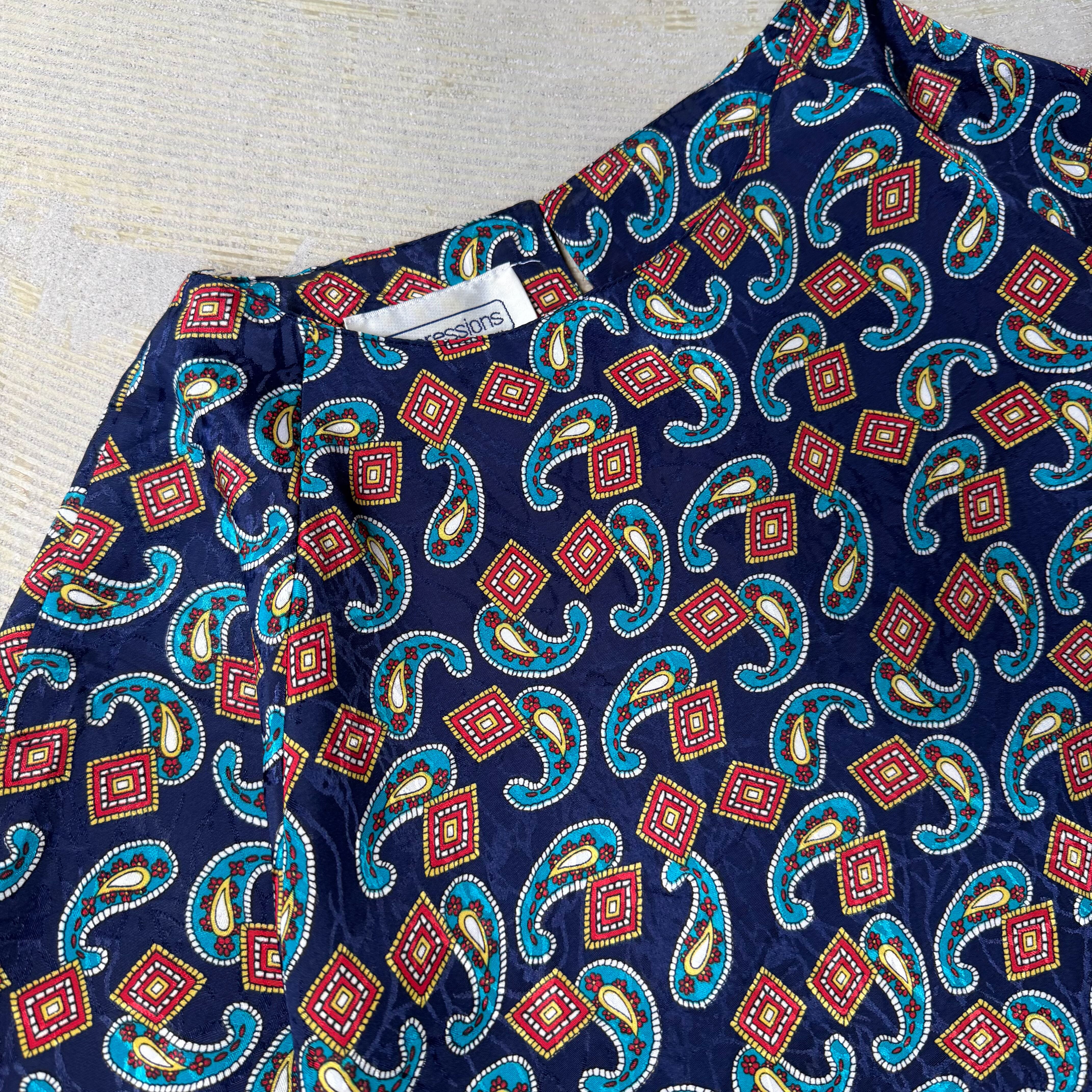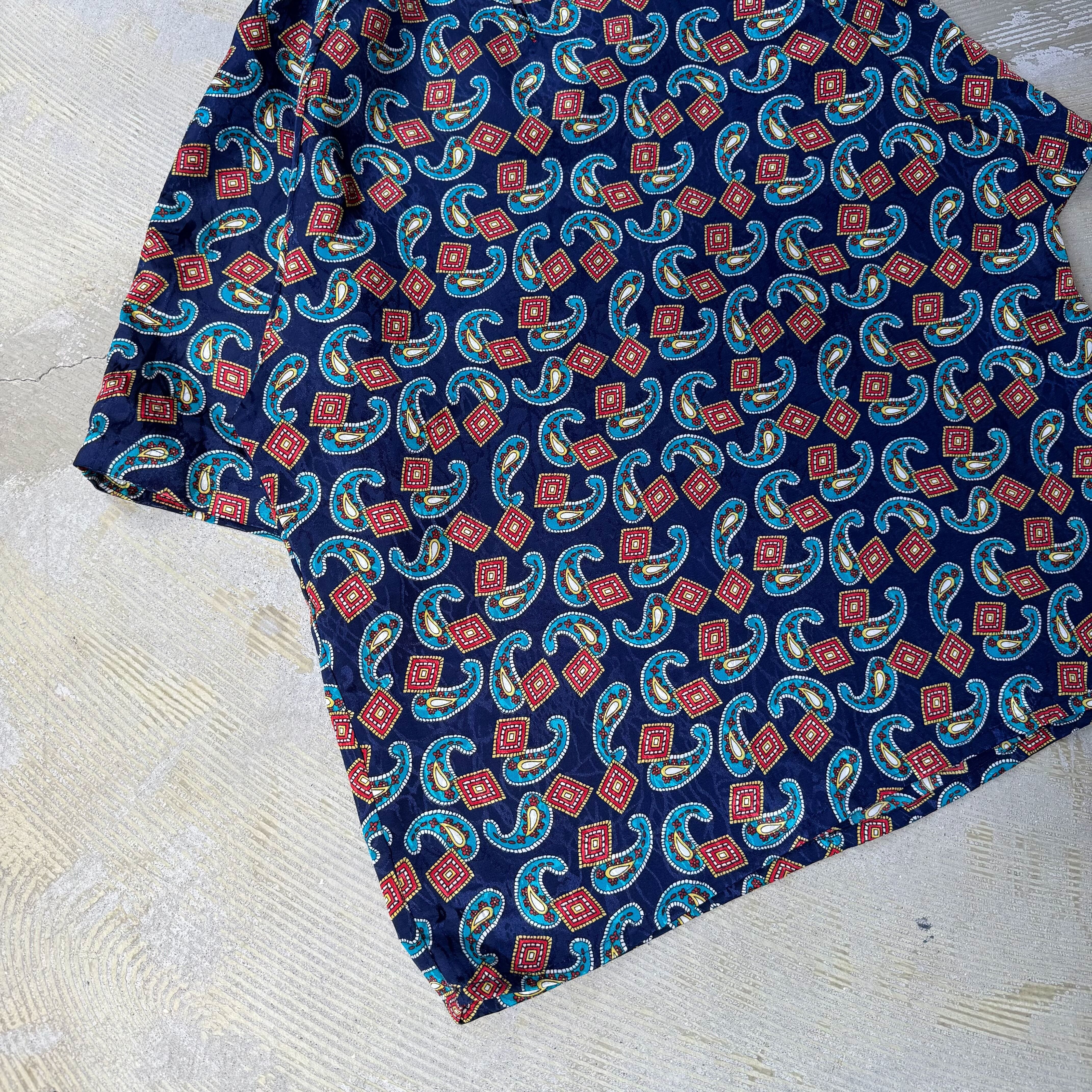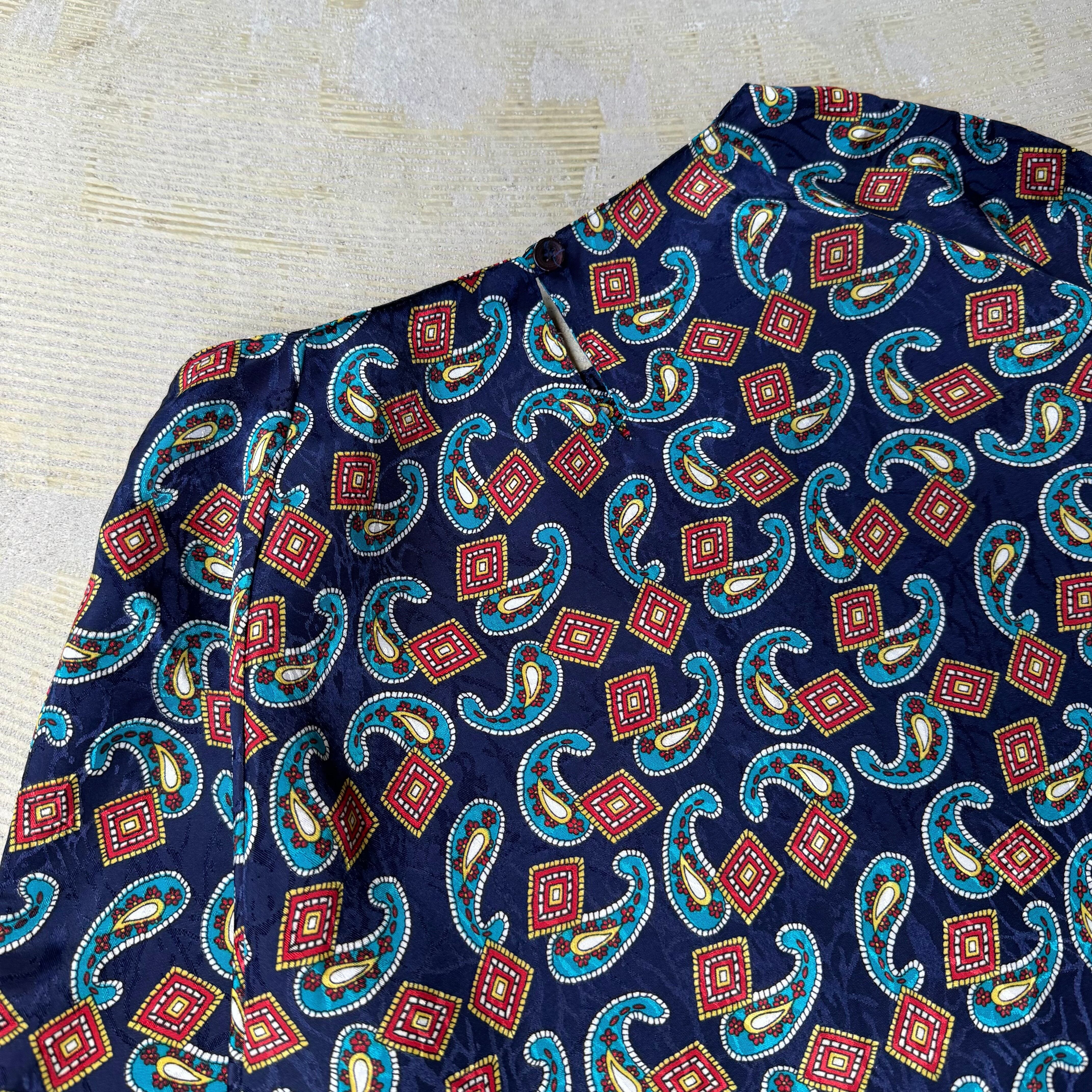 ・1980~90年代頃のネイビー地に赤×青×白のペイズリー&ジオメトリックパターンが踊る