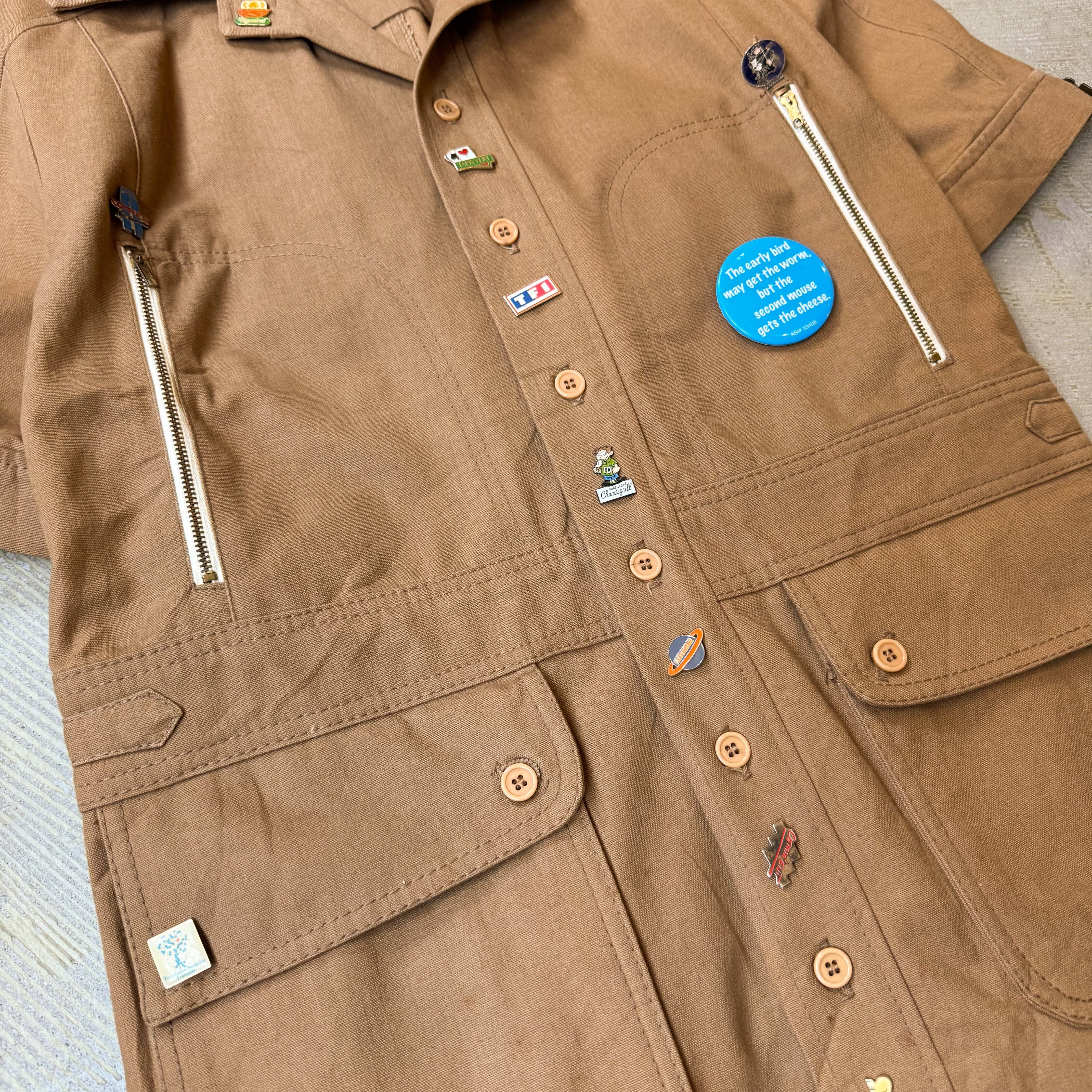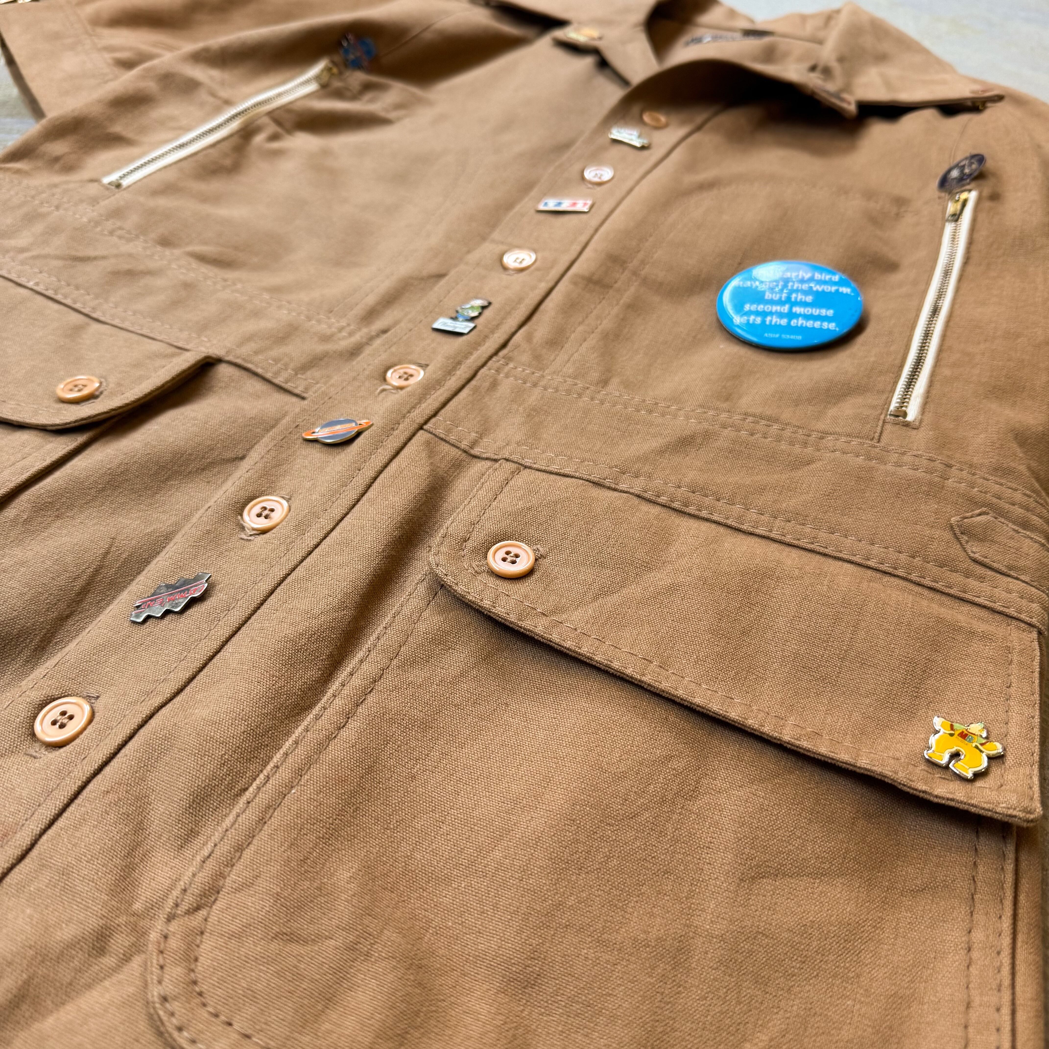ブラウンボディにジッパー、ポケット、そして散りばめられたピンズたちが