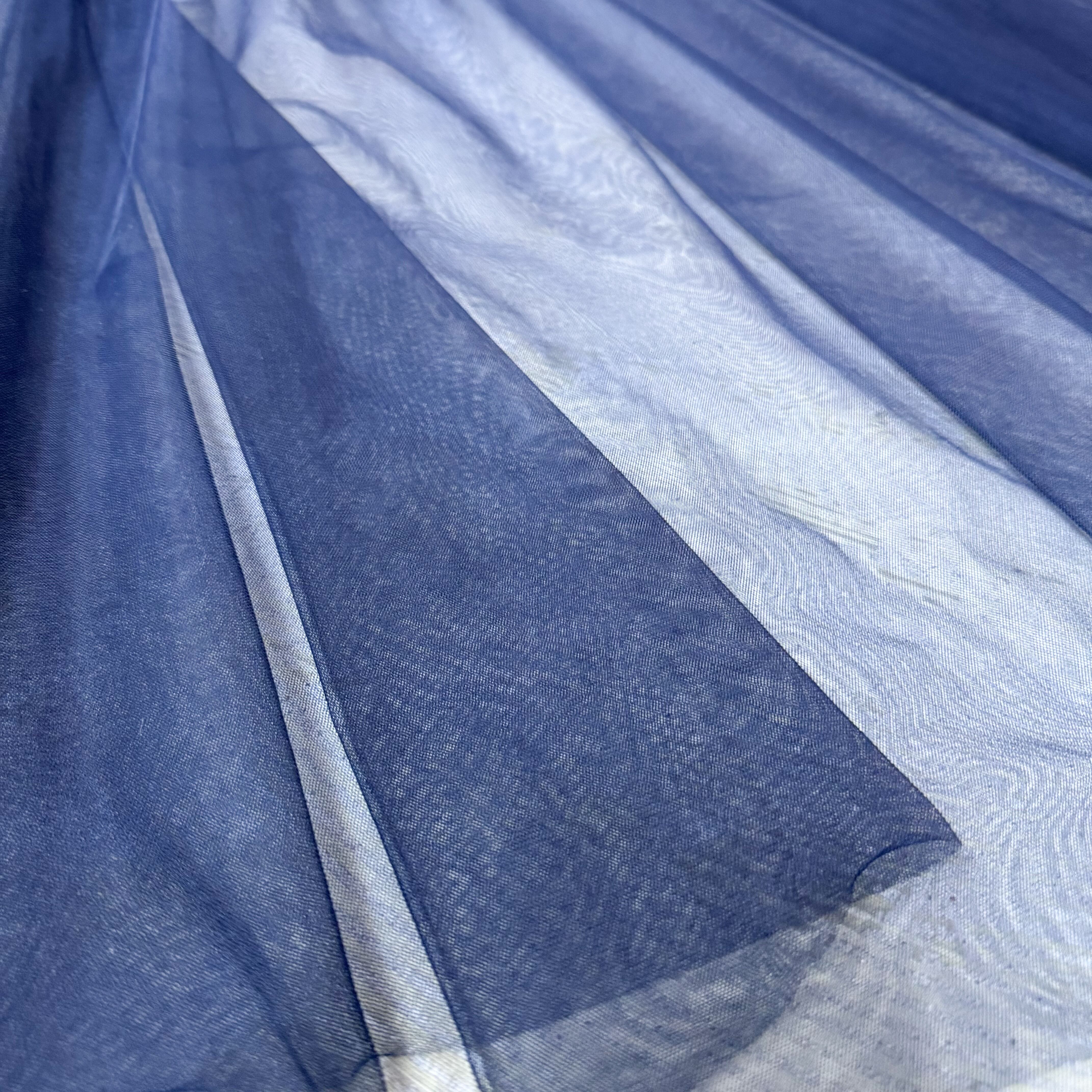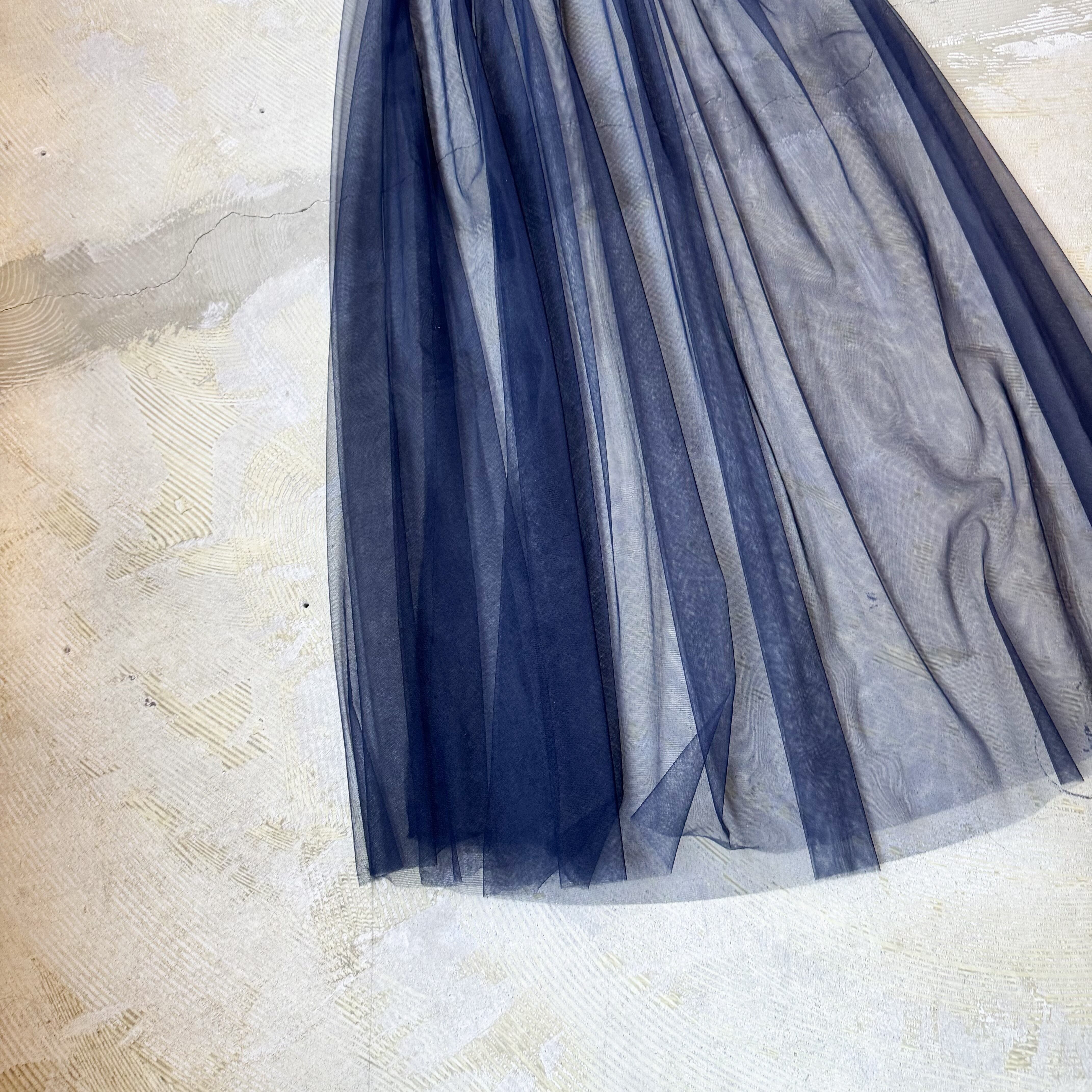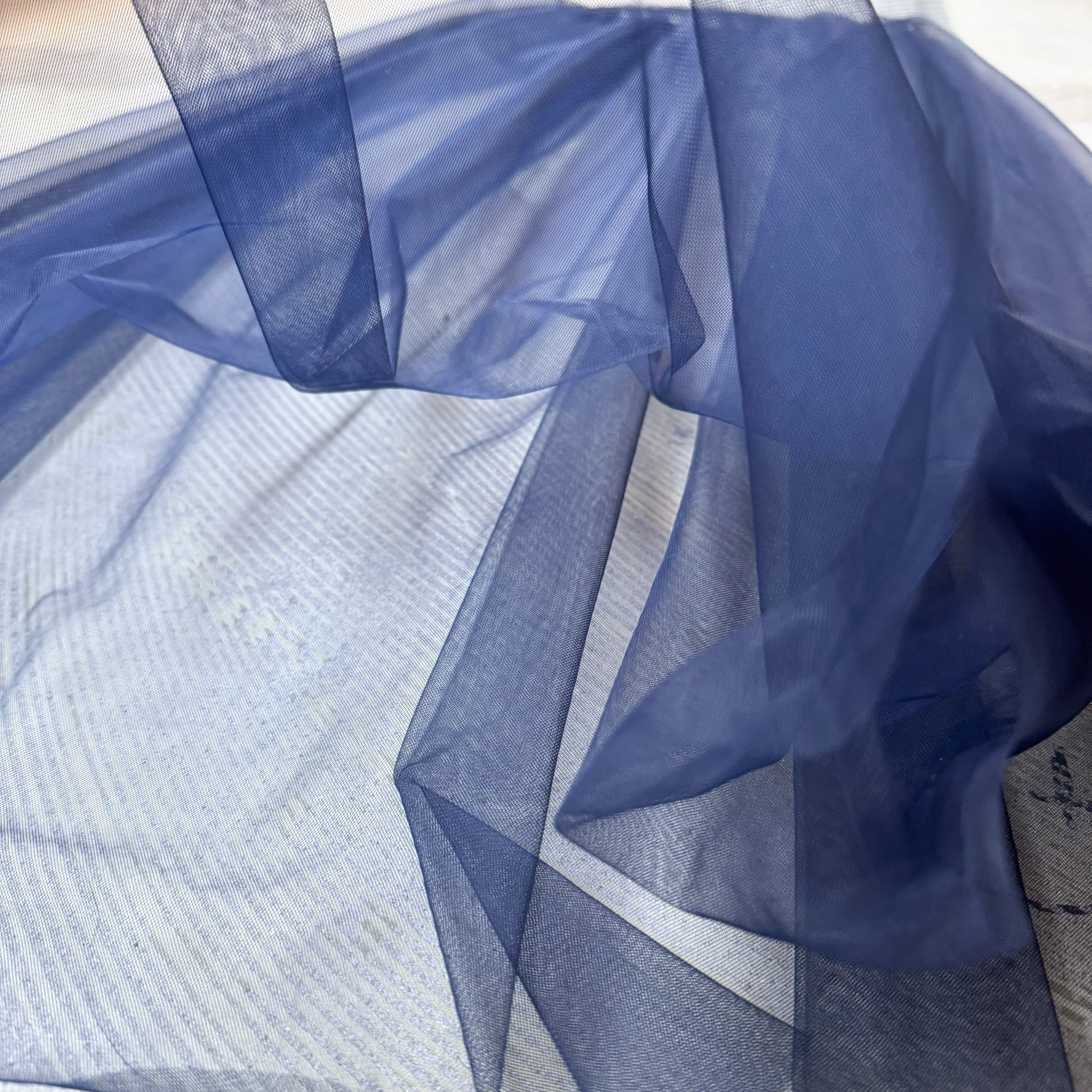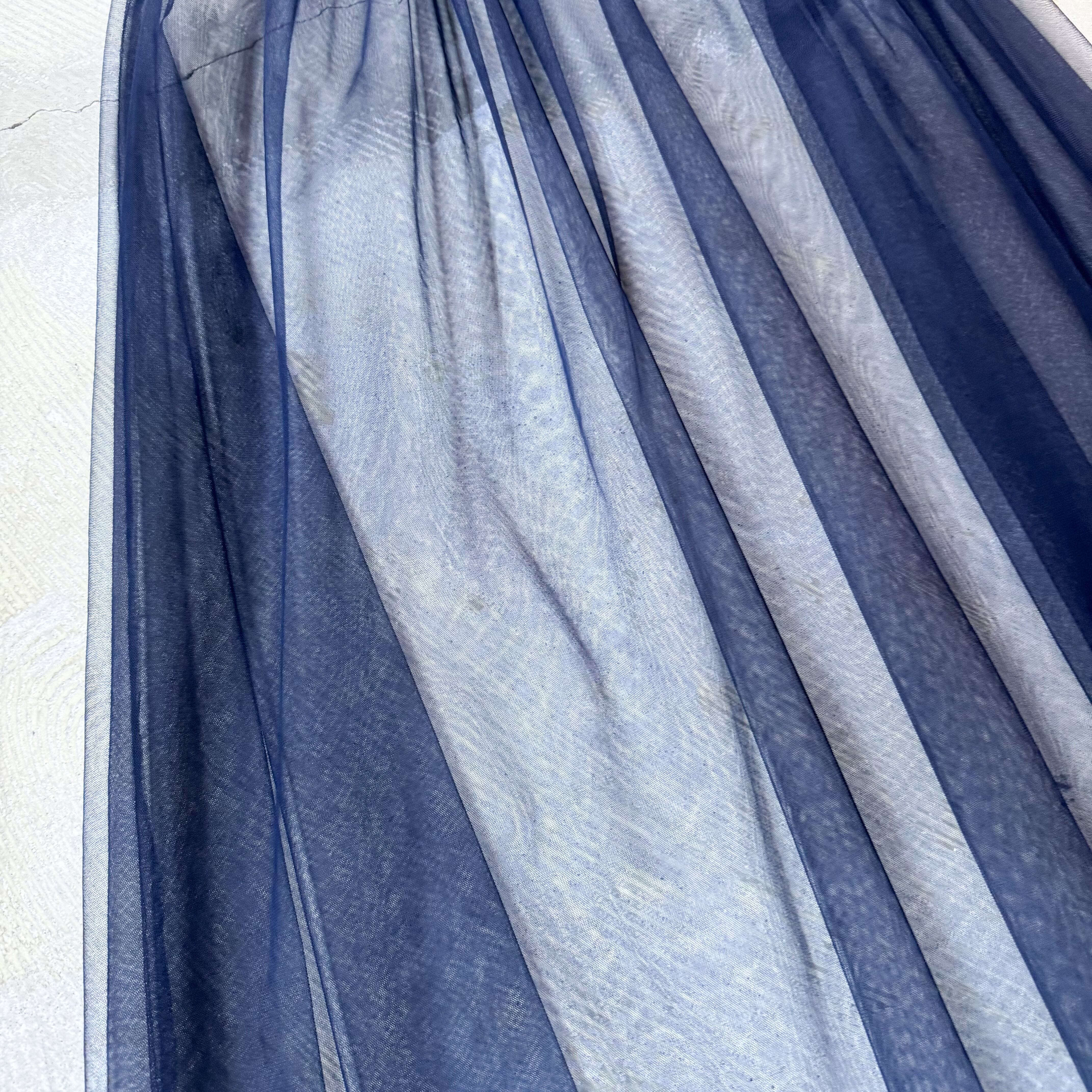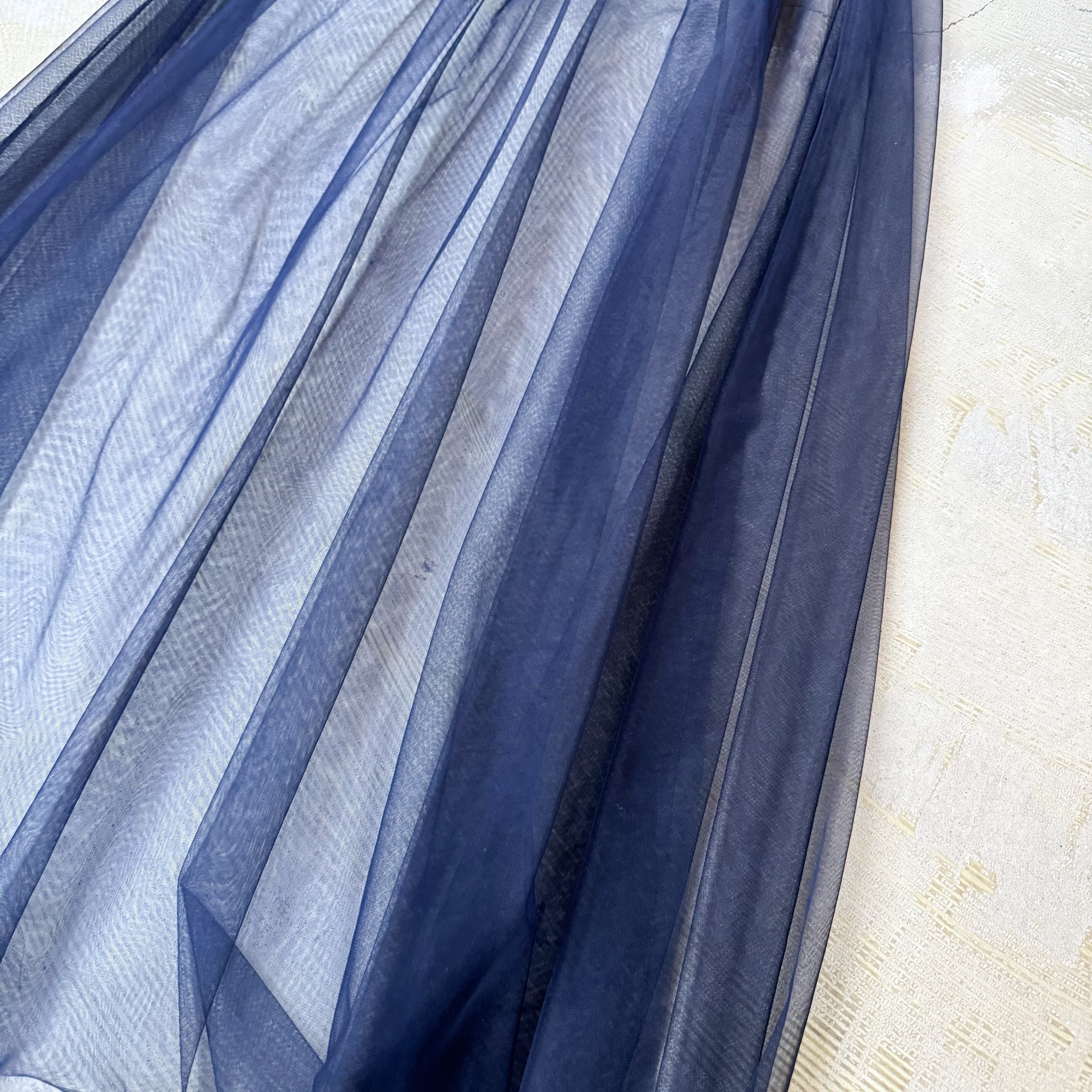 ・シアー素材、ネイビーブルーの深み、重なり合うチュールの揺らぎ