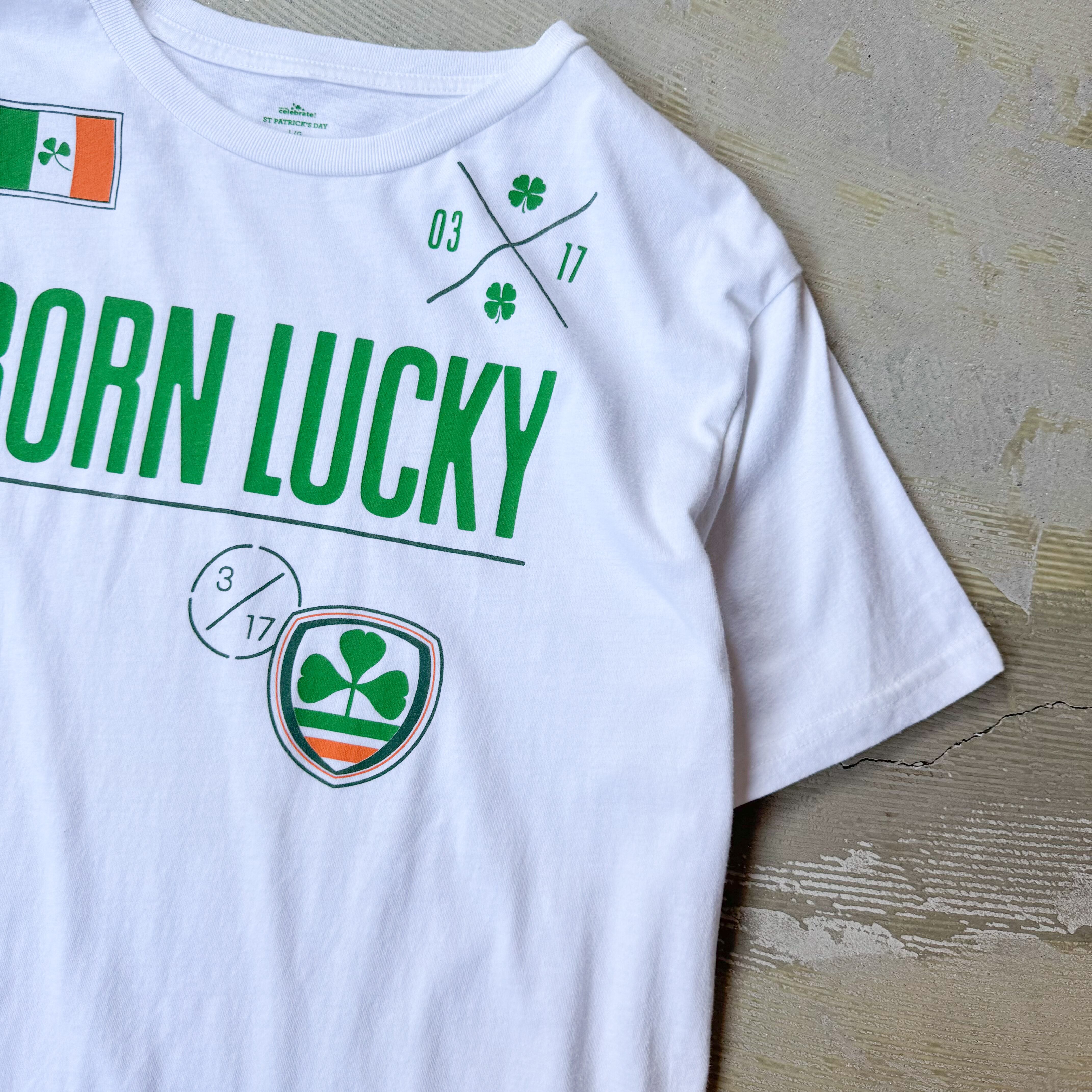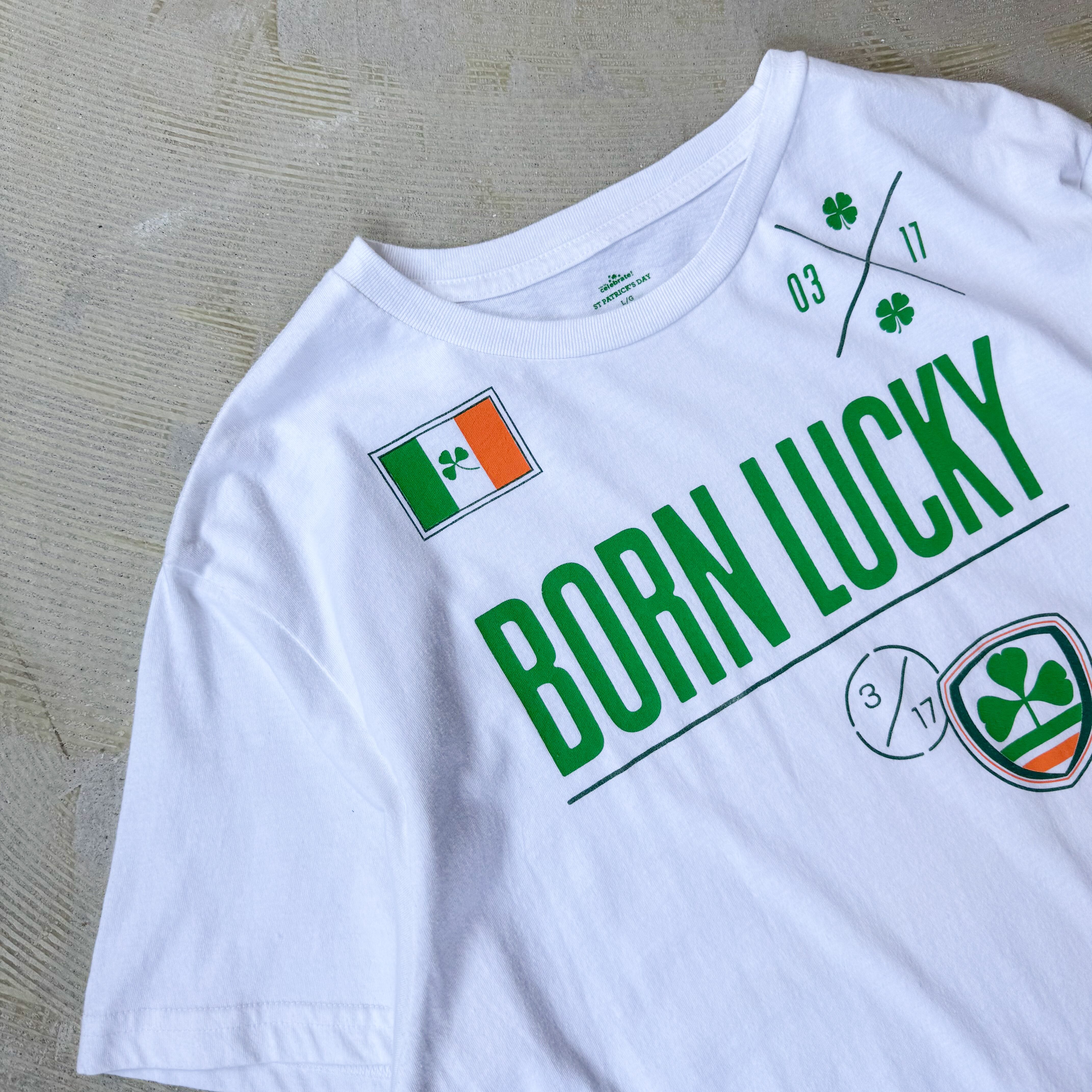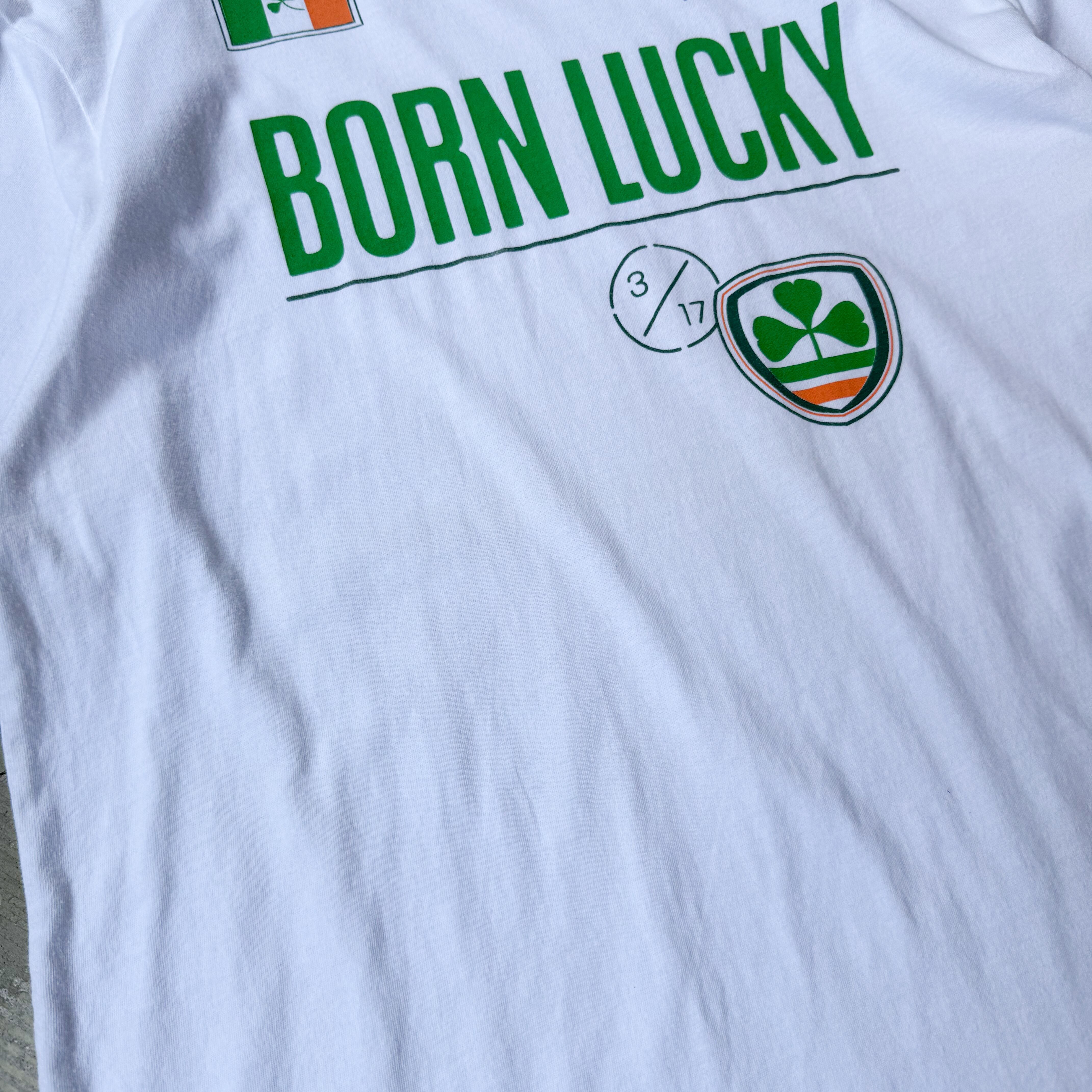 ・ "BORN LUCKY"の大胆なフレーズと、アイルランドの象徴であるクローバーや