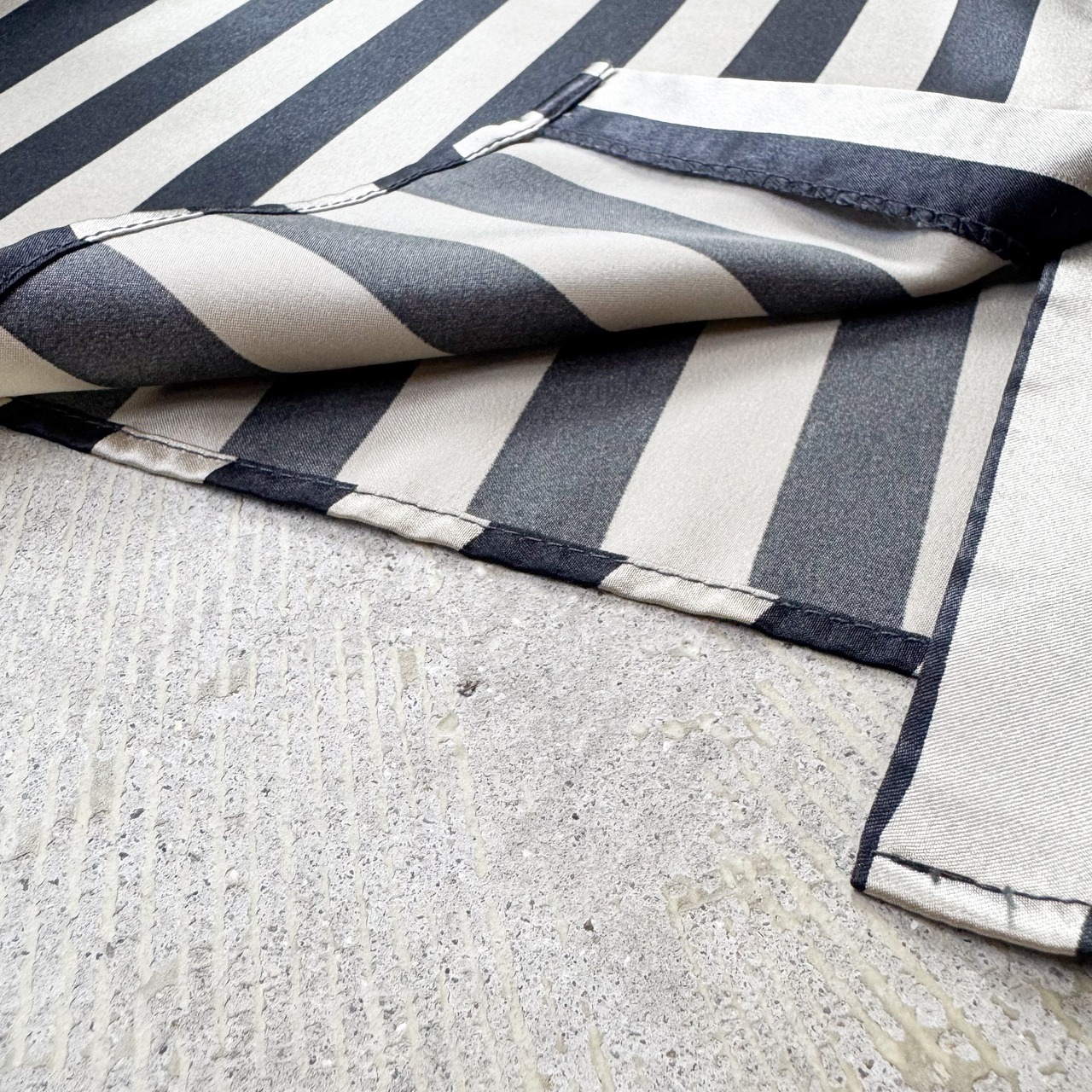 サテン生地特有の艶が、モノトーンのストライプに奥行きを与え