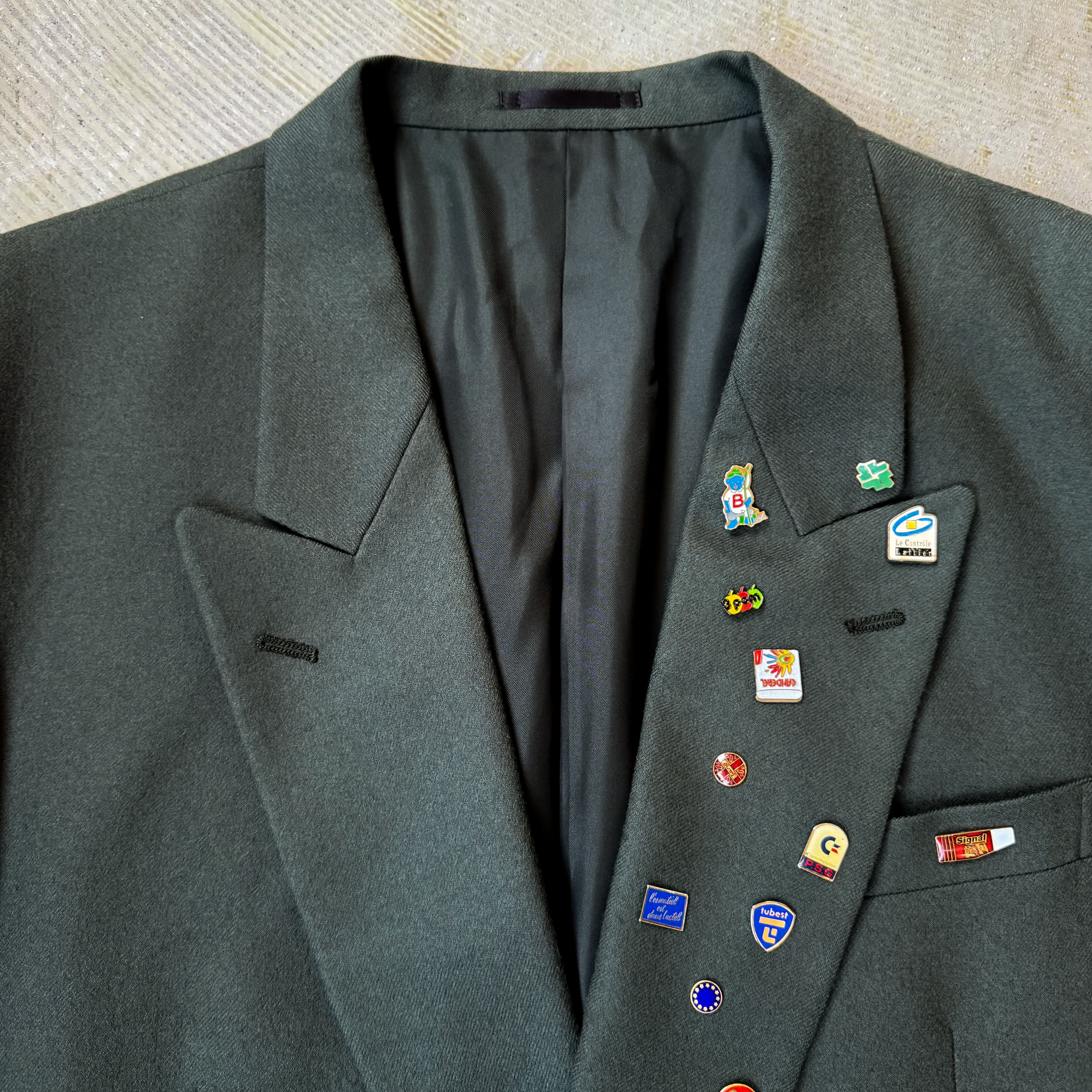 ラペルに散りばめられたピンズは、一点一点異なるモチーフで構成され