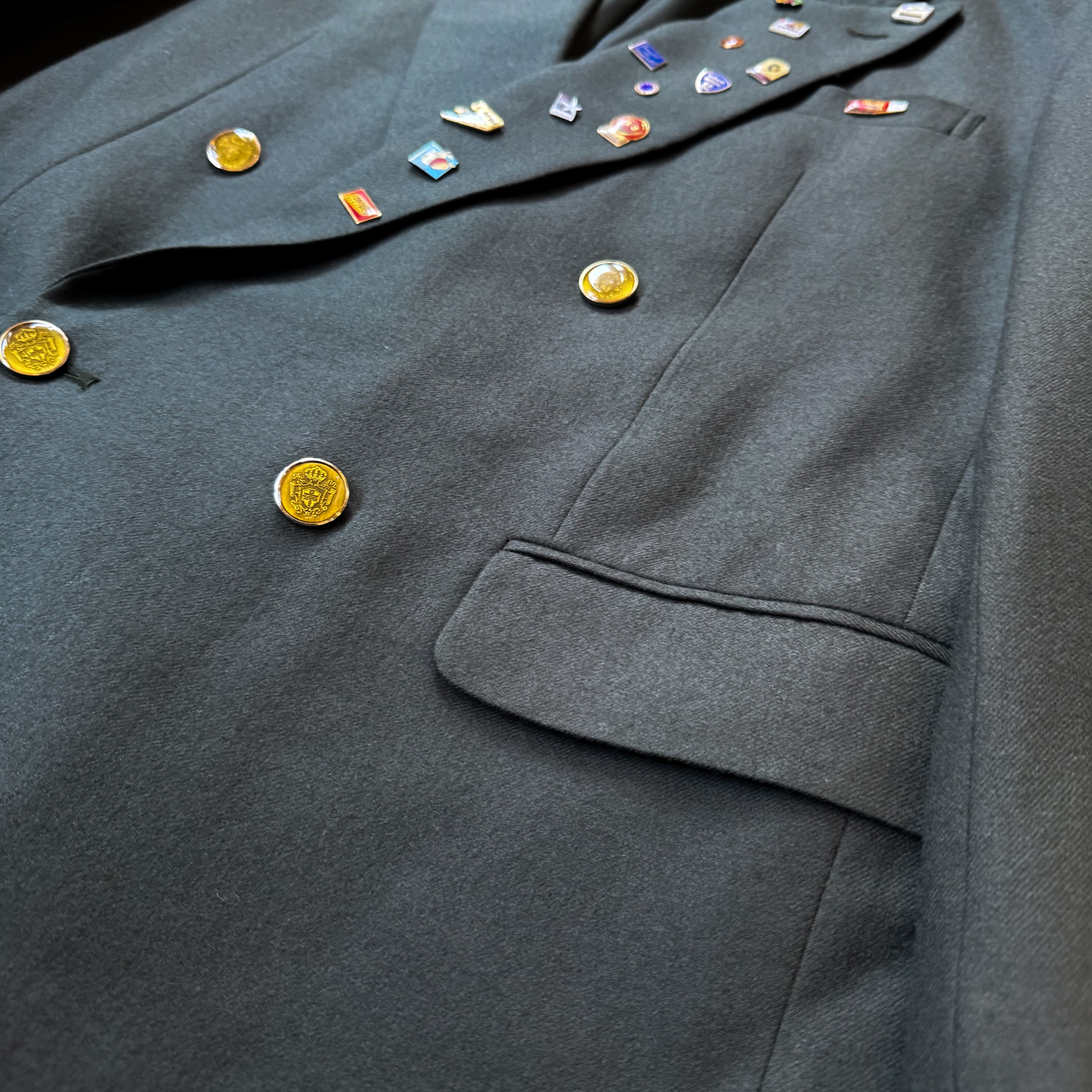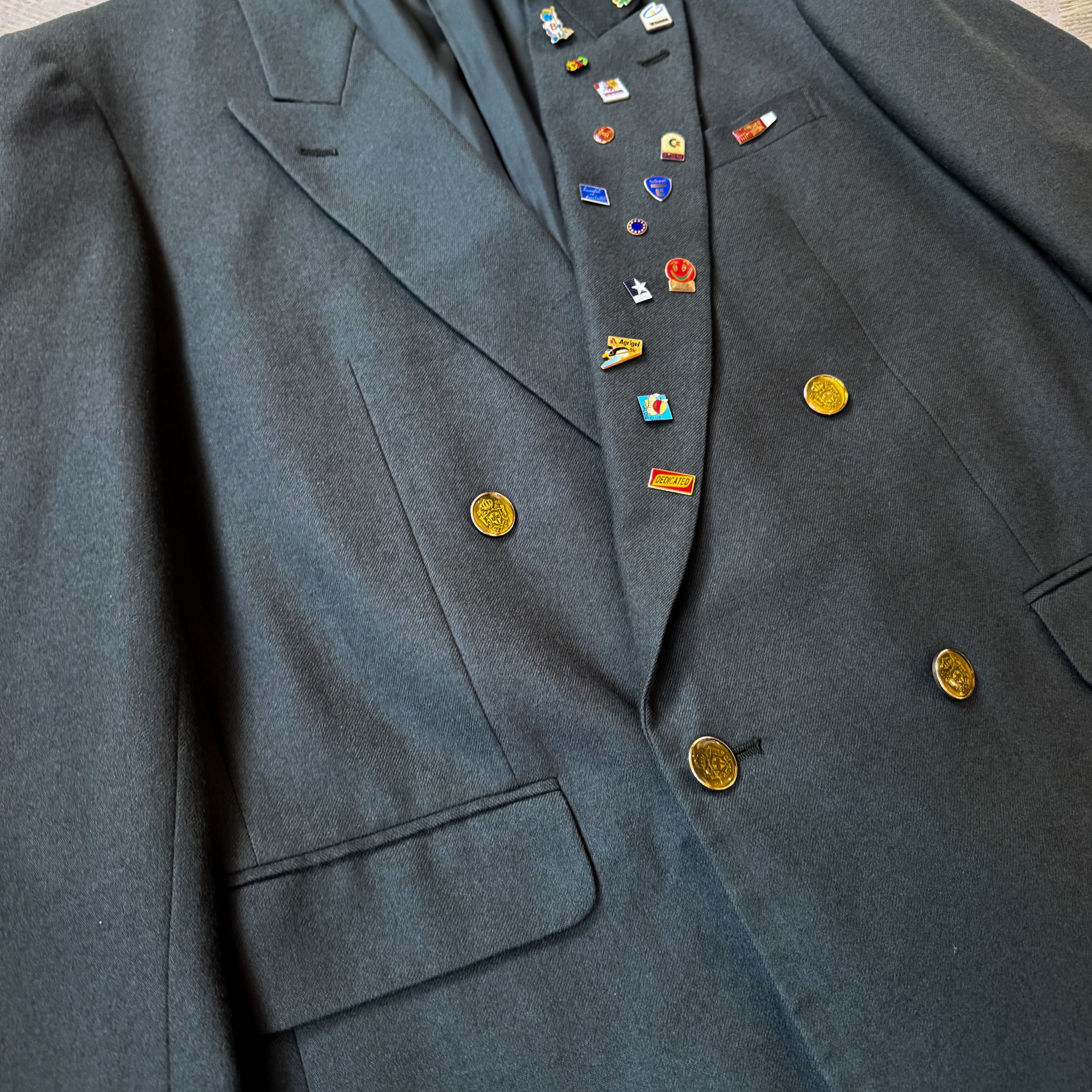 ゴールドボタンの重厚感とカスタムピンズの遊び心が融合した唯一無二の1枚。