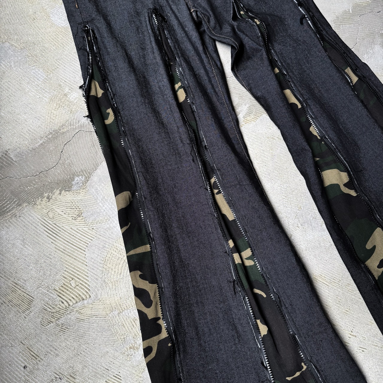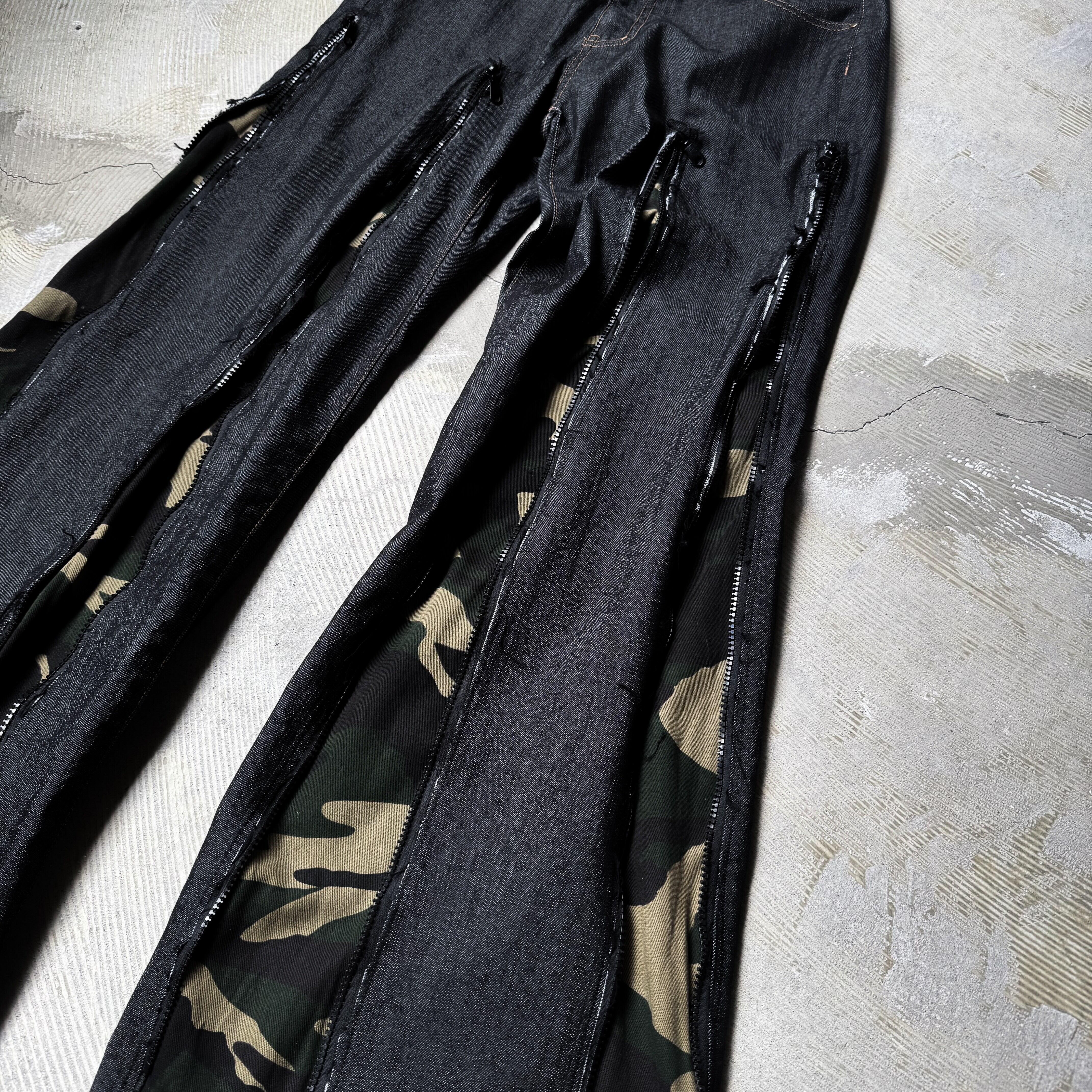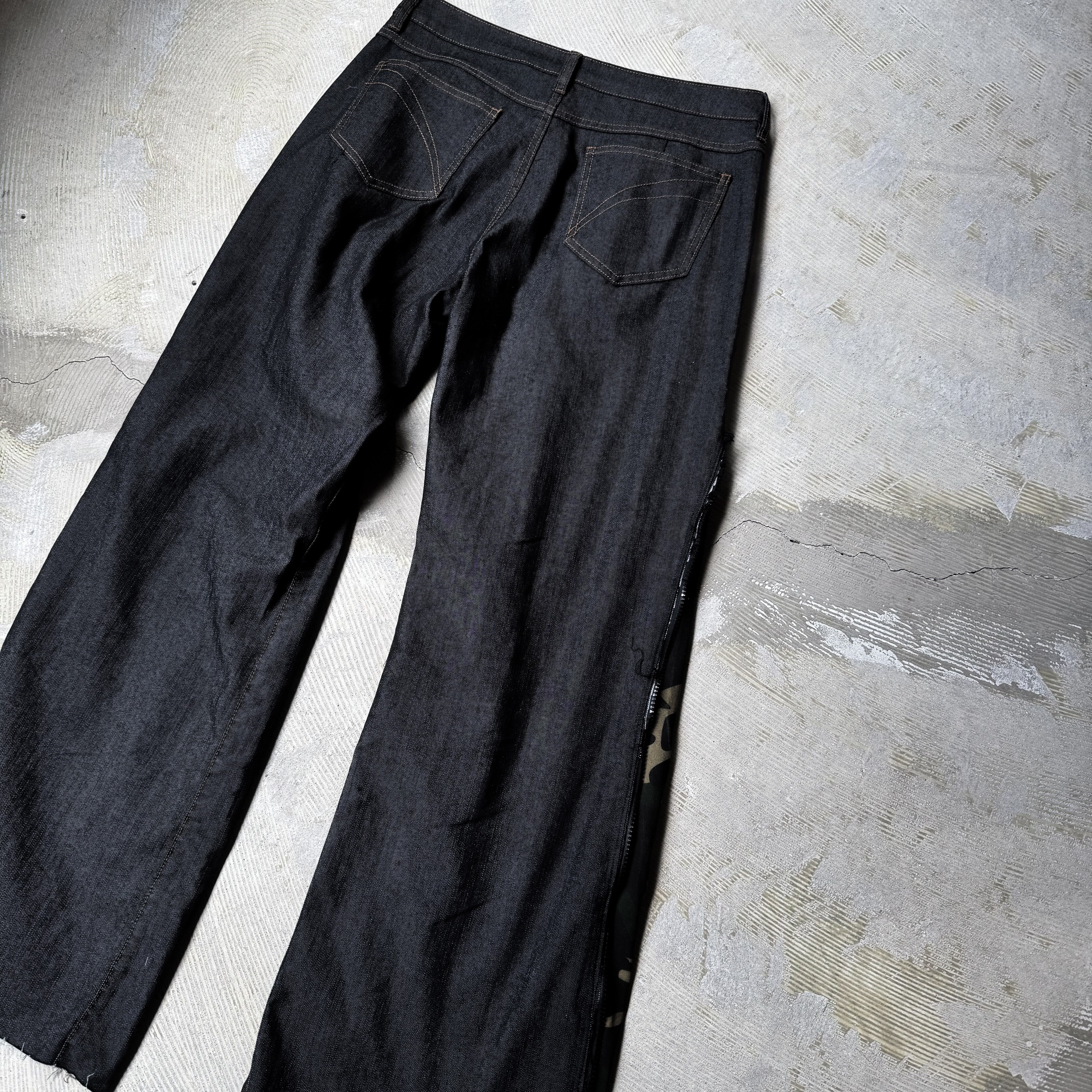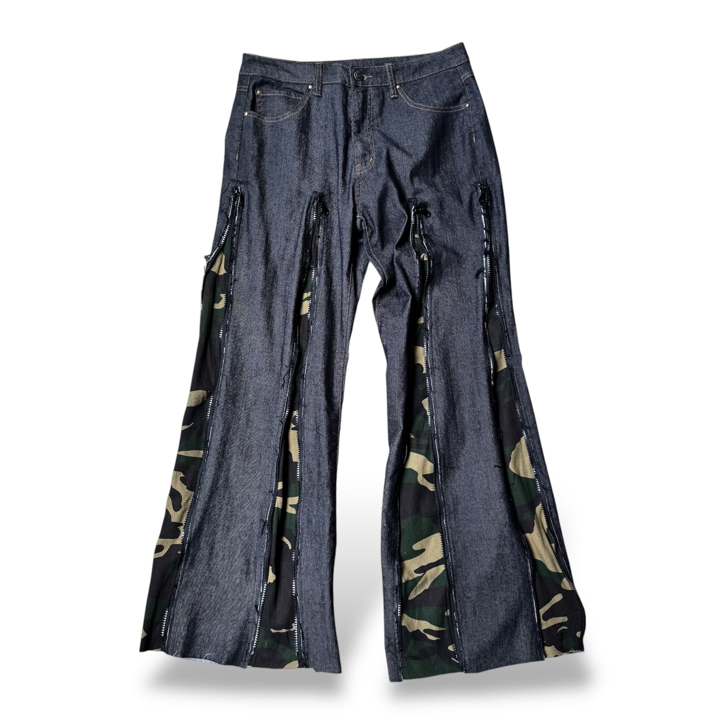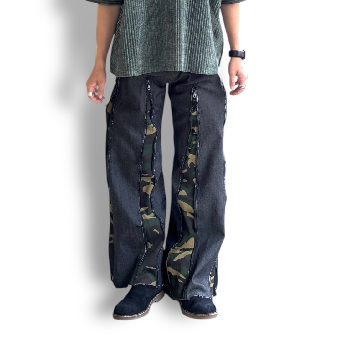 REBUILD FLARE SILHOUETTE CAMOUFLAGE LINE DENIM PANTS / ワイド フレア カモフラ 柄 ライン デニム パンツ ハンド メイド リメイク