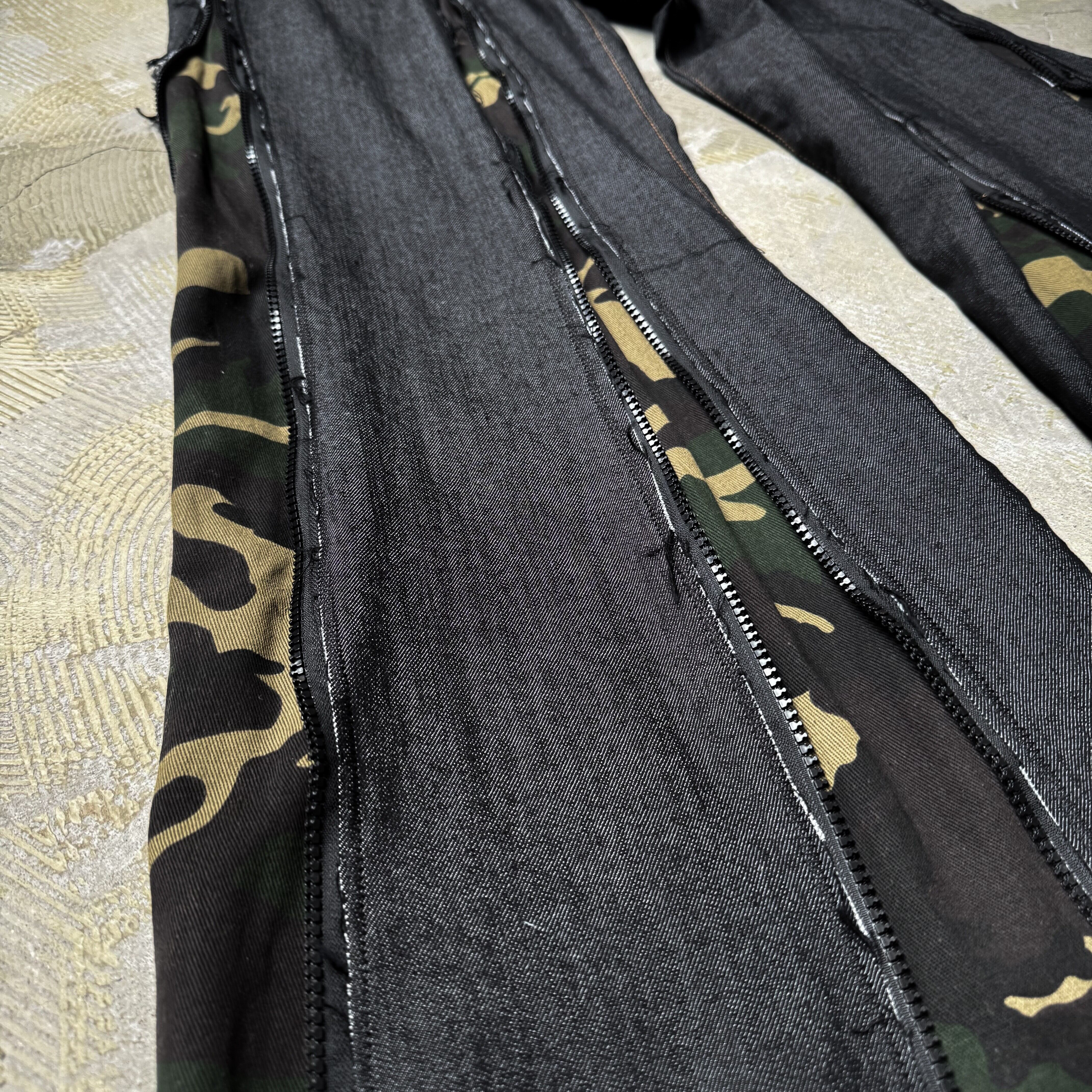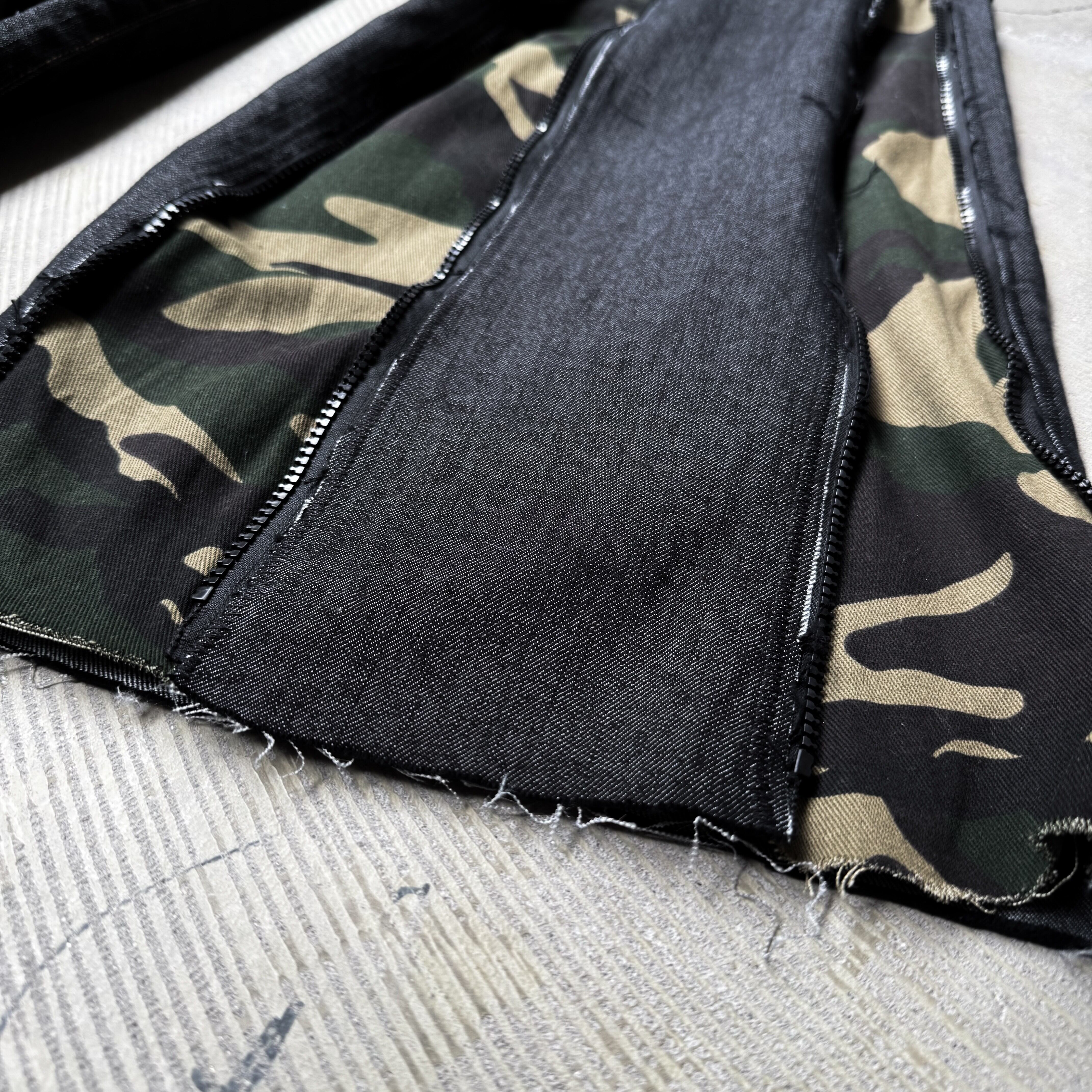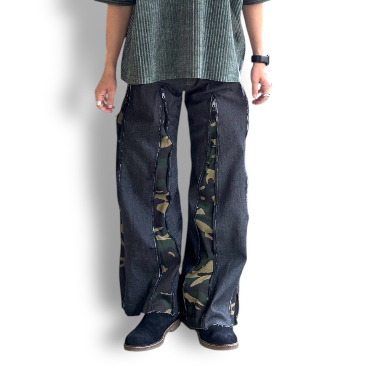・インディゴデニムの硬質なベースに、ミリタリーカモ柄を大胆に挿し込んだ