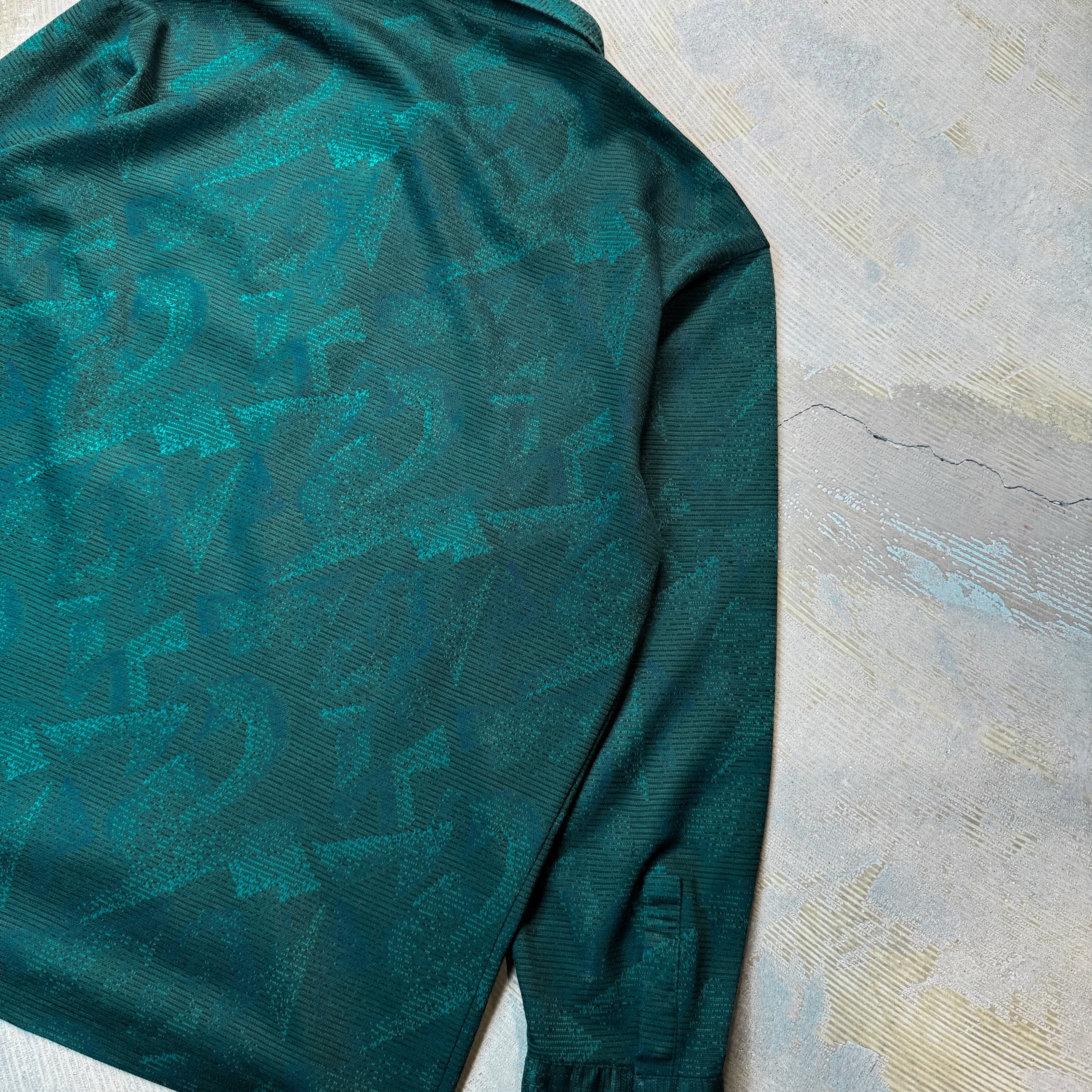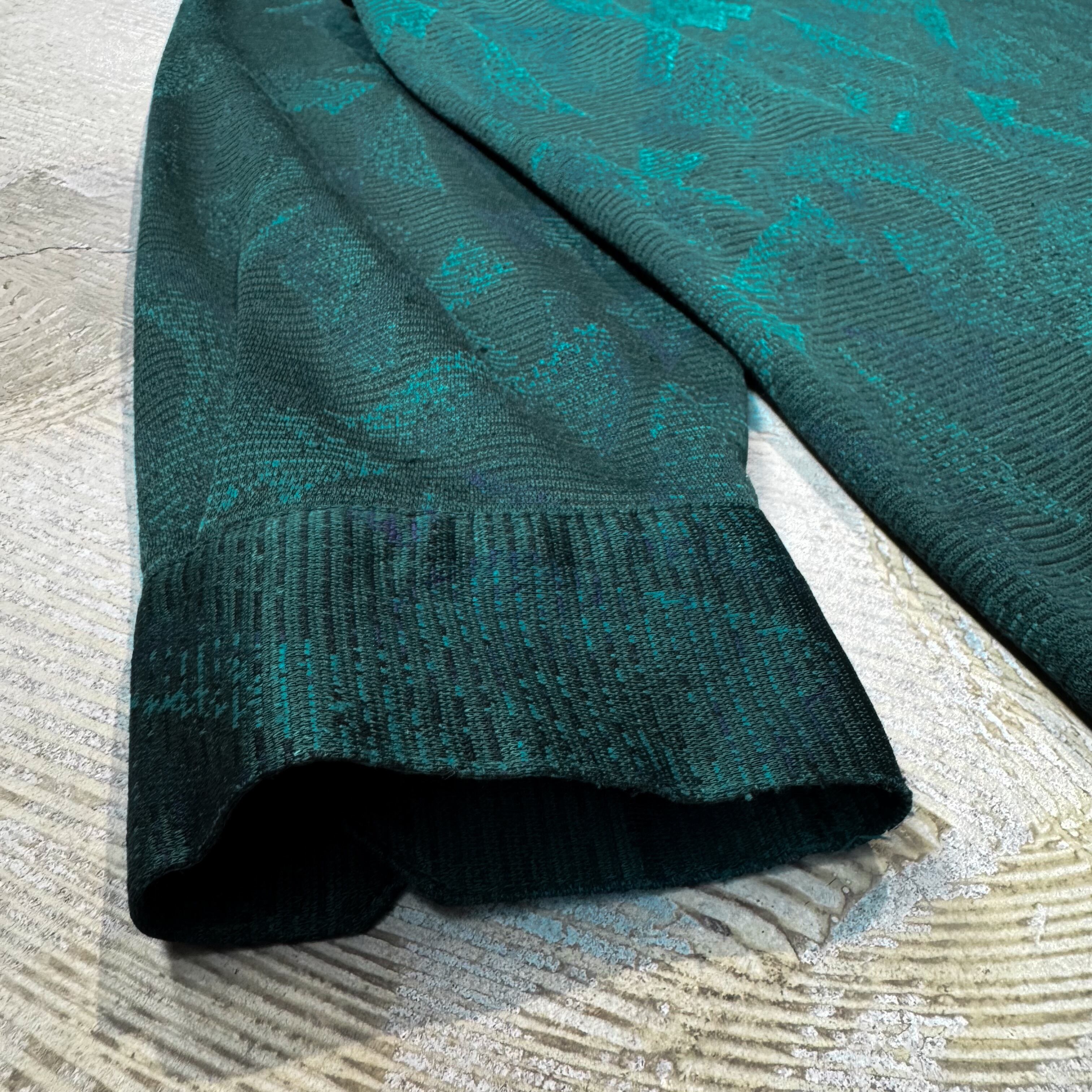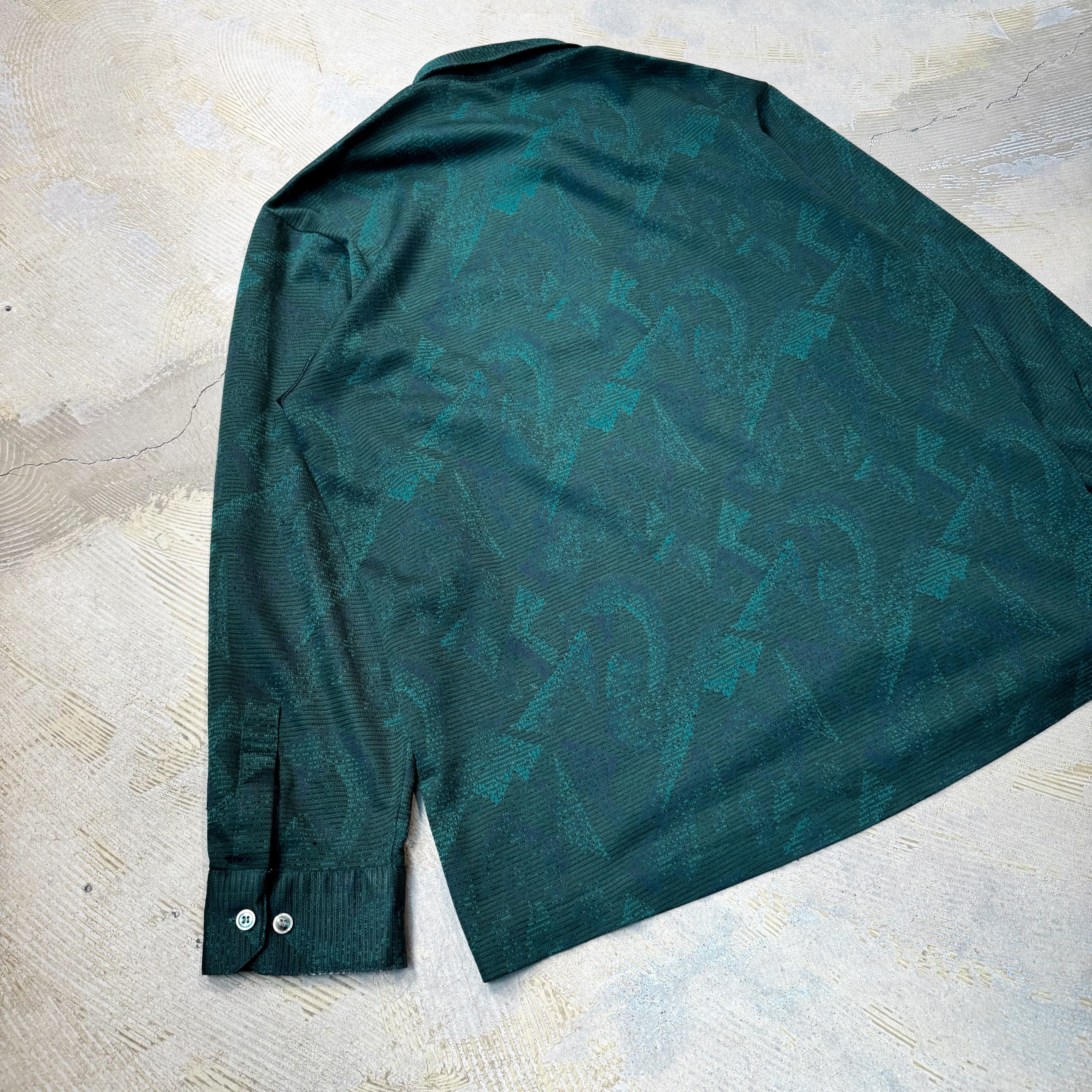 ・深みのあるグリーンに幾何学的な抽象柄が浮かぶ