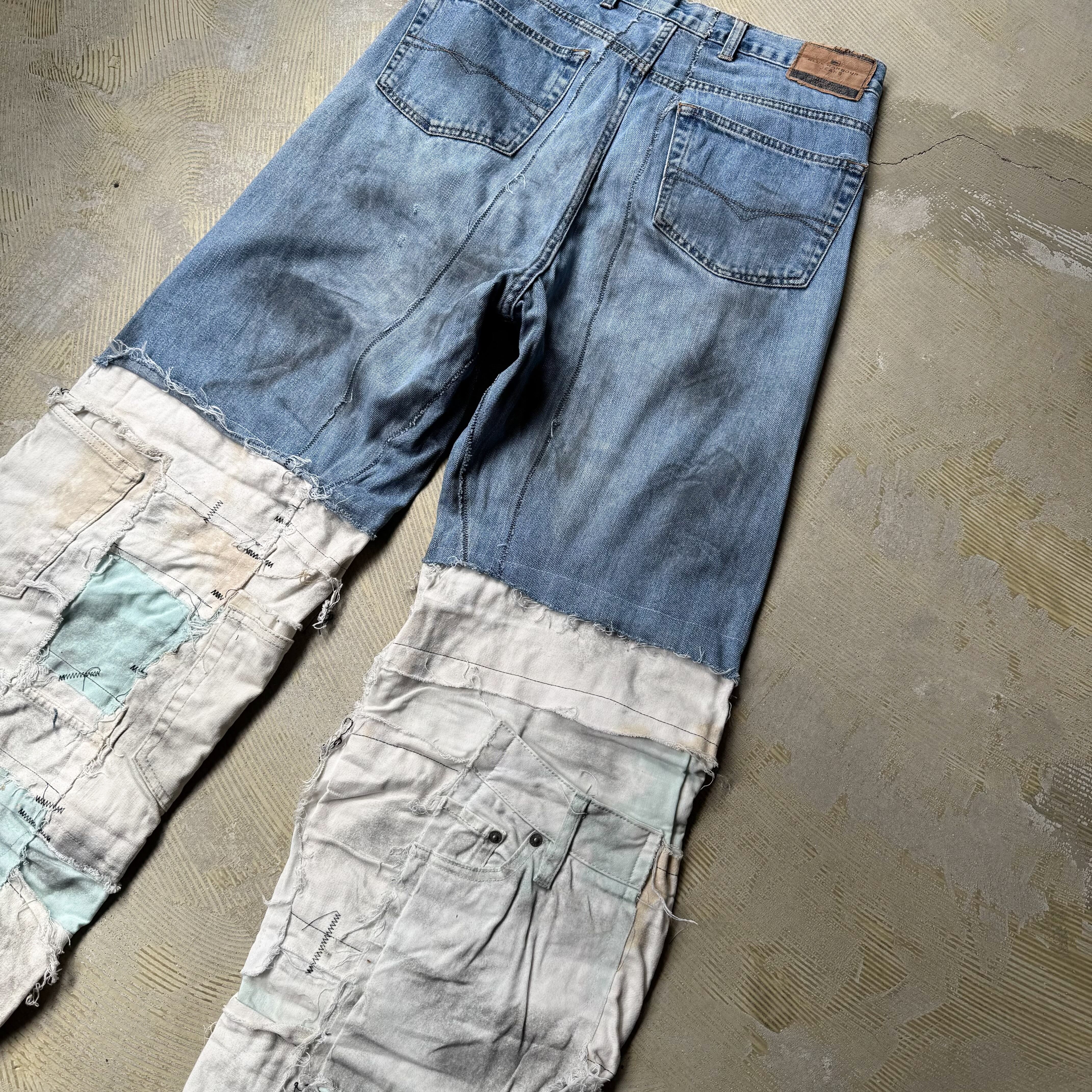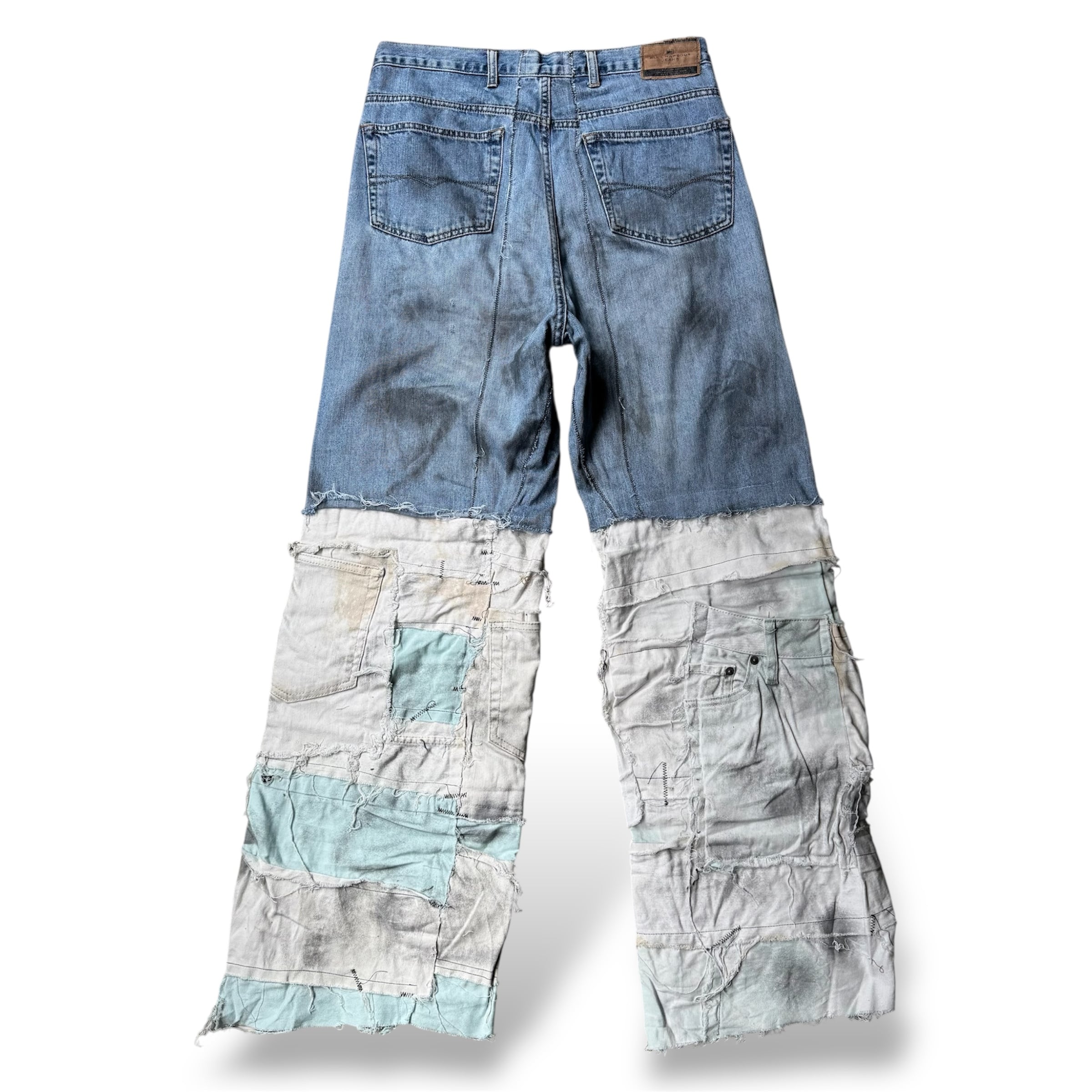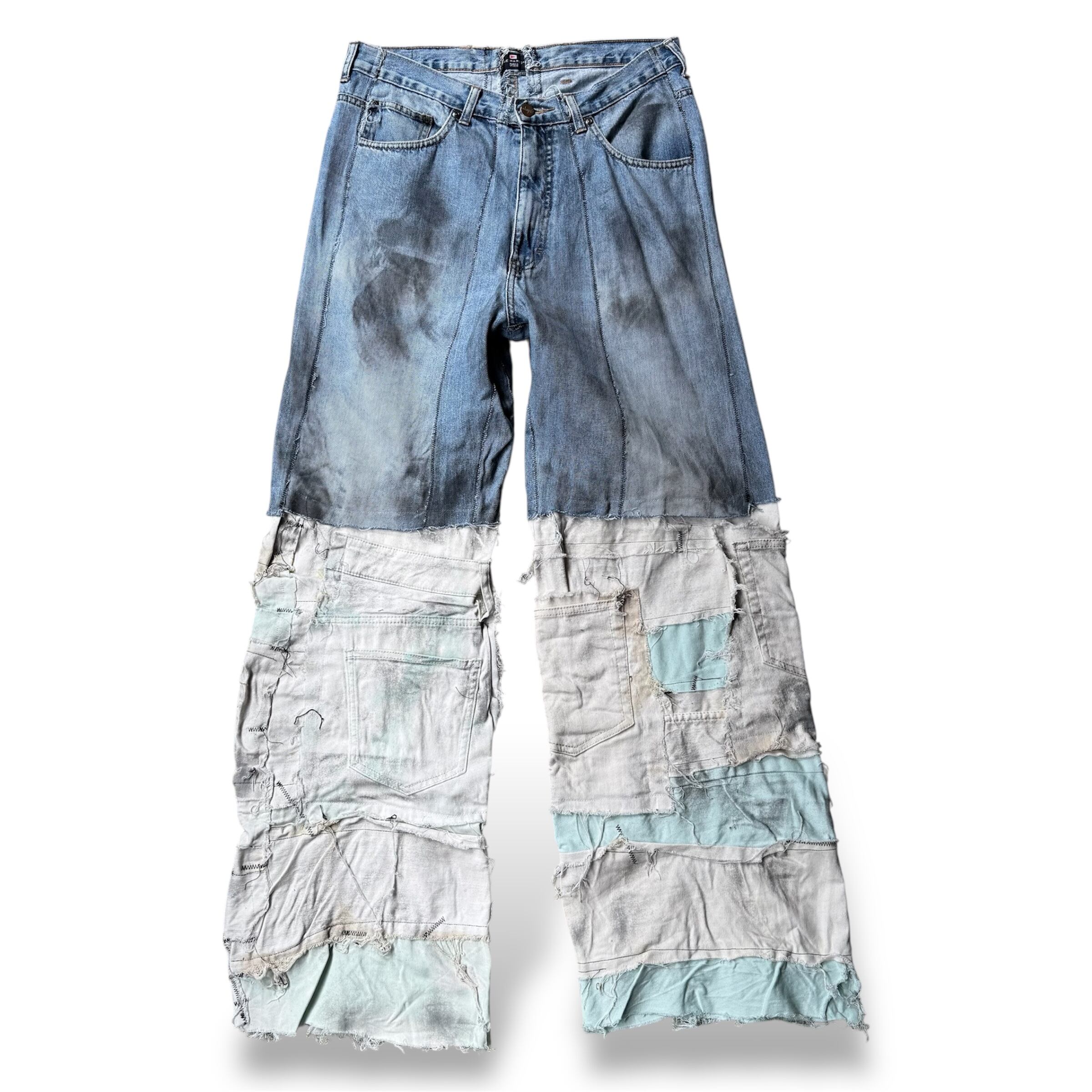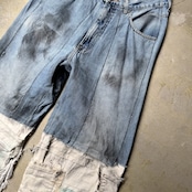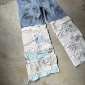 REBUILD WIDE SILHOUETTE PATCHWORK LAYERED DENIM PANTS / ワイド バギー パッチワーク 柄 デニム パンツ ハンド メイド リメイク