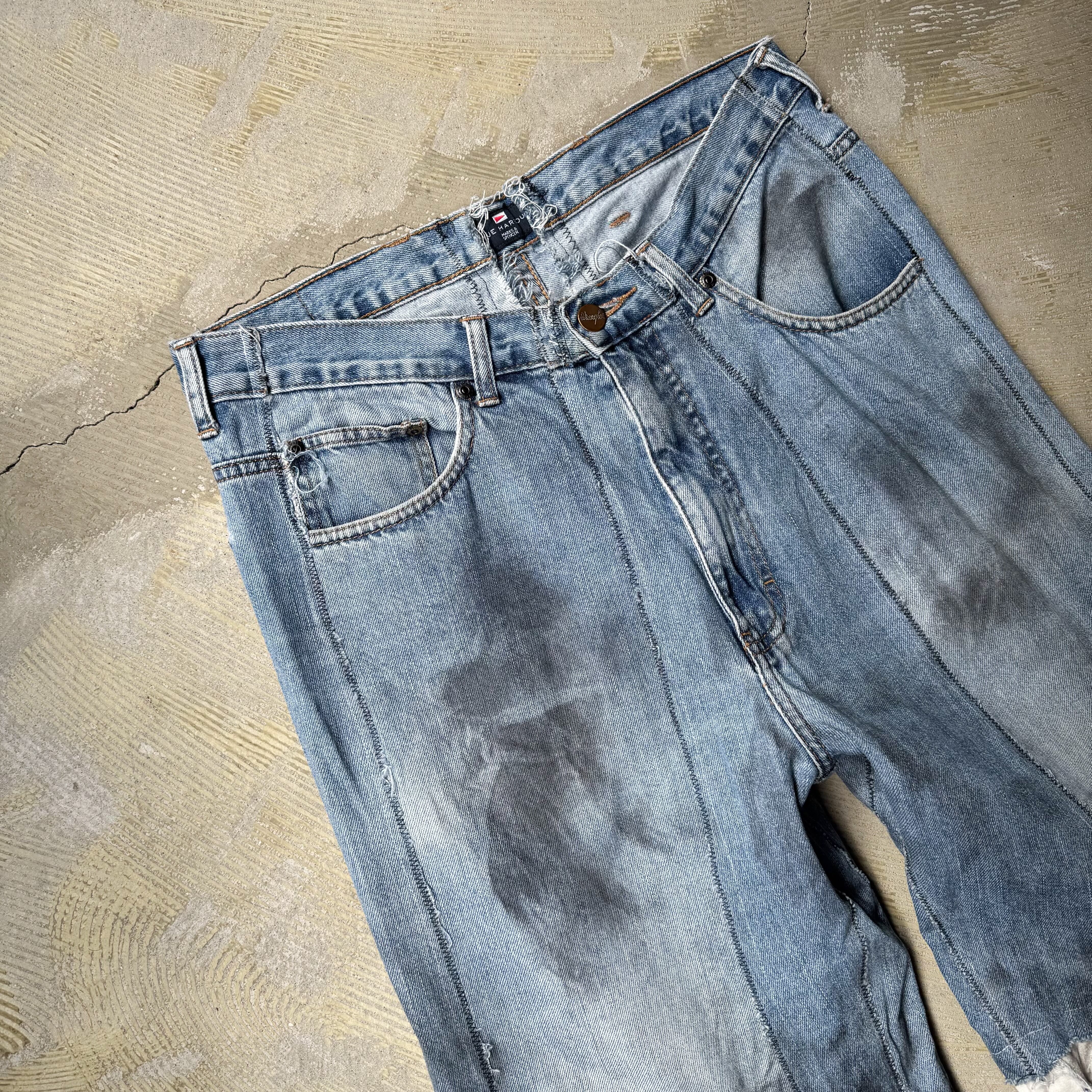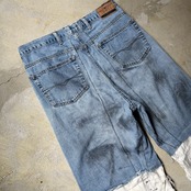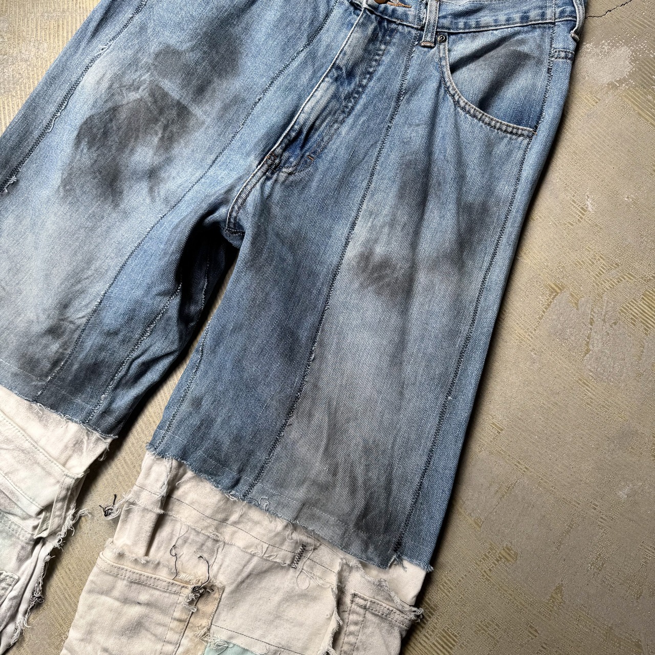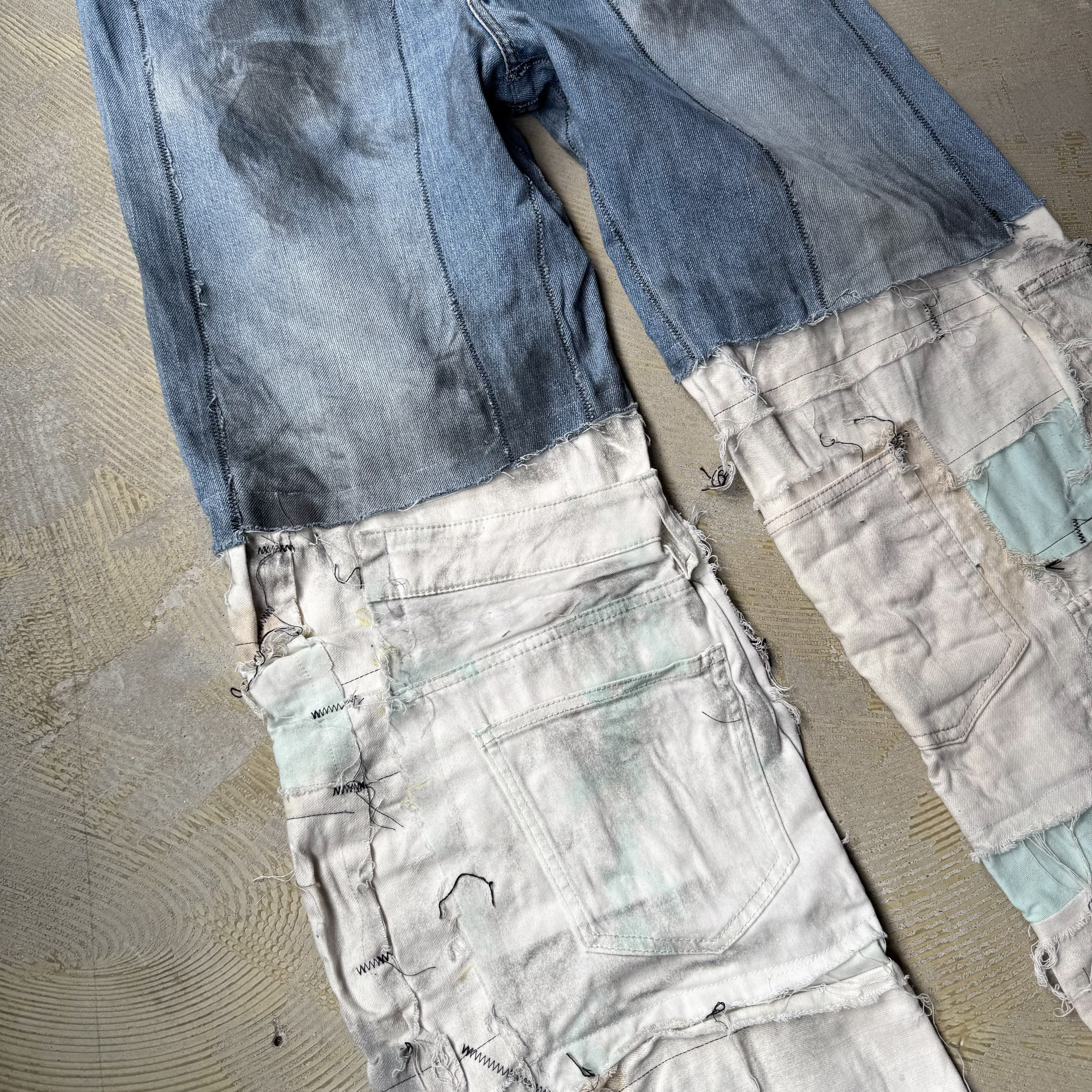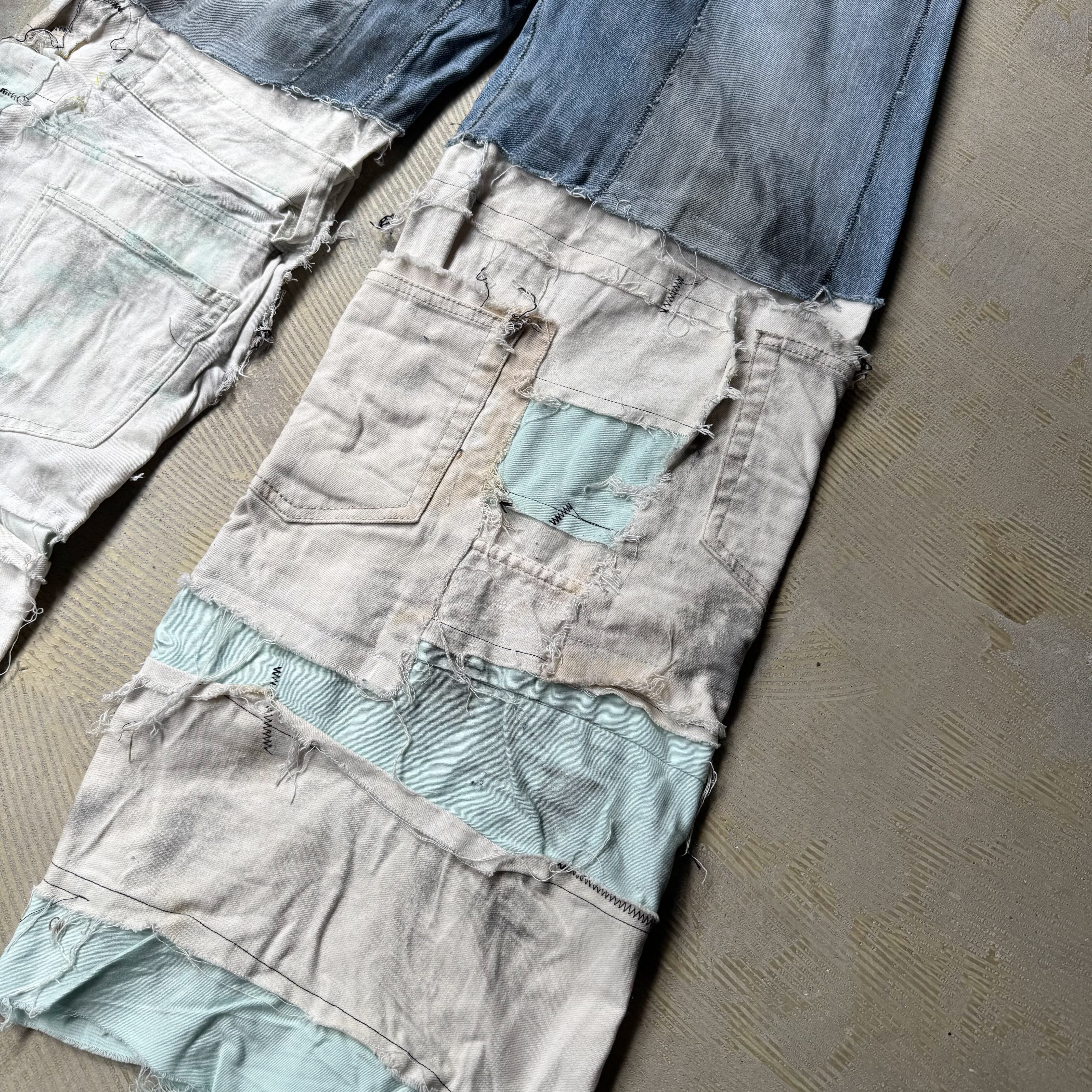REBUILD WIDE SILHOUETTE PATCHWORK LAYERED DENIM PANTS / ワイド バギー パッチワーク 柄 デニム パンツ ハンド メイド リメイク