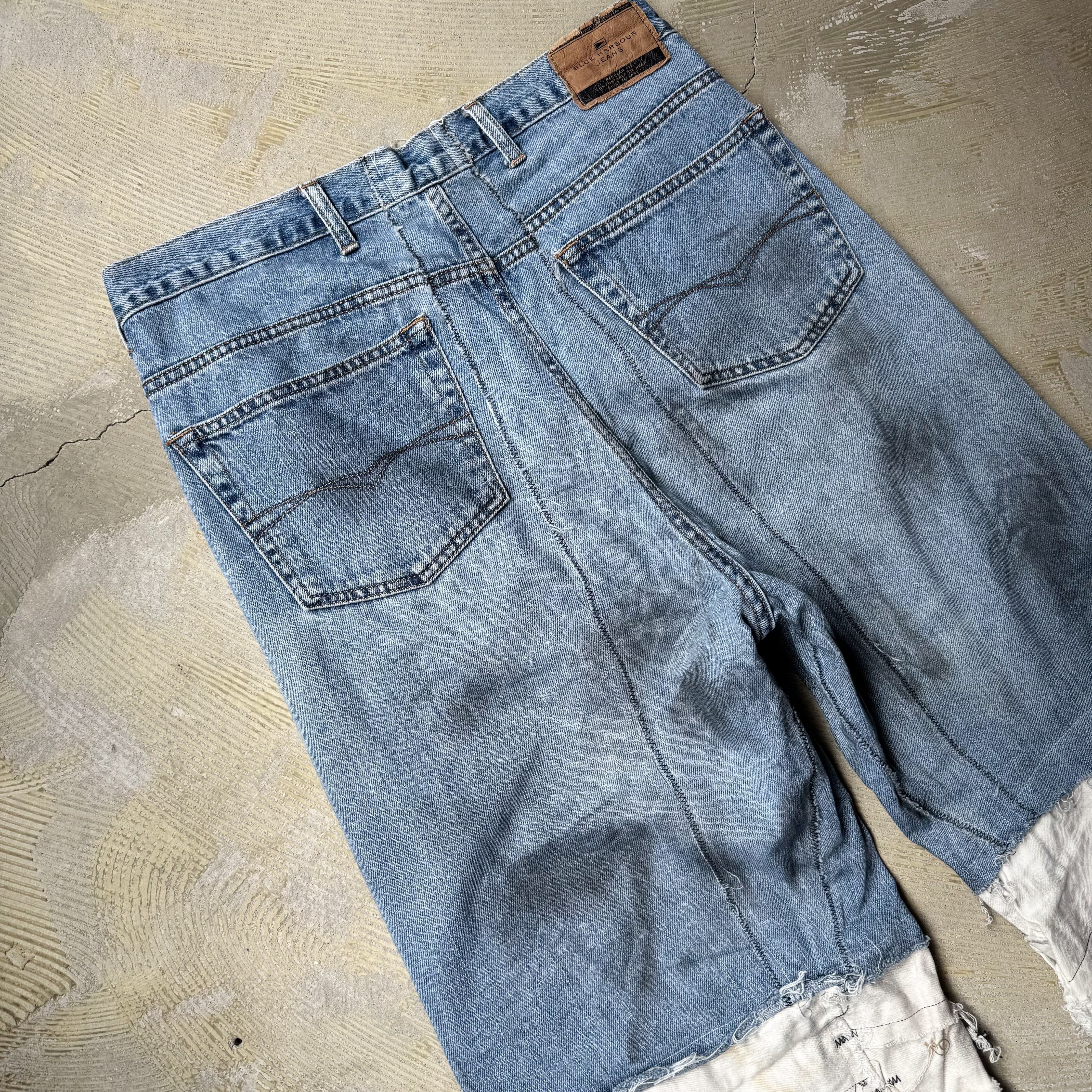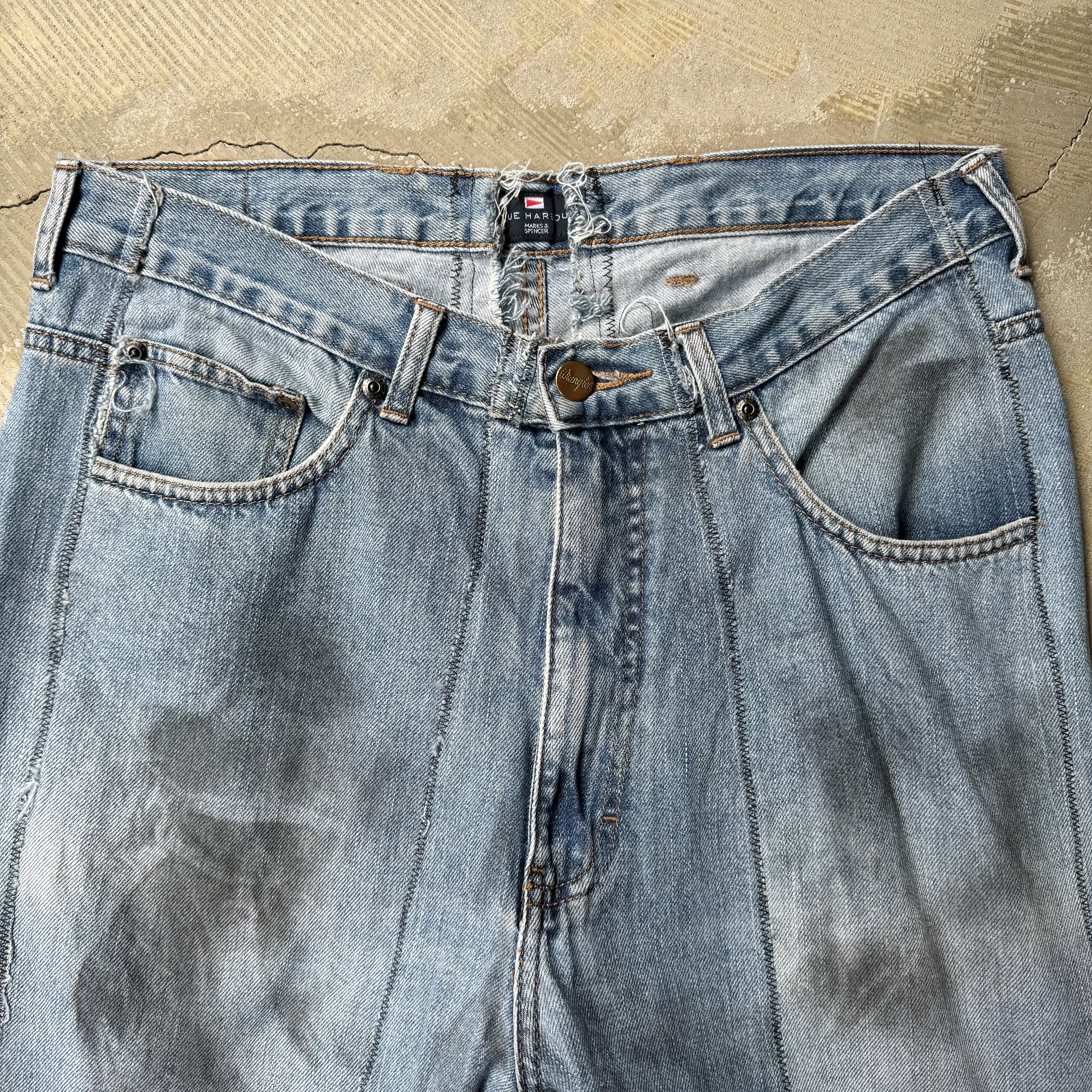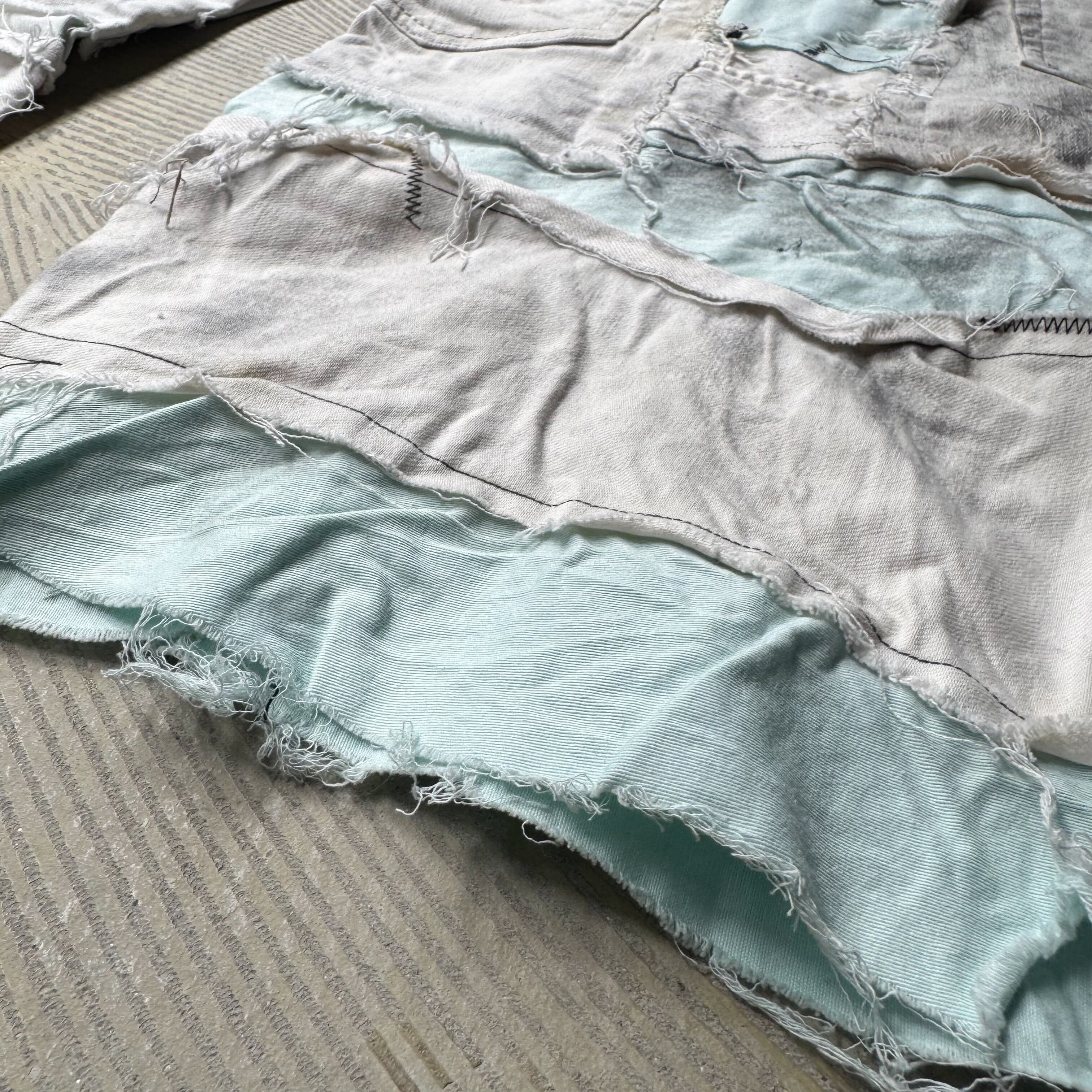 ・クラシックなブルーデニム、下部は複数の布地を荒々しく縫い合わせた