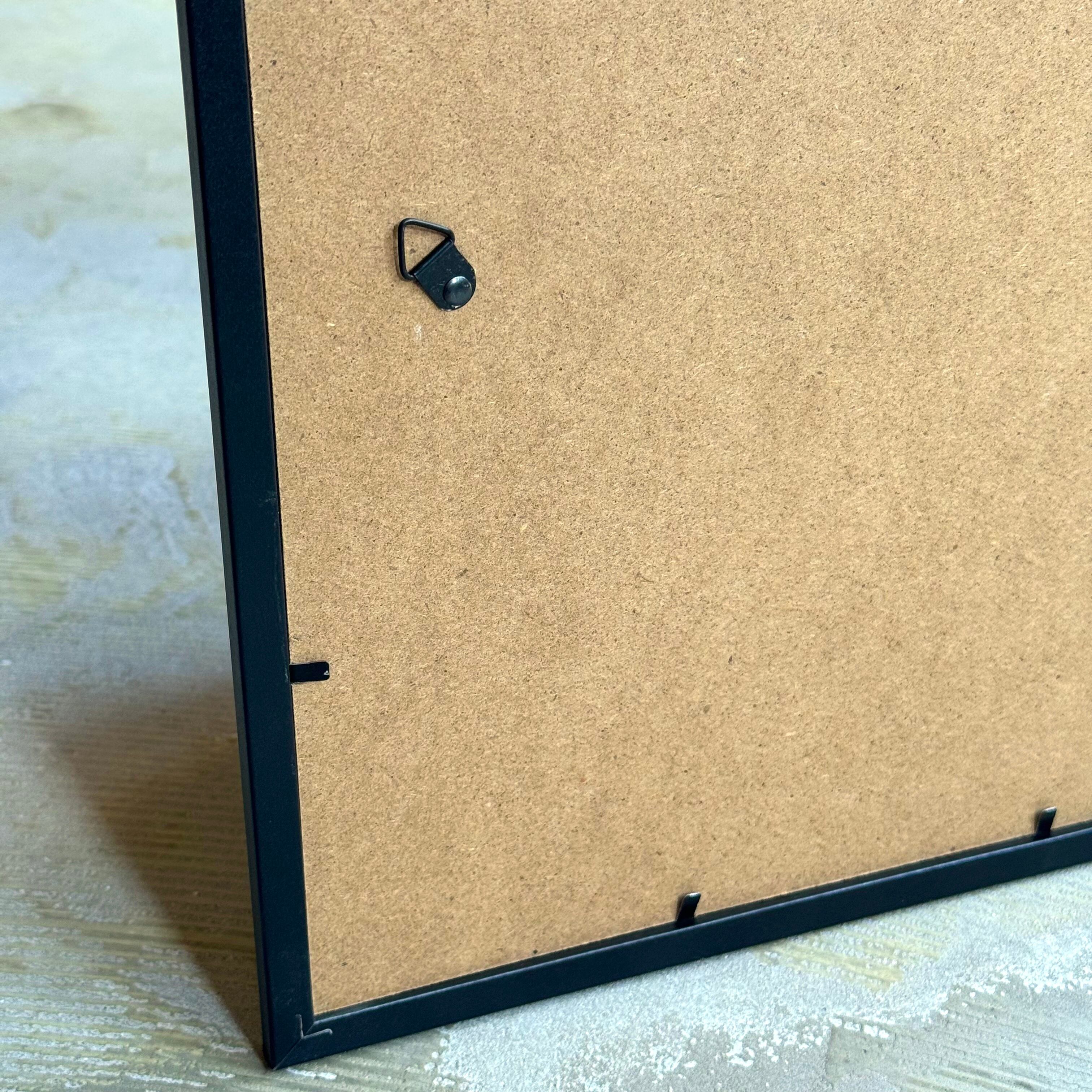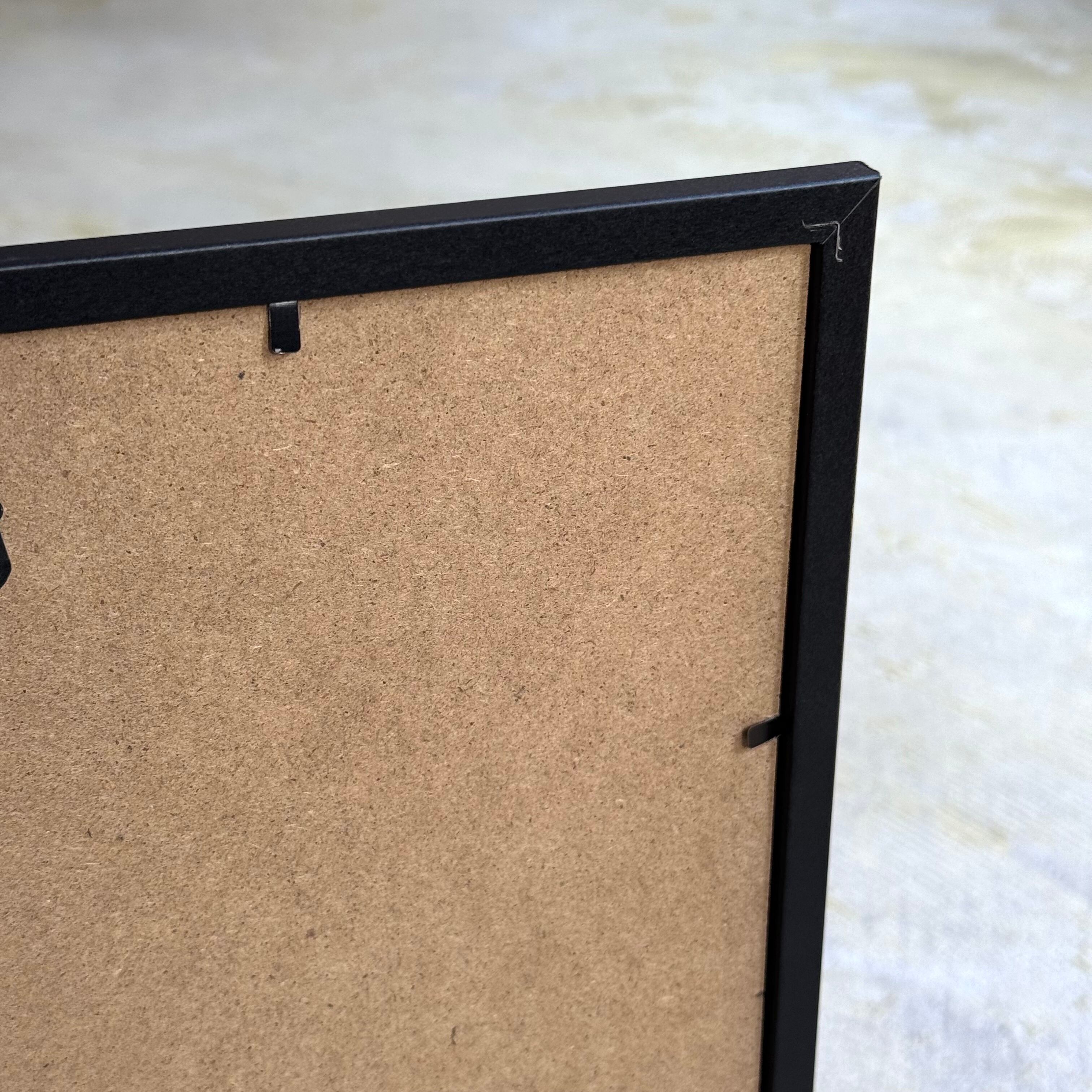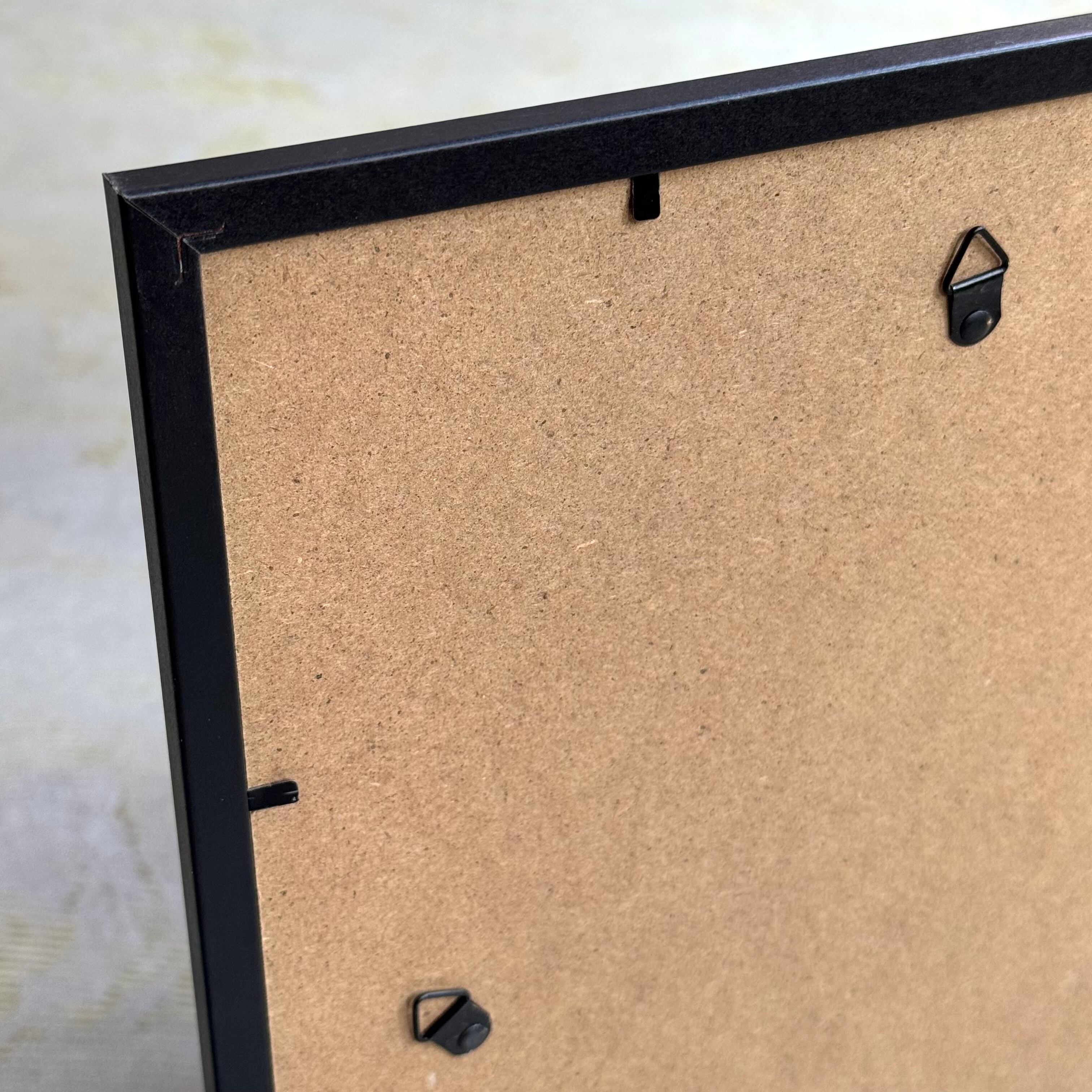 黒マットウッドフレームが、モノクロの印刷物に静けさと重厚感を与え、空間に“語れる余白”を生み出す。