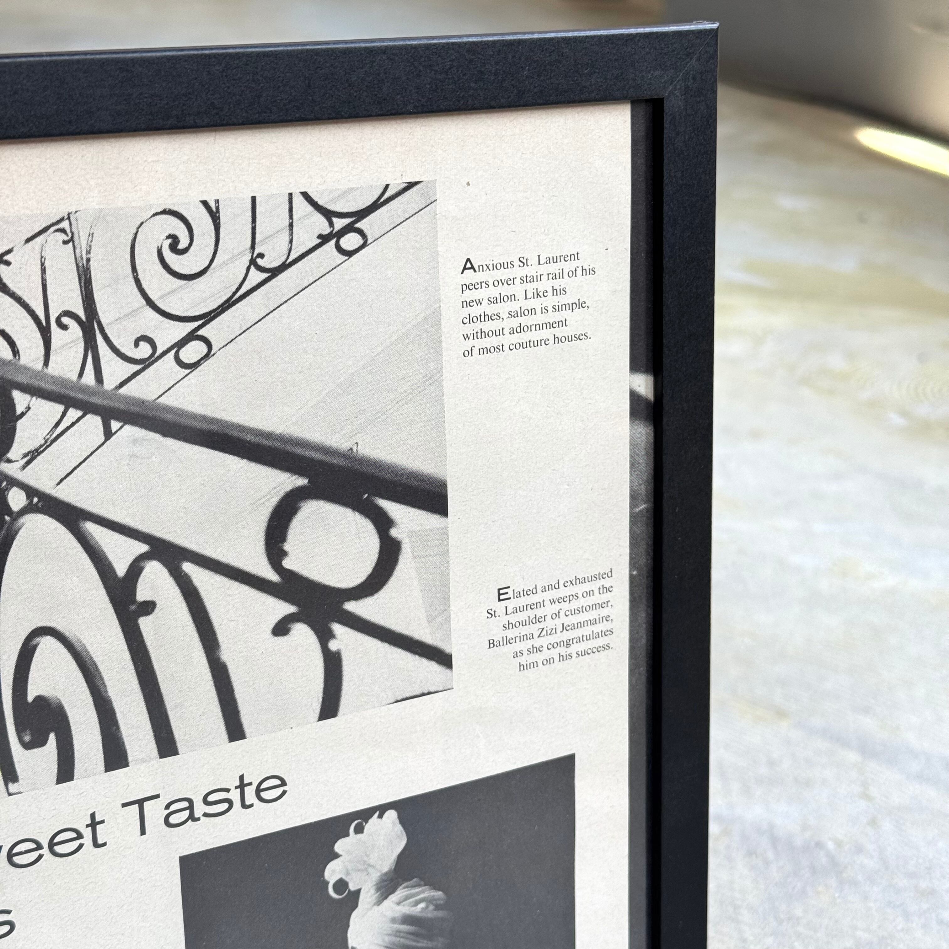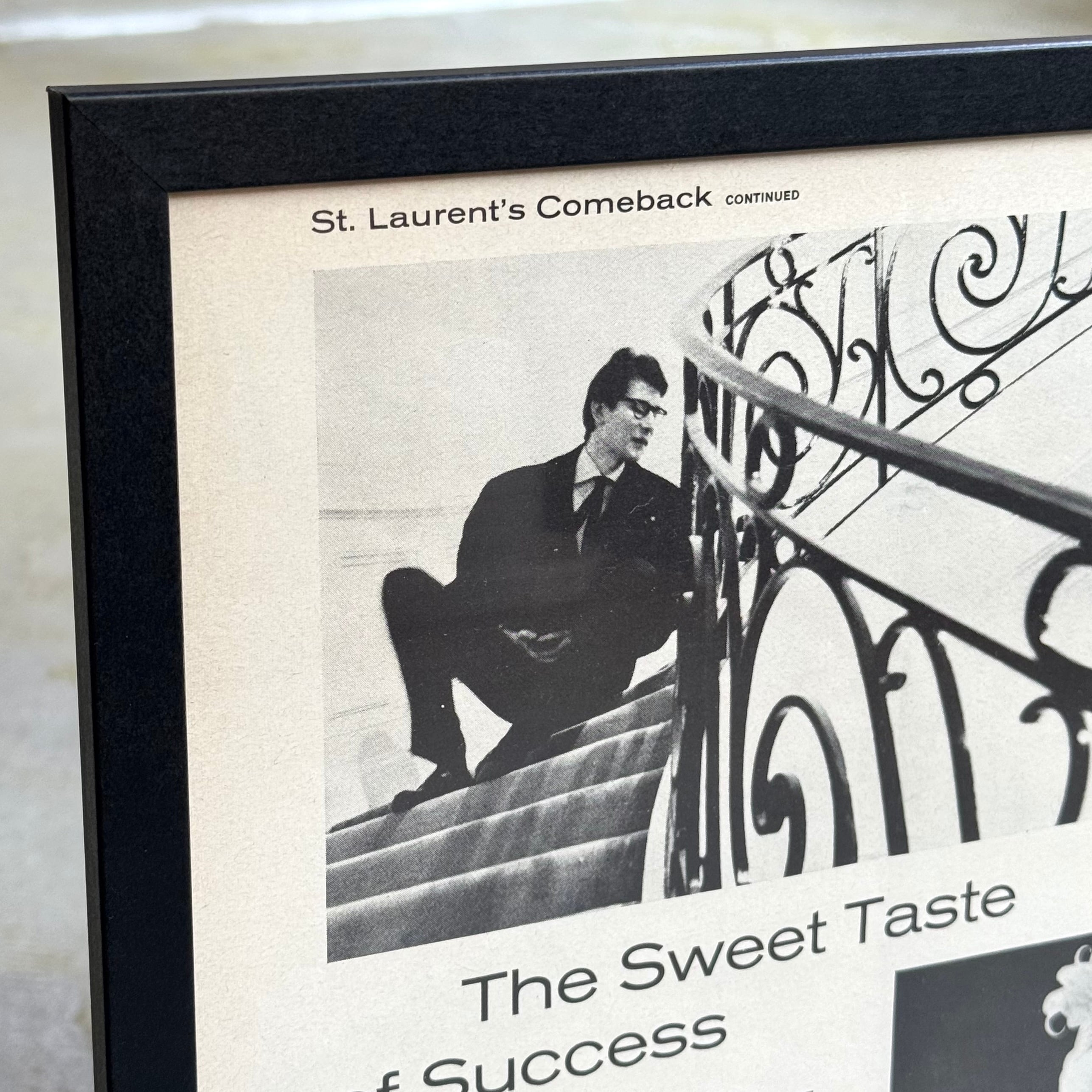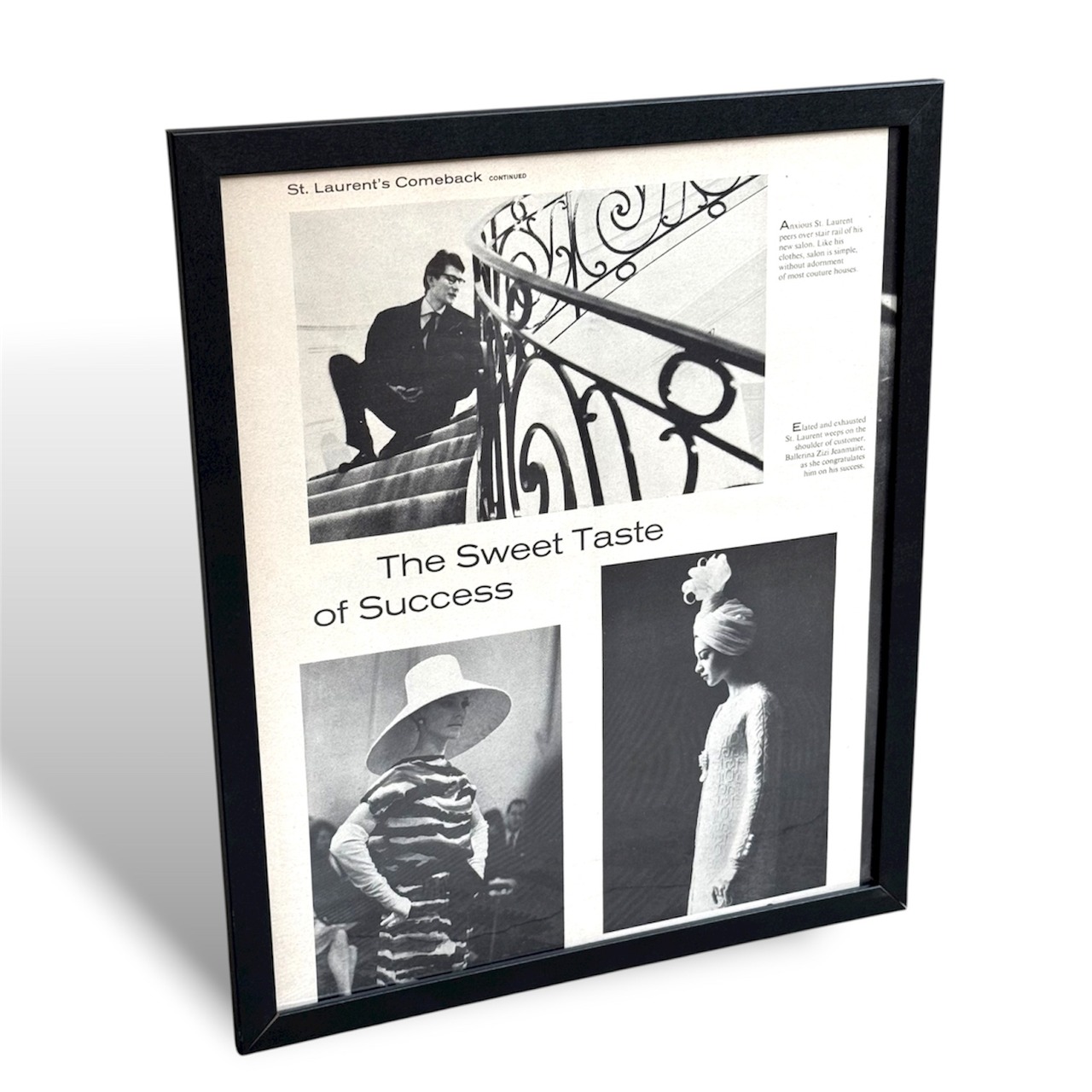 1960年代に掲載されたイヴ・サンローランの復活を讃えるファッション誌の一頁を額装したアートピース。