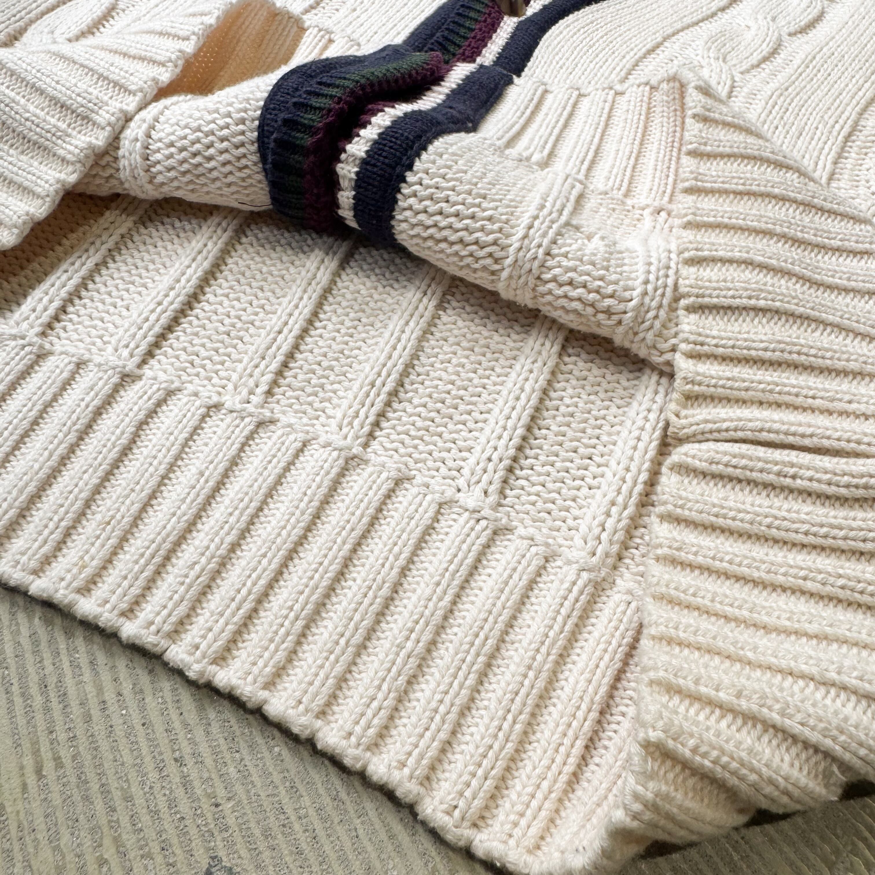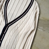 ・深めのVネックとケーブル編みが、クラシックなスクールカーディガンの構造美を思わせつつ