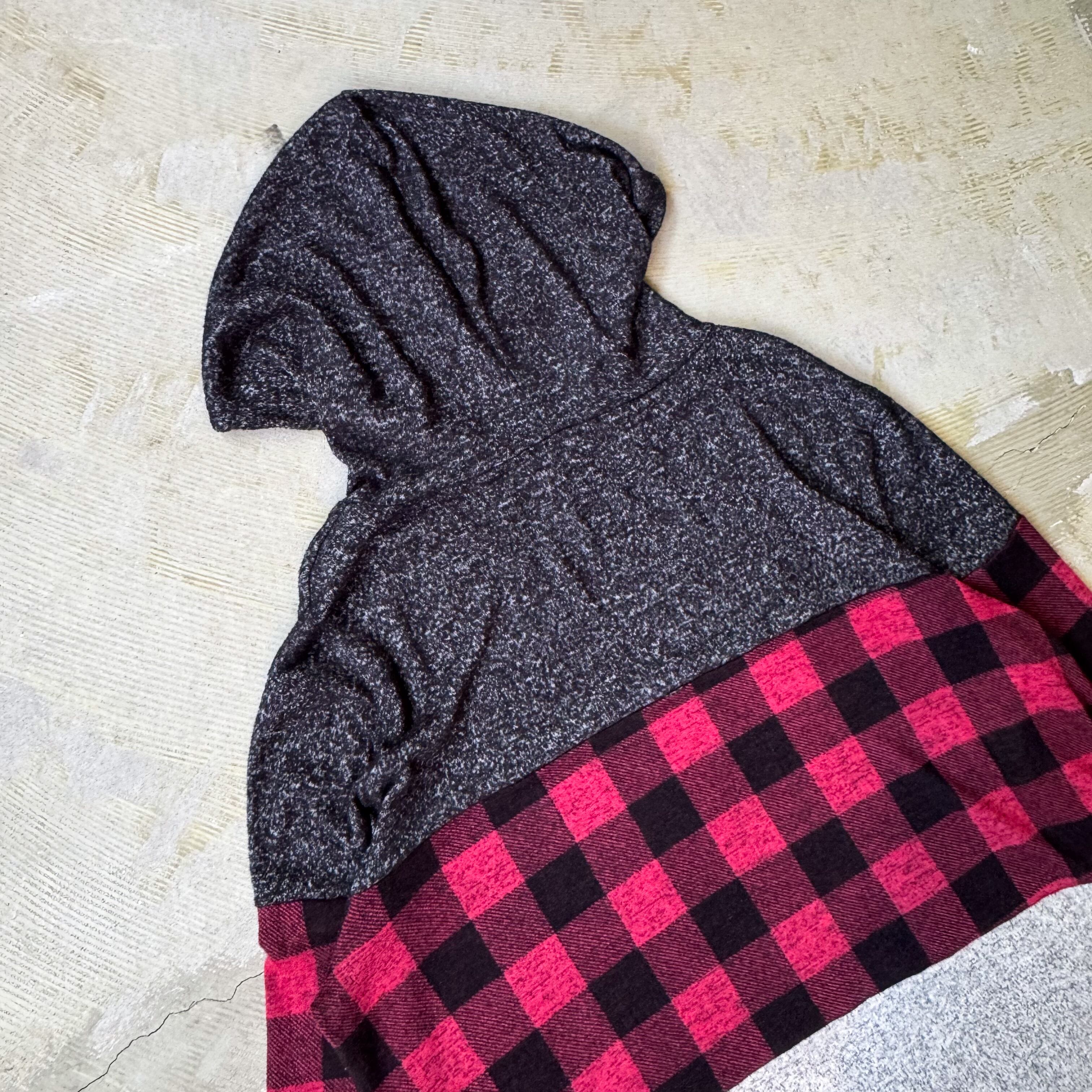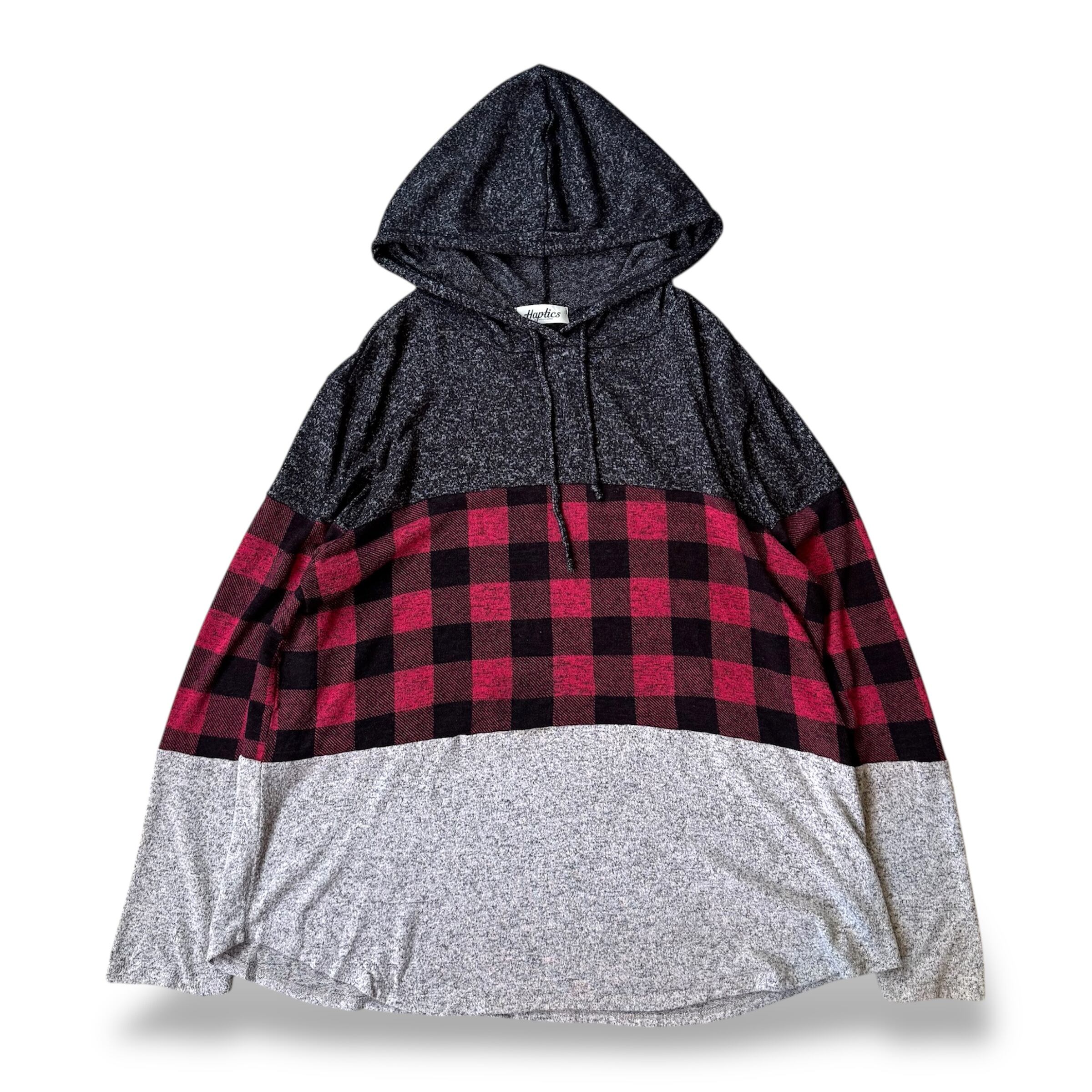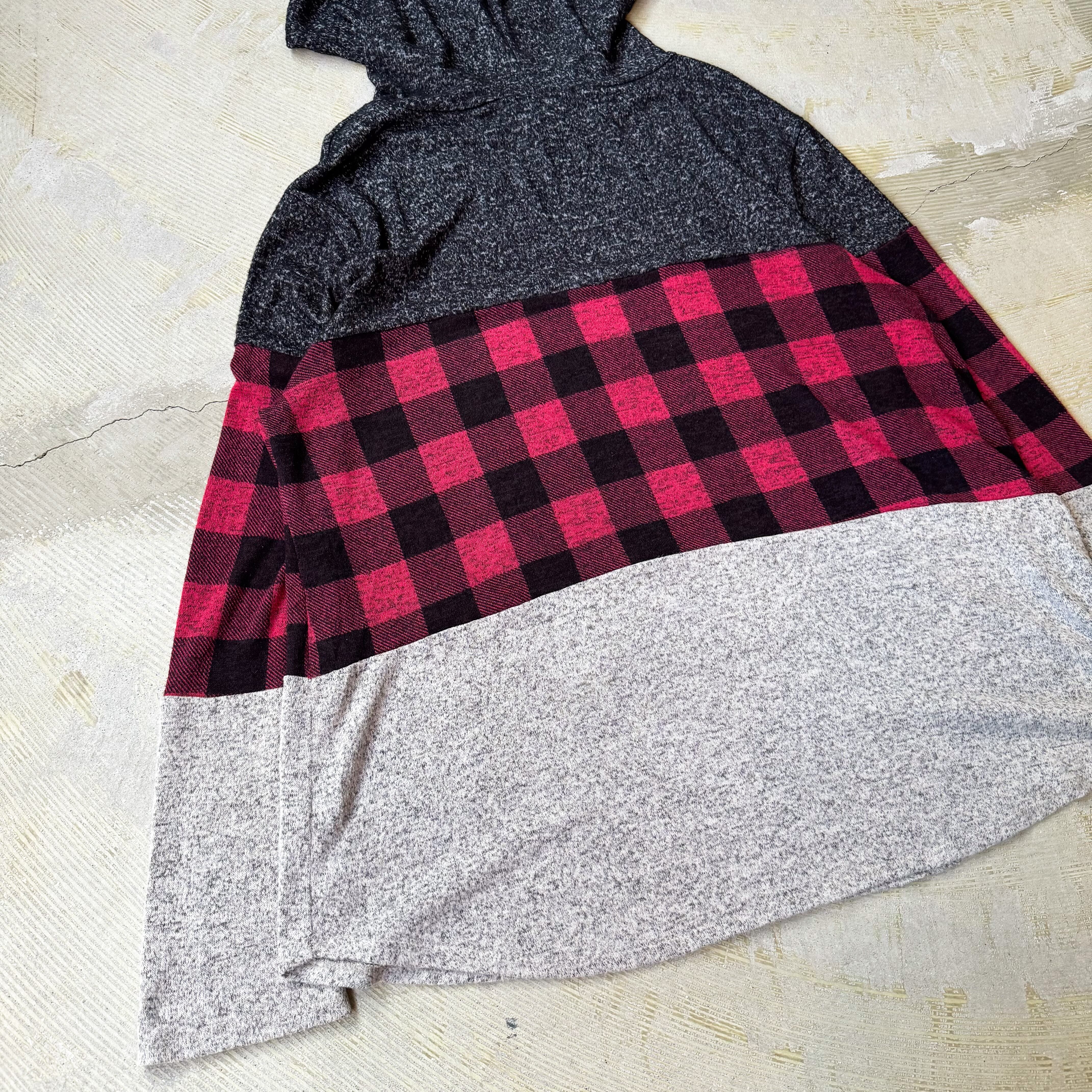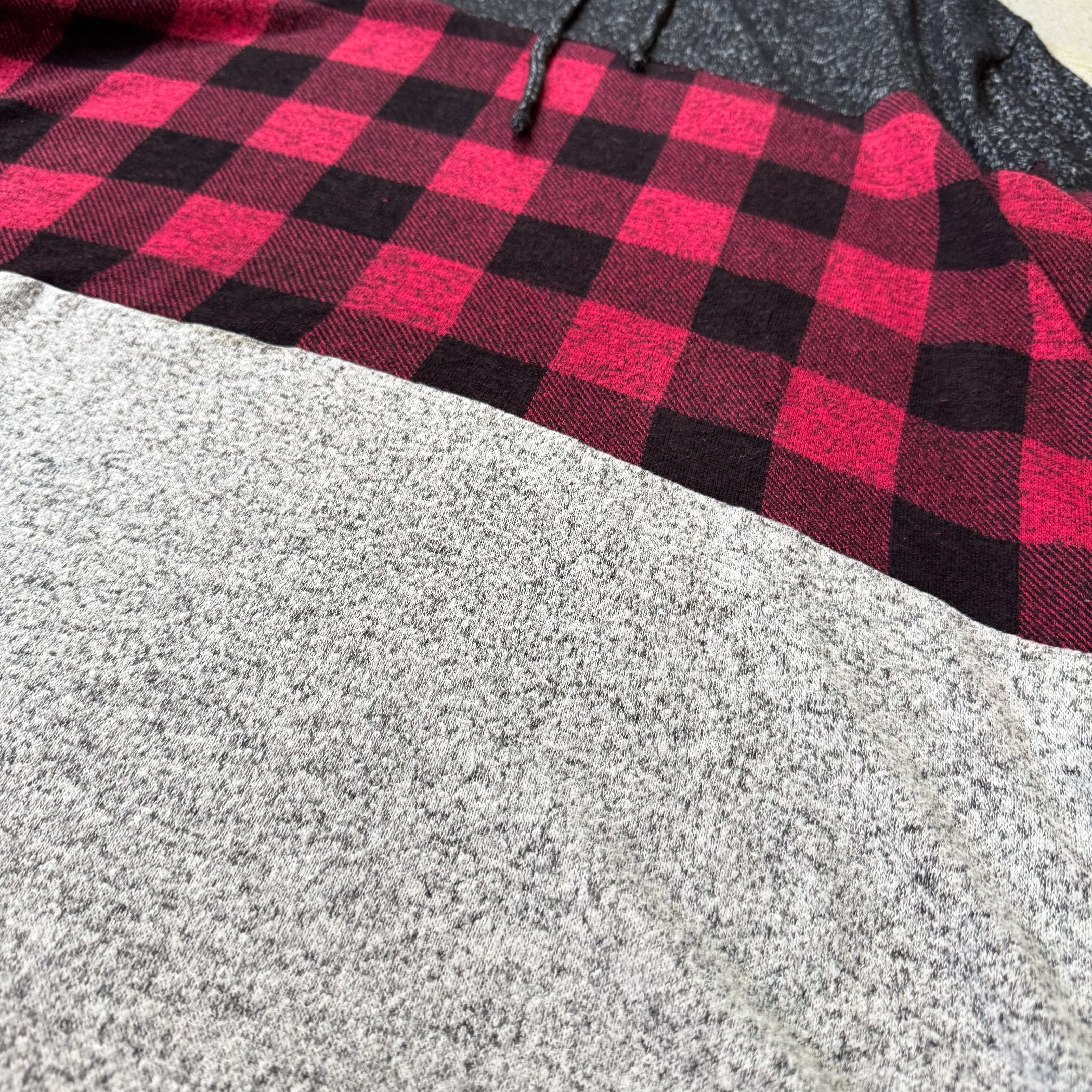 ・ダークグレーのフードと肩、レッド×ブラックのバッファローチェック、ライトグレーの裾部。