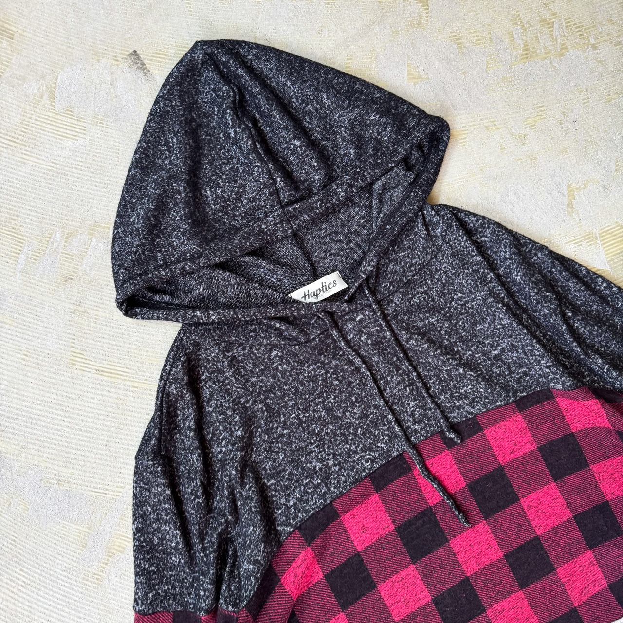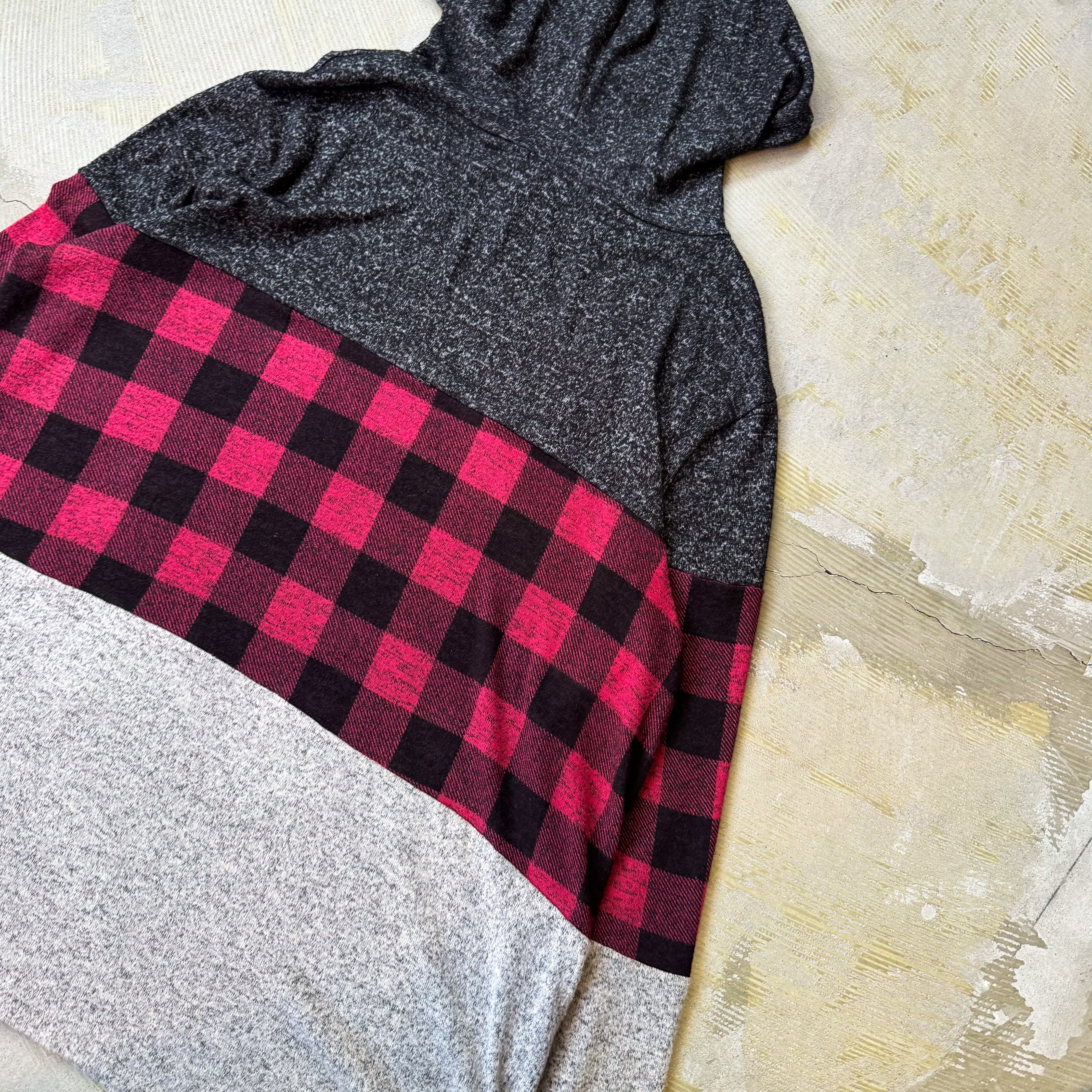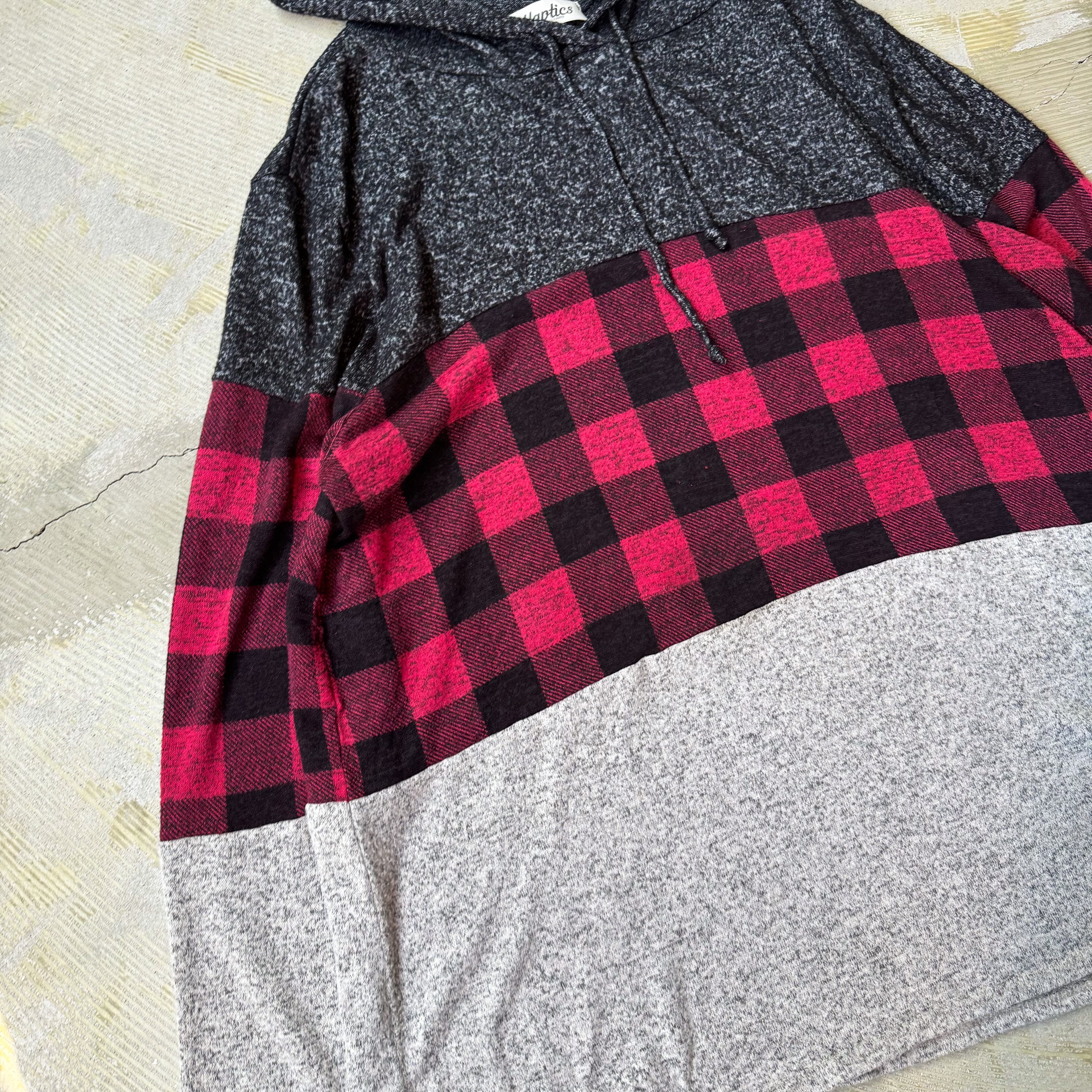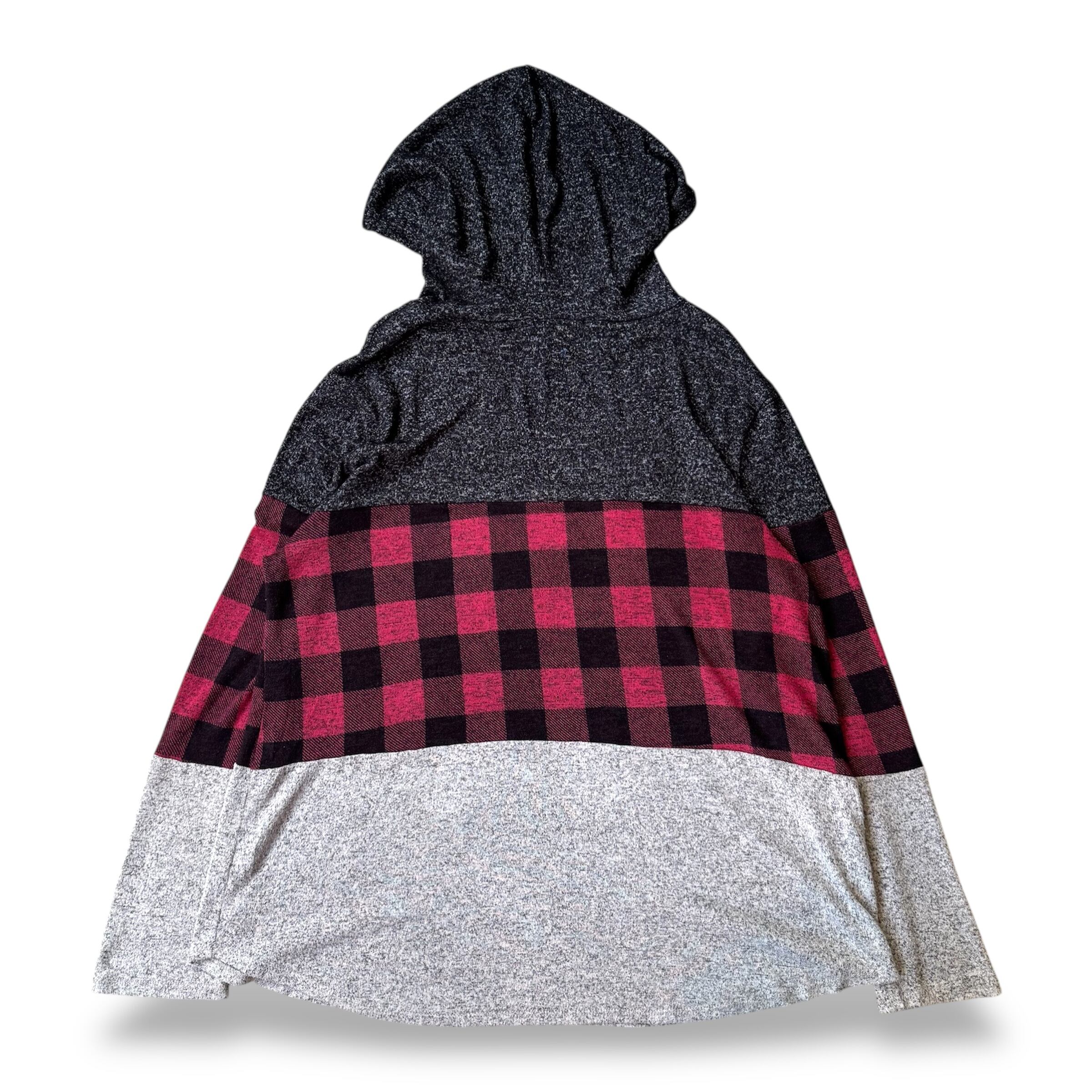 ・ダークグレーのフードと肩、レッド×ブラックのバッファローチェック、ライトグレーの裾部。