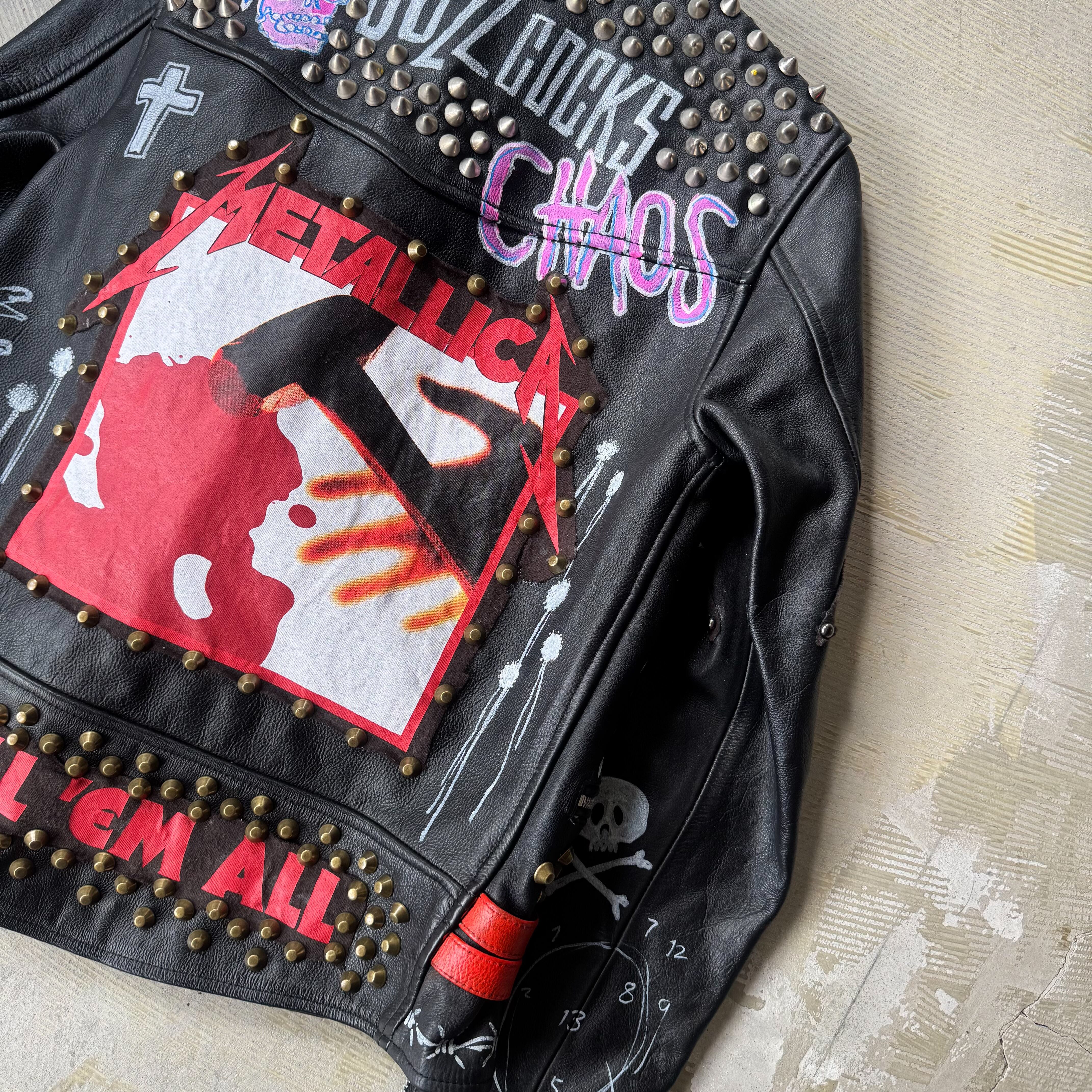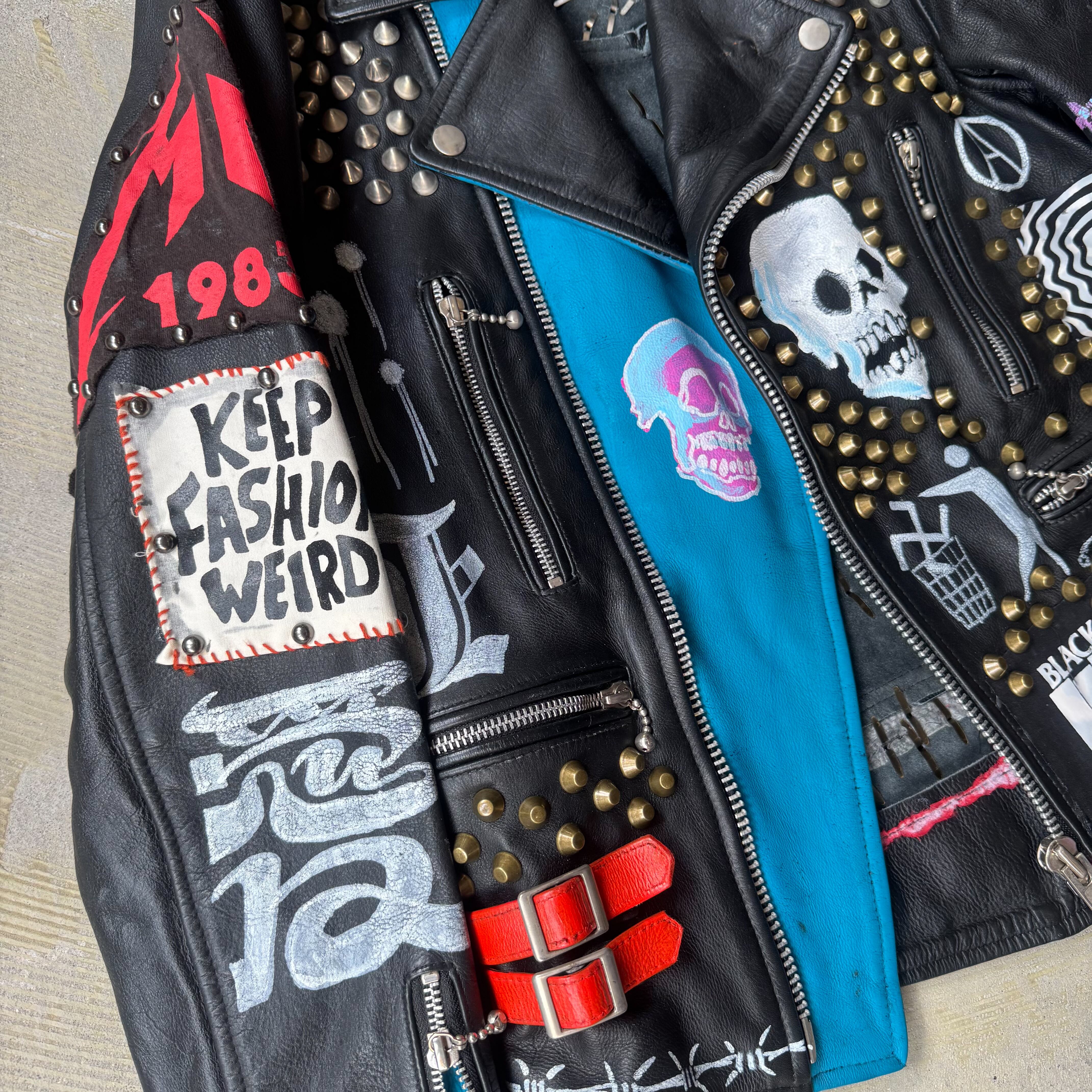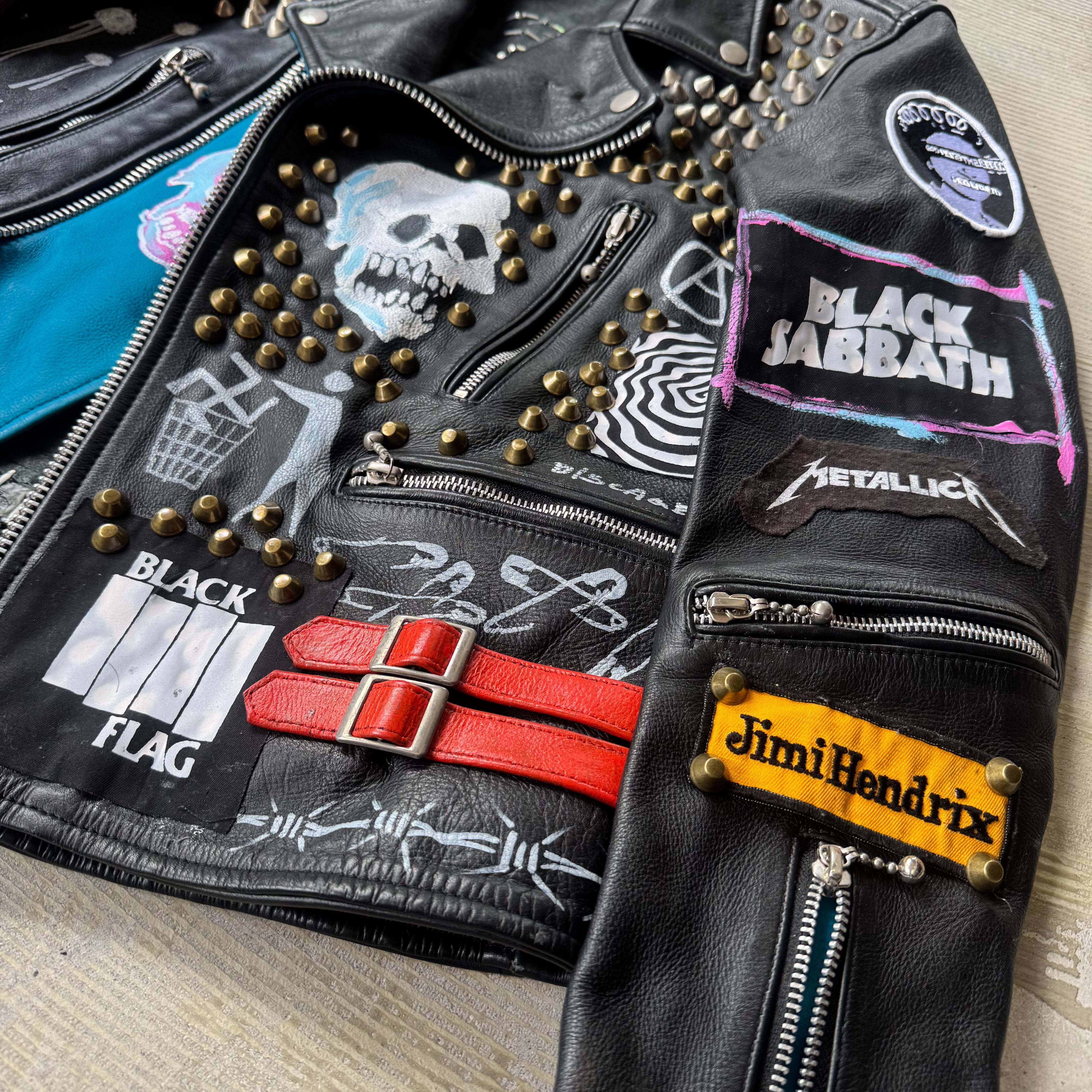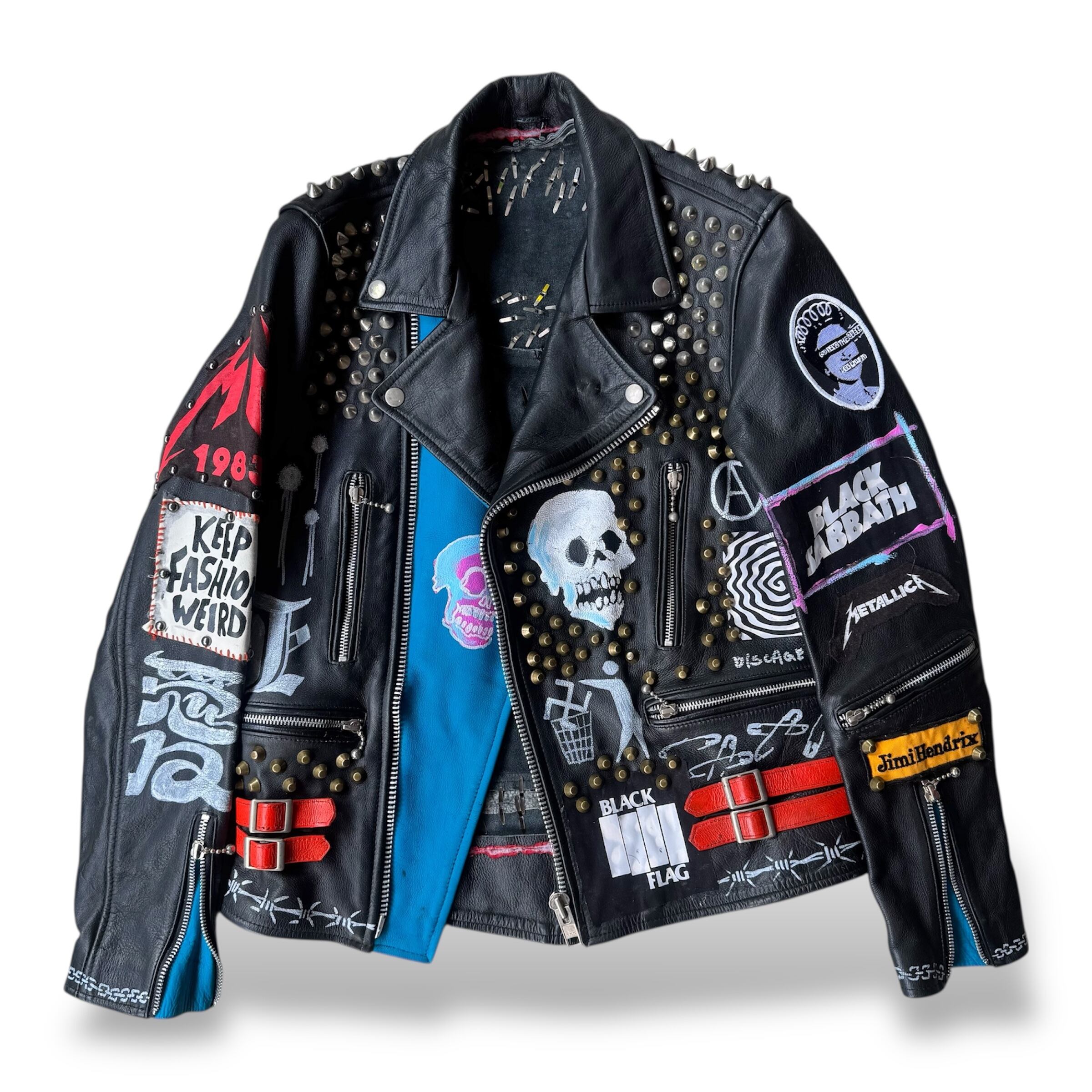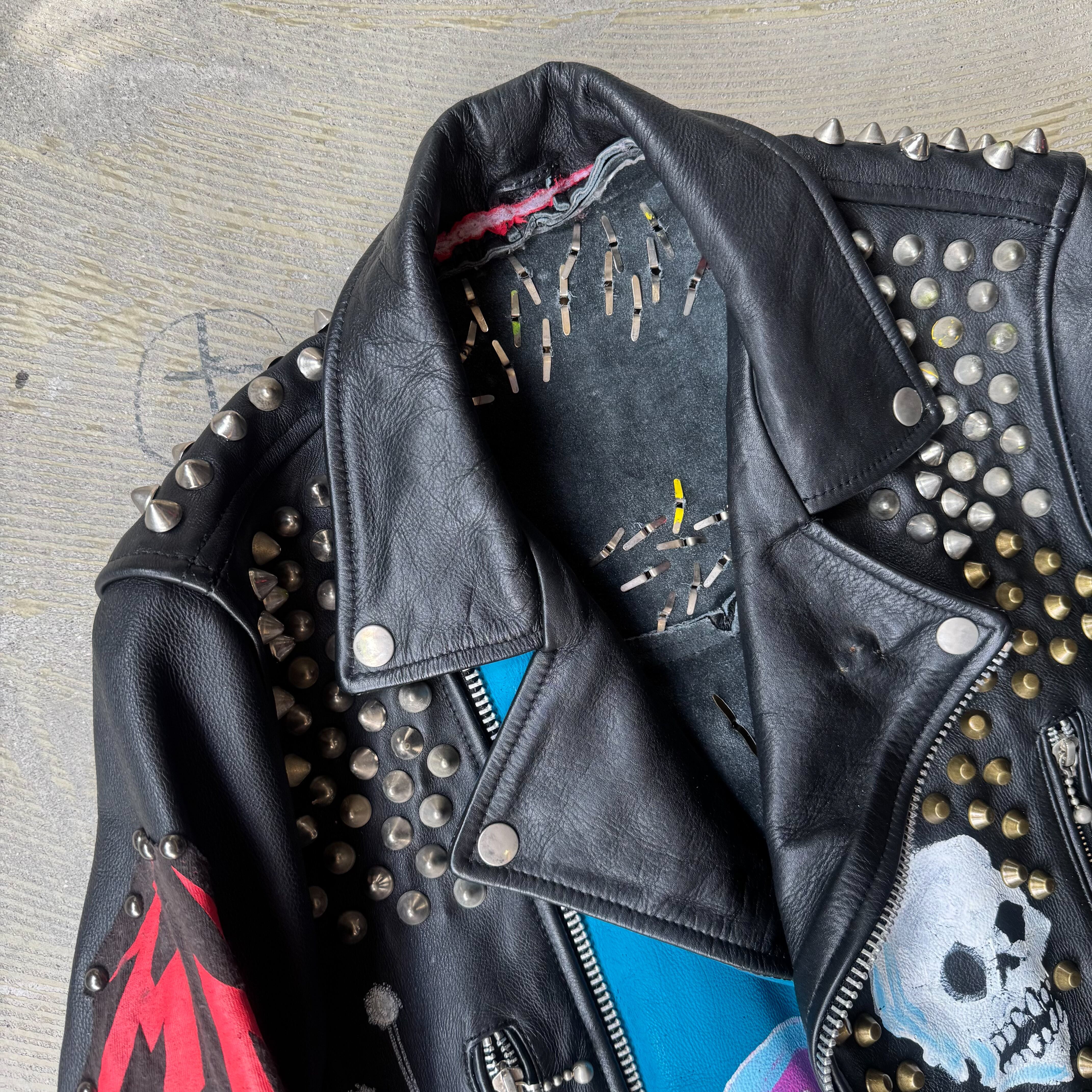 全面や背面にはスタッズが打ち込まれ、フロントと袖にはスカルやパッチが施され